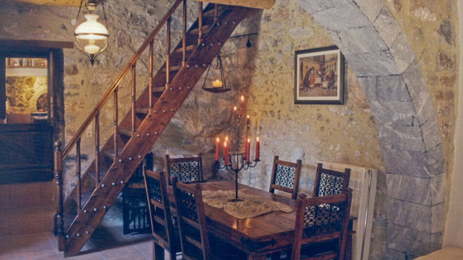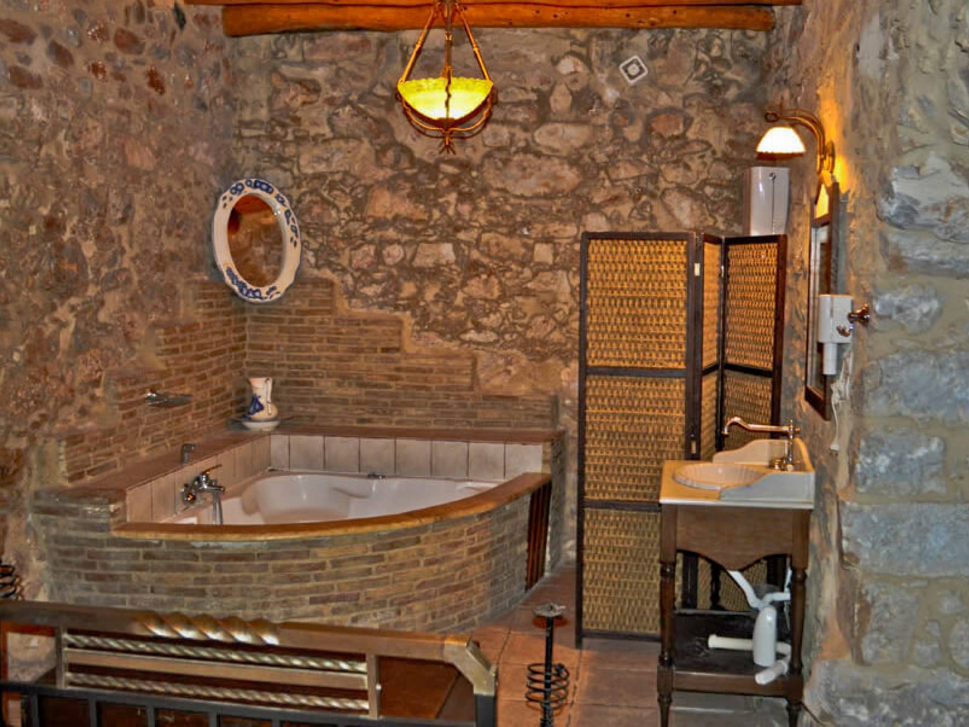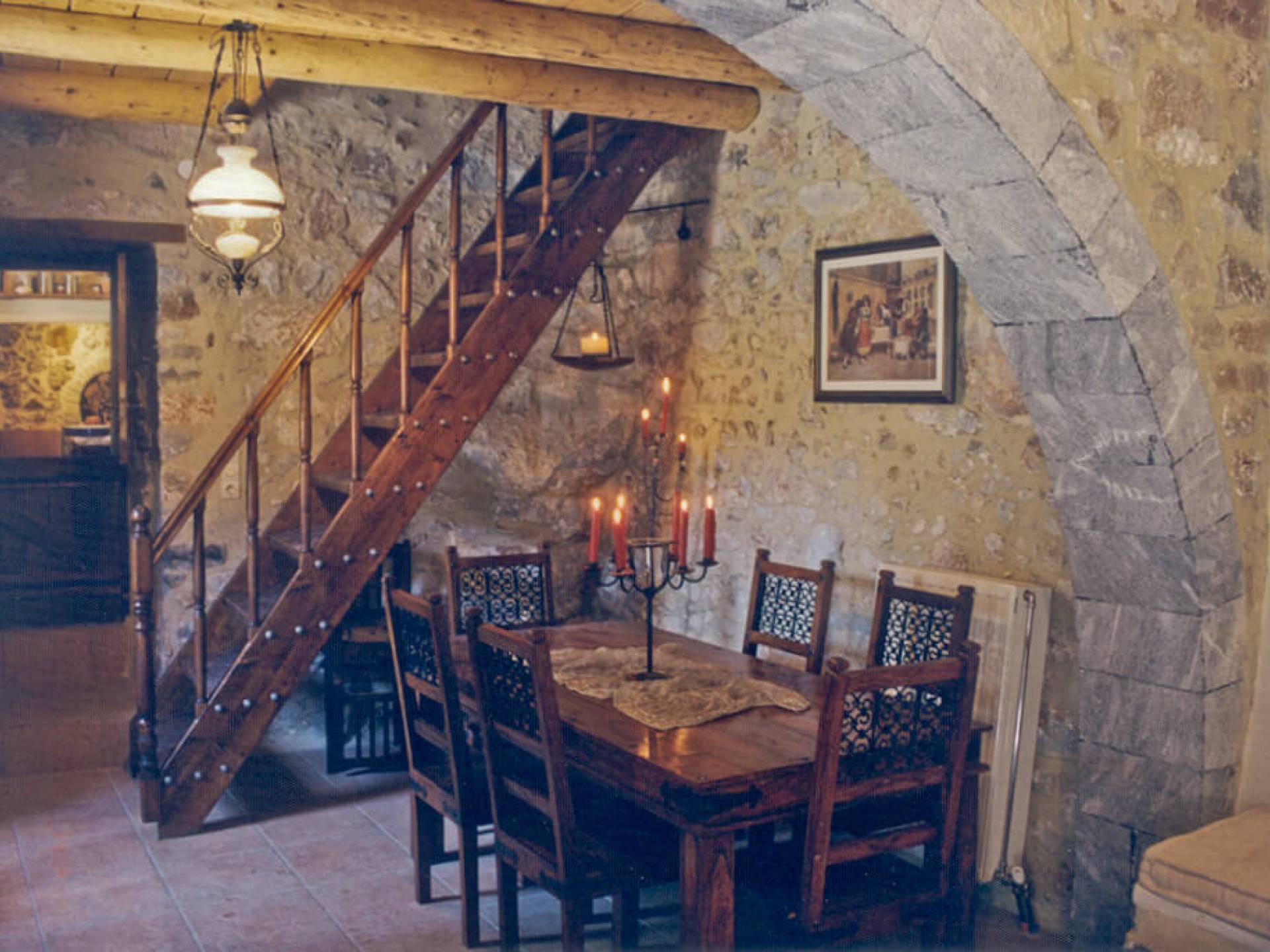 The arch is the main element of the common area, where there is a satellite TV, a HiFi and stone-built sofas. A fireplace in the middle of the room and a dining table next to it are also included. The room is connected with the kitchen, which is fully equipped with all appliances and has got a stone-built oven, too.