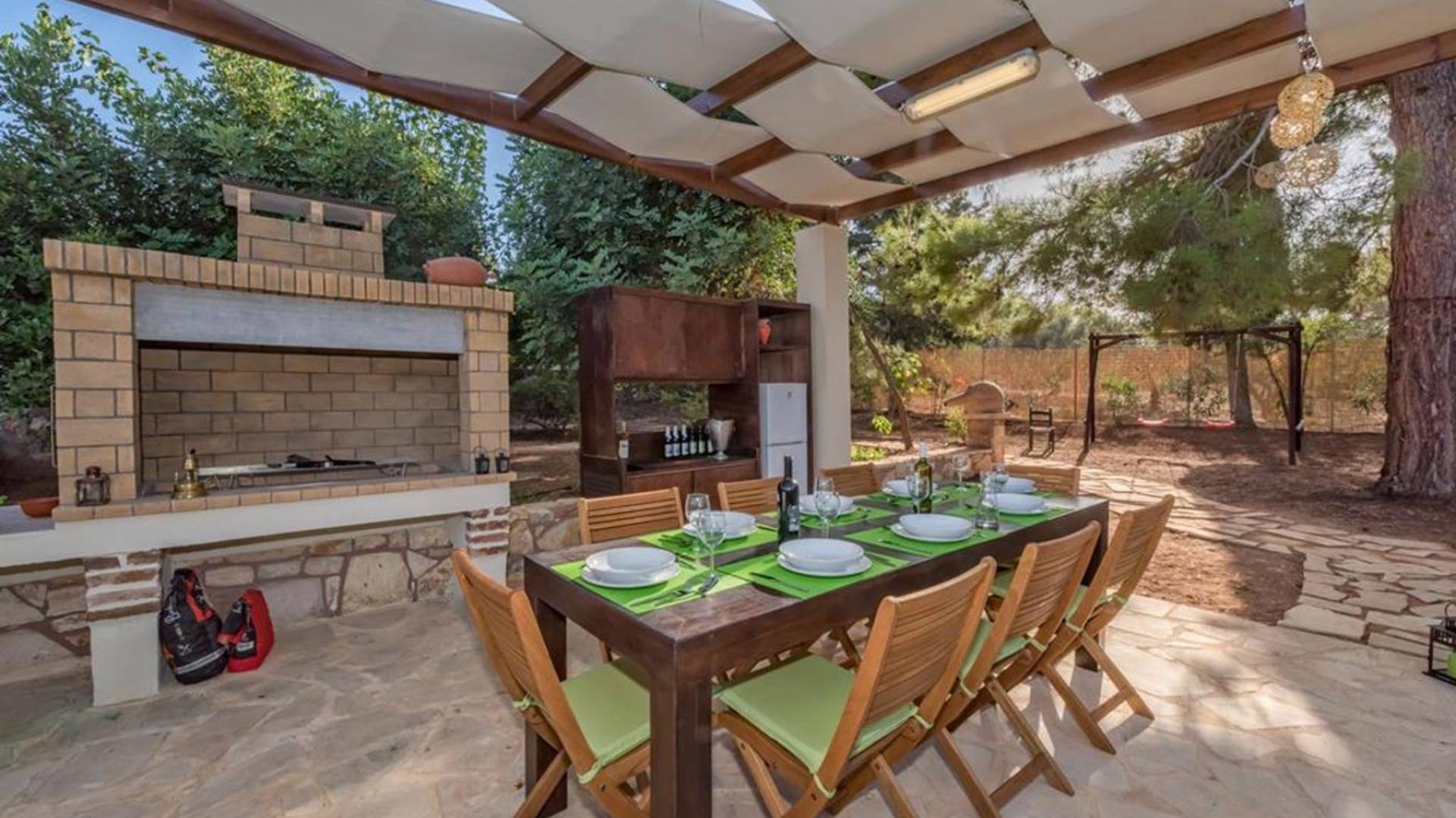 The exterior of the Bliss Villa Chania is comprised of a beautiful garden, a large private swimming pool, a two baths, two changing rooms, sun beds, umbrellas, a sitting room, a children’s playground, a bar, a fully equipped barbecue, as well as tables and chairs under a pergola ideal for romantic dinners under the stars, and is fenced all around with bamboo to achieve privacy. The backyard has impressive old pine trees, fig trees, olive trees, cactus plants, Cretan herbs, lawn and a colorful flower garden that can be explored through small paved paths, along with an organic fruit and a vegetable garden for the pleasure of the guests. In the front side of the villa is free parking space for two cars, with a bus stop right next to it, connecting the villa to the city center of Chania on a regular basis.