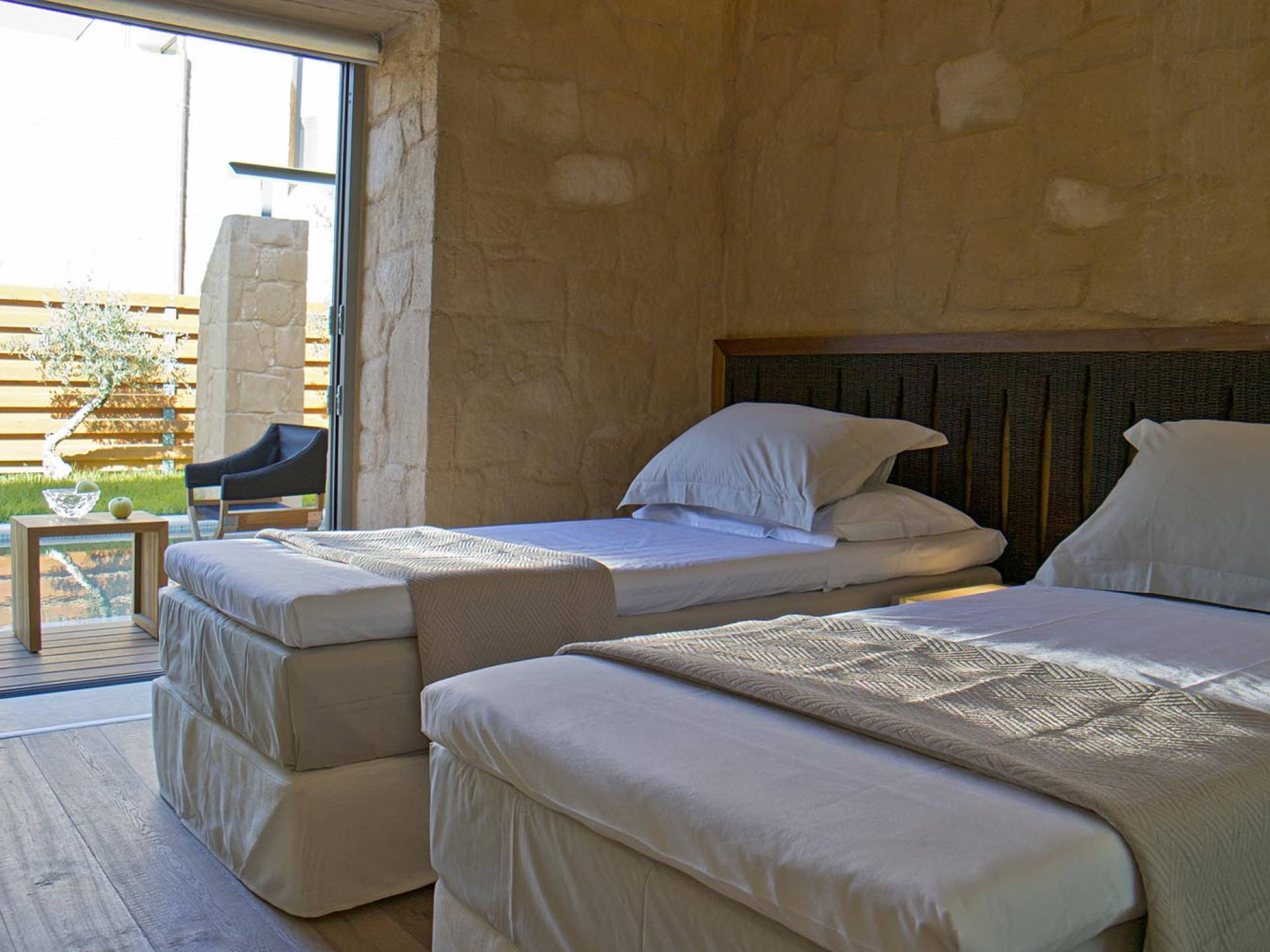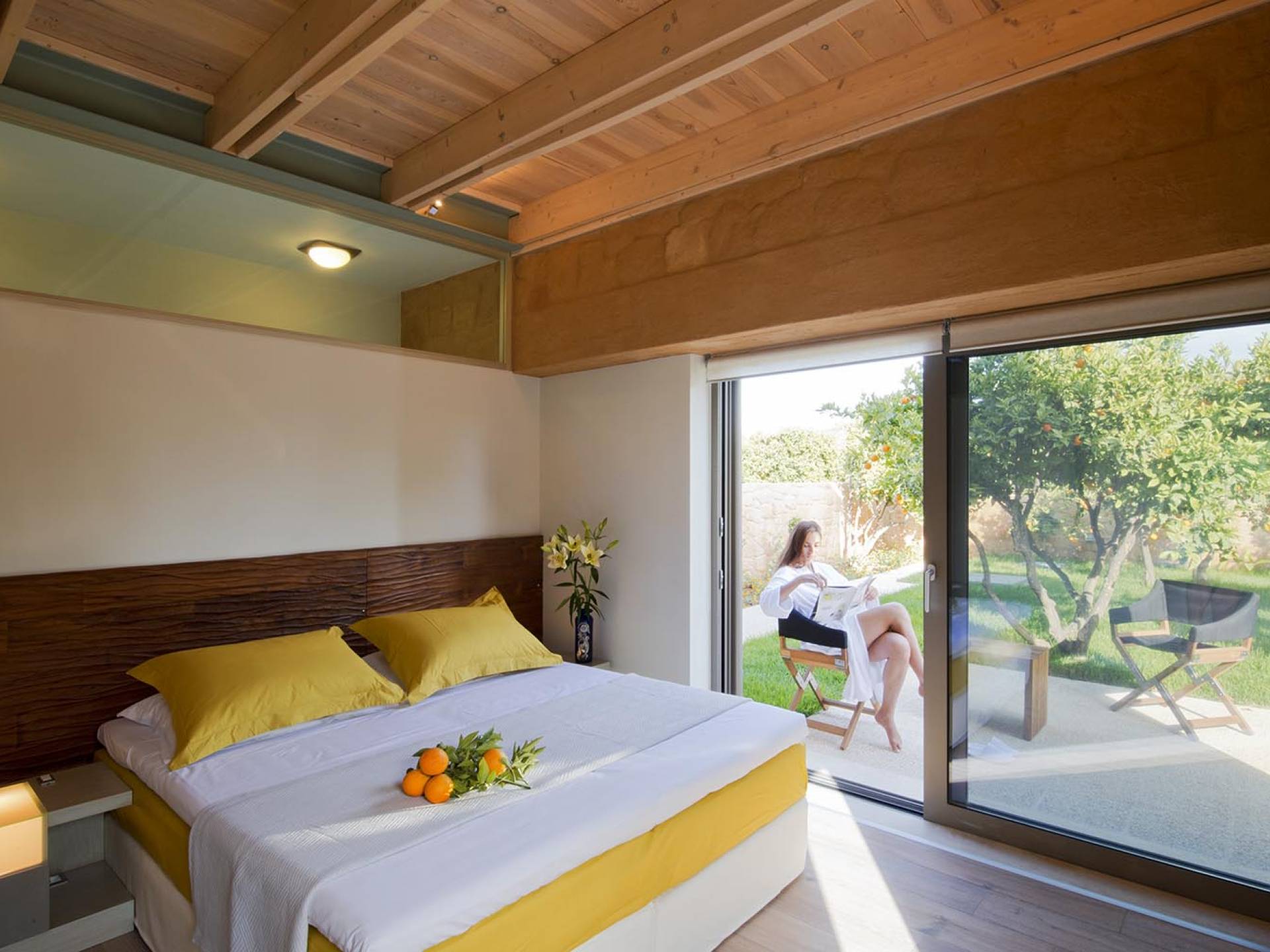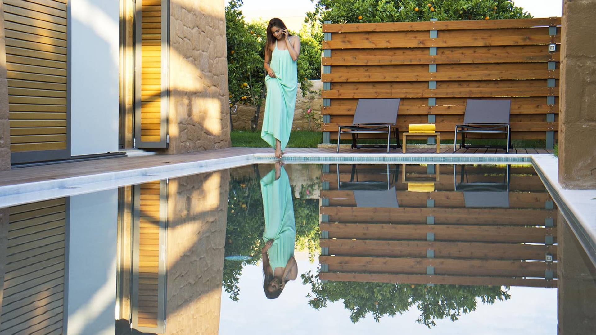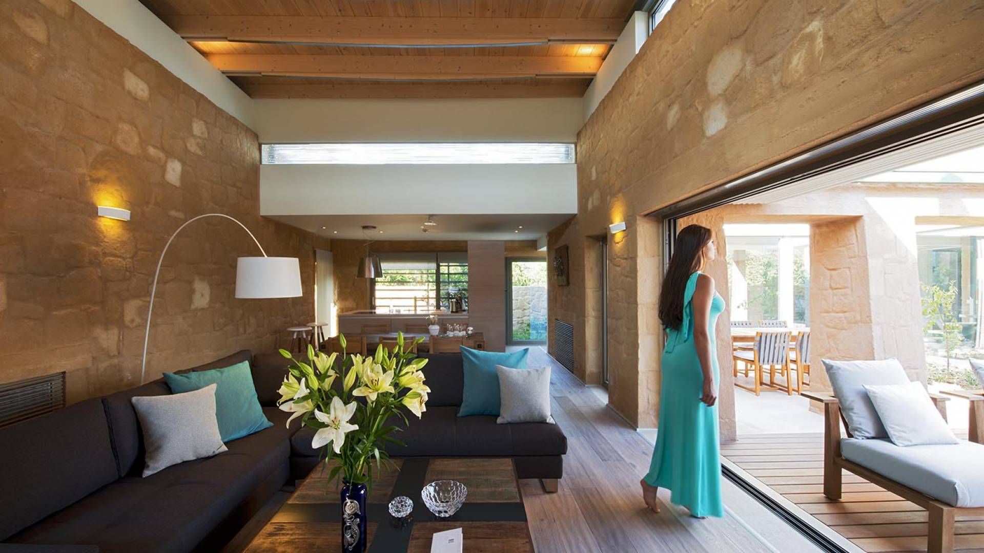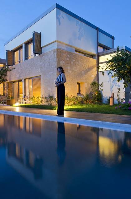 Combining stone, marble, wood, glass, earth and metal to detail, we have invited nature in, so that indoor and outdoor become one co-existing in harmony and peace. Such achievement in design, paired with furnishing’s hand-selected and exclusively designed by interior decorators, luxurious bedding and modern appliances throughout, set Mandarina Villa Chania as the ultimate get-away destination in Crete. Privately surrounded by stone-walled courtyards, the Villa provides a full view of the panoramic Cretan Hills, vast olive and orange groves and the white Cretan Mountains. Reflective of this view, the Villa is built transparently with rich stone and flooded with natural light creating a peaceful ambience within.