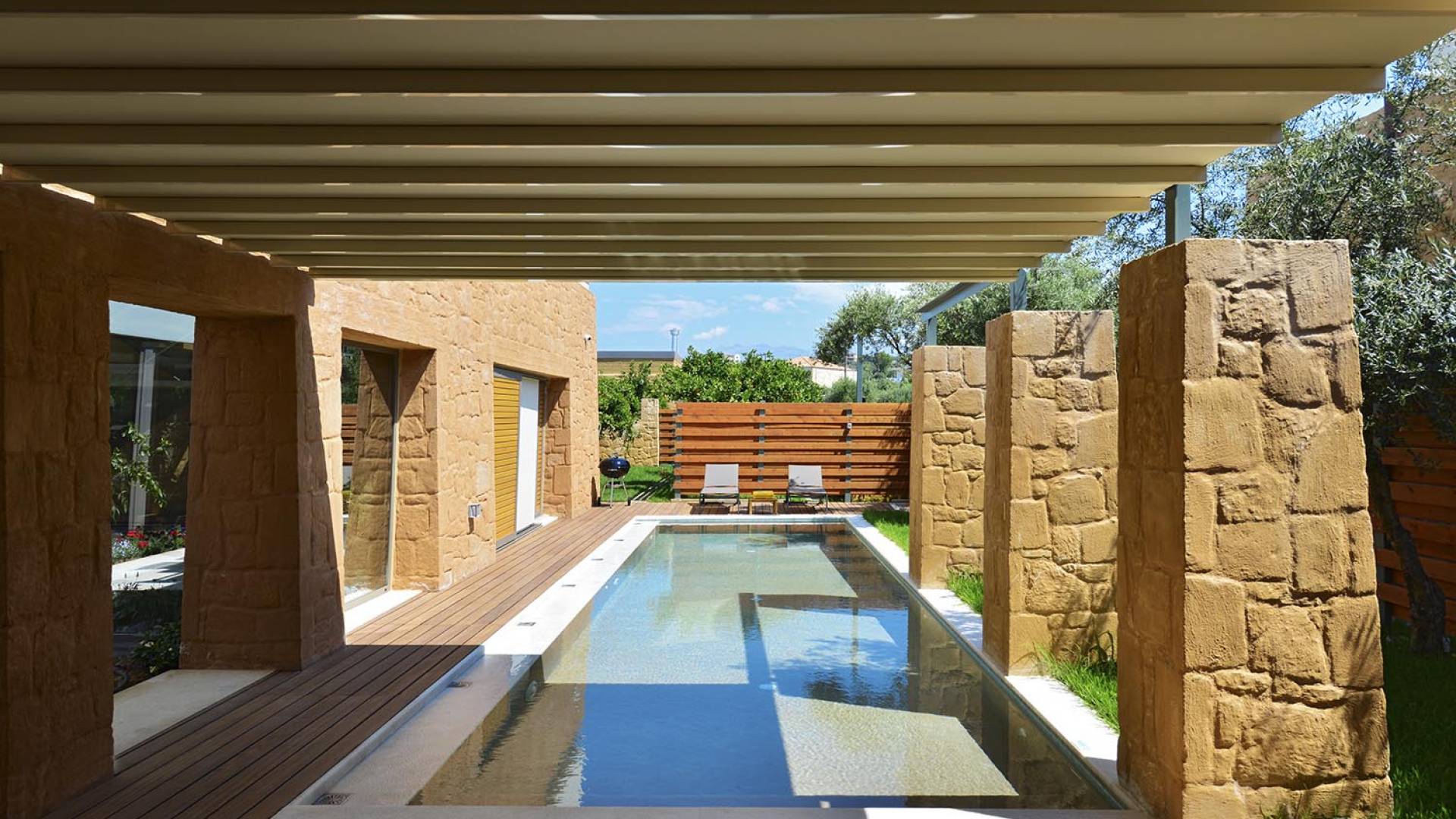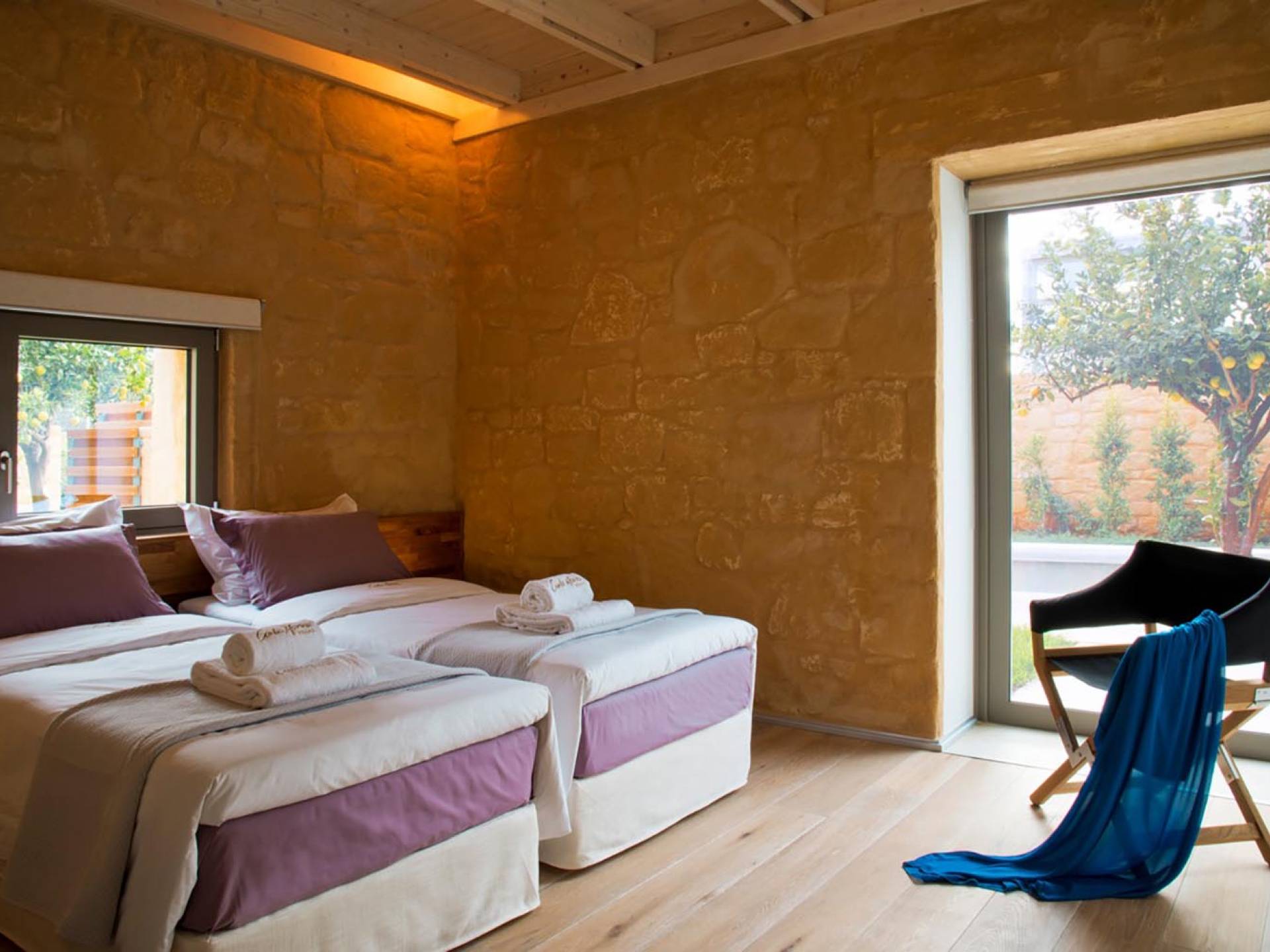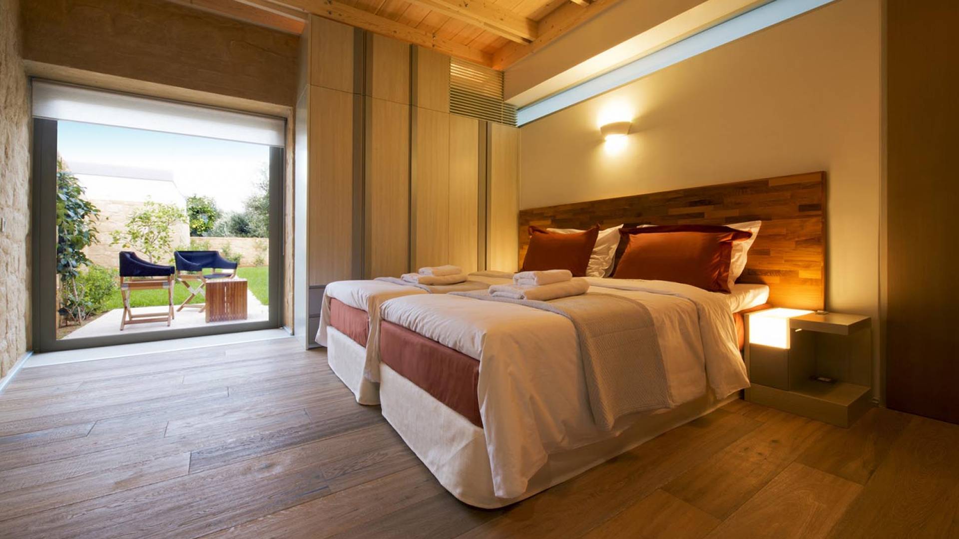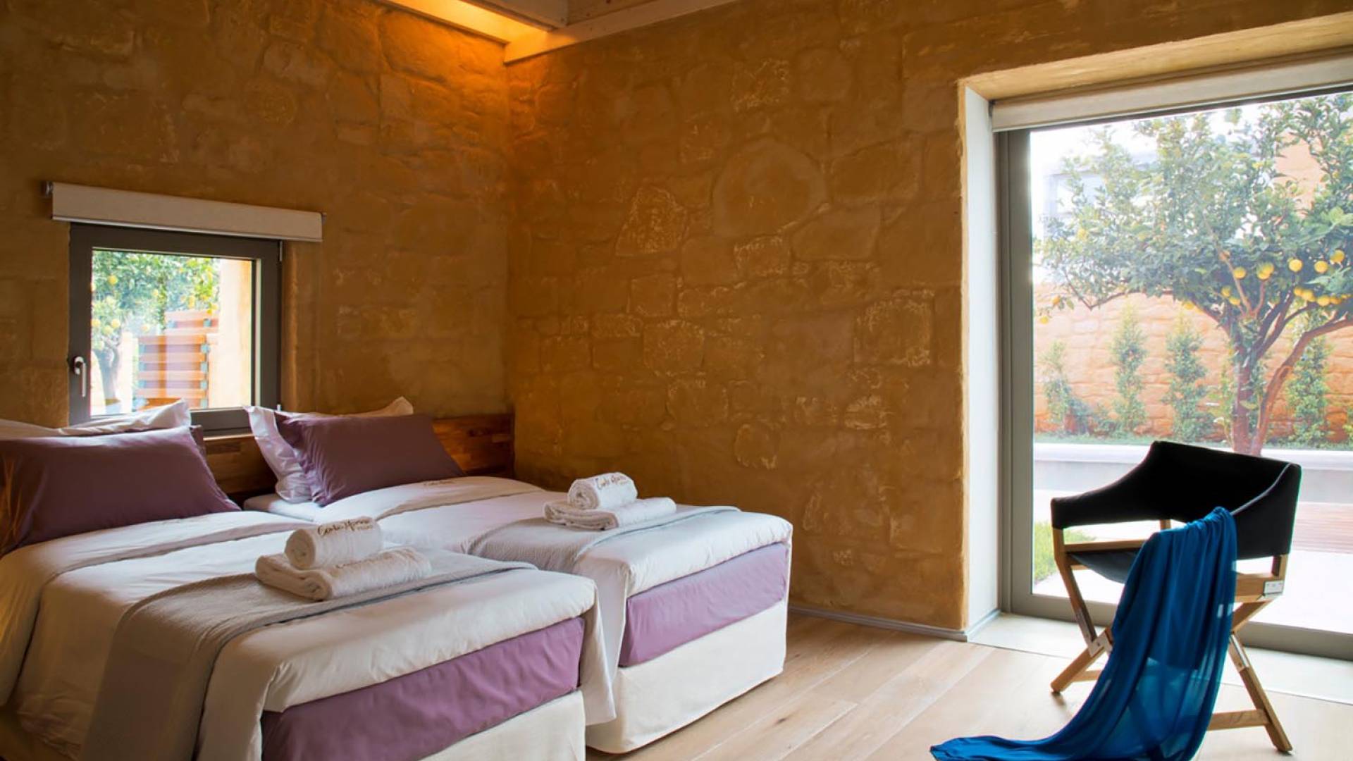 Combining stone, marble, wood, glass, earth and metal to detail, we have invited nature in, so that indoor and outdoor become one co-existing in harmony and peace. Such achievement in design, paired with furnishing’s hand-selected and exclusively designed by interior decorators, luxurious bedding and modern appliances throughout, set Mandarina Villa Chania as the ultimate get-away destination in Crete. Privately surrounded by stone-walled courtyards, the Villa provides a full view of the panoramic Cretan Hills, vast olive and orange groves and the white Cretan Mountains. Reflective of this view, the Villa is built transparently with rich stone and flooded with natural light creating a peaceful ambience within.