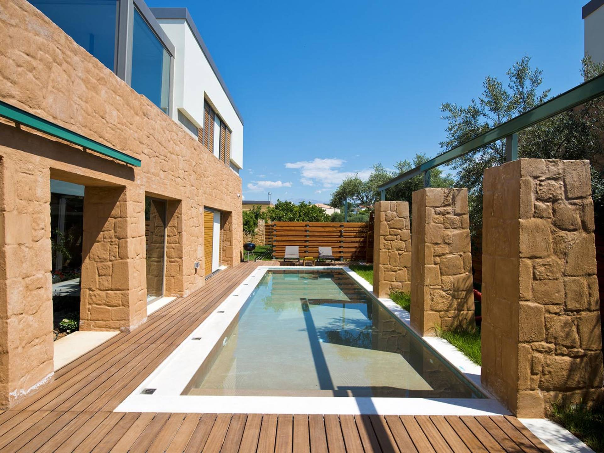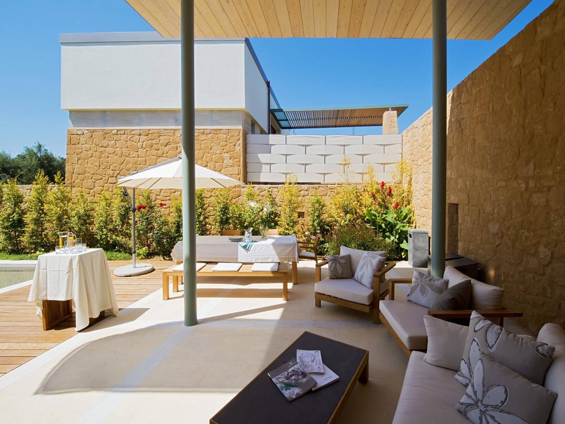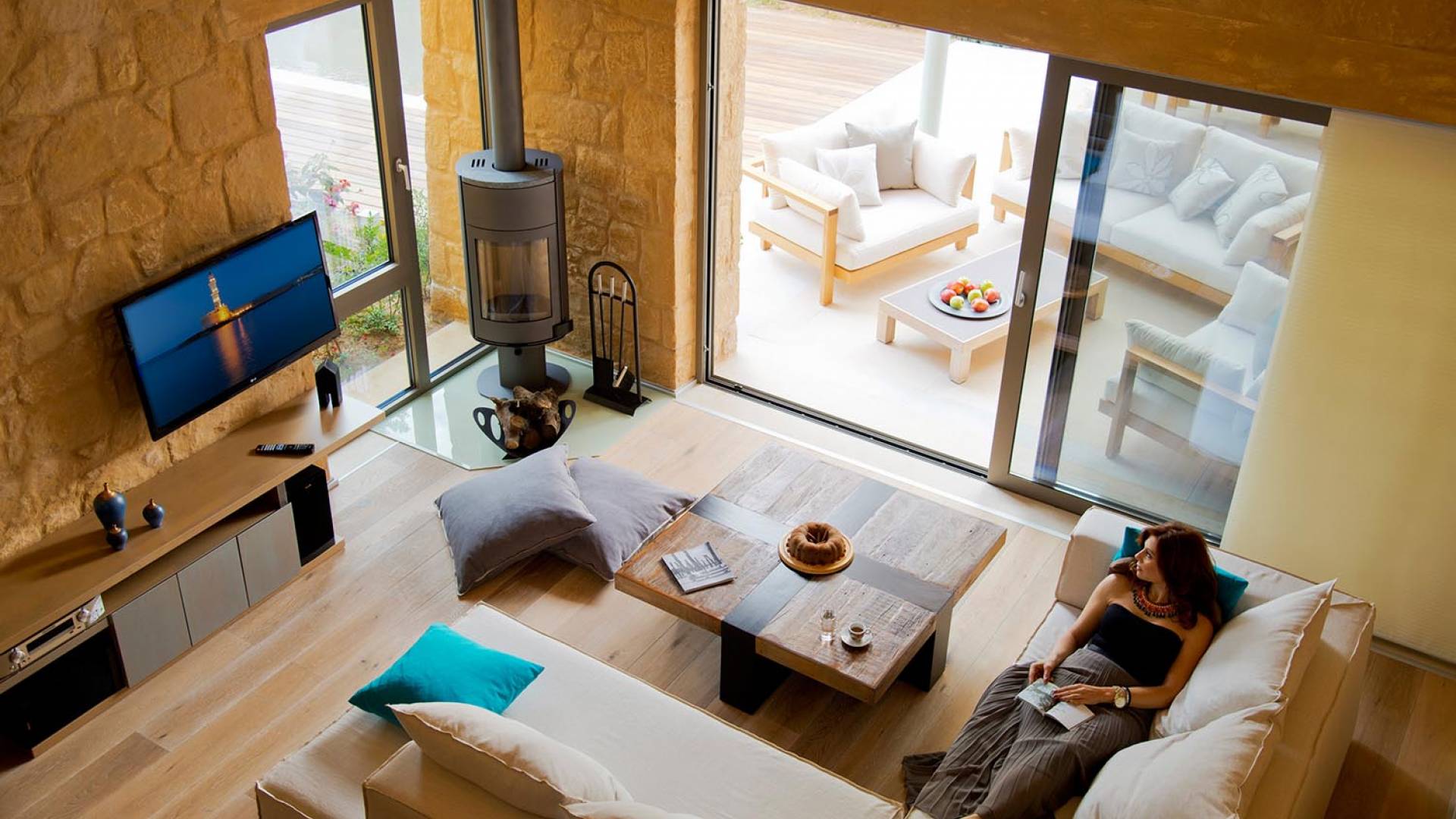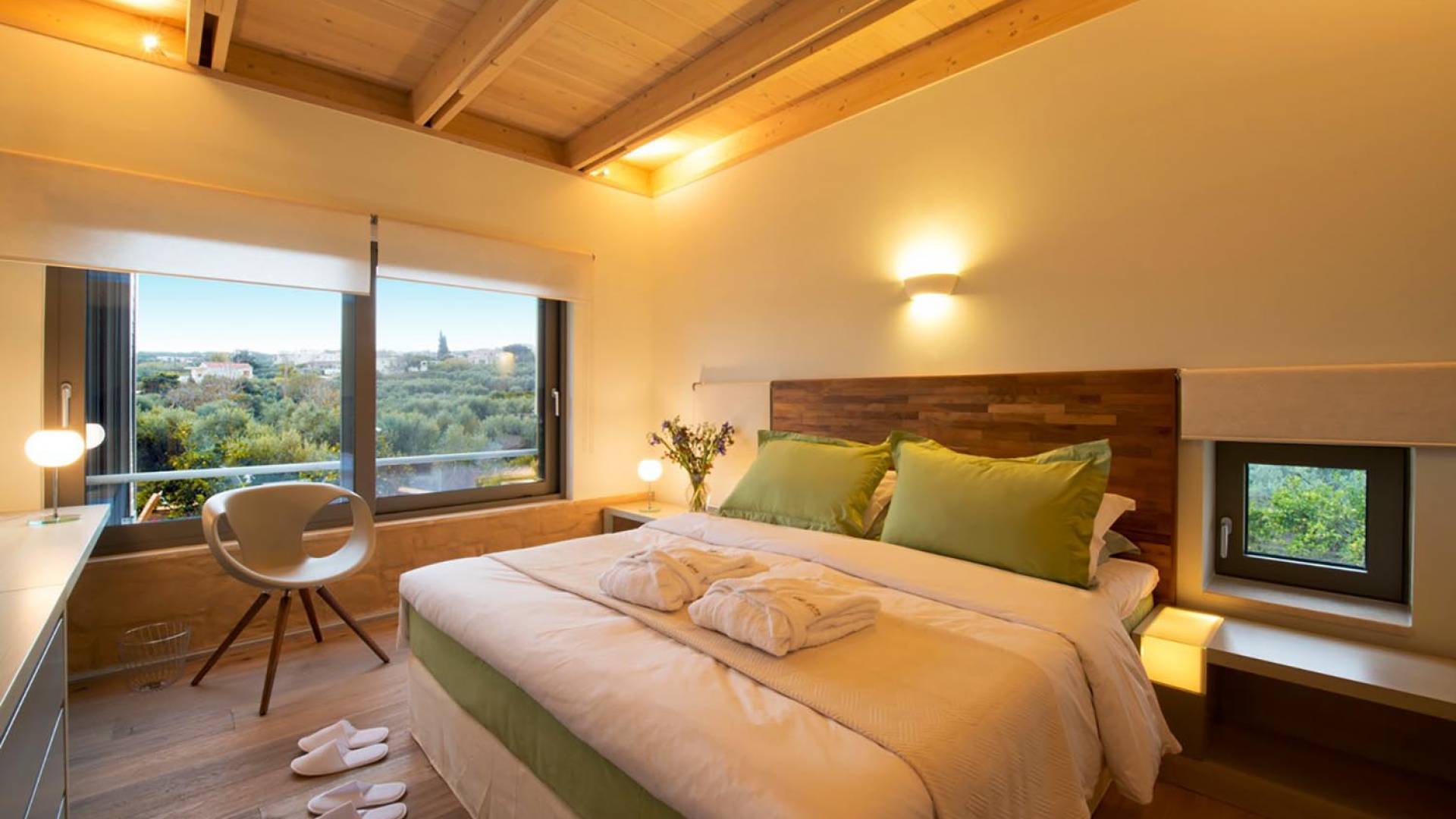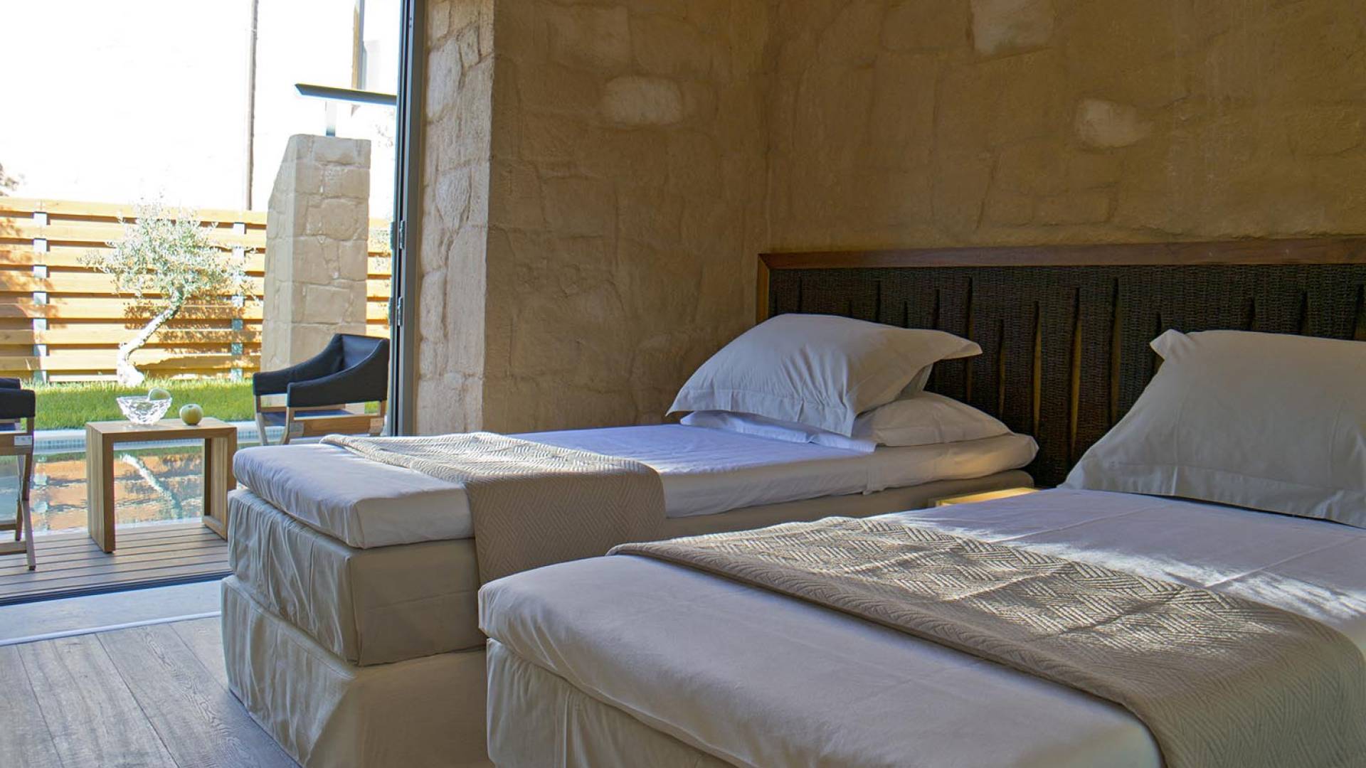 Combining stone, marble, wood, glass, earth and metal to detail, we have invited nature in, so that indoor and outdoor become one co-existing in harmony and peace. Such achievement in design, paired with furnishing’s hand-selected and exclusively designed by interior decorators, luxurious bedding and modern appliances throughout, set Mandarina Villa Chania as the ultimate get-away destination in Crete. Privately surrounded by stone-walled courtyards, the Villa provides a full view of the panoramic Cretan Hills, vast olive and orange groves and the white Cretan Mountains. Reflective of this view, the Villa is built transparently with rich stone and flooded with natural light creating a peaceful ambience within.