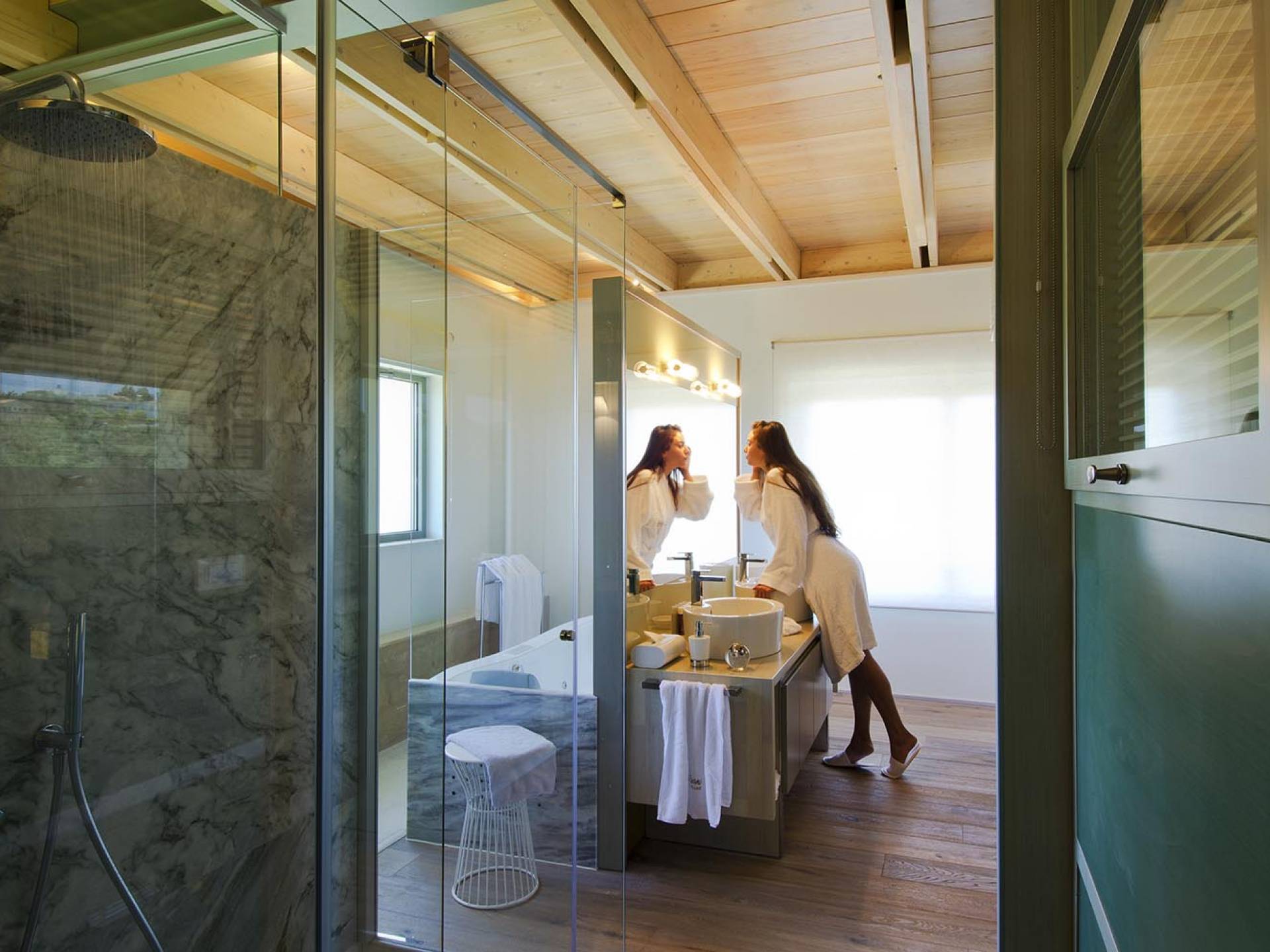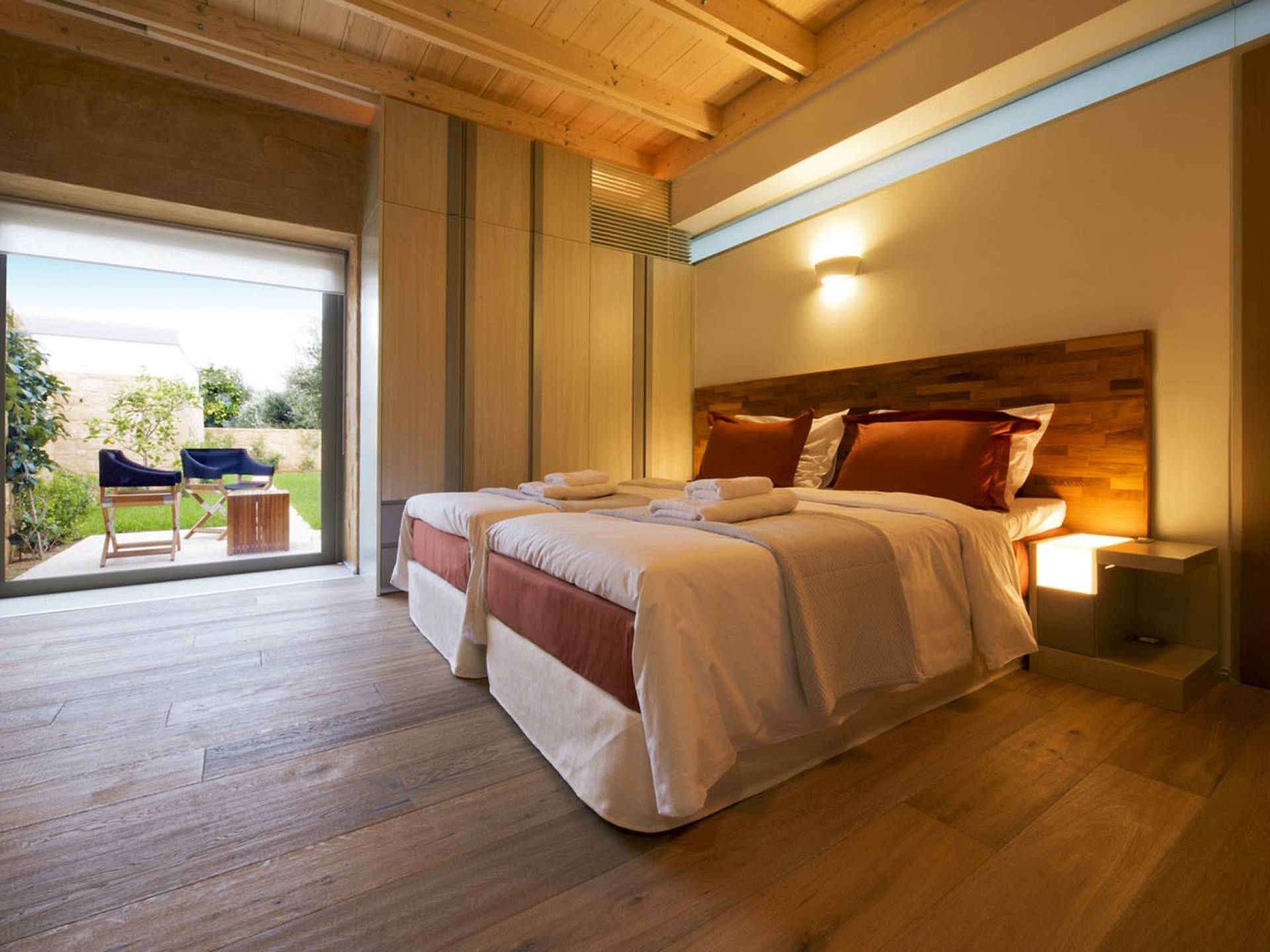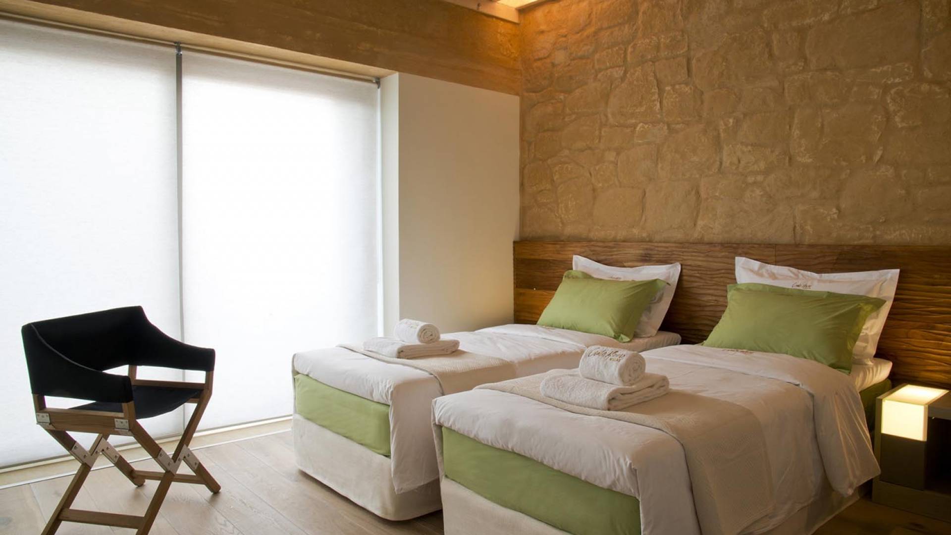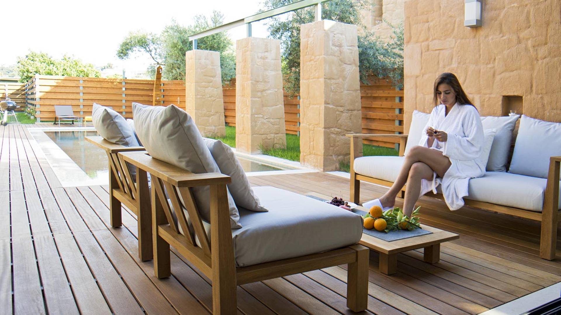 Combining stone, marble, wood, glass, earth and metal to detail, we have invited nature in, so that indoor and outdoor become one co-existing in harmony and peace. Such achievement in design, paired with furnishing’s hand-selected and exclusively designed by interior decorators, luxurious bedding and modern appliances throughout, set Mandarina Villa Chania as the ultimate get-away destination in Crete. Privately surrounded by stone-walled courtyards, the Villa provides a full view of the panoramic Cretan Hills, vast olive and orange groves and the white Cretan Mountains. Reflective of this view, the Villa is built transparently with rich stone and flooded with natural light creating a peaceful ambience within.