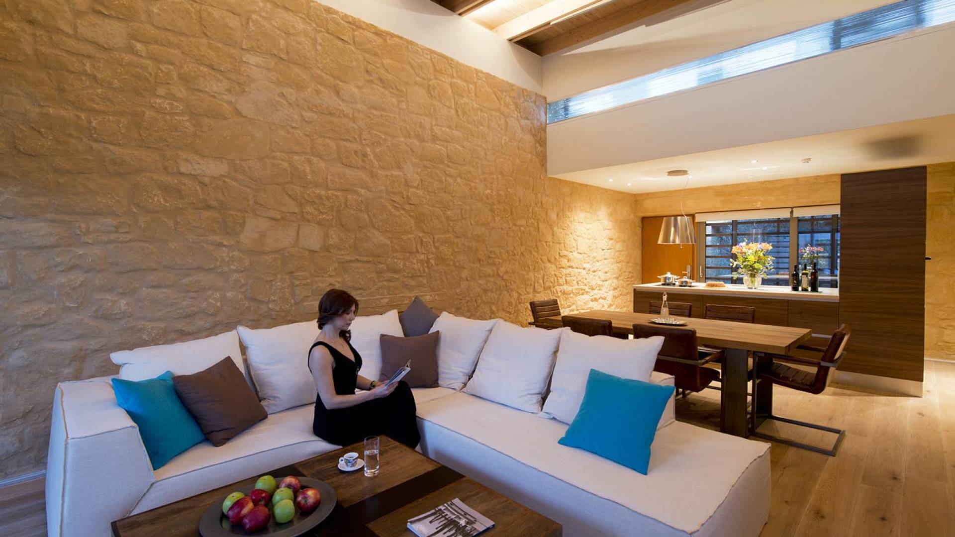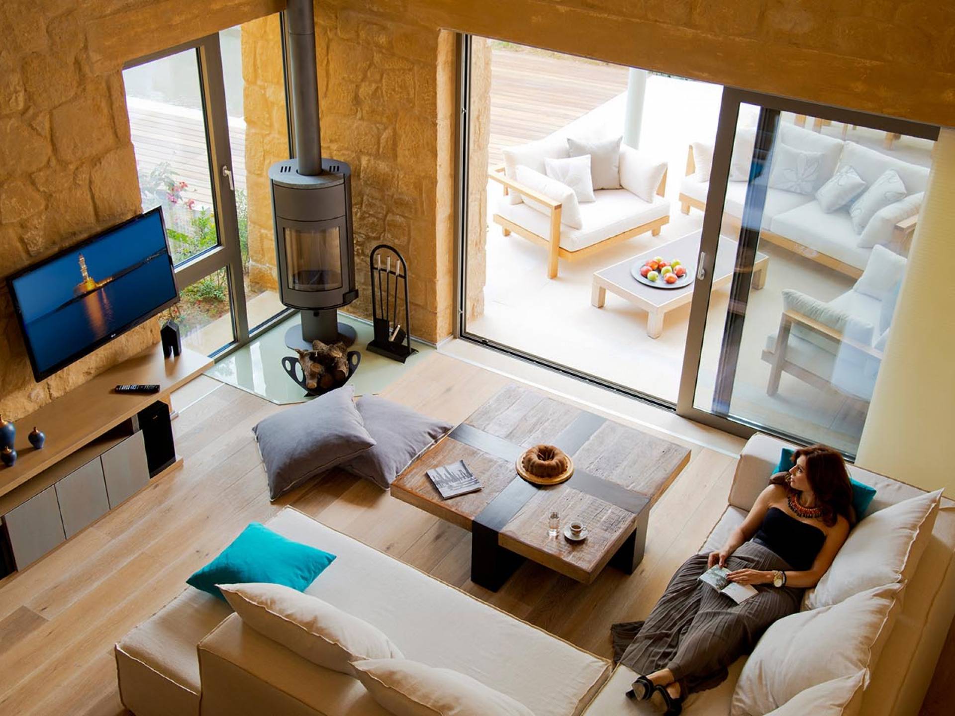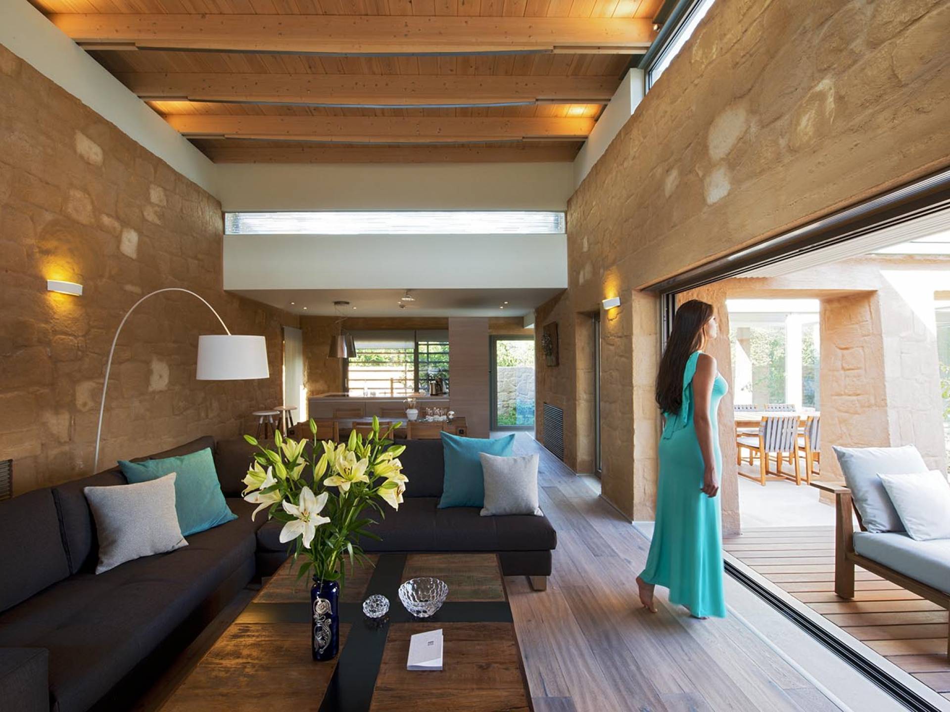 Such achievement in design, paired with furnishing’s hand-selected and exclusively designed by interior decorators, luxurious bedding and modern appliances throughout, set Orangia Villa as the ultimate get-away destination in Crete. Privately surrounded by stone-walled courtyards, the Villa provides full view to the panoramic Cretan Hills, vast olive and orange groves and the white Cretan Mountains. Reflective of this view, the Villa is built transparently with rich stone and flooded with natural light creating a peaceful ambience within.