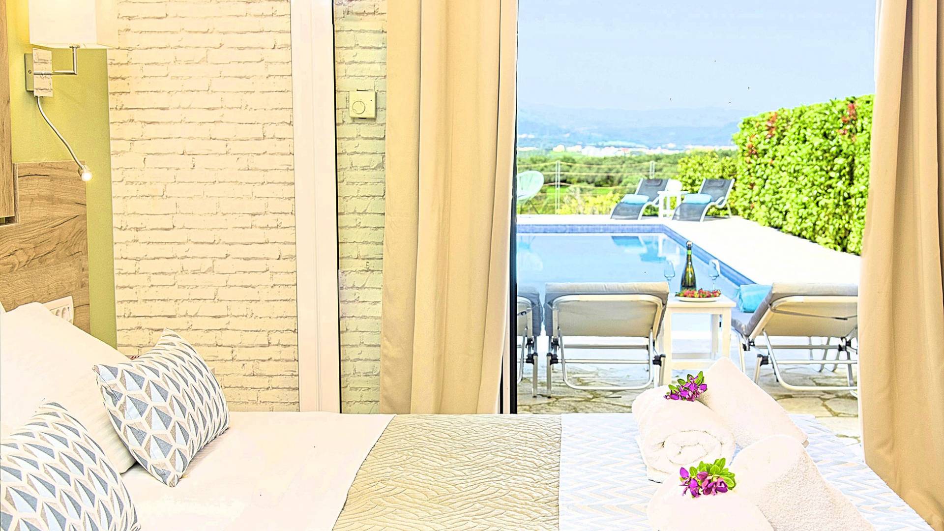 Swim in the private pool. Enjoy your coffee or drink at one of the terraces of Cretan Mansion, looking out towards the White Mountains and the sandy beach of Georgioupolis. As you gaze at the valley surrounding the village, which is covered by a thick olive grove, you will relax immersed in aromas of rosemary, lavender, and mint, engulfing you in a dream of the natural scent of the Cretan land. Cretan Mansion Chania is built on 4 levels and can accommodate up to 10 people, all 12 months year-round. The first level of the west garden and the pool has 2 independent studios with their own private entrances. The same level of the main building has a lounge with a corner sofa seating 5 people, with an auxiliary kitchen and a spacious bedroom.