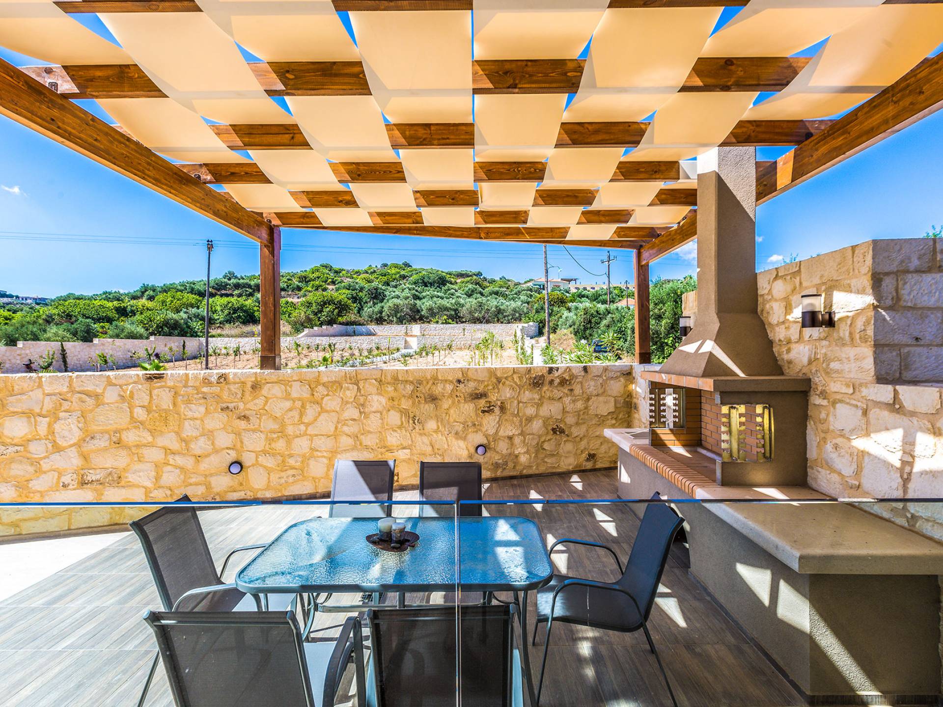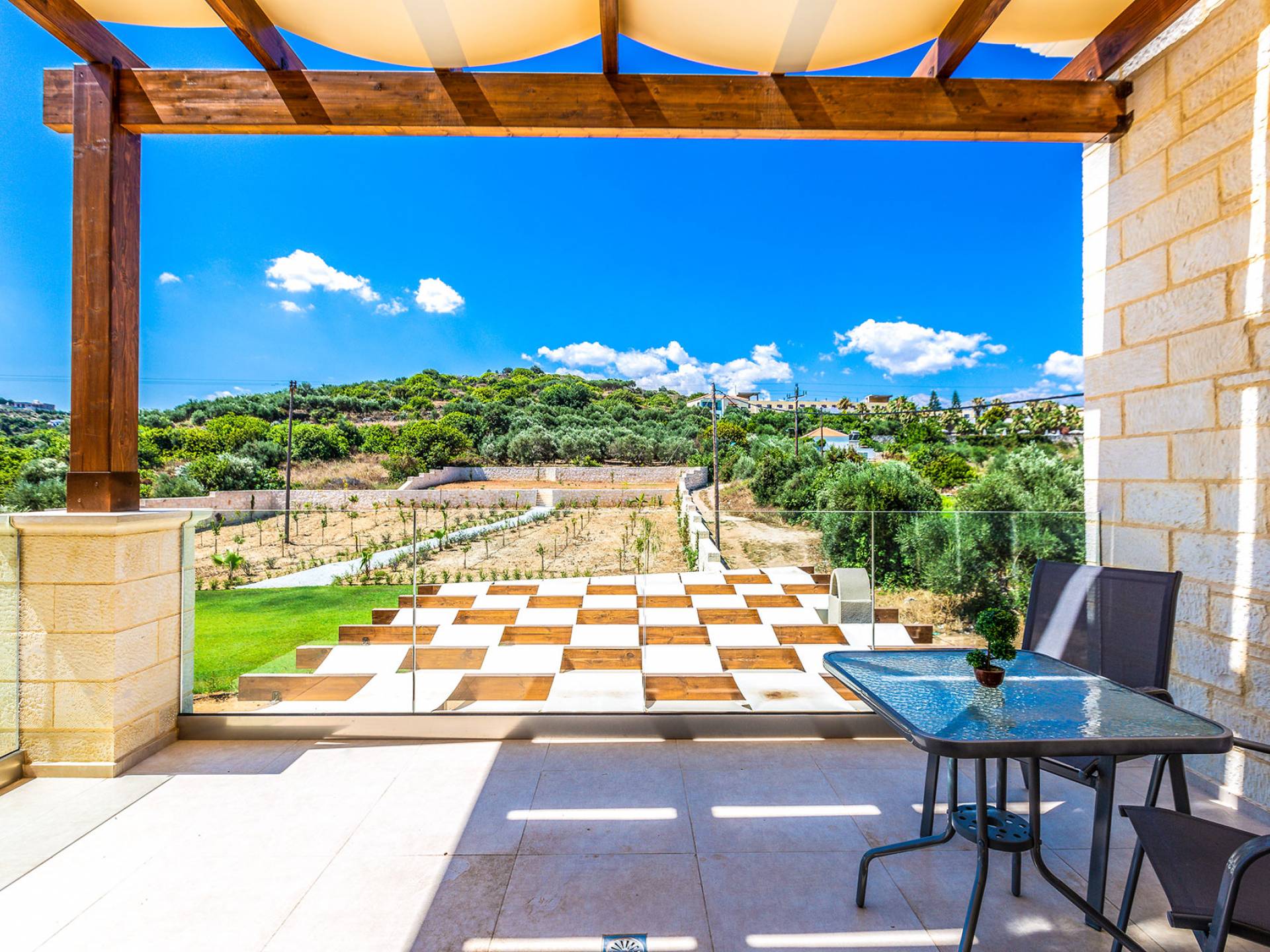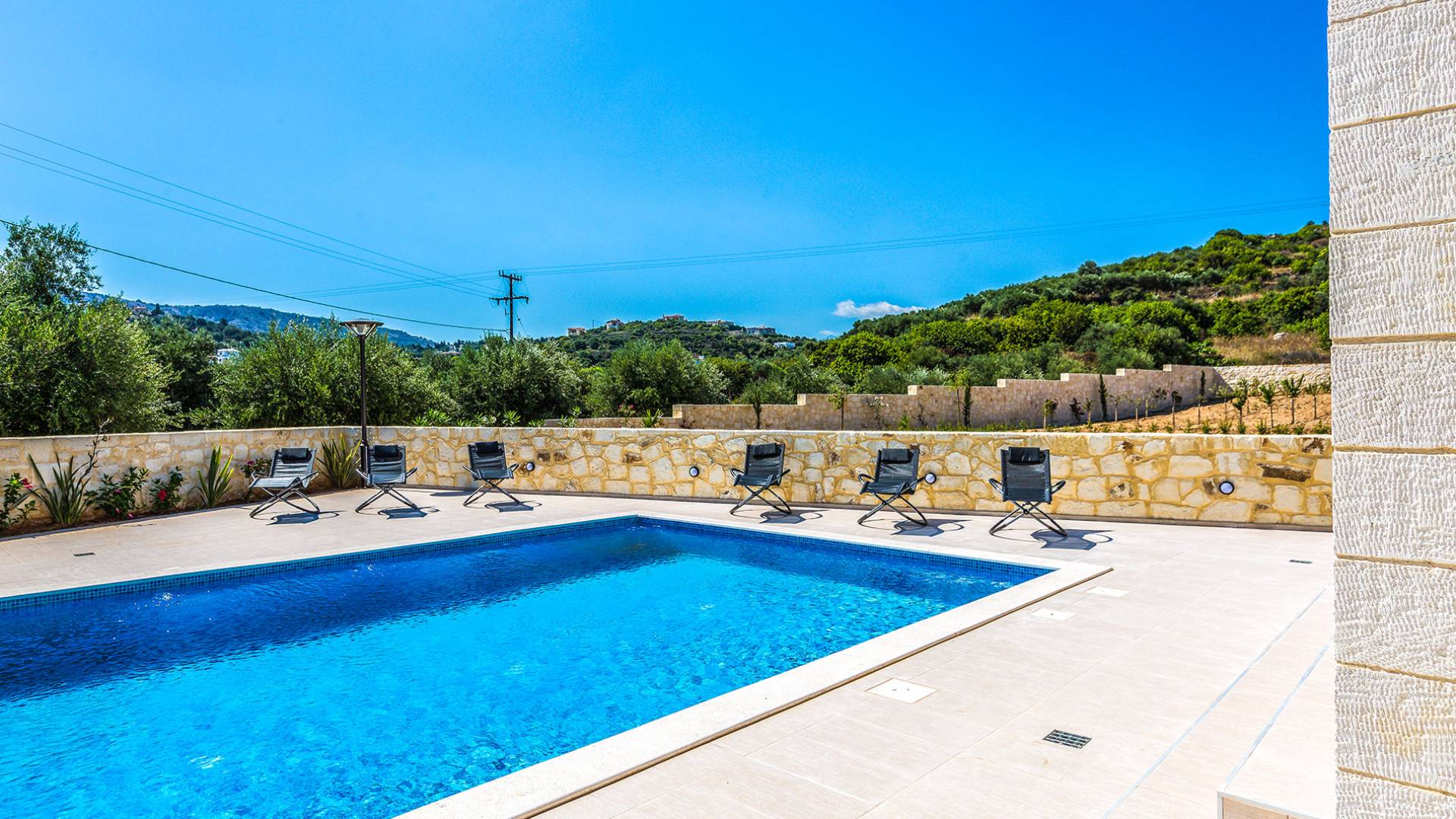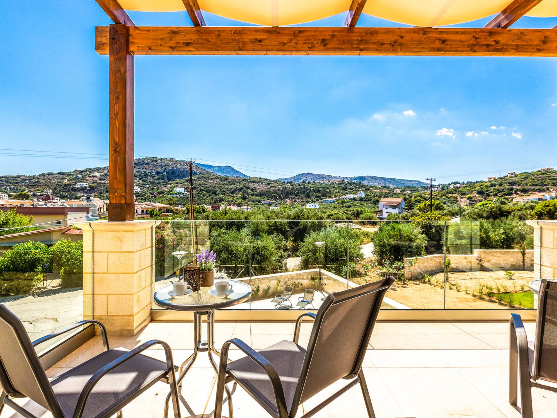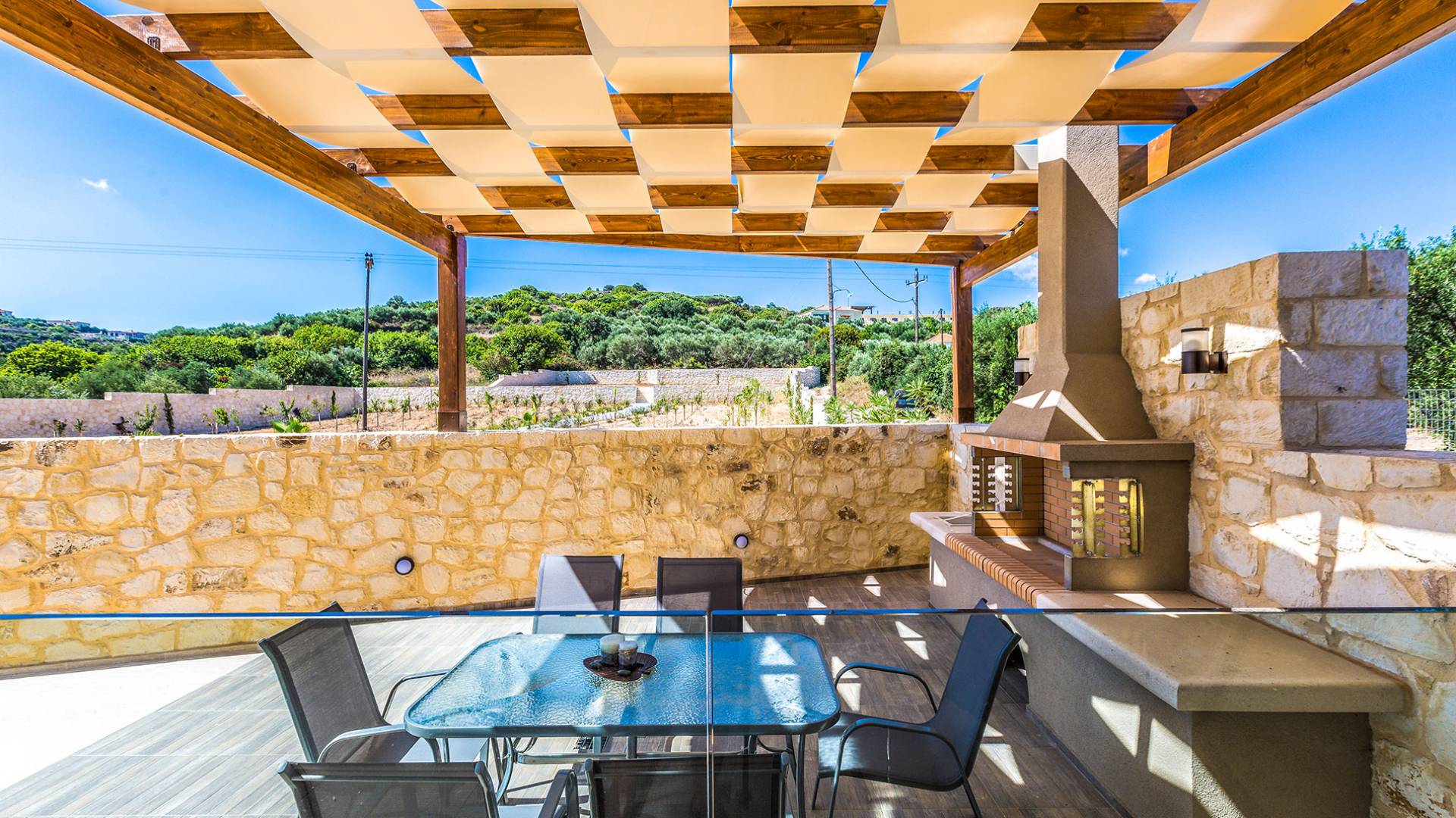Eudora Villa Chania is built on a plot of 3.300 sqm. and the building area is 256 sqm. On the ground floor of Eudora Villa Chania, there is a spacious open-plan living room, dining room and open-plan kitchen, guest bathroom, and a storage room. There is also one bedroom with a bathroom. The living room and bedroom have access to a spacious sunny terrace. The second floor includes four bedrooms with a bathroom in each one. Every bedroom has wardrobes. Three of the bedrooms open into a balcony with the sea and mountains views. The private swimming pool is 38 sqm. with a barbeque area, wooden pergola and oven, and well-kept garden are located in a beautiful patio. The plot is surrounded by a stone wall for more privacy.