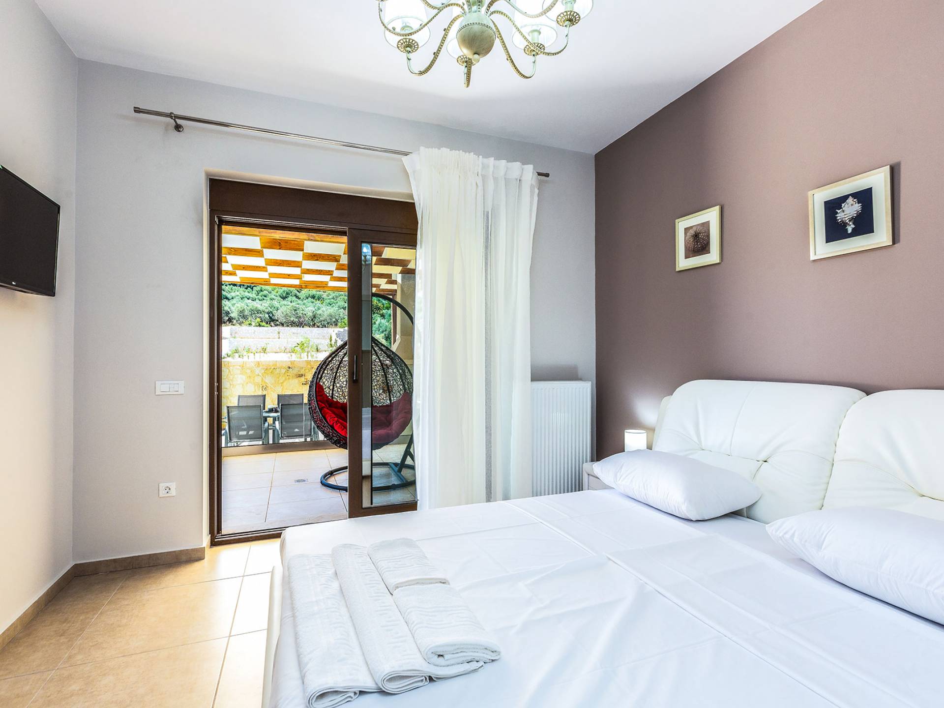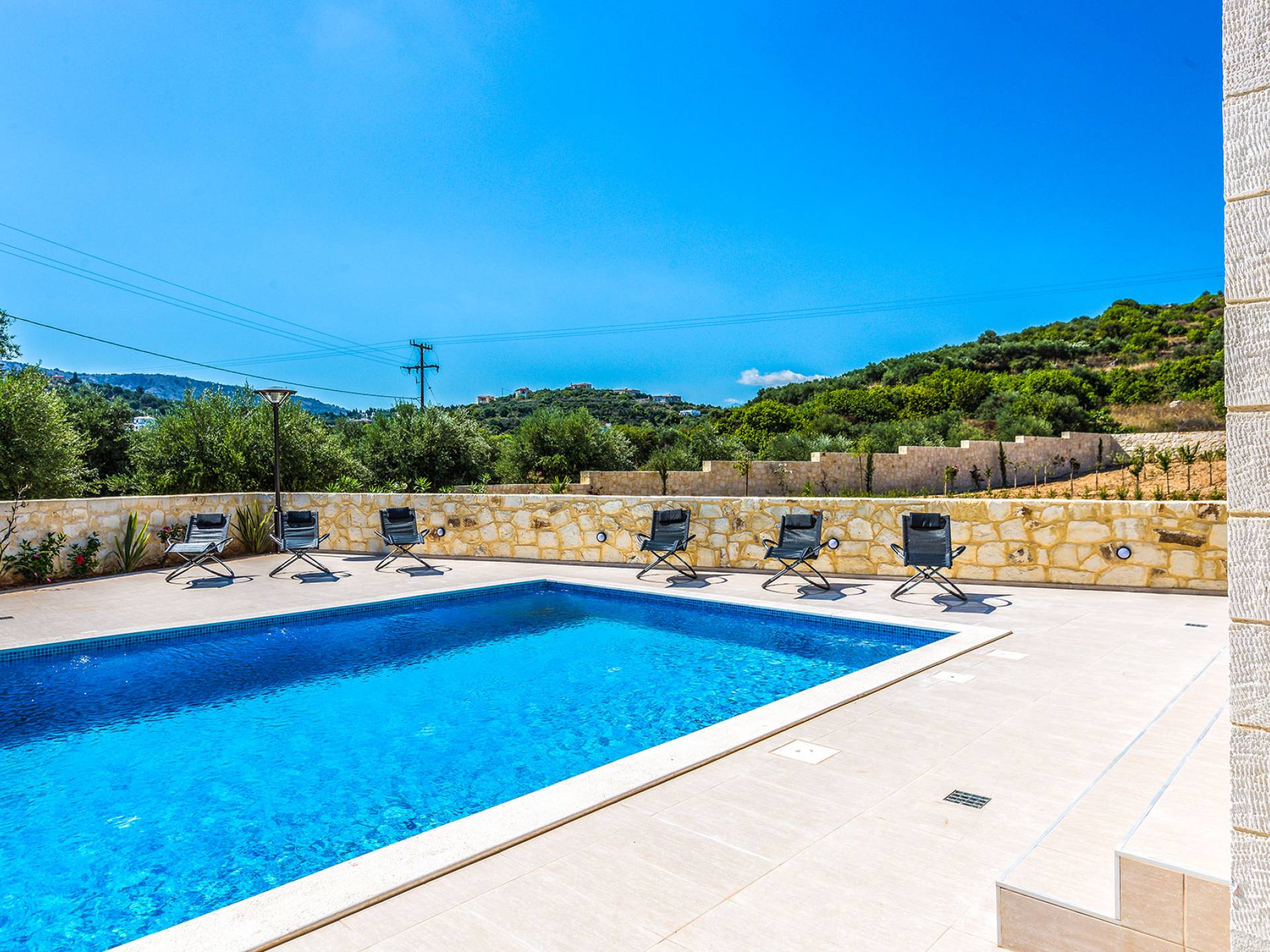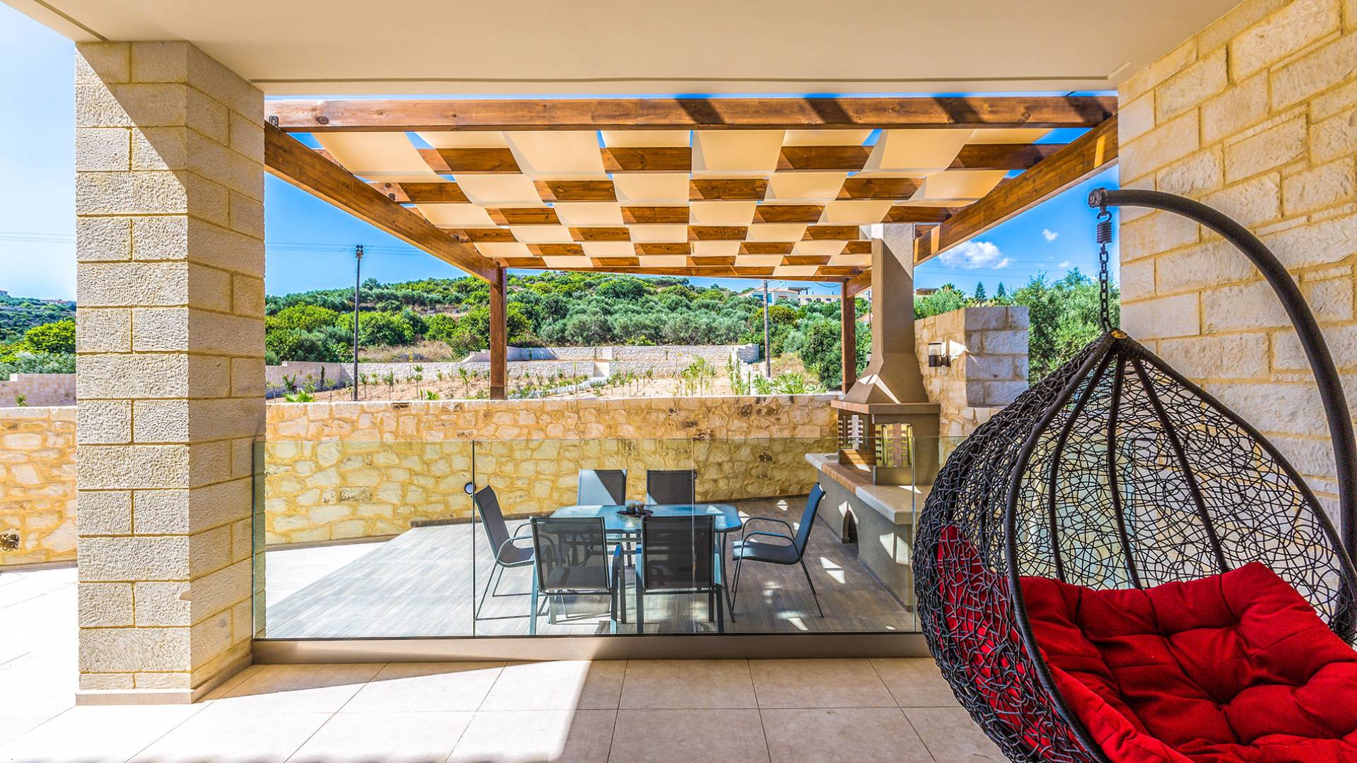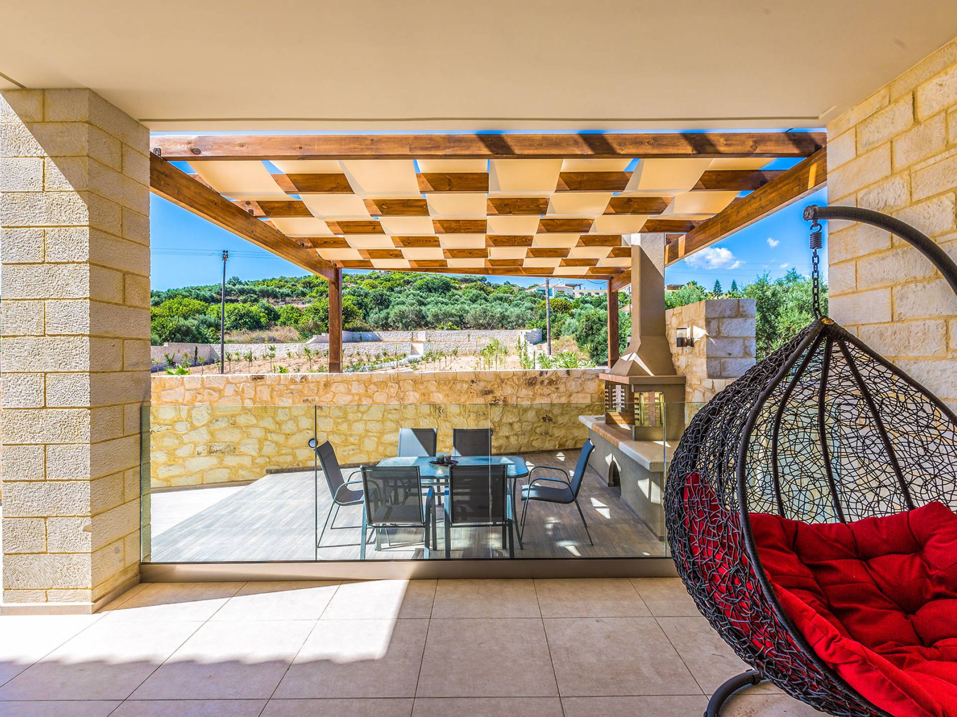 Eudora Villa Chania is built on a plot of 3.300 sqm. and the building area is 256 sqm. On the ground floor of Eudora Villa Chania, there is a spacious open-plan living room, dining room and open-plan kitchen, guest bathroom, and a storage room. There is also one bedroom with a bathroom. The living room and bedroom have access to a spacious sunny terrace. The second floor includes four bedrooms with a bathroom in each one. Every bedroom has wardrobes. Three of the bedrooms open into a balcony with the sea and mountains views. The private swimming pool is 38 sqm. with a barbeque area, wooden pergola and oven, and well-kept garden are located in a beautiful patio. The plot is surrounded by a stone wall for more privacy.