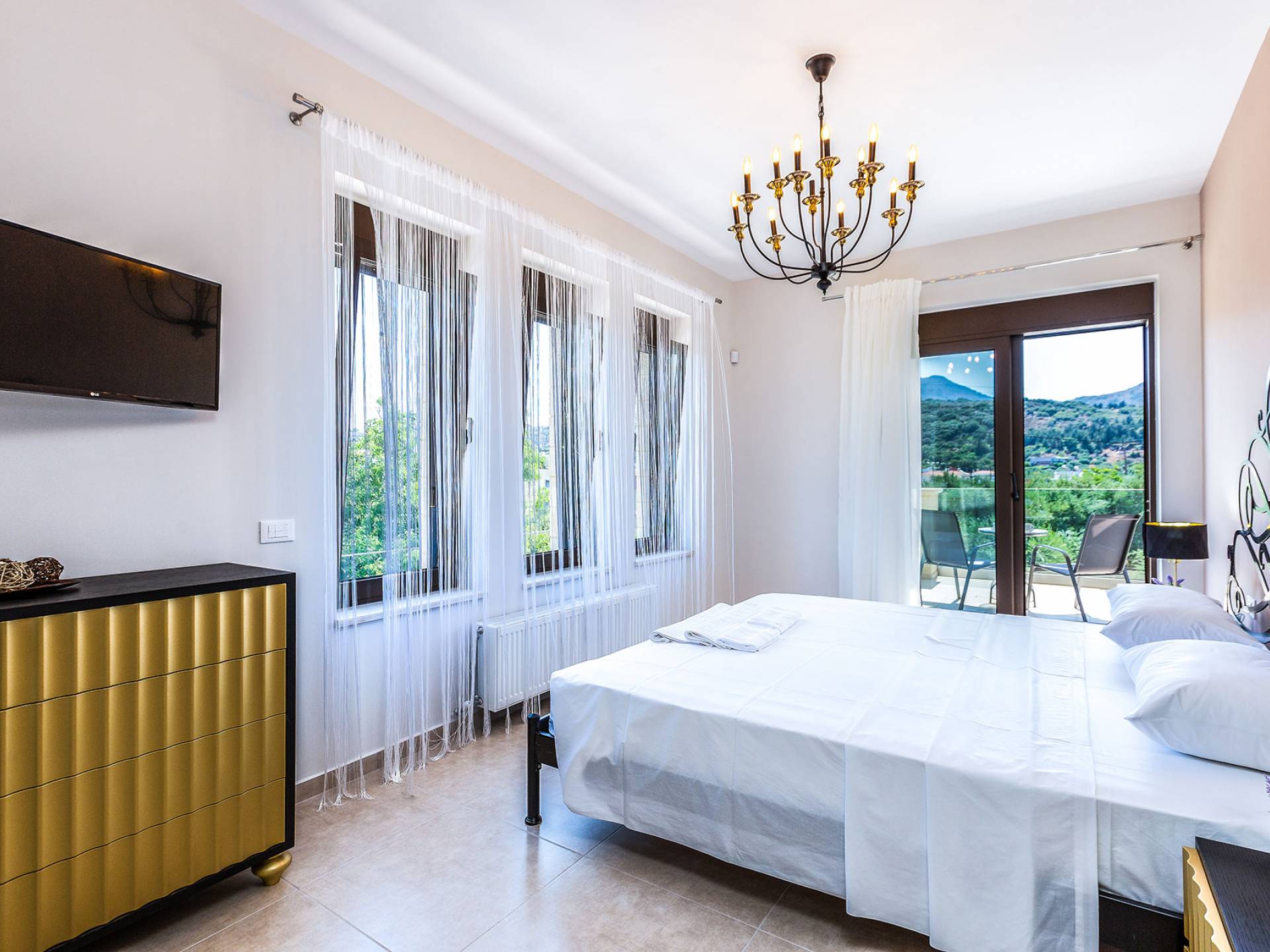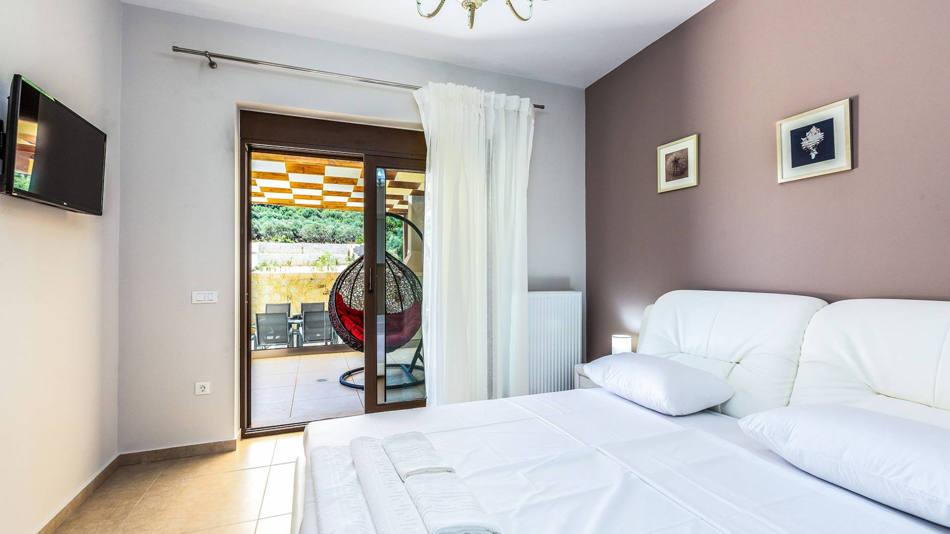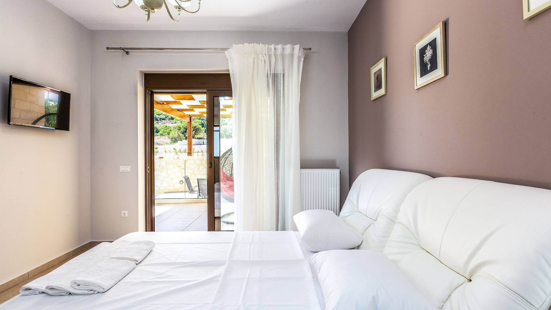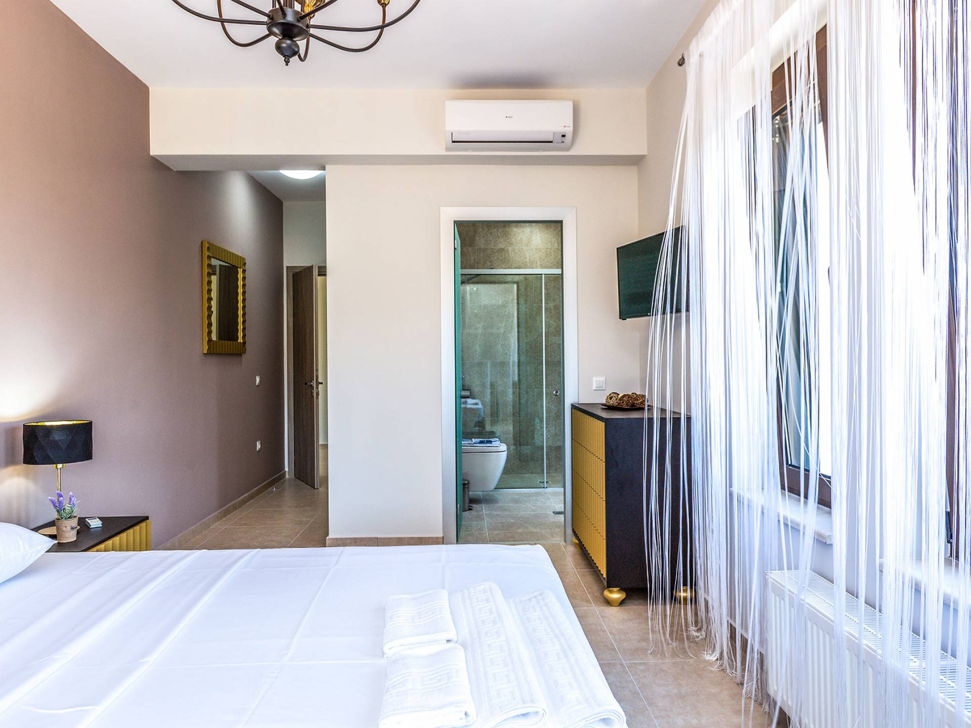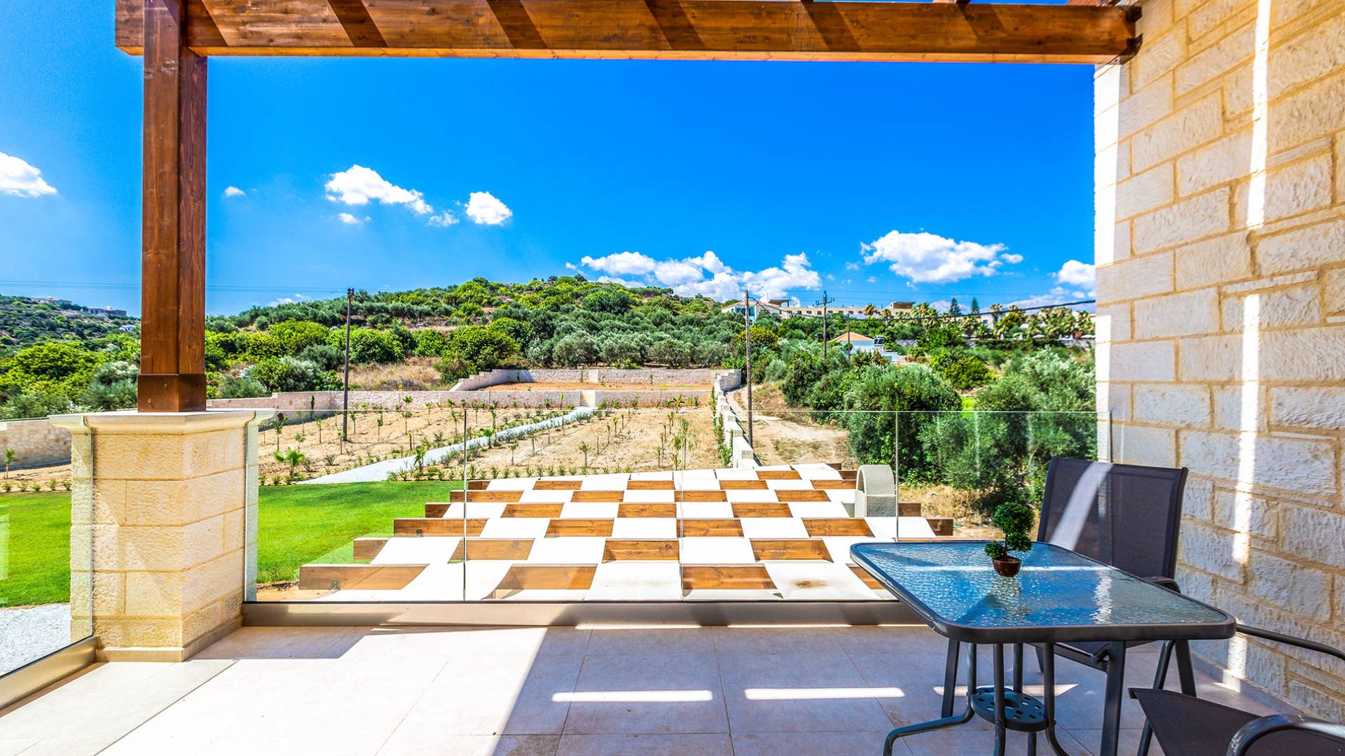 Eudora Villa Chania is built on a plot of 3.300 sqm. and the building area is 256 sqm. On the ground floor of Eudora Villa Chania, there is a spacious open-plan living room, dining room and open-plan kitchen, guest bathroom, and a storage room. There is also one bedroom with a bathroom. The living room and bedroom have access to a spacious sunny terrace. The second floor includes four bedrooms with a bathroom in each one. Every bedroom has wardrobes. Three of the bedrooms open into a balcony with the sea and mountains views. The private swimming pool is 38 sqm. with a barbeque area, wooden pergola and oven, and well-kept garden are located in a beautiful patio. The plot is surrounded by a stone wall for more privacy.