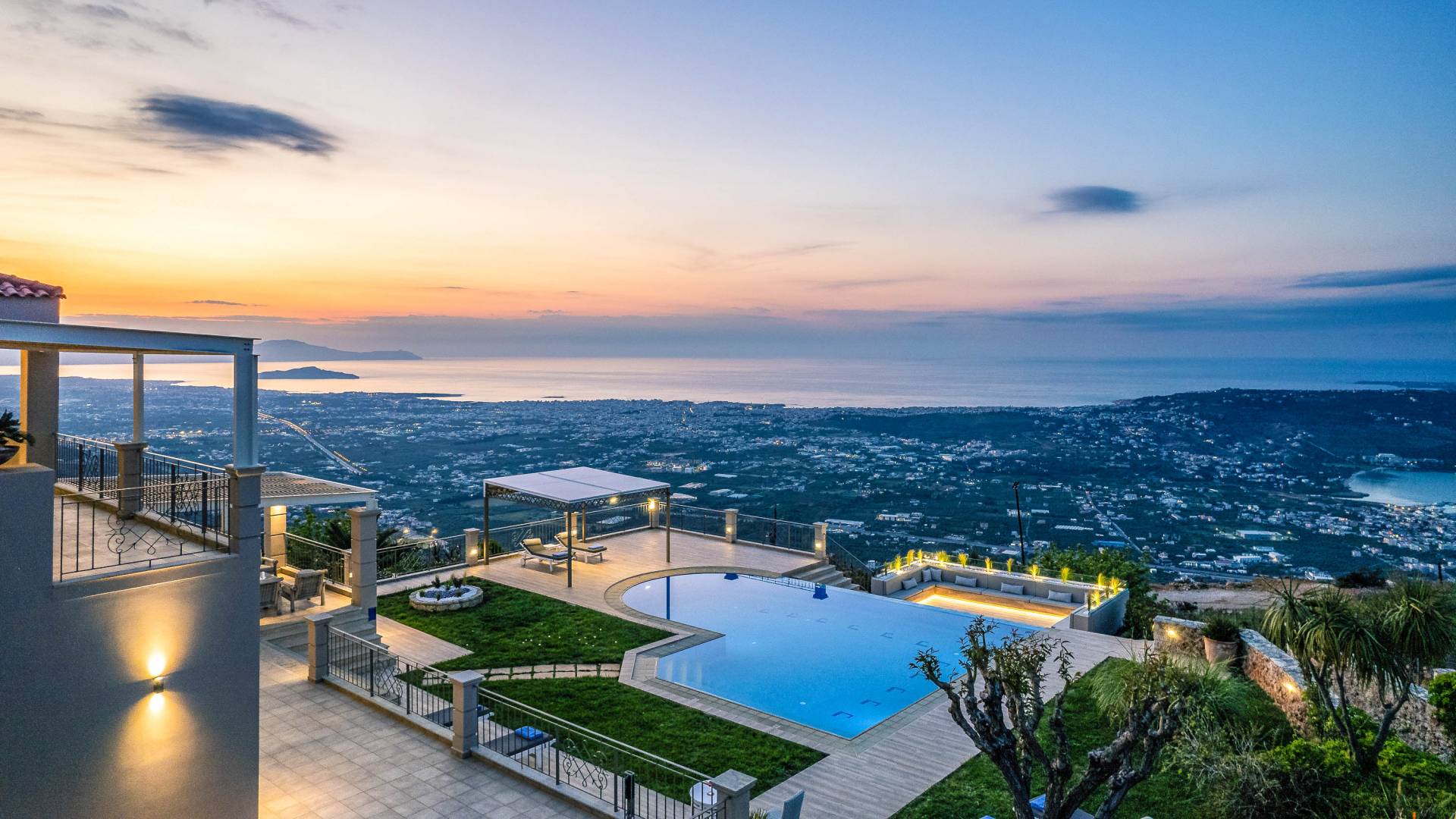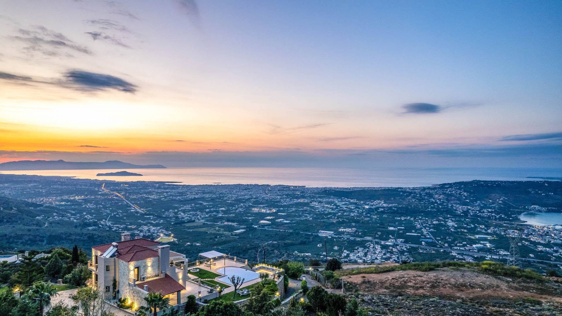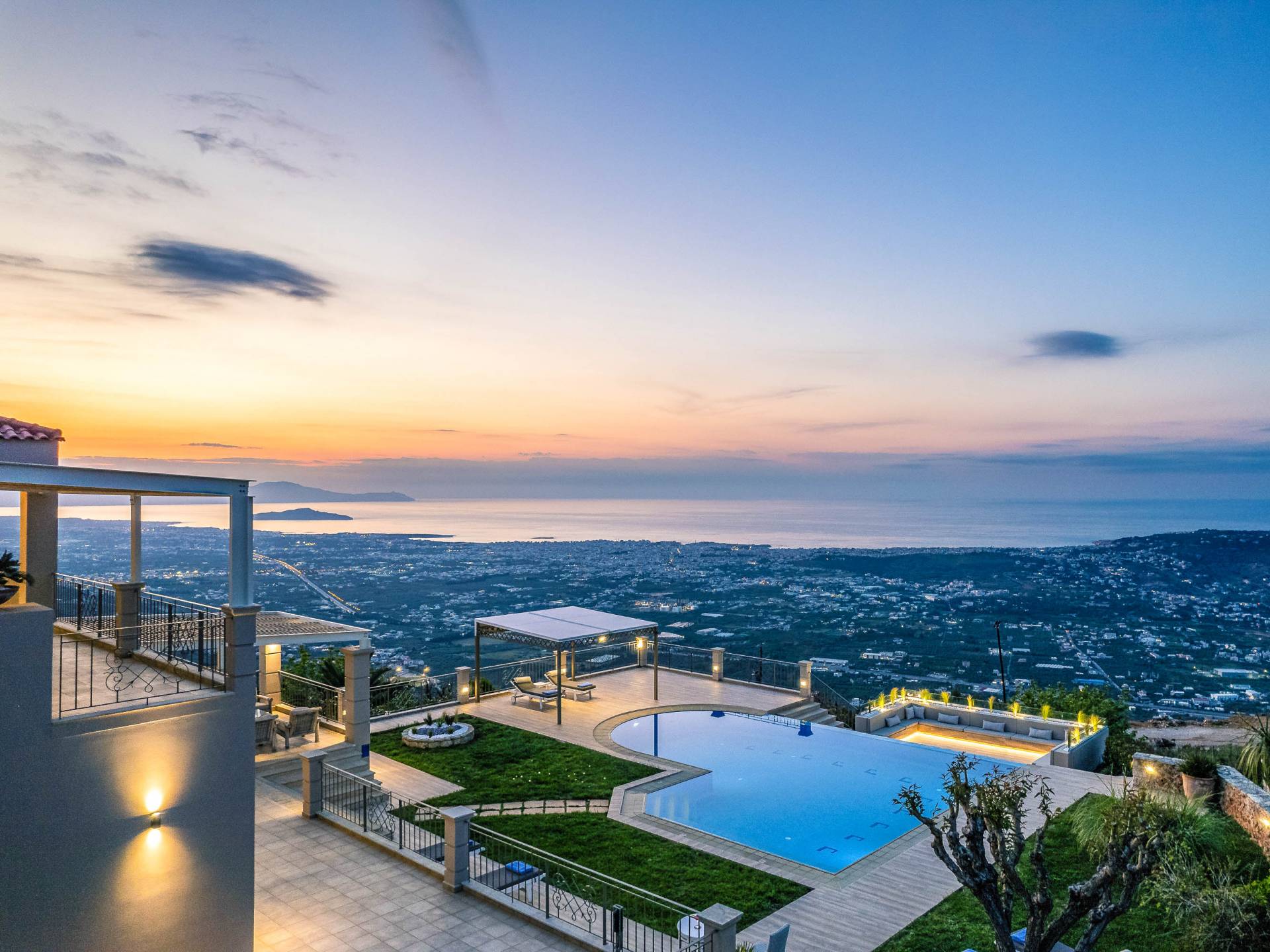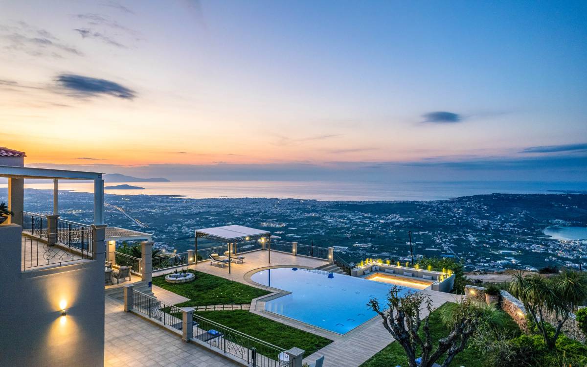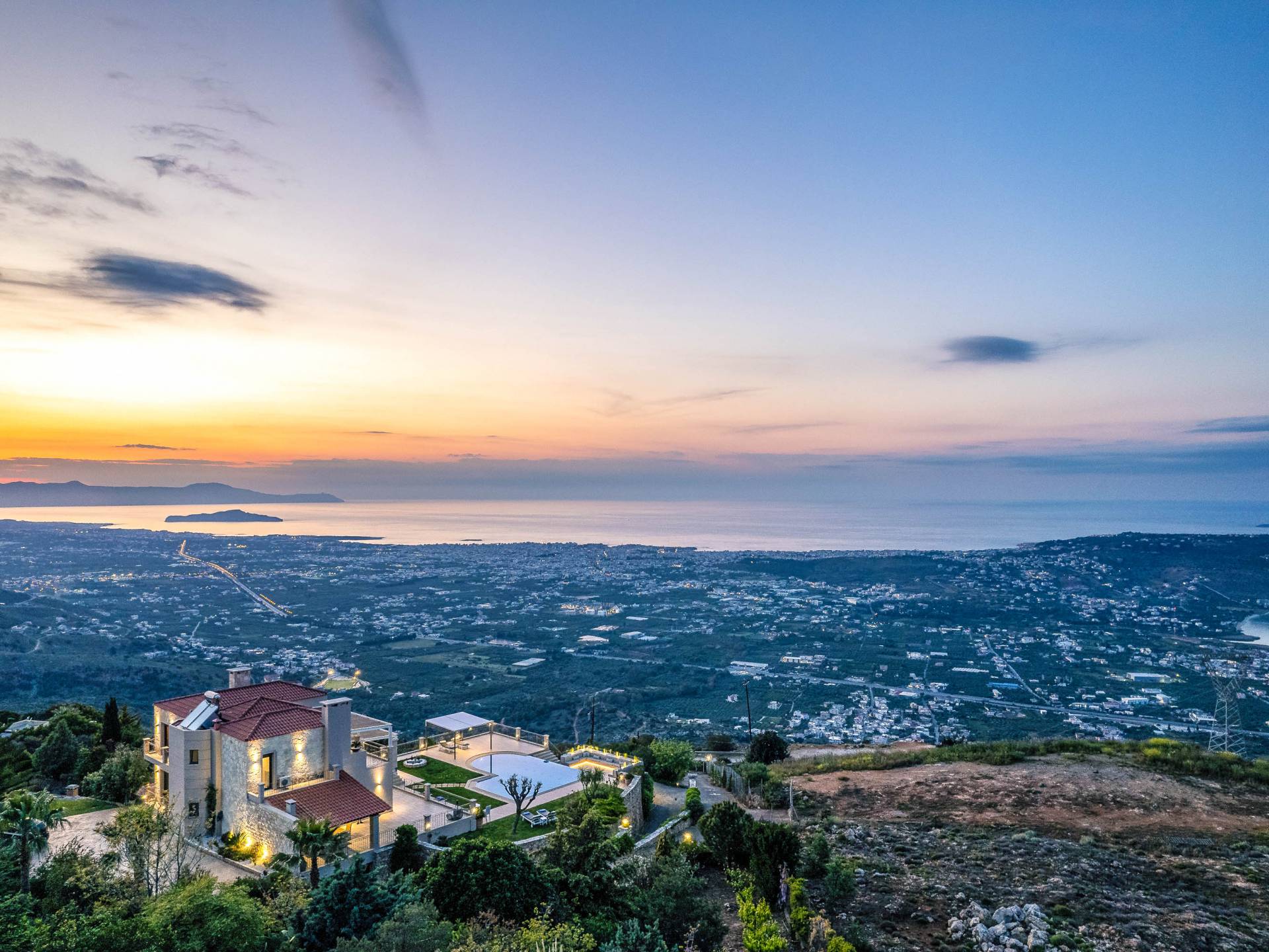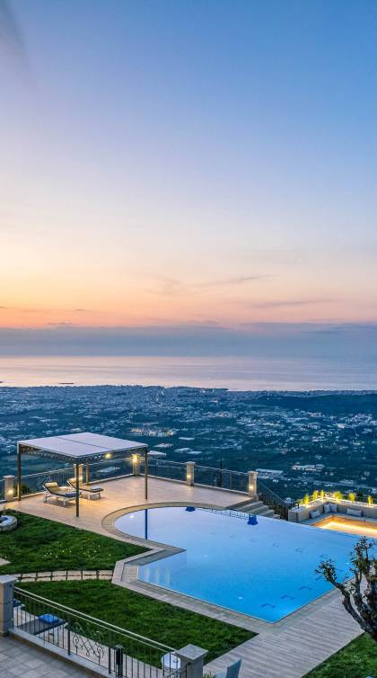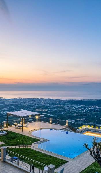 Golden Hill Villa Chania is a 450 sq.m luxury villa with a high maximum quality of construction and luxurious facilities for the whole family. Located on a totally private and fenced hill of 6,000 sqm just on the outskirts of Chania city, the villa offers absolute peace and probably the best full view over the Cretan island and the sea! You have the feeling that you are staying over the sky as the villa is located 600 meters over sea level and Chania city but only a few km away from them!