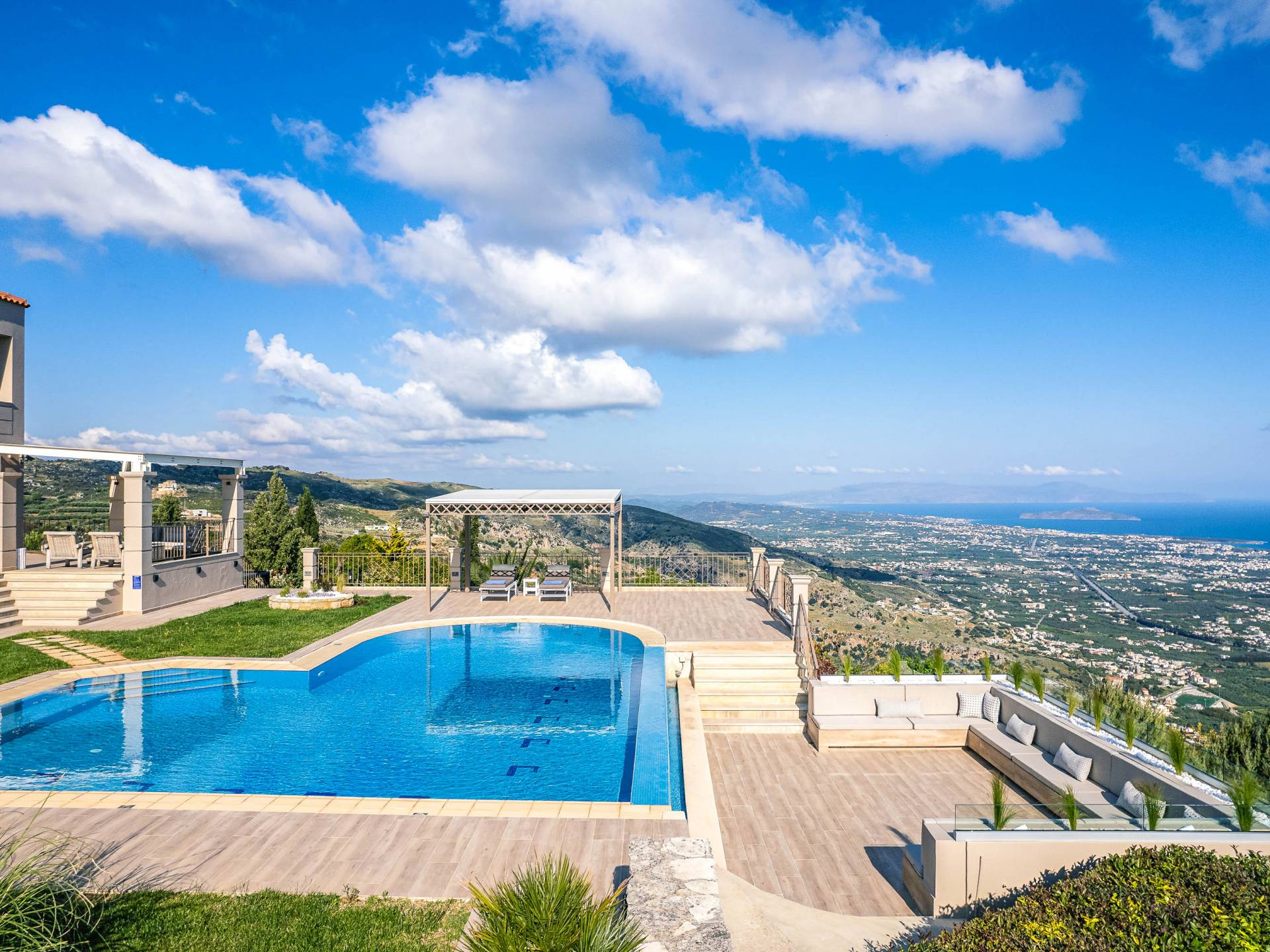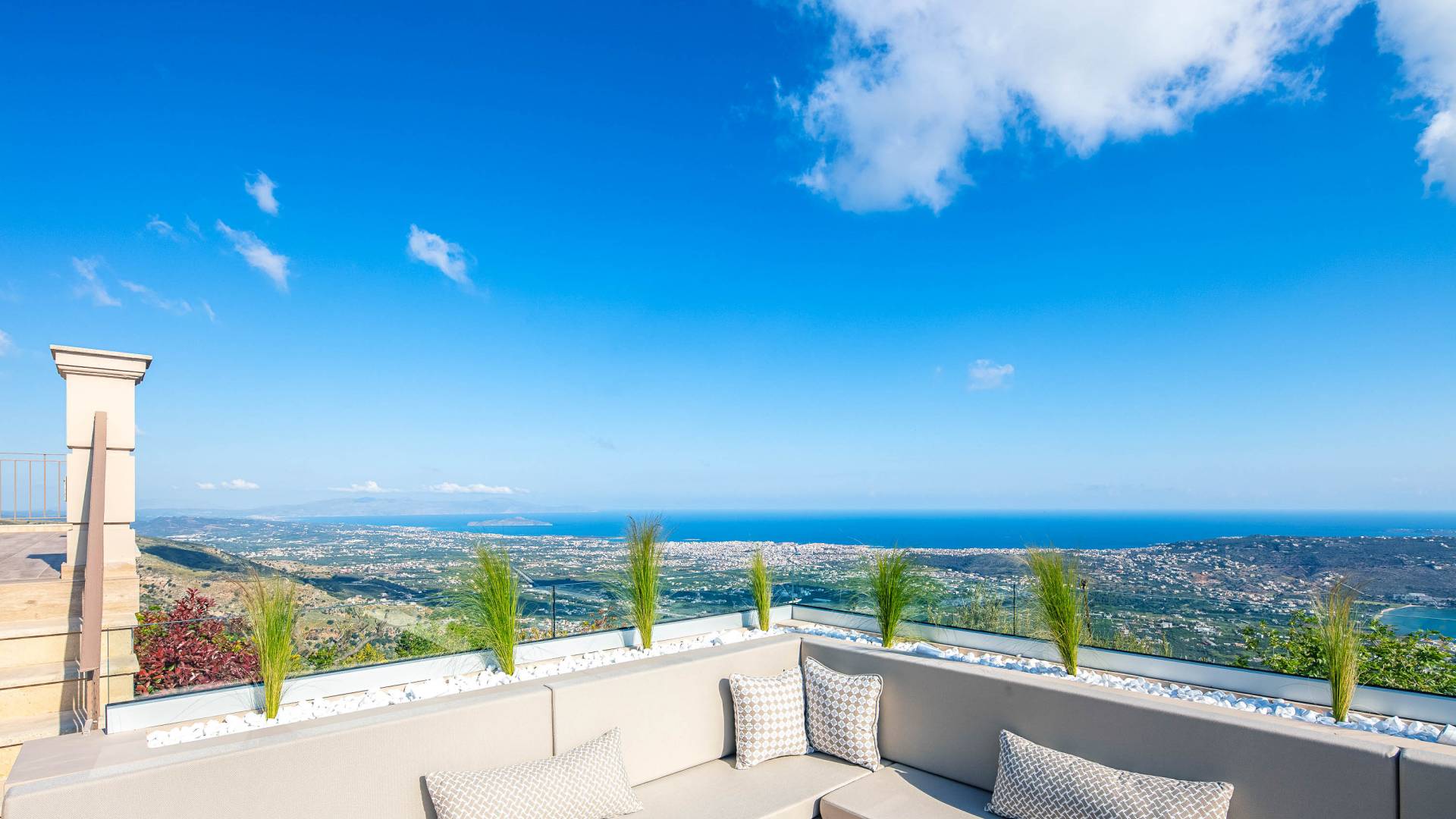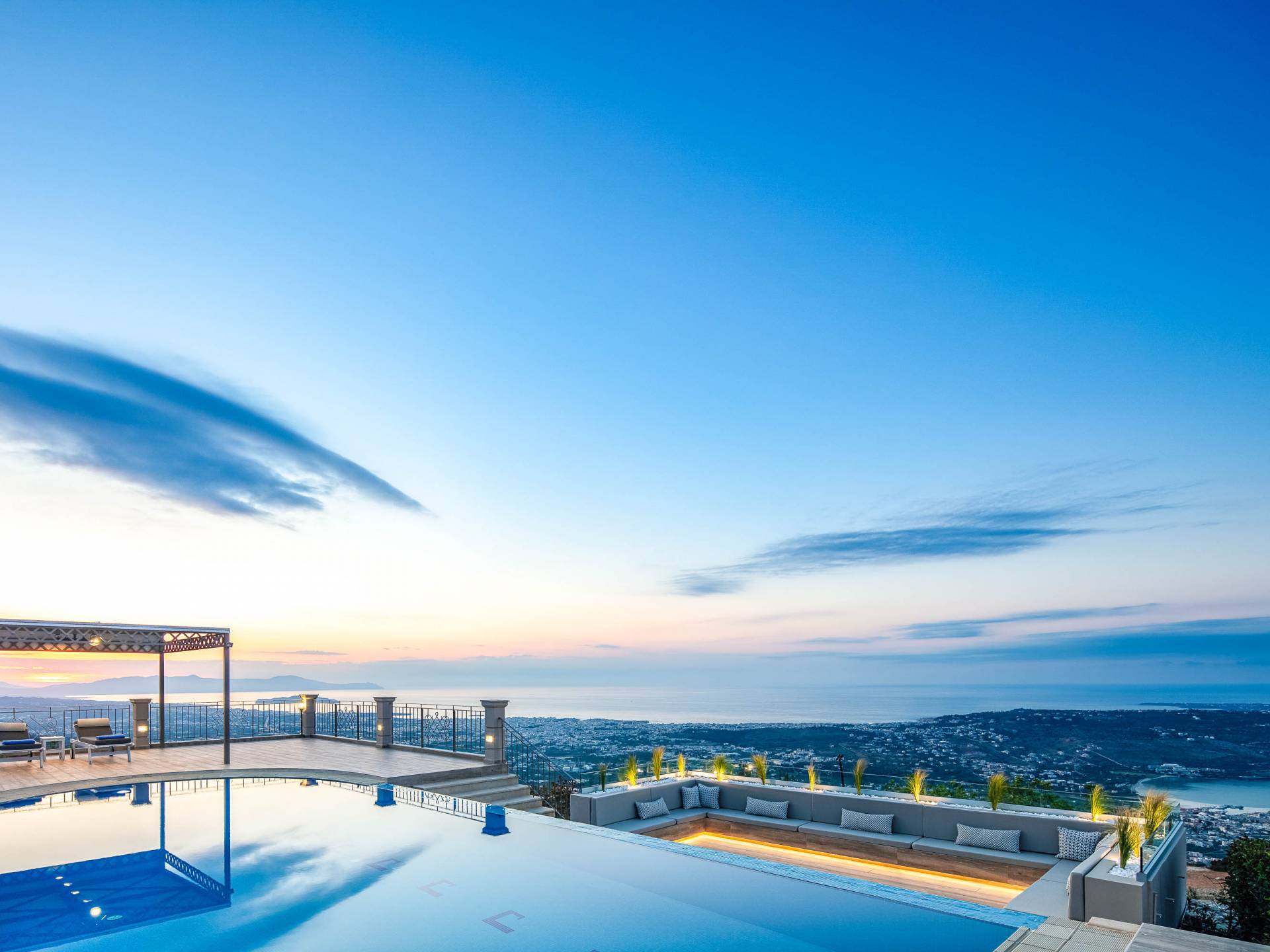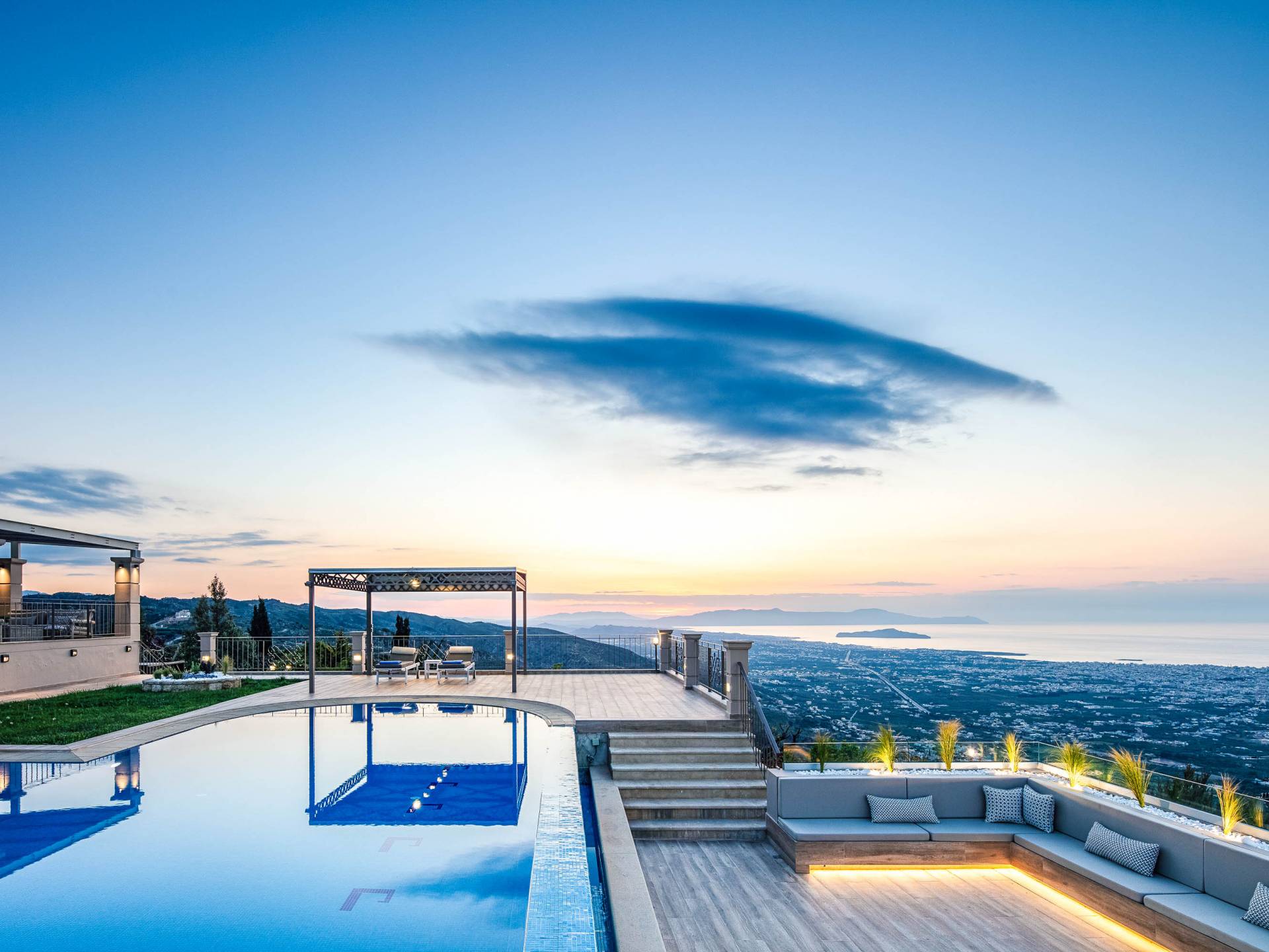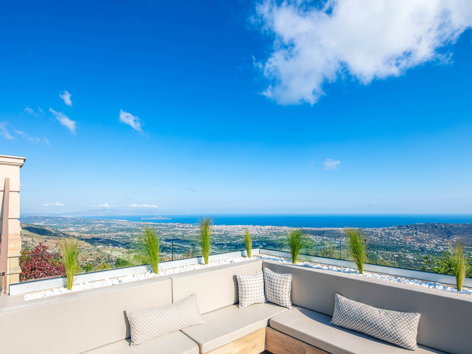 Golden Hill Villa Chania is a 450 sq.m luxury villa with a high maximum quality of construction and luxurious facilities for the whole family. Located on a totally private and fenced hill of 6,000 sqm just on the outskirts of Chania city, the villa offers absolute peace and probably the best full view over the Cretan island and the sea! You have the feeling that you are staying over the sky as the villa is located 600 meters over sea level and Chania city but only a few km away from them!