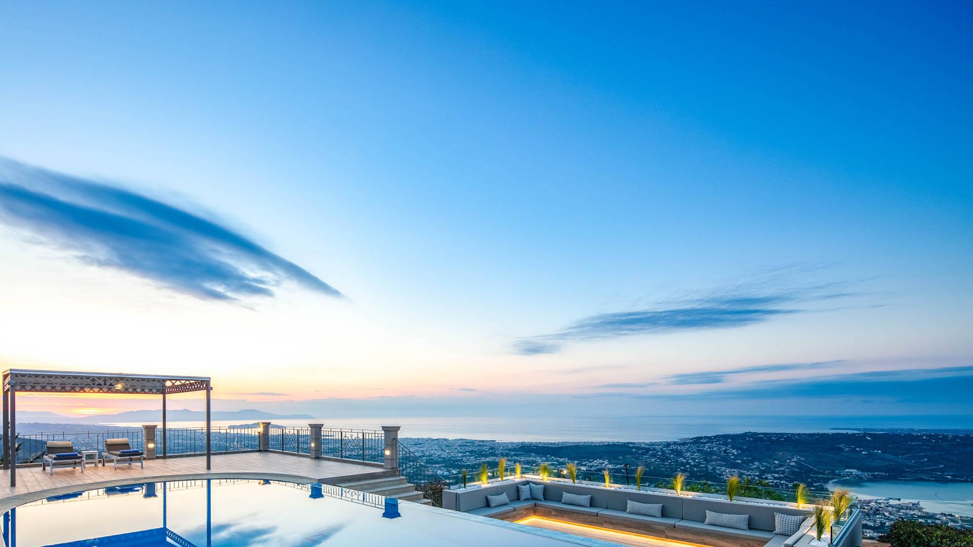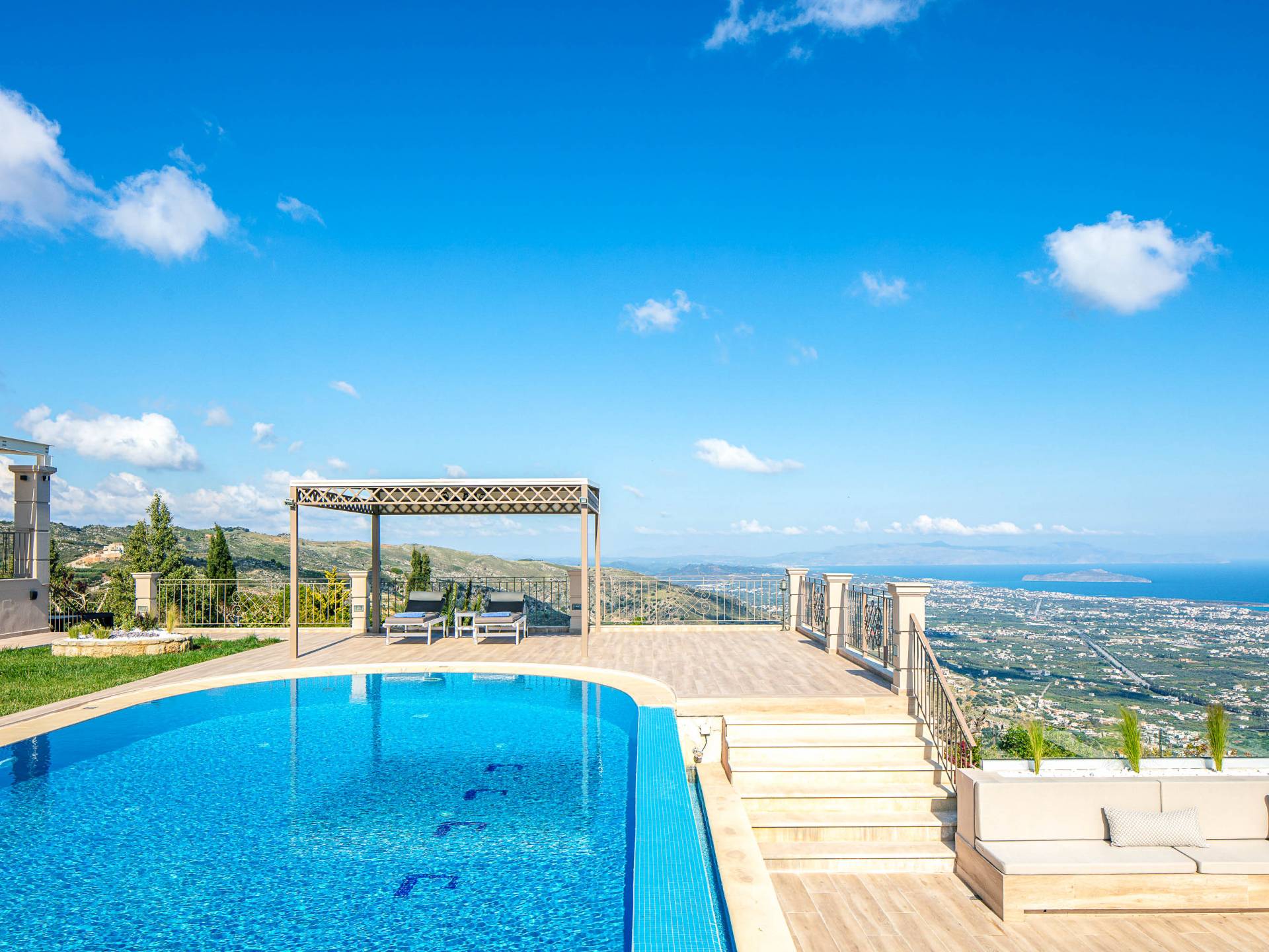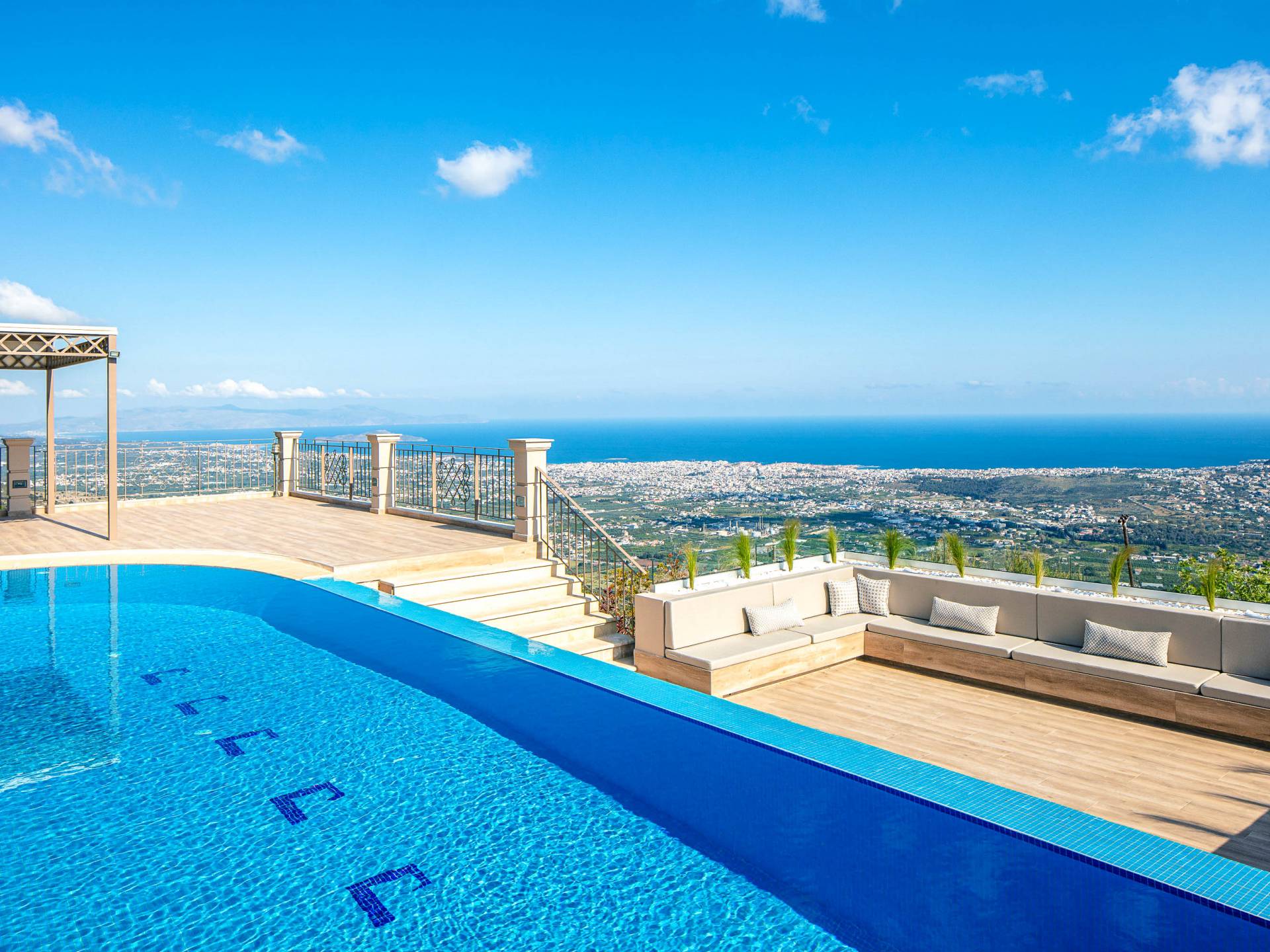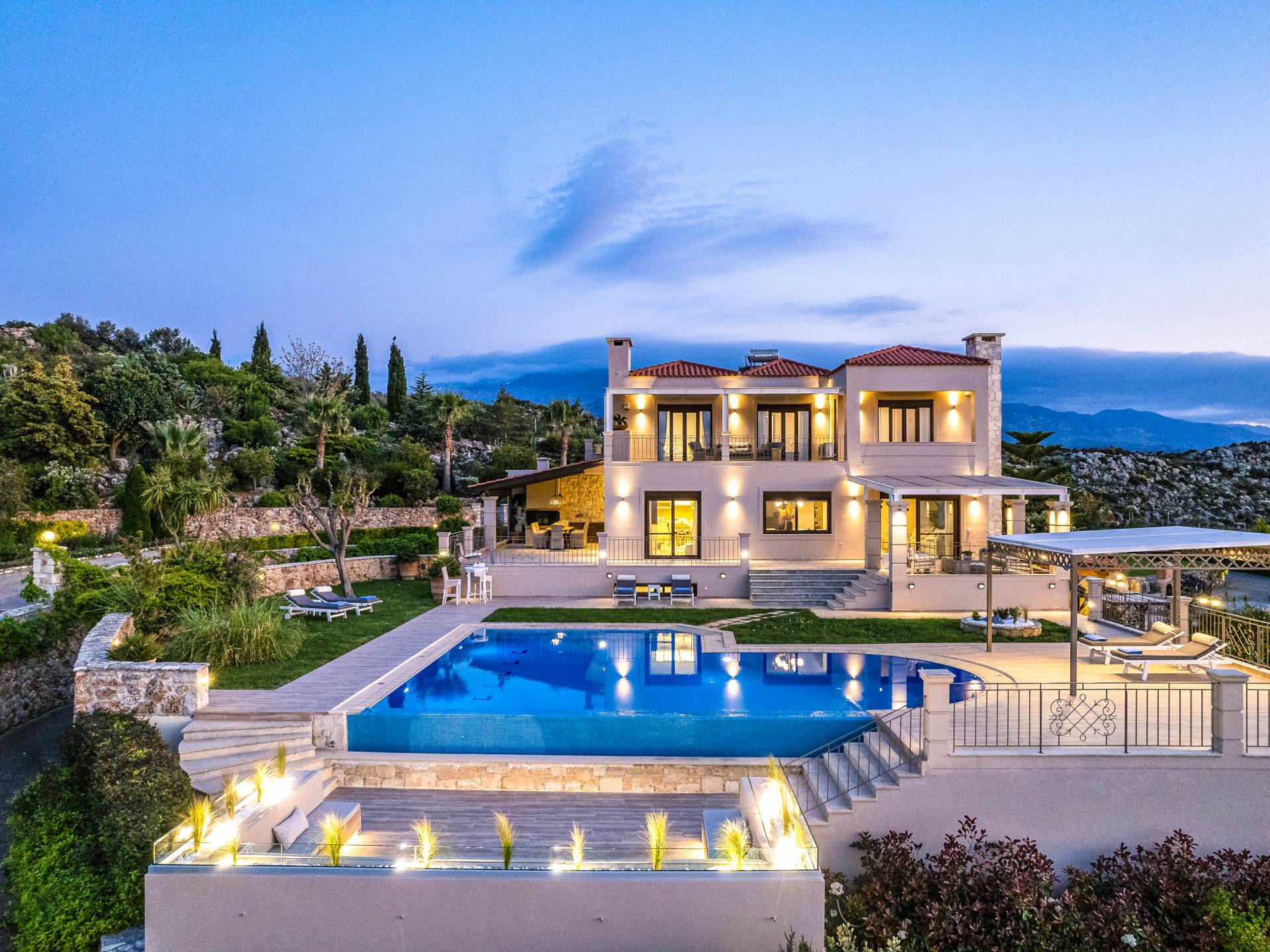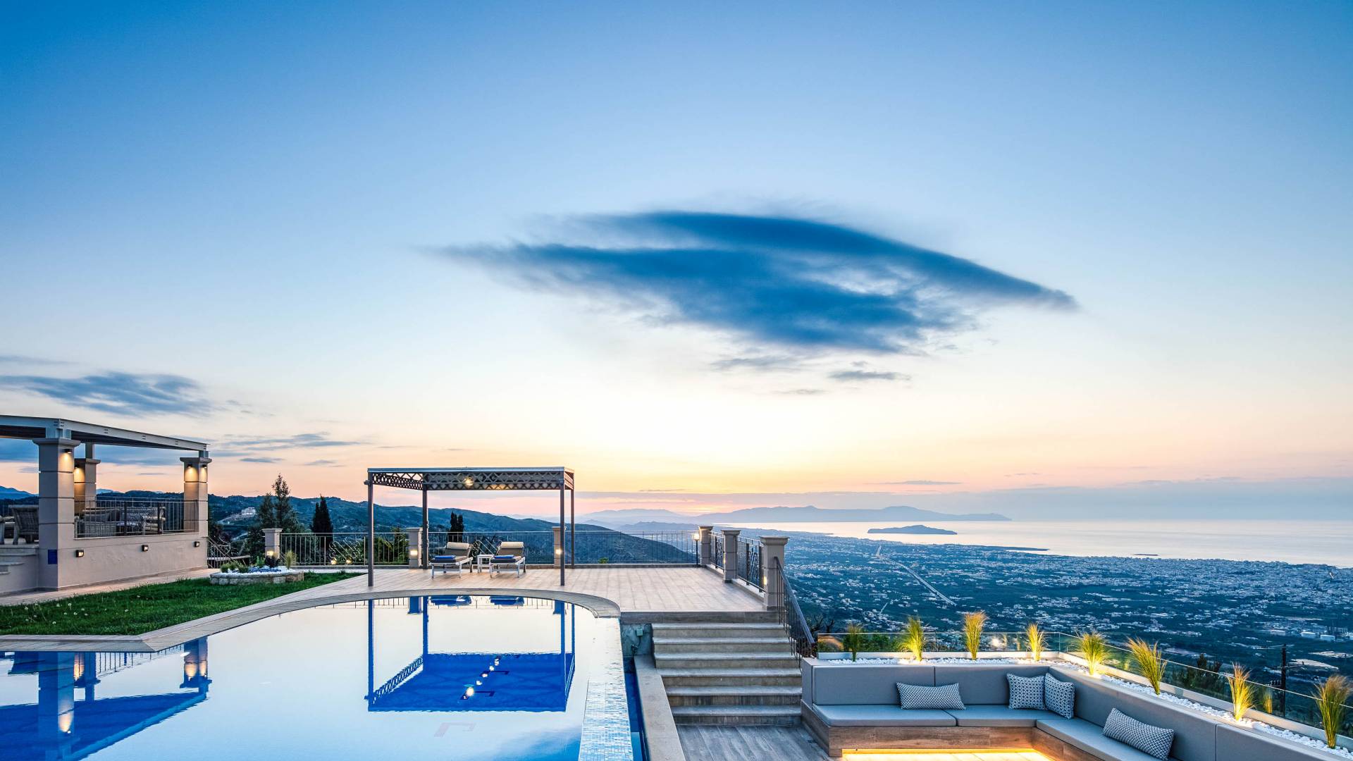 Golden Hill Villa Chania is a 450 sq.m luxury villa with a high maximum quality of construction and luxurious facilities for the whole family. Located on a totally private and fenced hill of 6,000 sqm just on the outskirts of Chania city, the villa offers absolute peace and probably the best full view over the Cretan island and the sea! You have the feeling that you are staying over the sky as the villa is located 600 meters over sea level and Chania city but only a few km away from them!