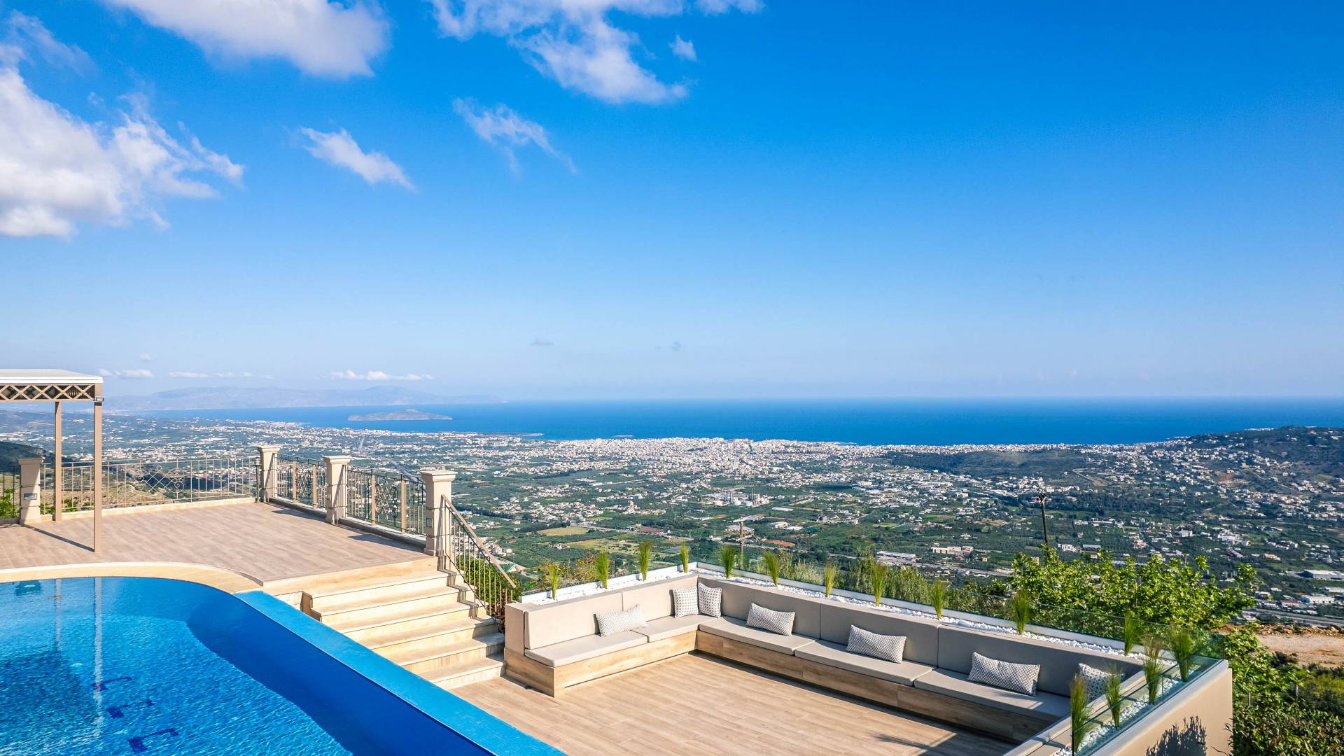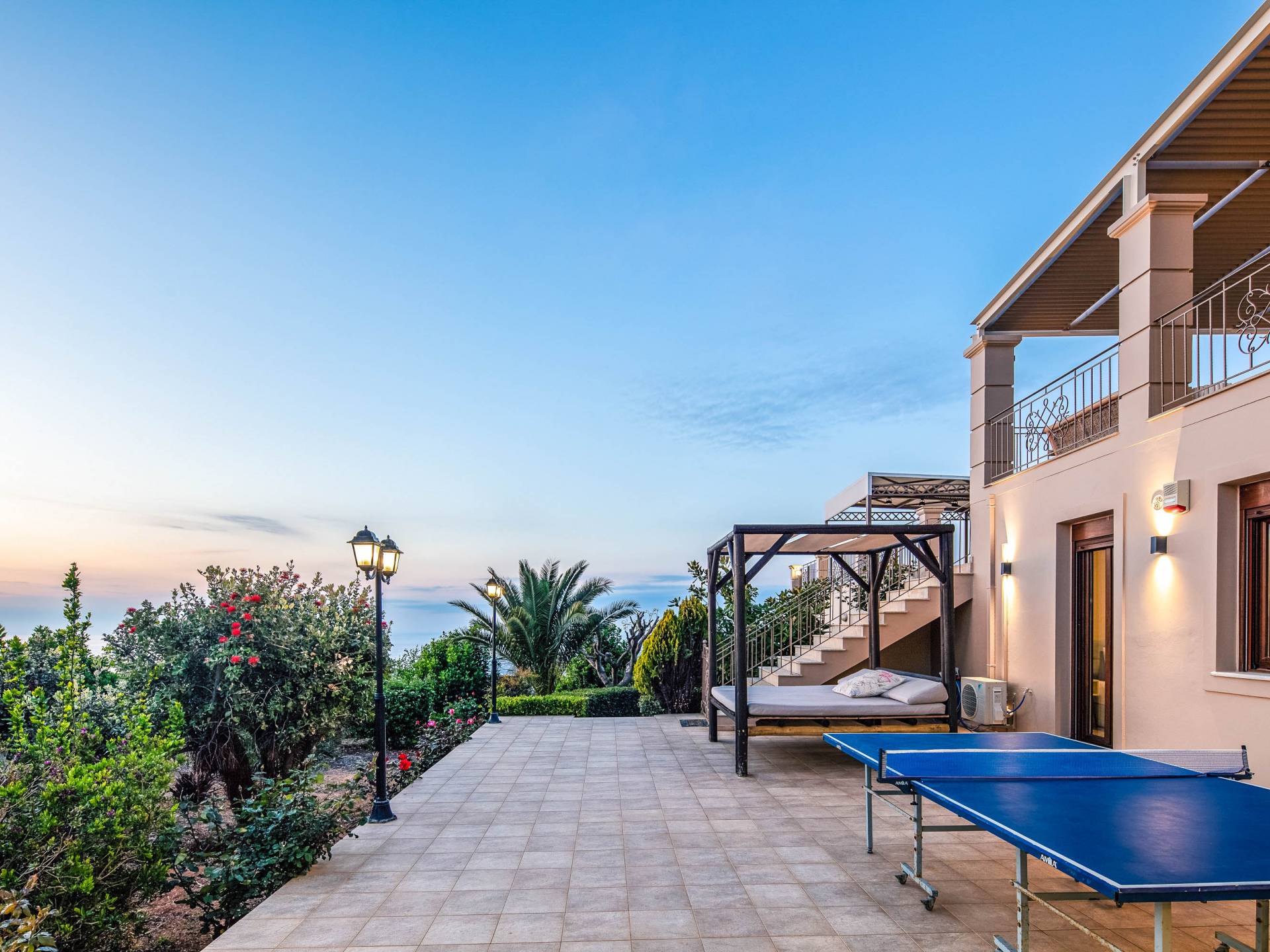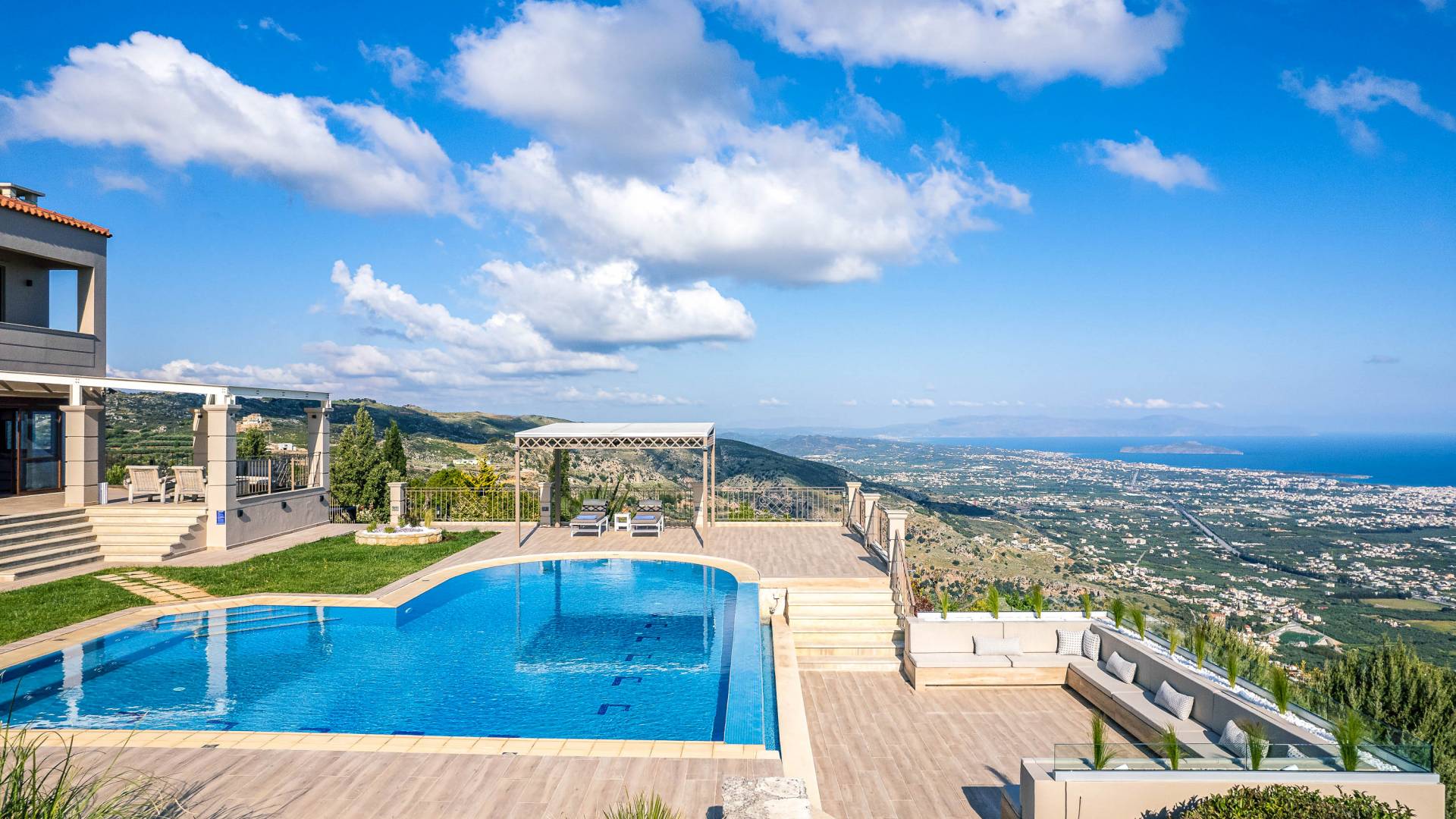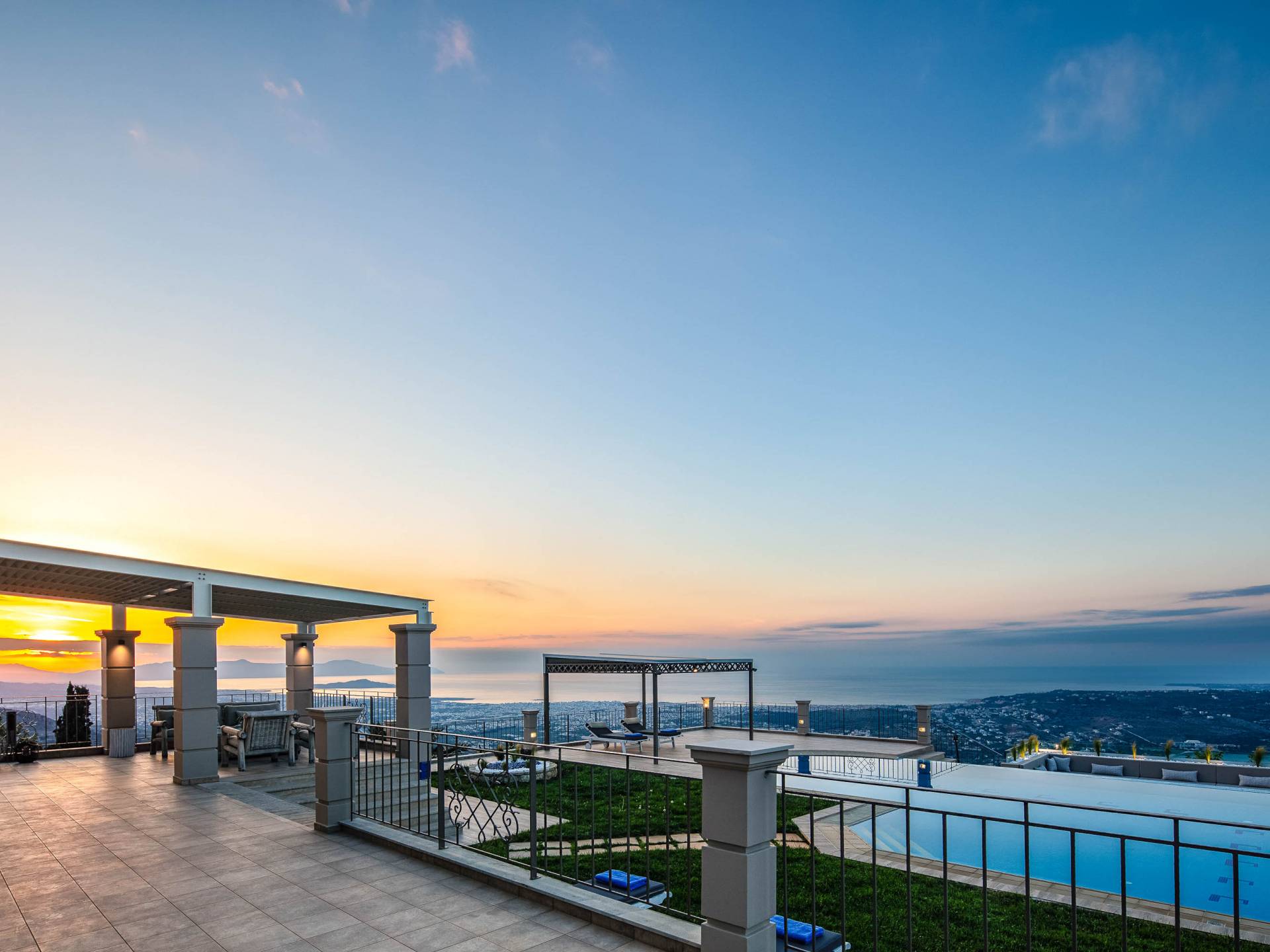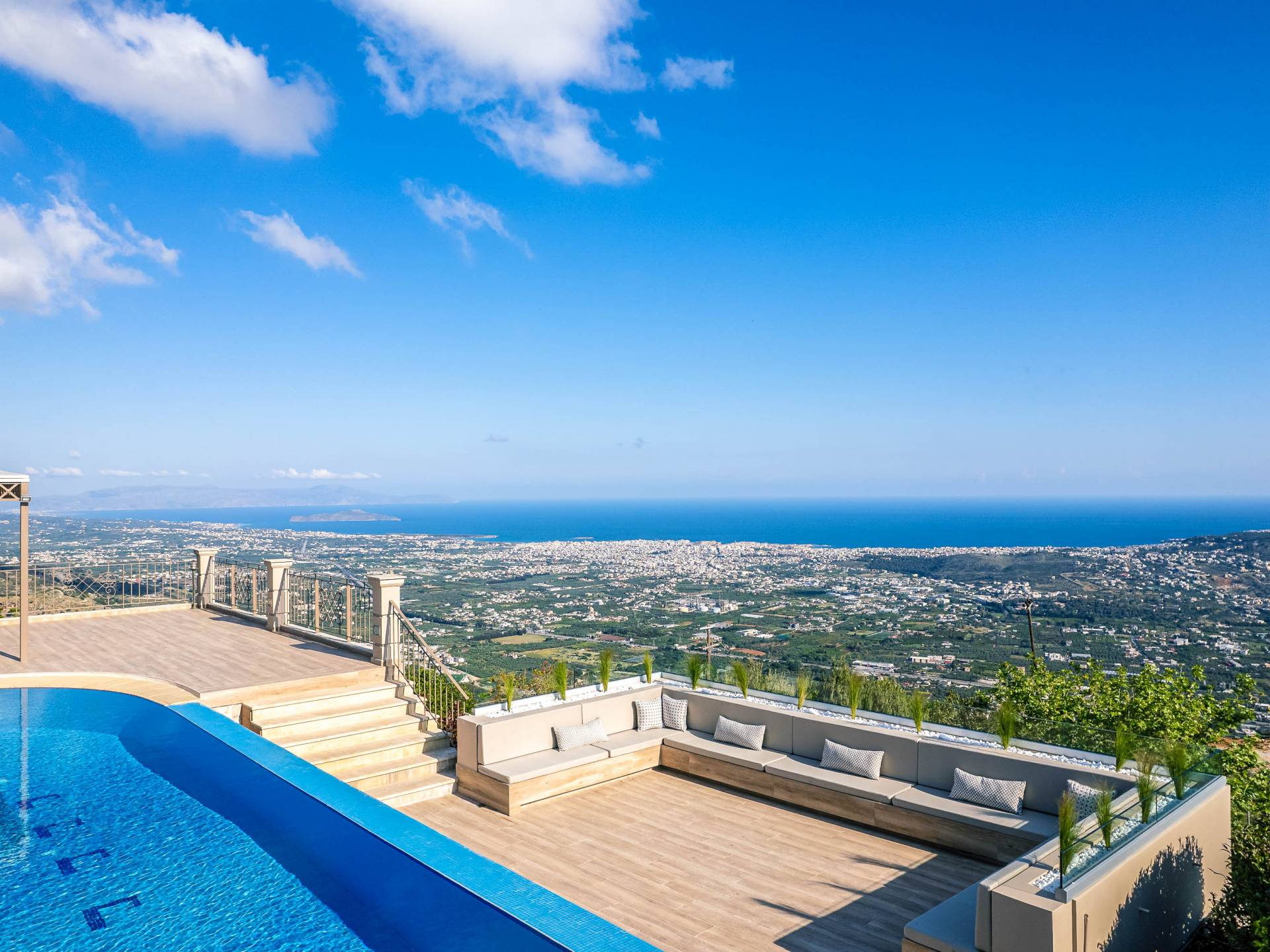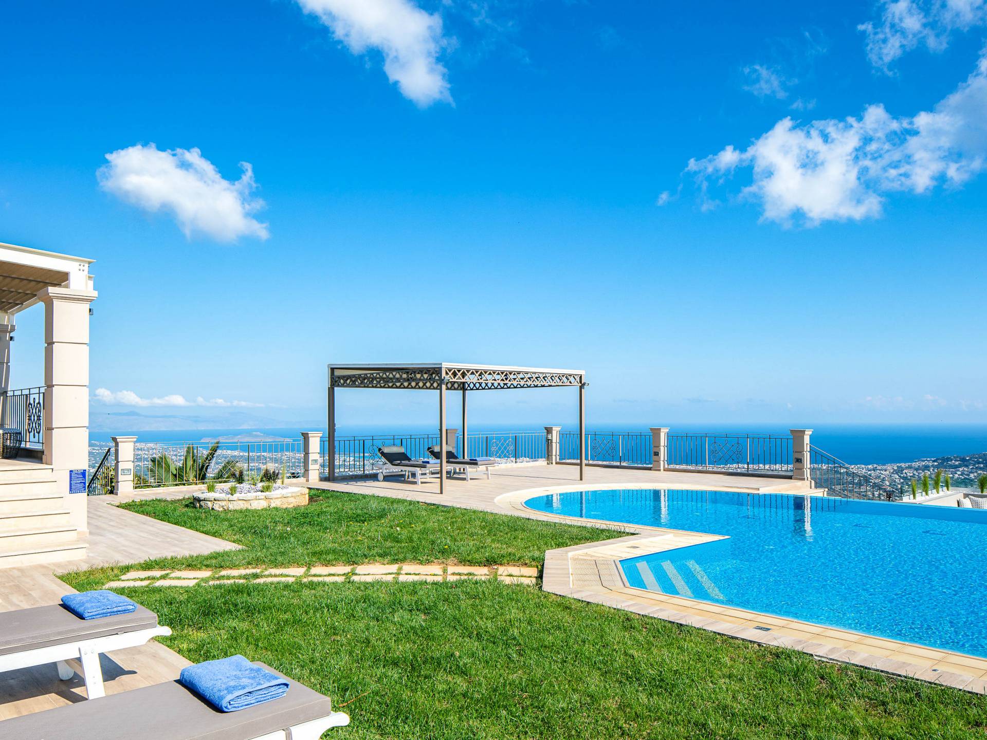 Golden Hill Villa Chania is a 450 sq.m luxury villa with a high maximum quality of construction and luxurious facilities for the whole family. Located on a totally private and fenced hill of 6,000 sqm just on the outskirts of Chania city, the villa offers absolute peace and probably the best full view over the Cretan island and the sea! You have the feeling that you are staying over the sky as the villa is located 600 meters over sea level and Chania city but only a few km away from them!