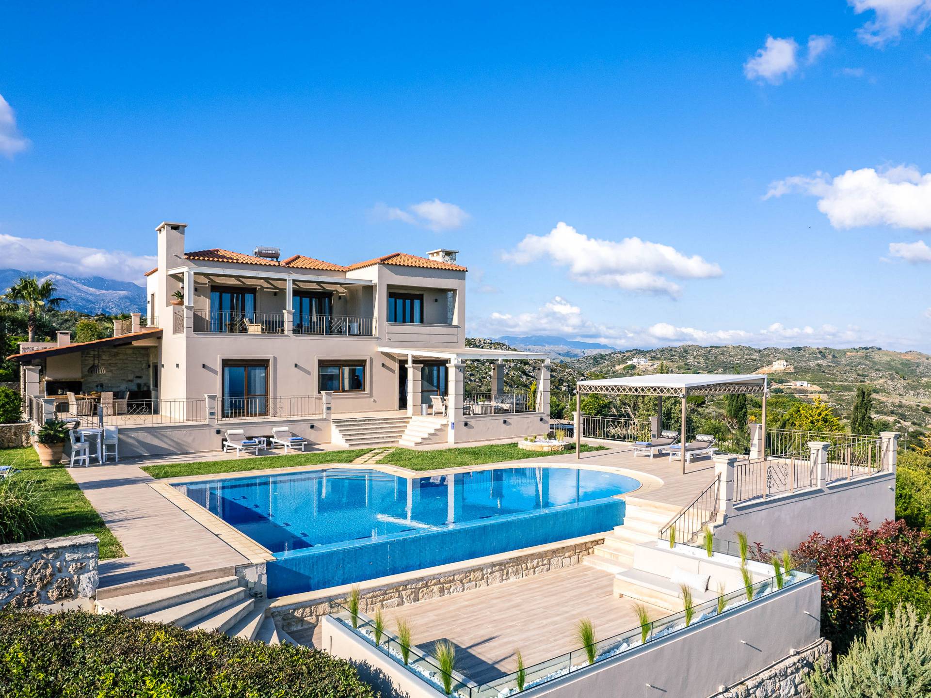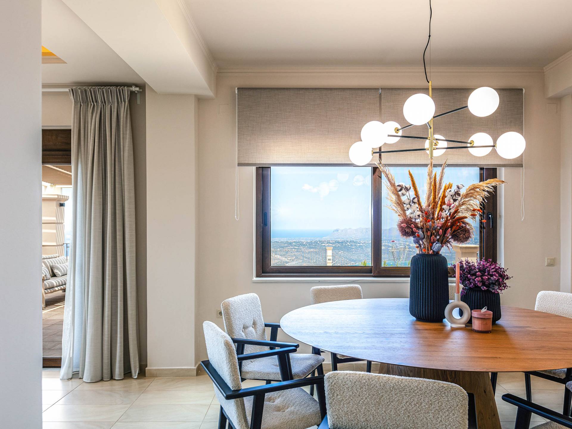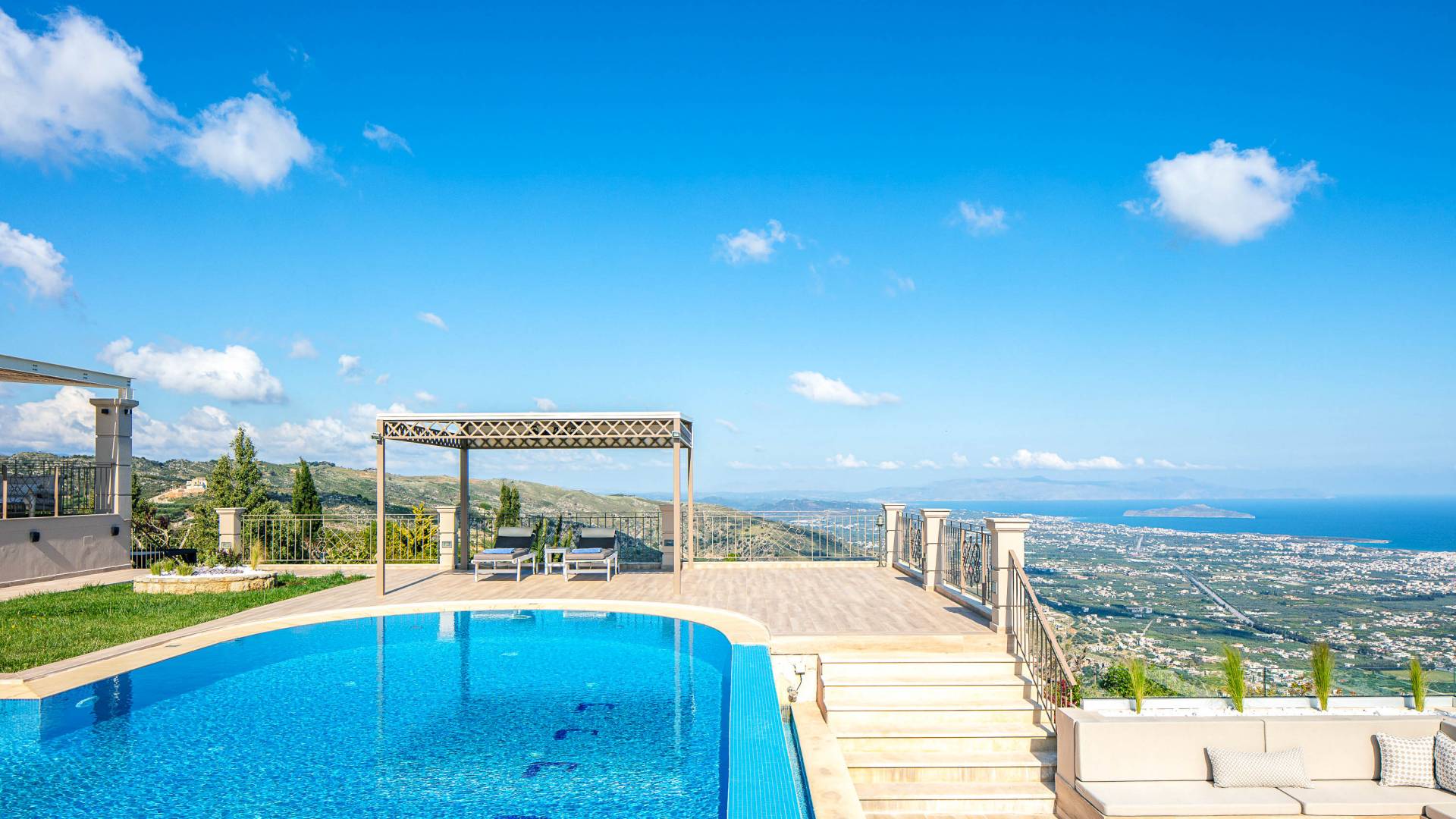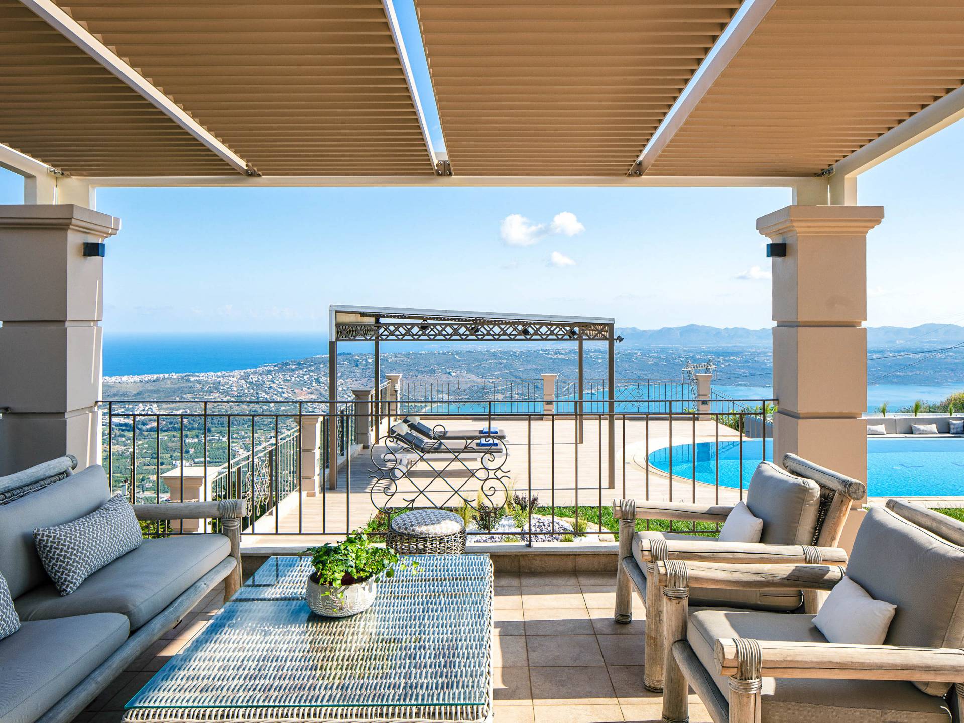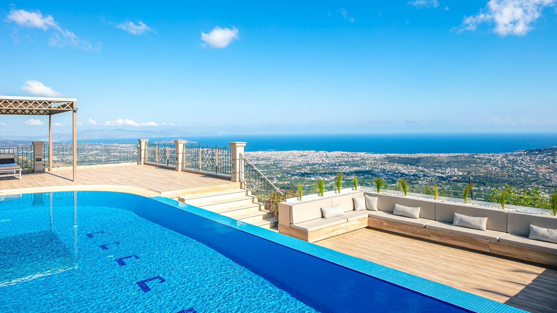 Golden Hill Villa Chania is a 450 sq.m luxury villa with a high maximum quality of construction and luxurious facilities for the whole family. Located on a totally private and fenced hill of 6,000 sqm just on the outskirts of Chania city, the villa offers absolute peace and probably the best full view over the Cretan island and the sea! You have the feeling that you are staying over the sky as the villa is located 600 meters over sea level and Chania city but only a few km away from them!