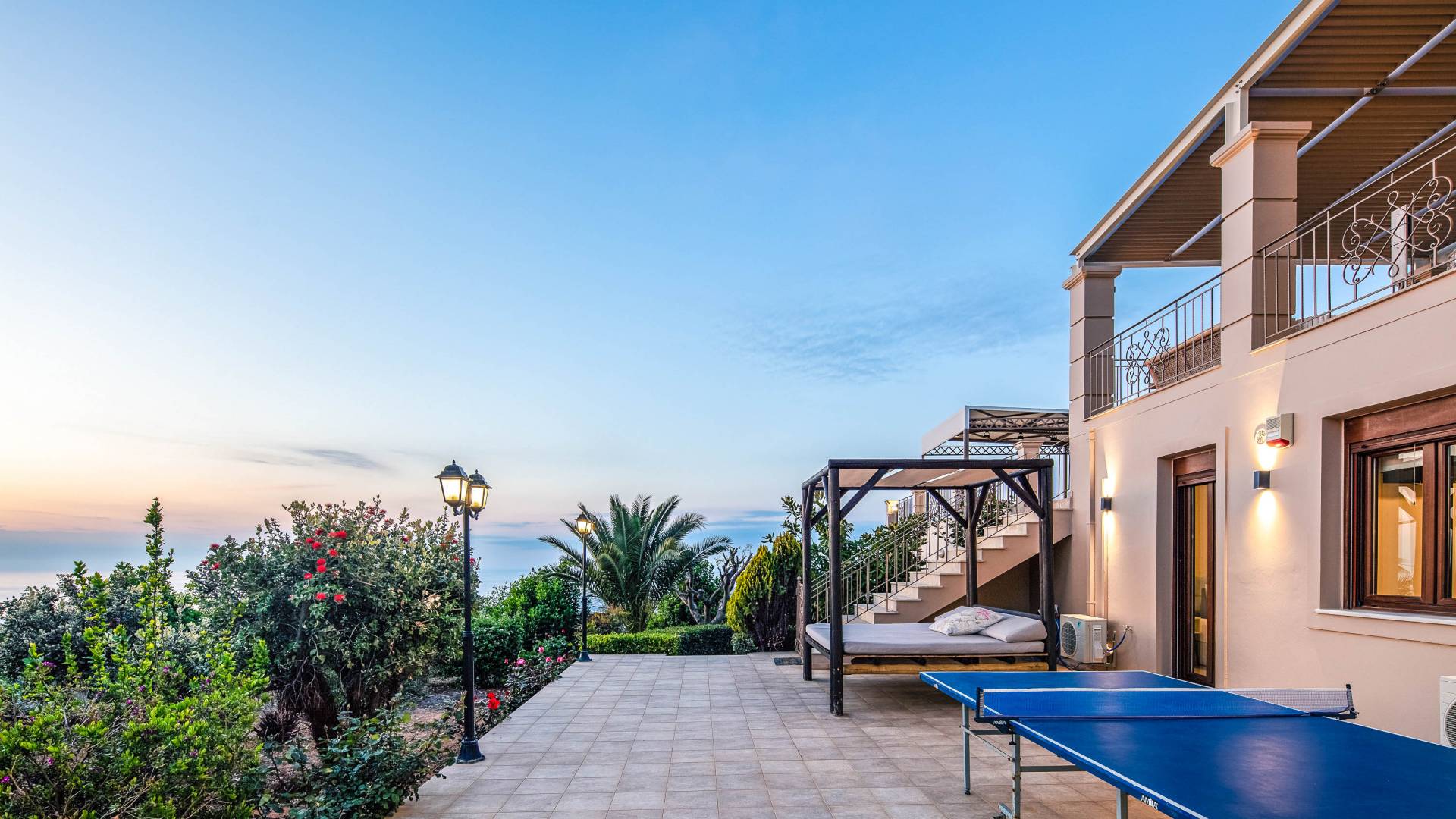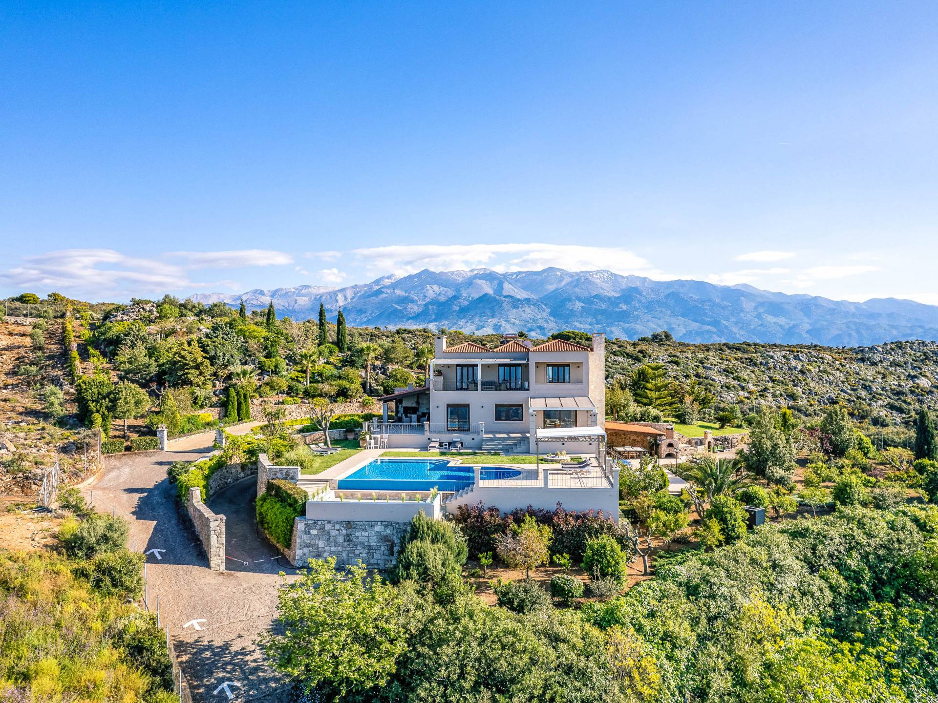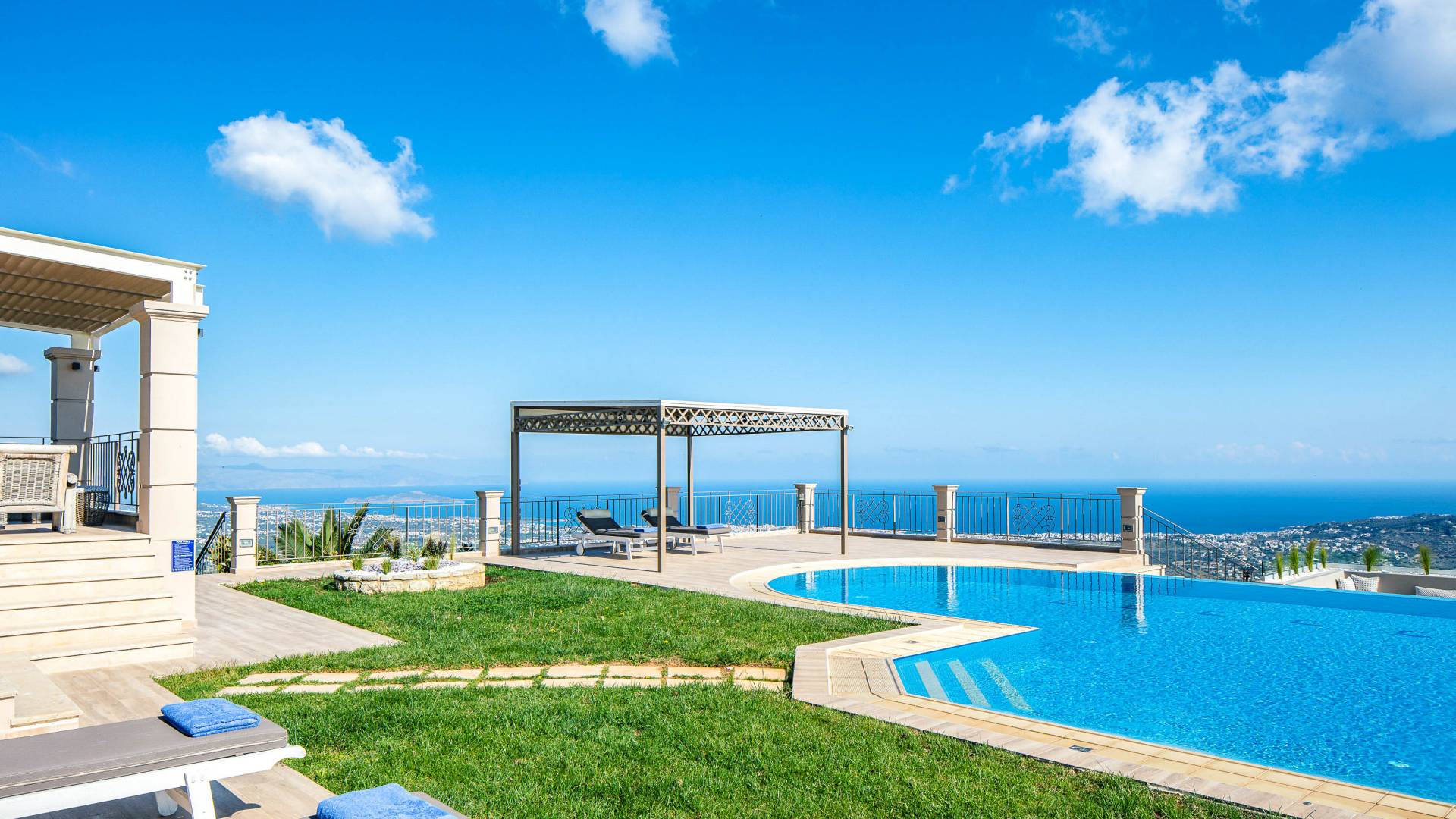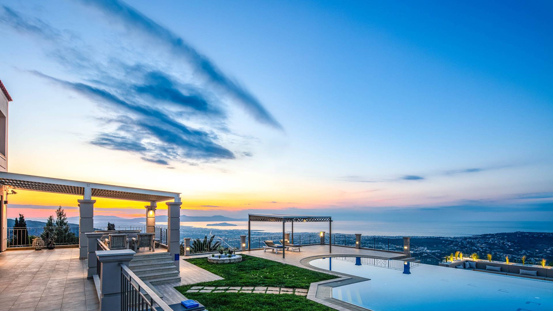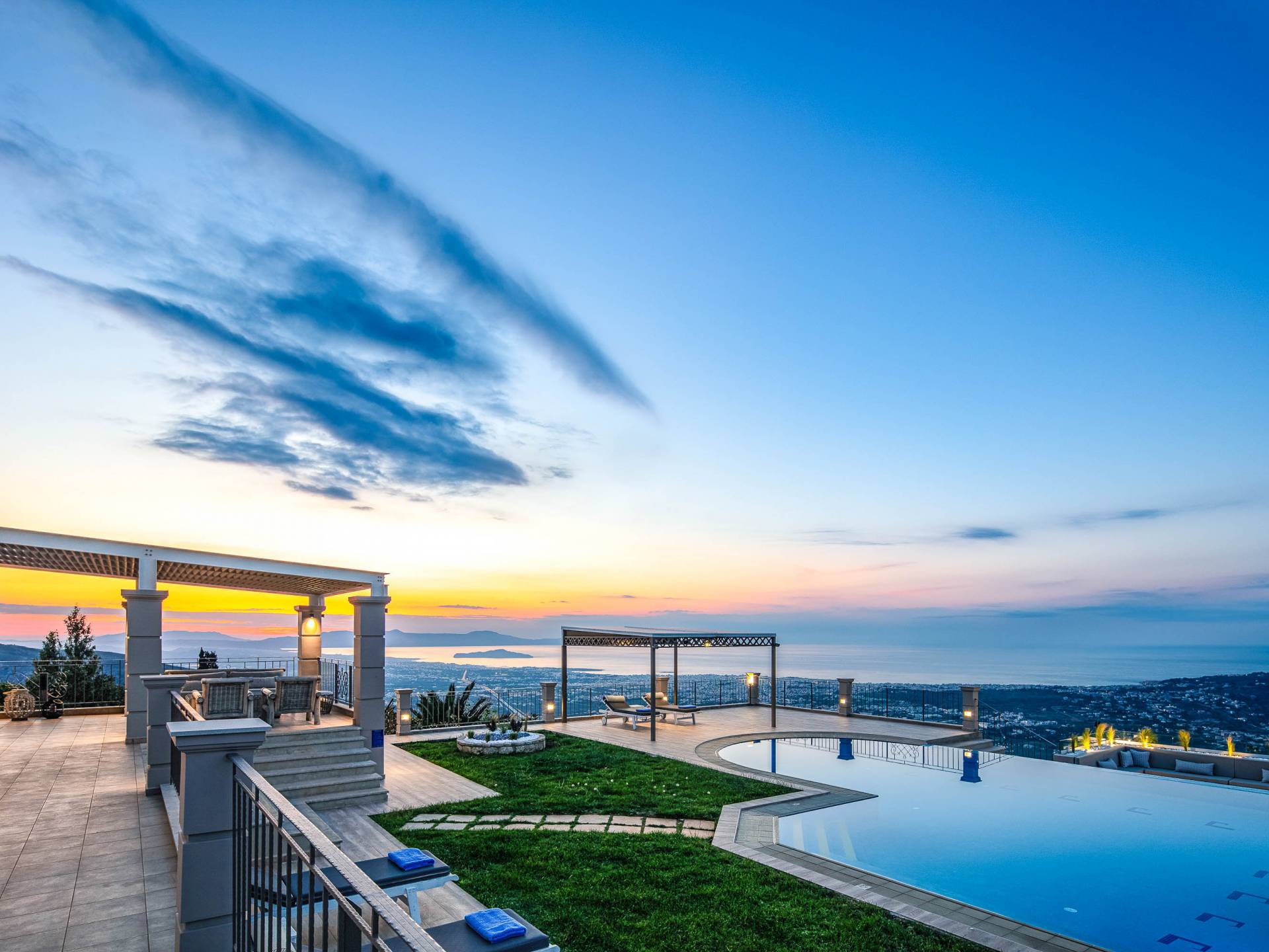 Golden Hill Villa Chania is a 450 sq.m luxury villa with a high maximum quality of construction and luxurious facilities for the whole family. Located on a totally private and fenced hill of 6,000 sqm just on the outskirts of Chania city, the villa offers absolute peace and probably the best full view over the Cretan island and the sea! You have the feeling that you are staying over the sky as the villa is located 600 meters over sea level and Chania city but only a few km away from them!