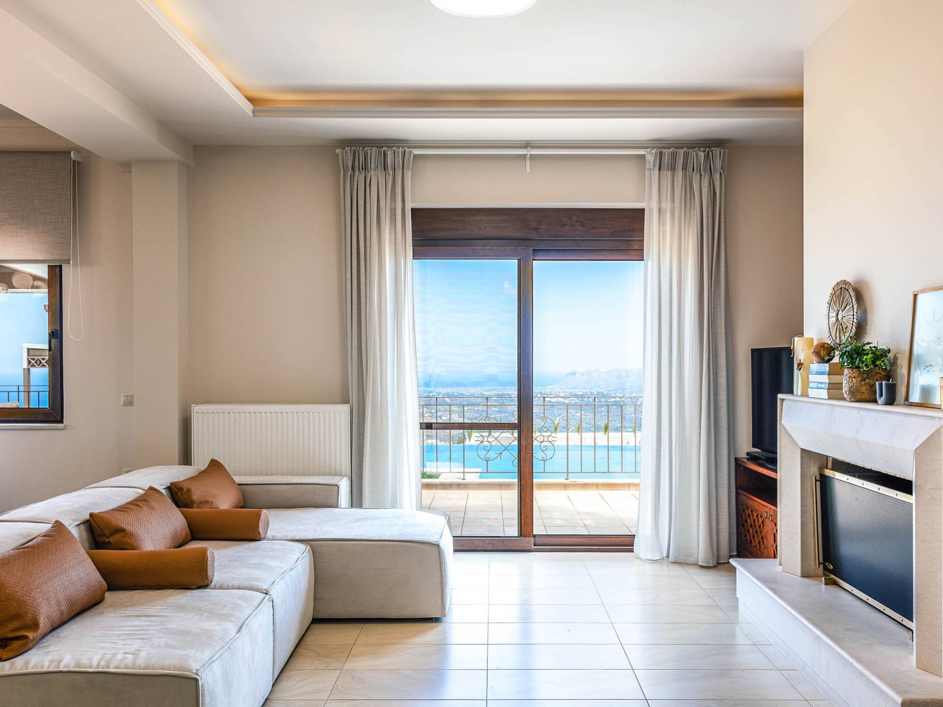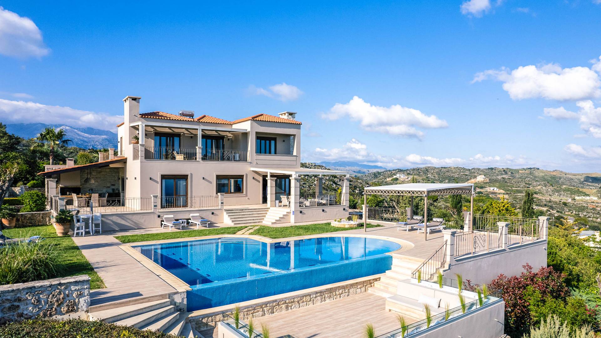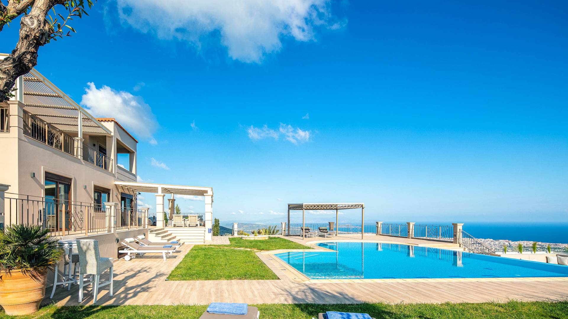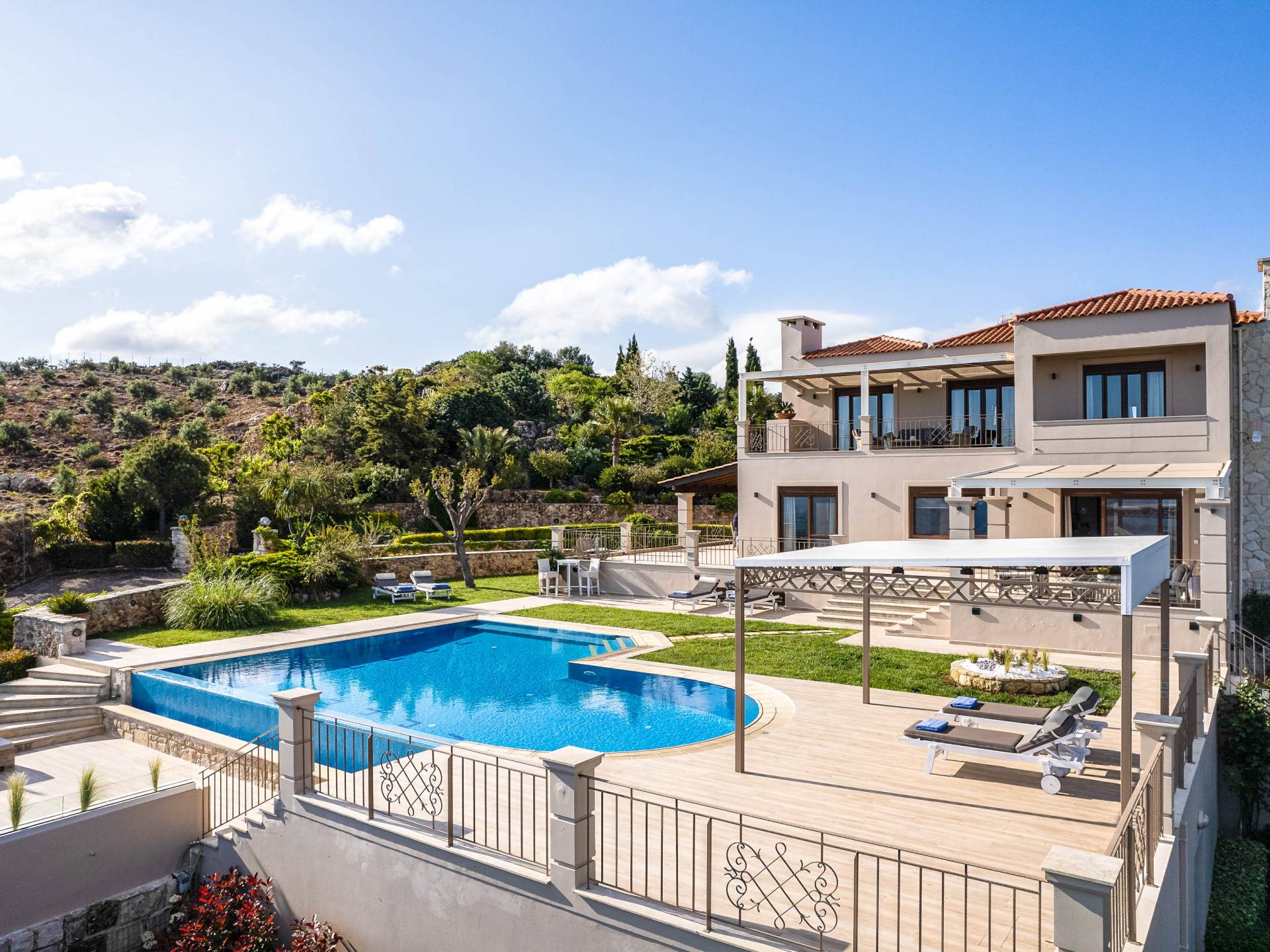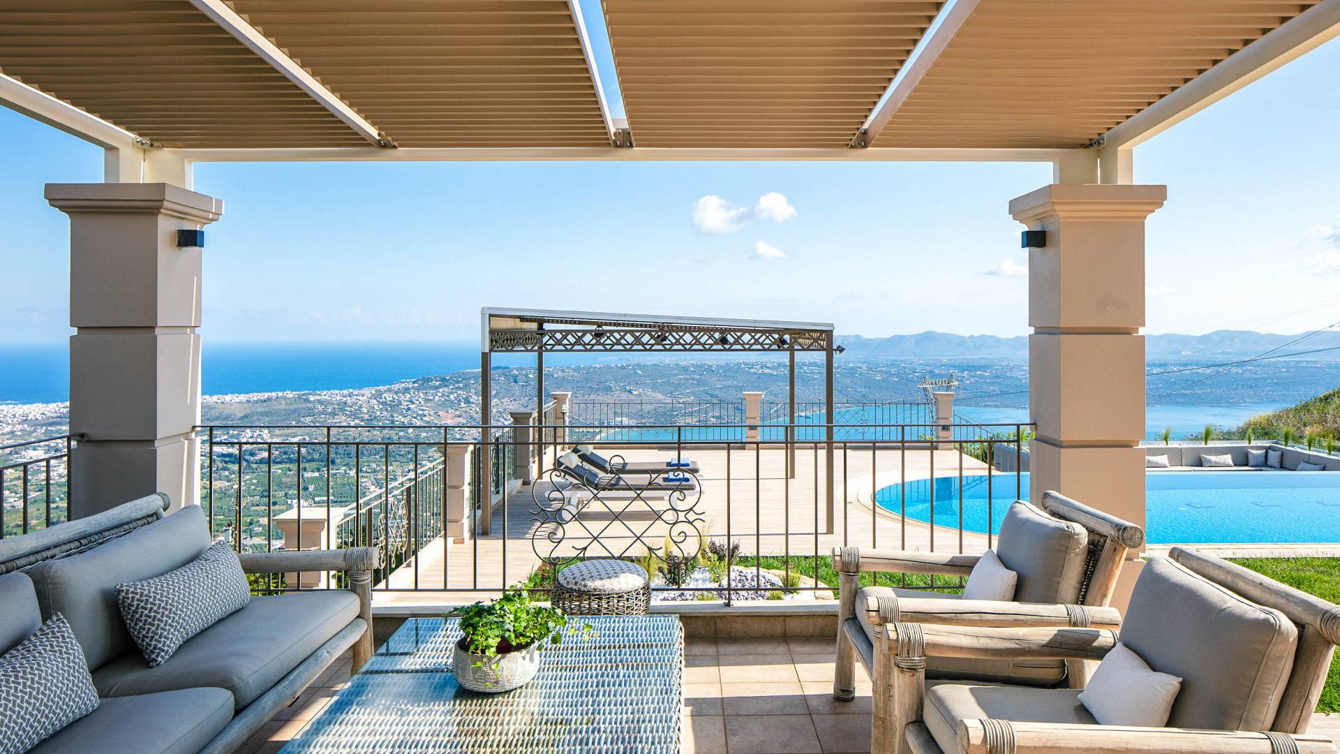 Golden Hill Villa Chania is a 450 sq.m luxury villa with a high maximum quality of construction and luxurious facilities for the whole family. Located on a totally private and fenced hill of 6,000 sqm just on the outskirts of Chania city, the villa offers absolute peace and probably the best full view over the Cretan island and the sea! You have the feeling that you are staying over the sky as the villa is located 600 meters over sea level and Chania city but only a few km away from them!