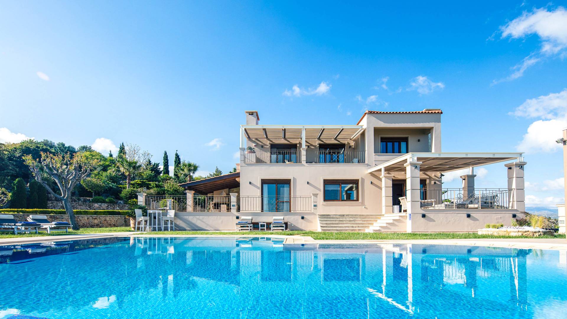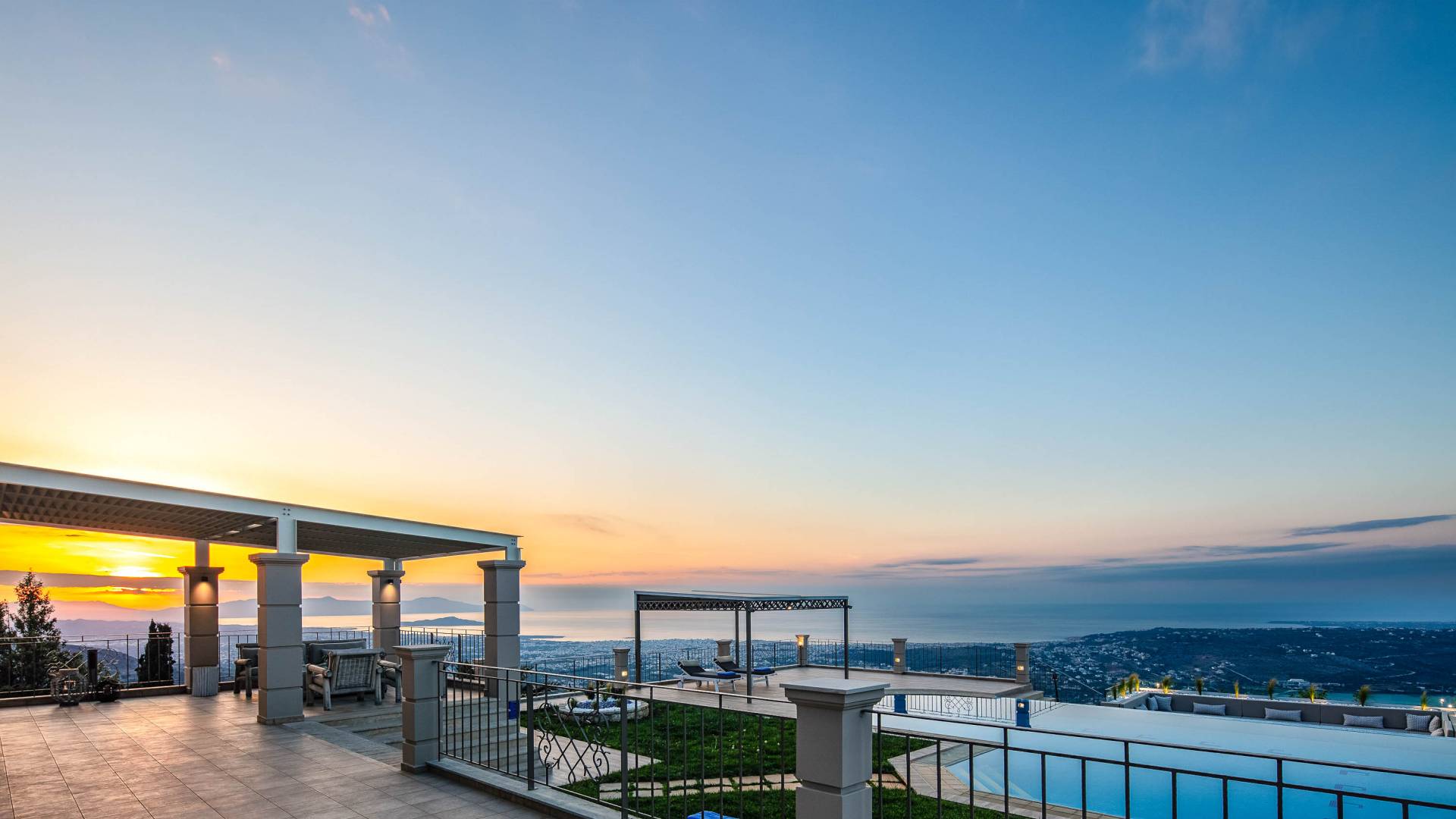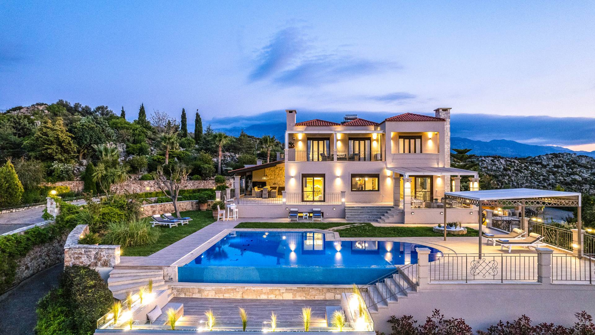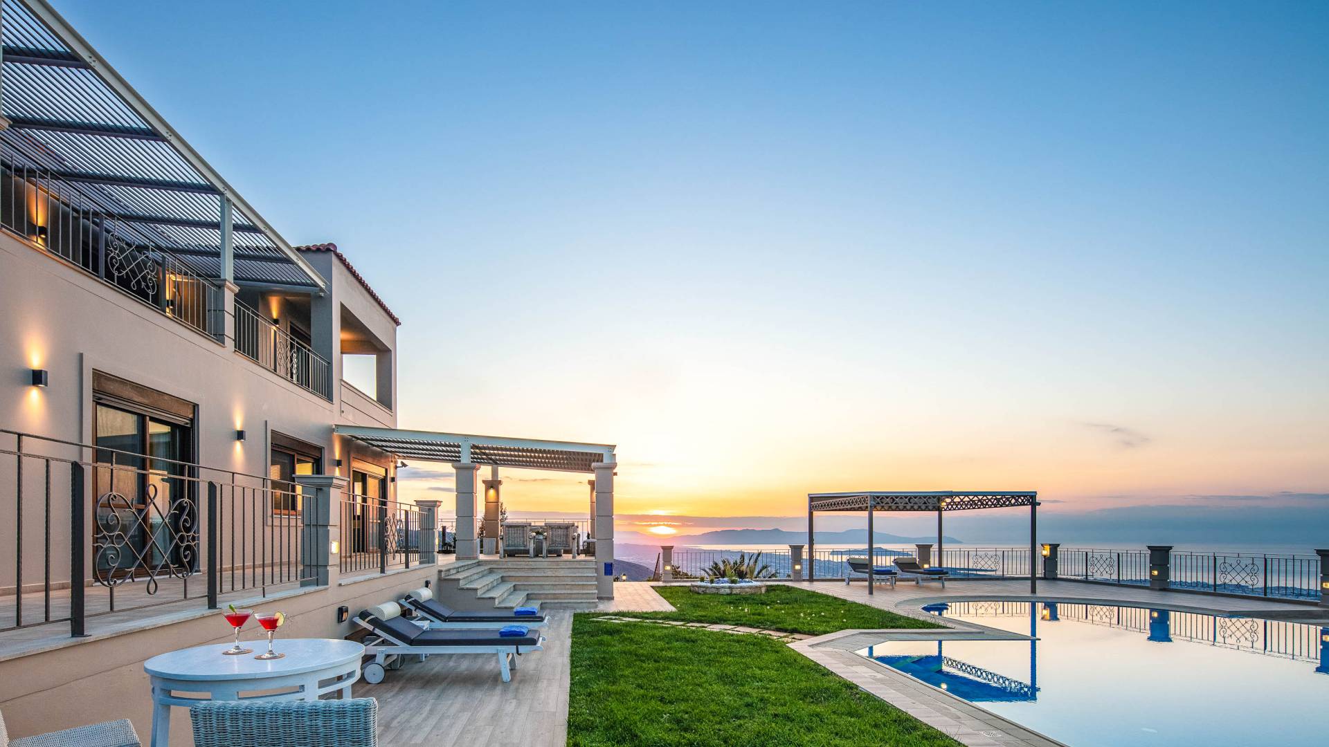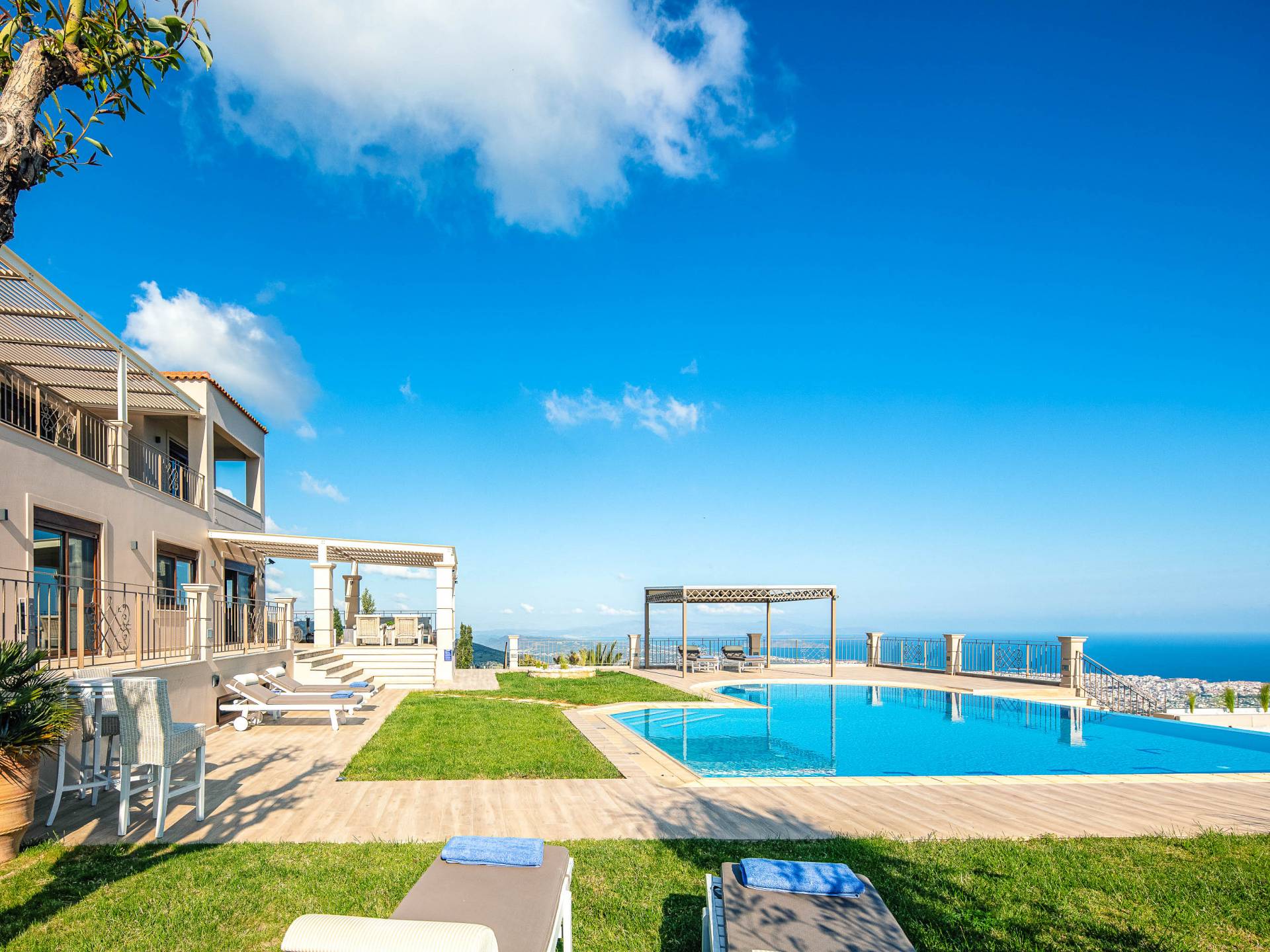 Golden Hill Villa Chania is a 450 sq.m luxury villa with a high maximum quality of construction and luxurious facilities for the whole family. Located on a totally private and fenced hill of 6,000 sqm just on the outskirts of Chania city, the villa offers absolute peace and probably the best full view over the Cretan island and the sea! You have the feeling that you are staying over the sky as the villa is located 600 meters over sea level and Chania city but only a few km away from them!