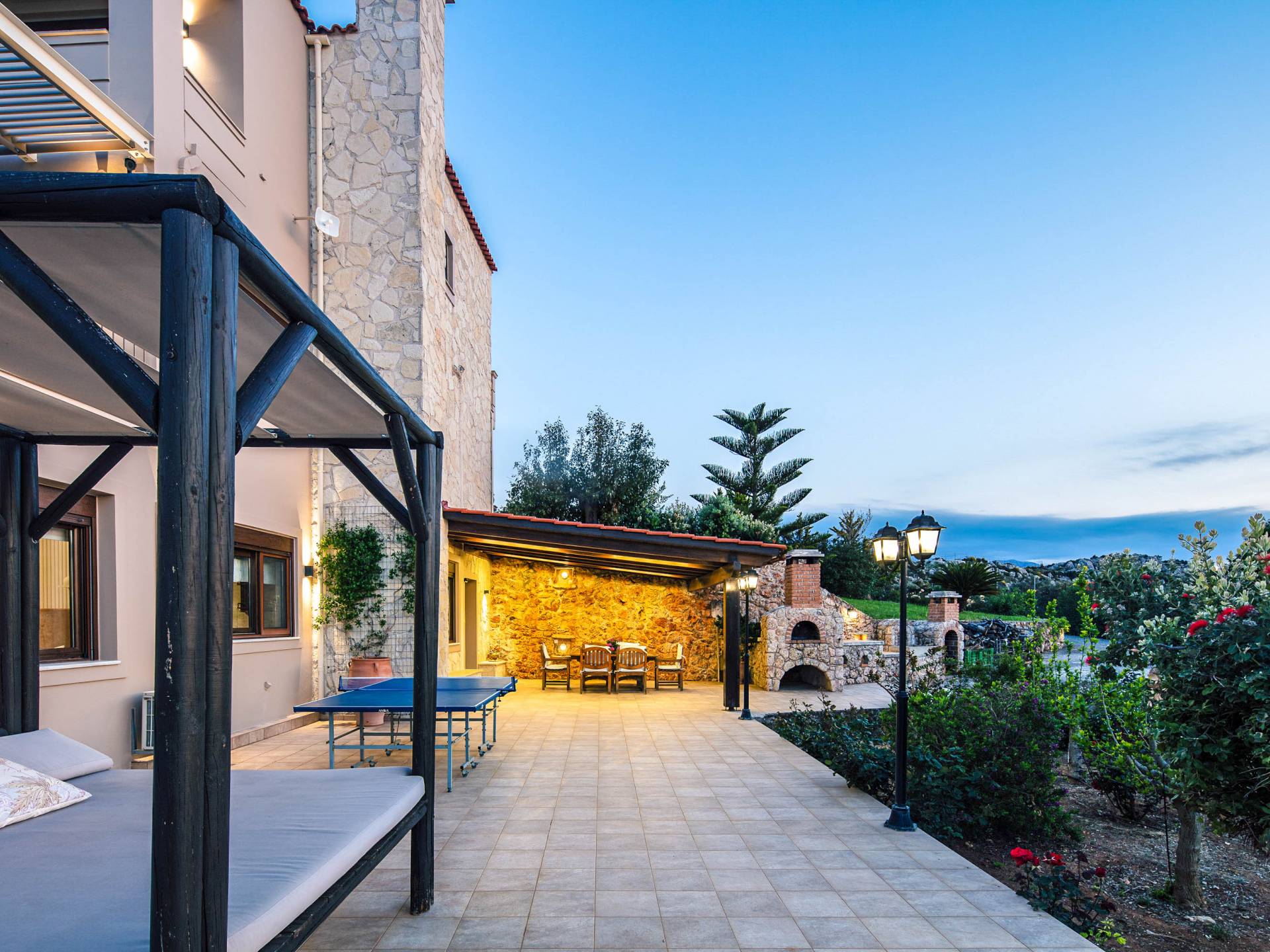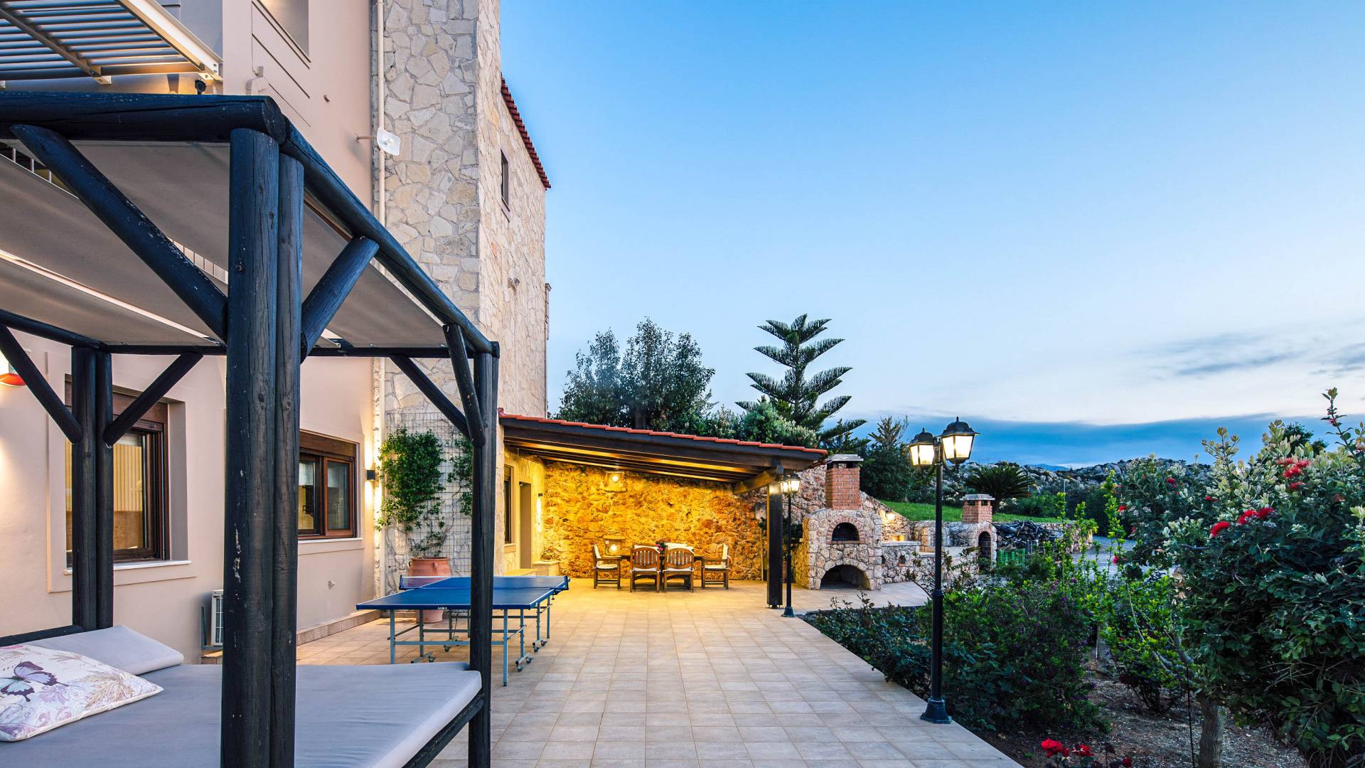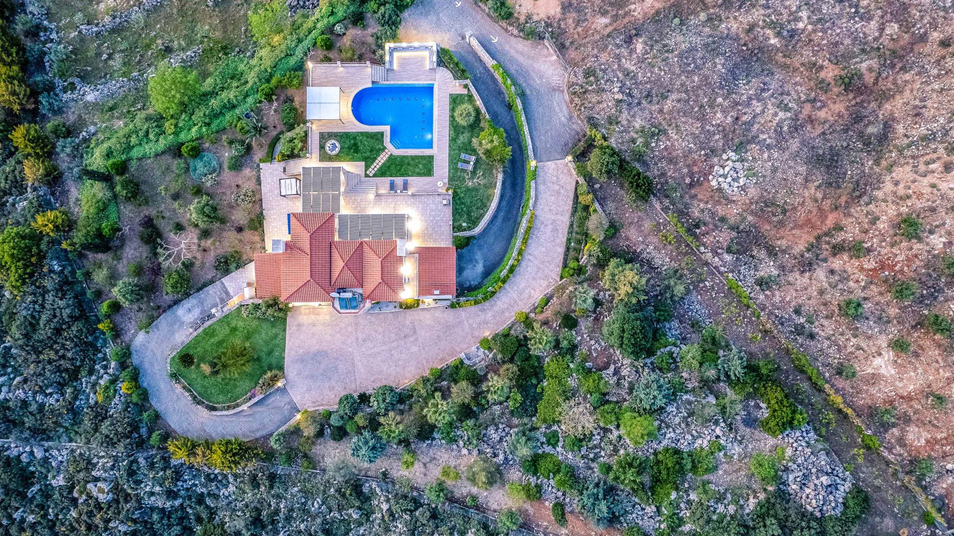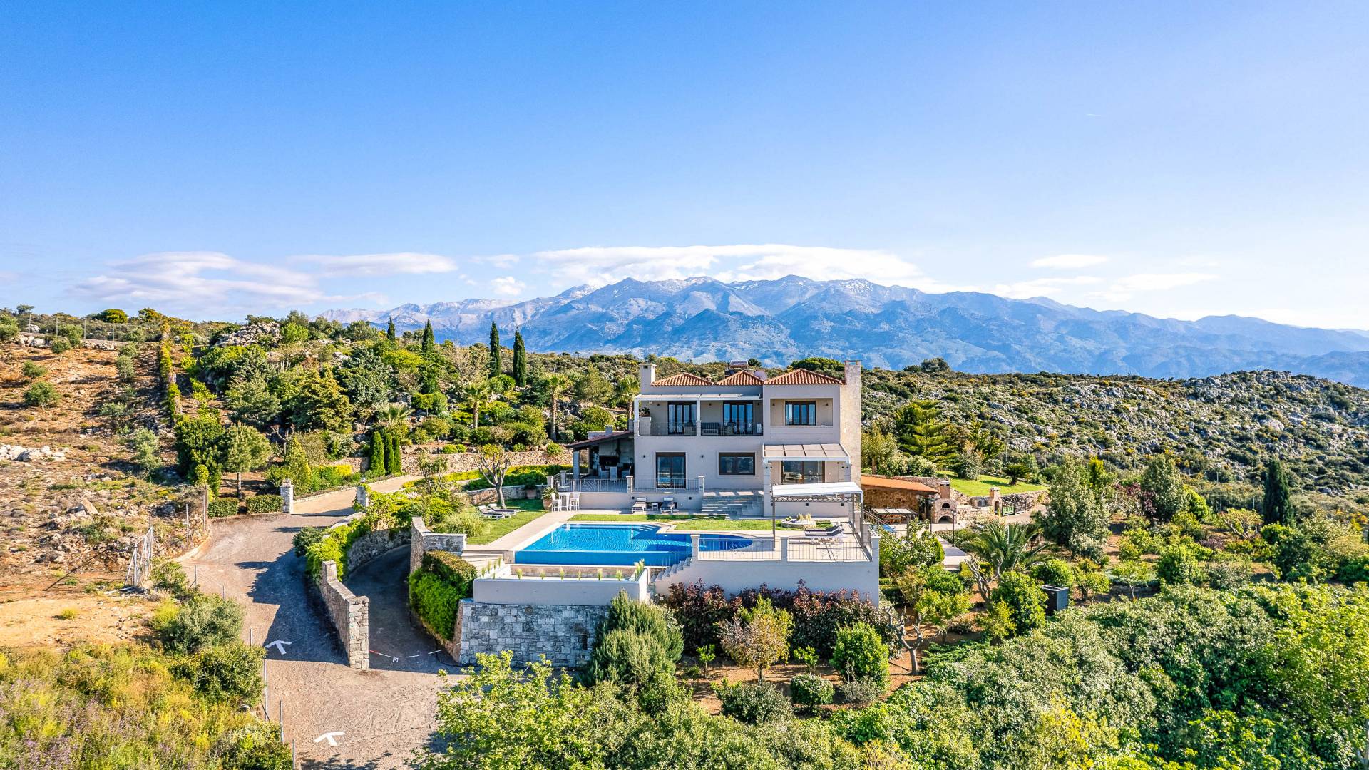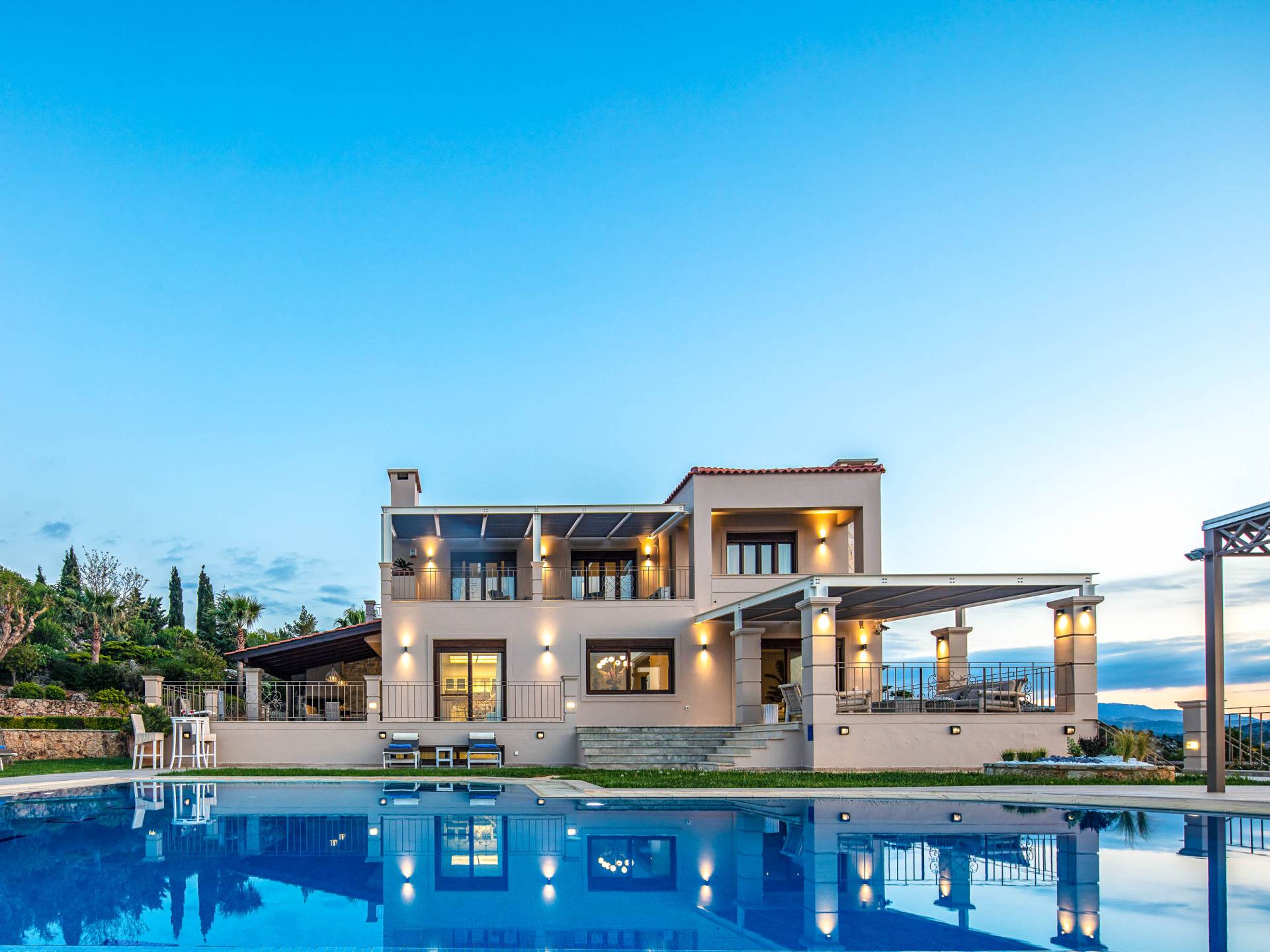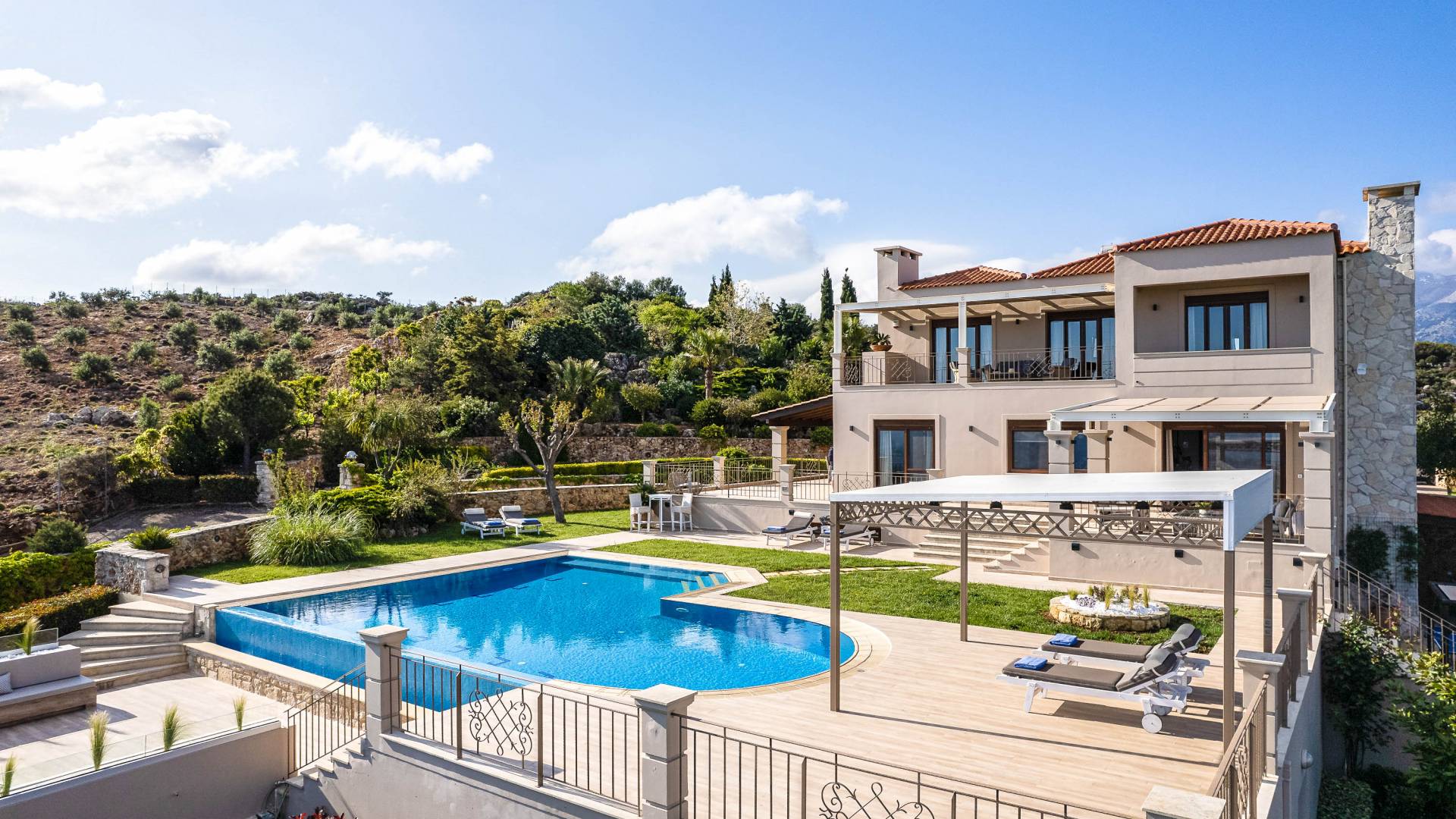 Golden Hill Villa Chania is a 450 sq.m luxury villa with a high maximum quality of construction and luxurious facilities for the whole family. Located on a totally private and fenced hill of 6,000 sqm just on the outskirts of Chania city, the villa offers absolute peace and probably the best full view over the Cretan island and the sea! You have the feeling that you are staying over the sky as the villa is located 600 meters over sea level and Chania city but only a few km away from them!