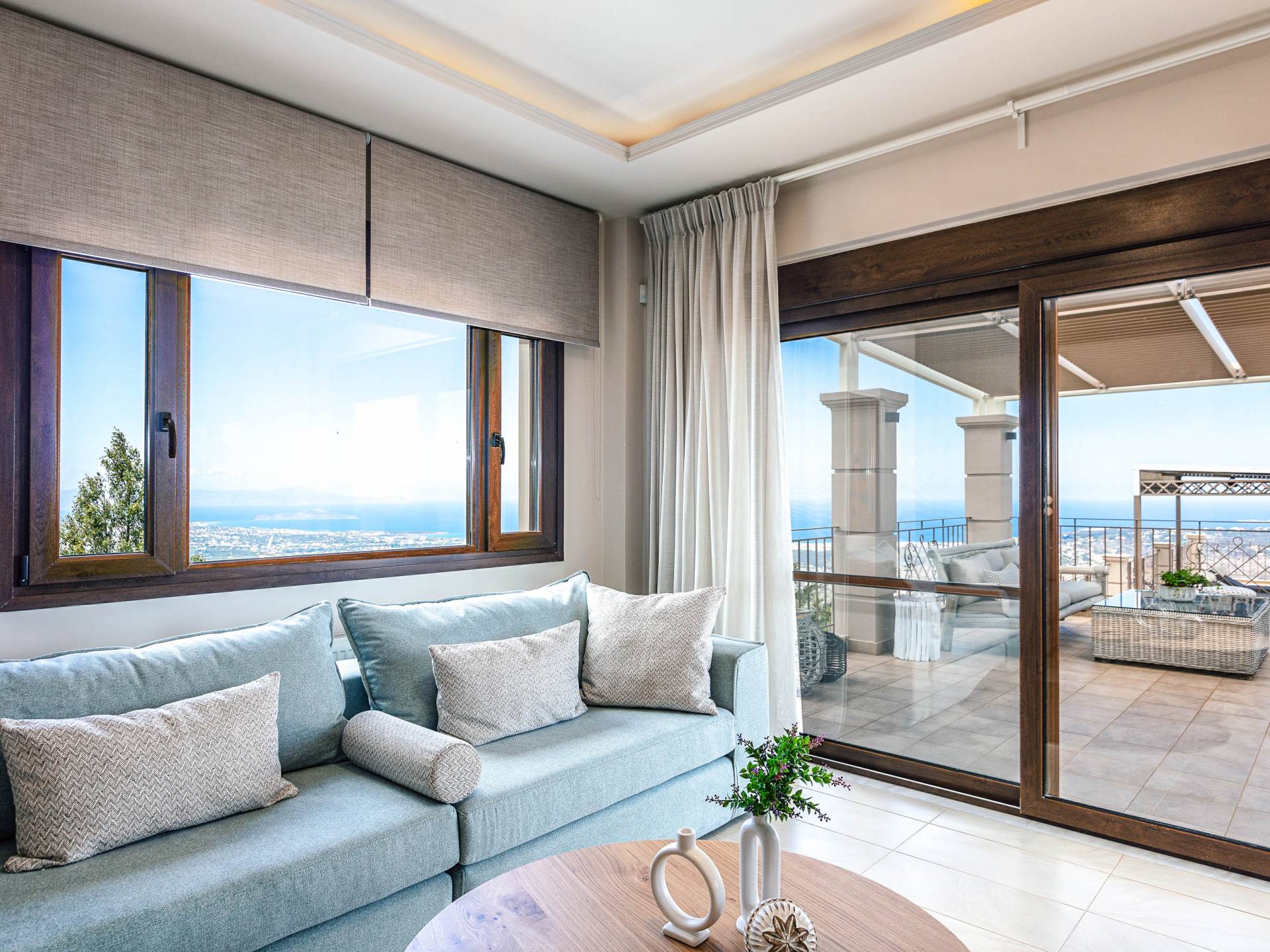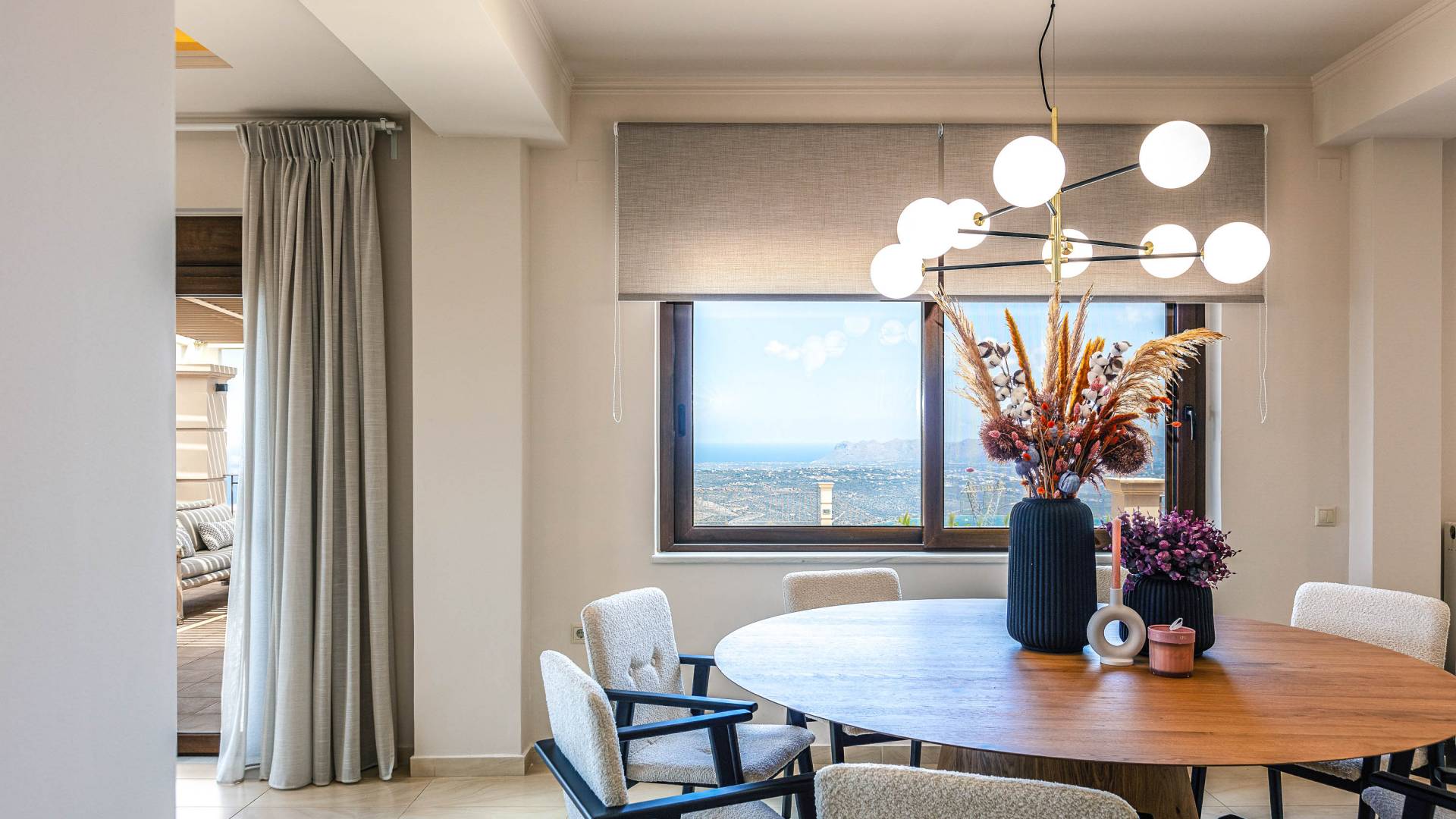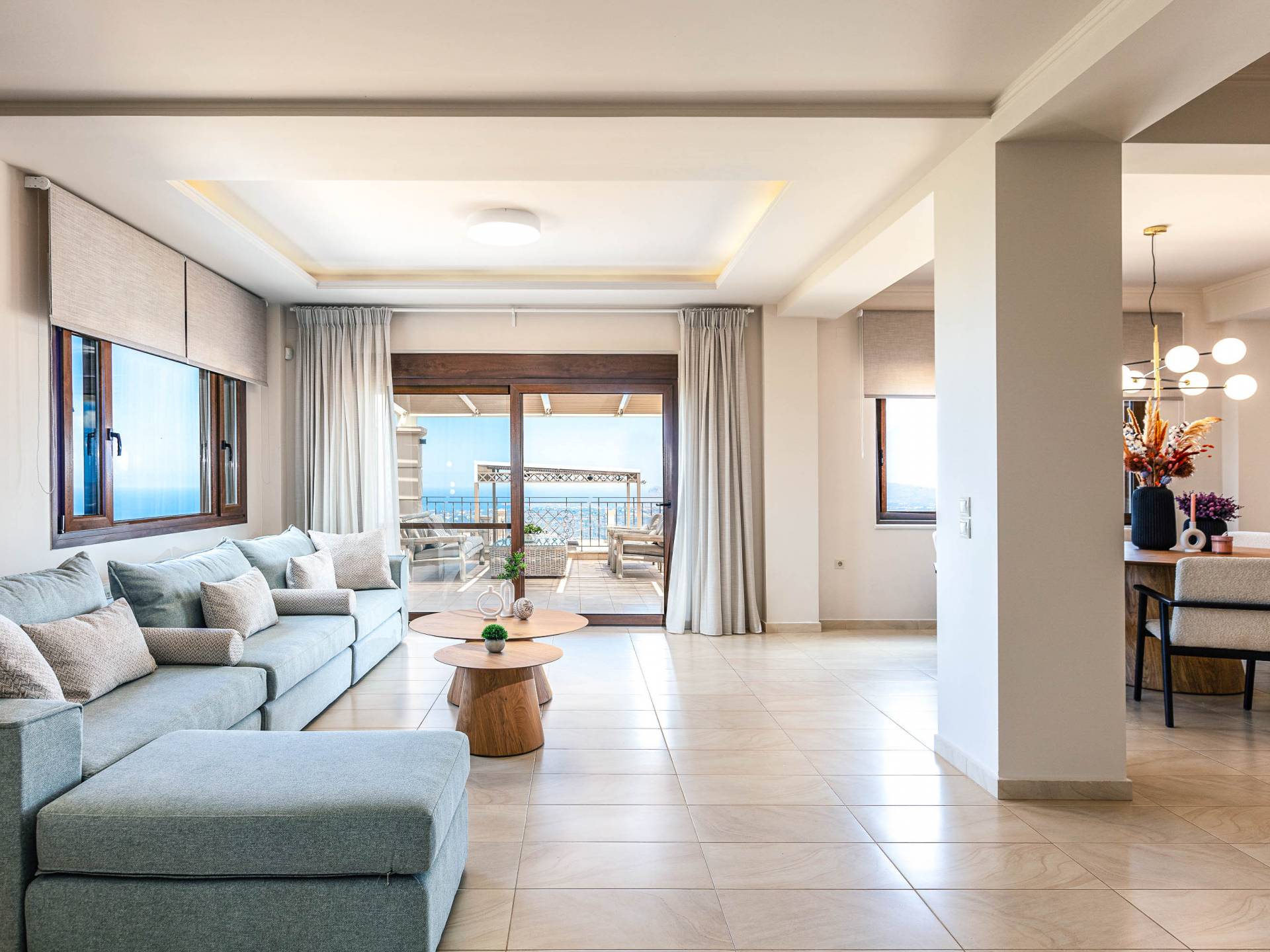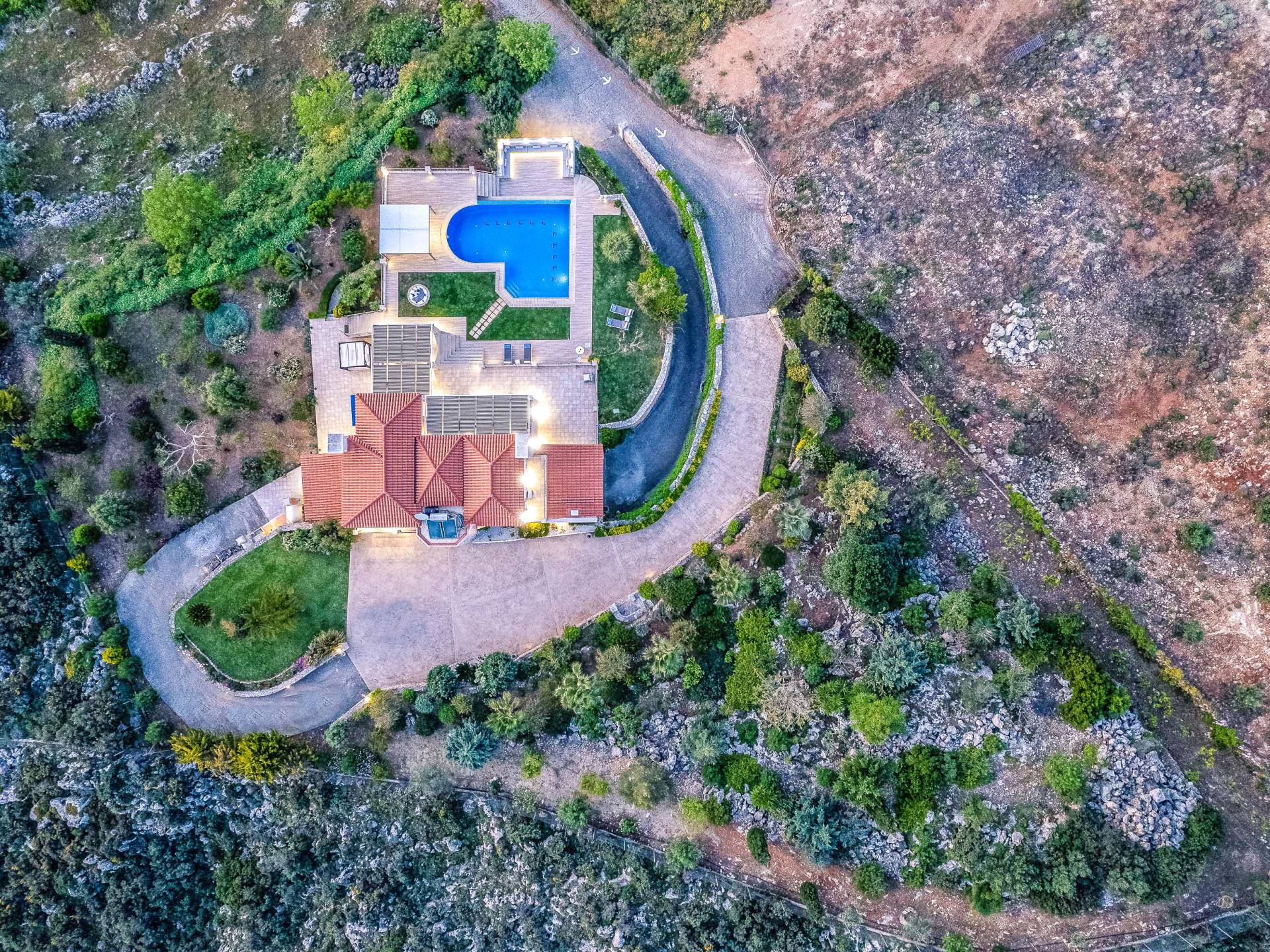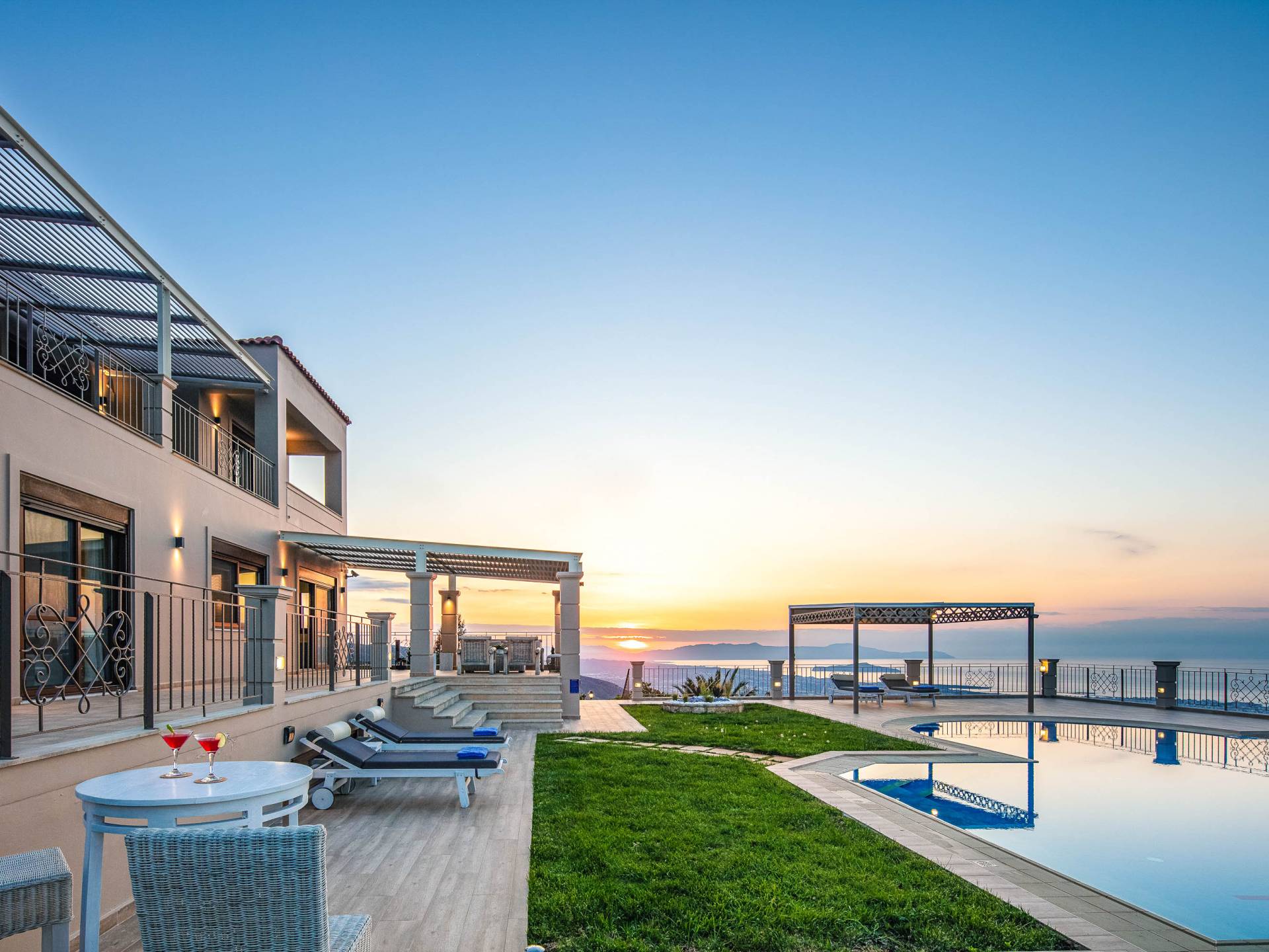 Golden Hill Villa Chania is a 450 sq.m luxury villa with a high maximum quality of construction and luxurious facilities for the whole family. Located on a totally private and fenced hill of 6,000 sqm just on the outskirts of Chania city, the villa offers absolute peace and probably the best full view over the Cretan island and the sea! You have the feeling that you are staying over the sky as the villa is located 600 meters over sea level and Chania city but only a few km away from them!
