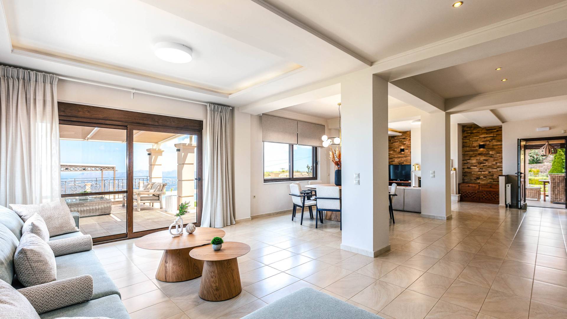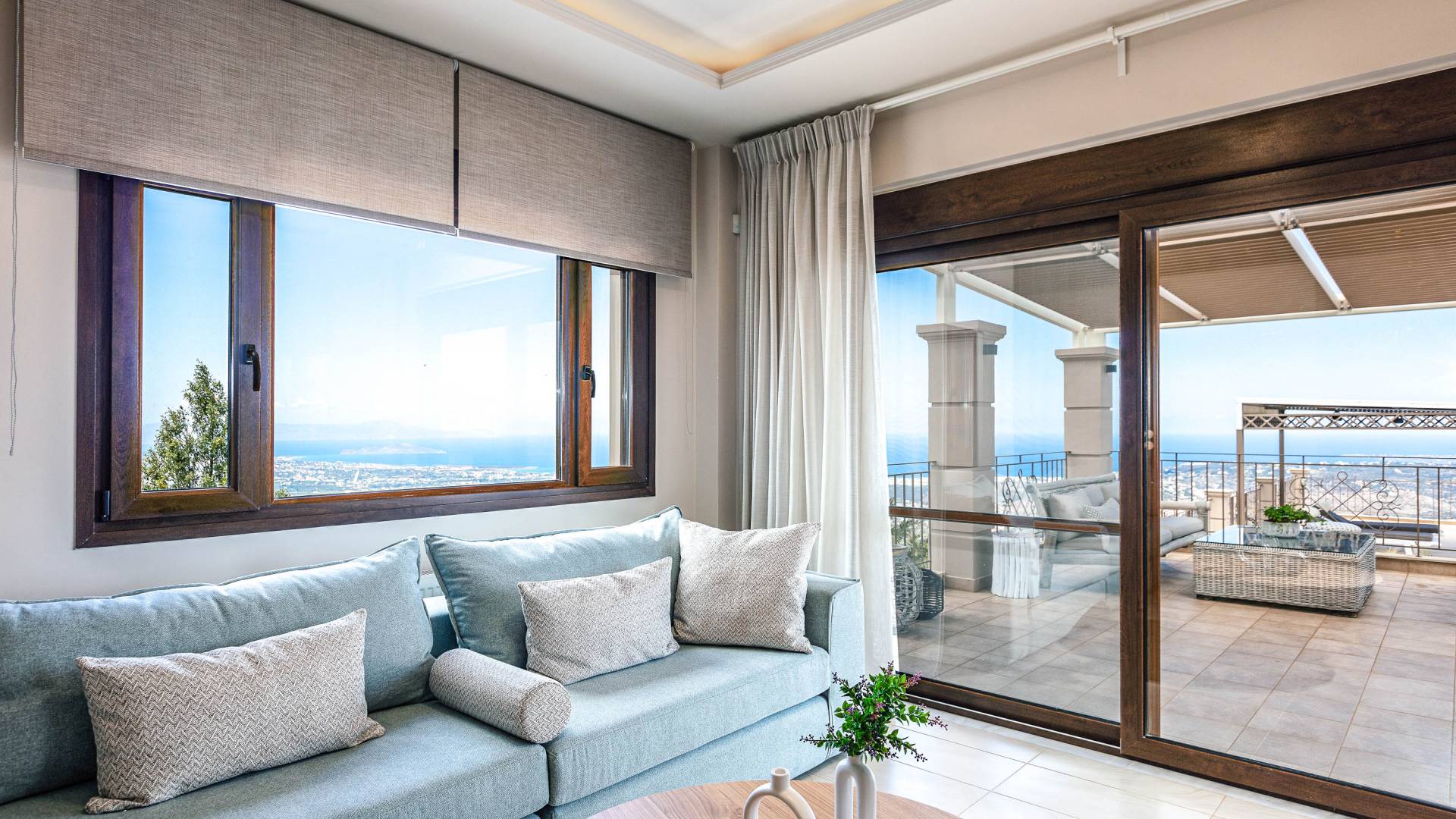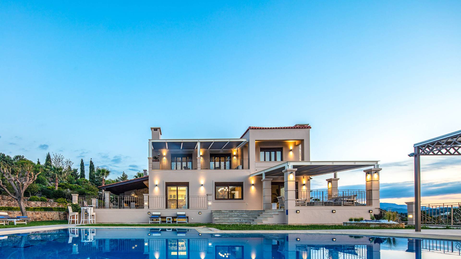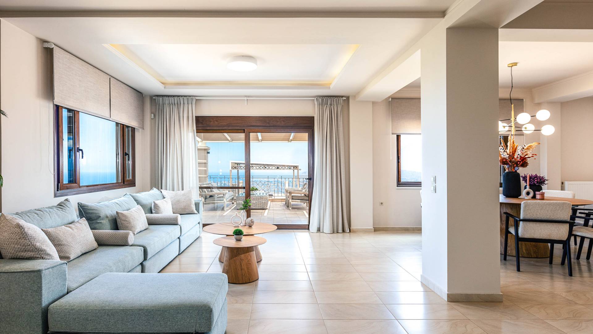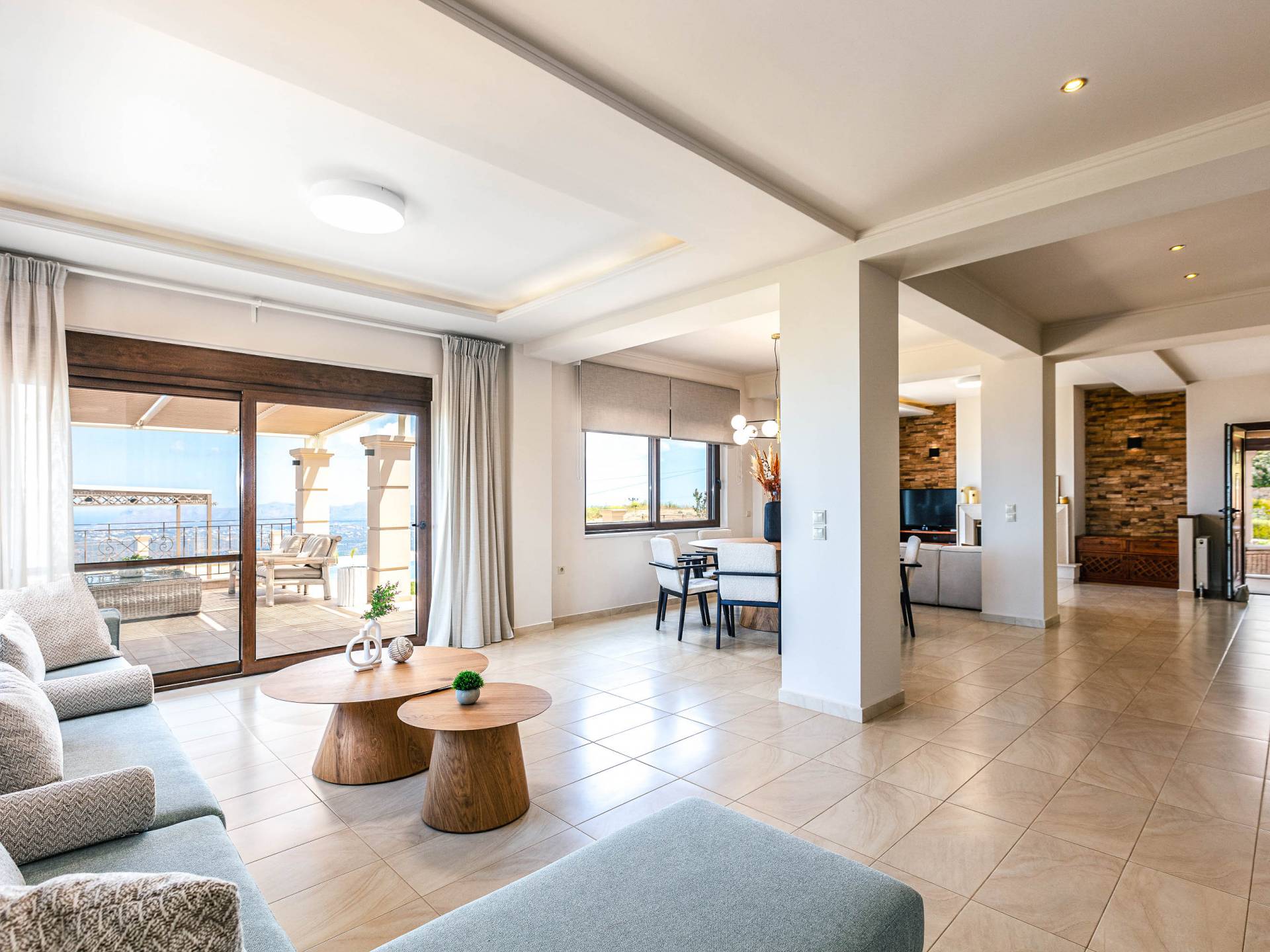Golden Hill Villa Chania is a 450 sq.m luxury villa with a high maximum quality of construction and luxurious facilities for the whole family. Located on a totally private and fenced hill of 6,000 sqm just on the outskirts of Chania city, the villa offers absolute peace and probably the best full view over the Cretan island and the sea! You have the feeling that you are staying over the sky as the villa is located 600 meters over sea level and Chania city but only a few km away from them!