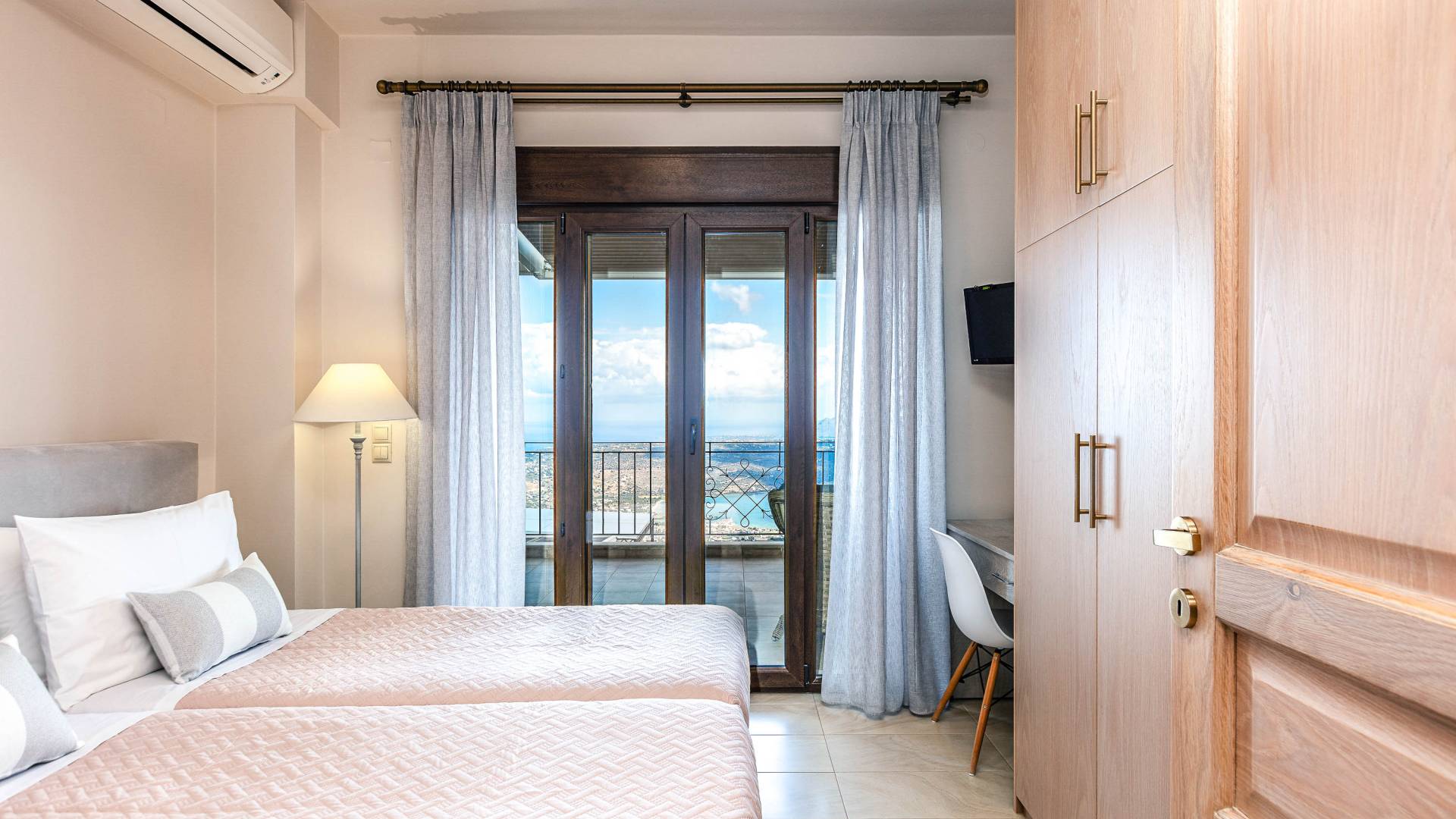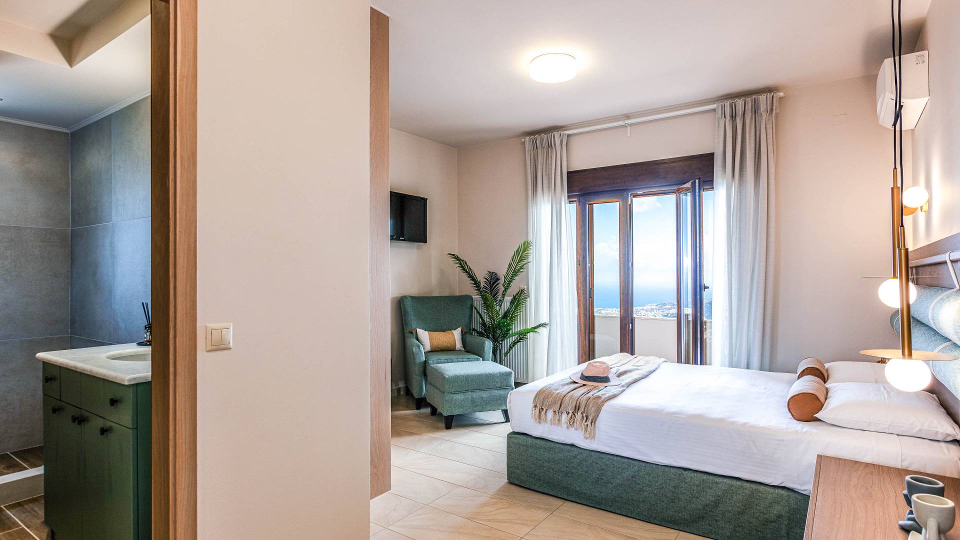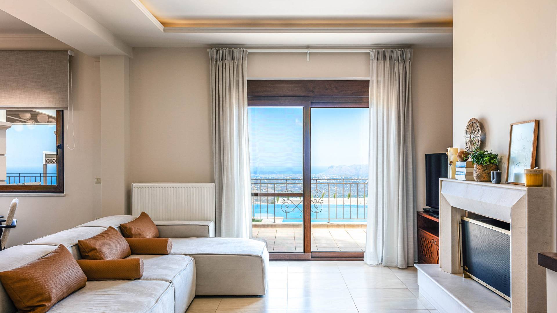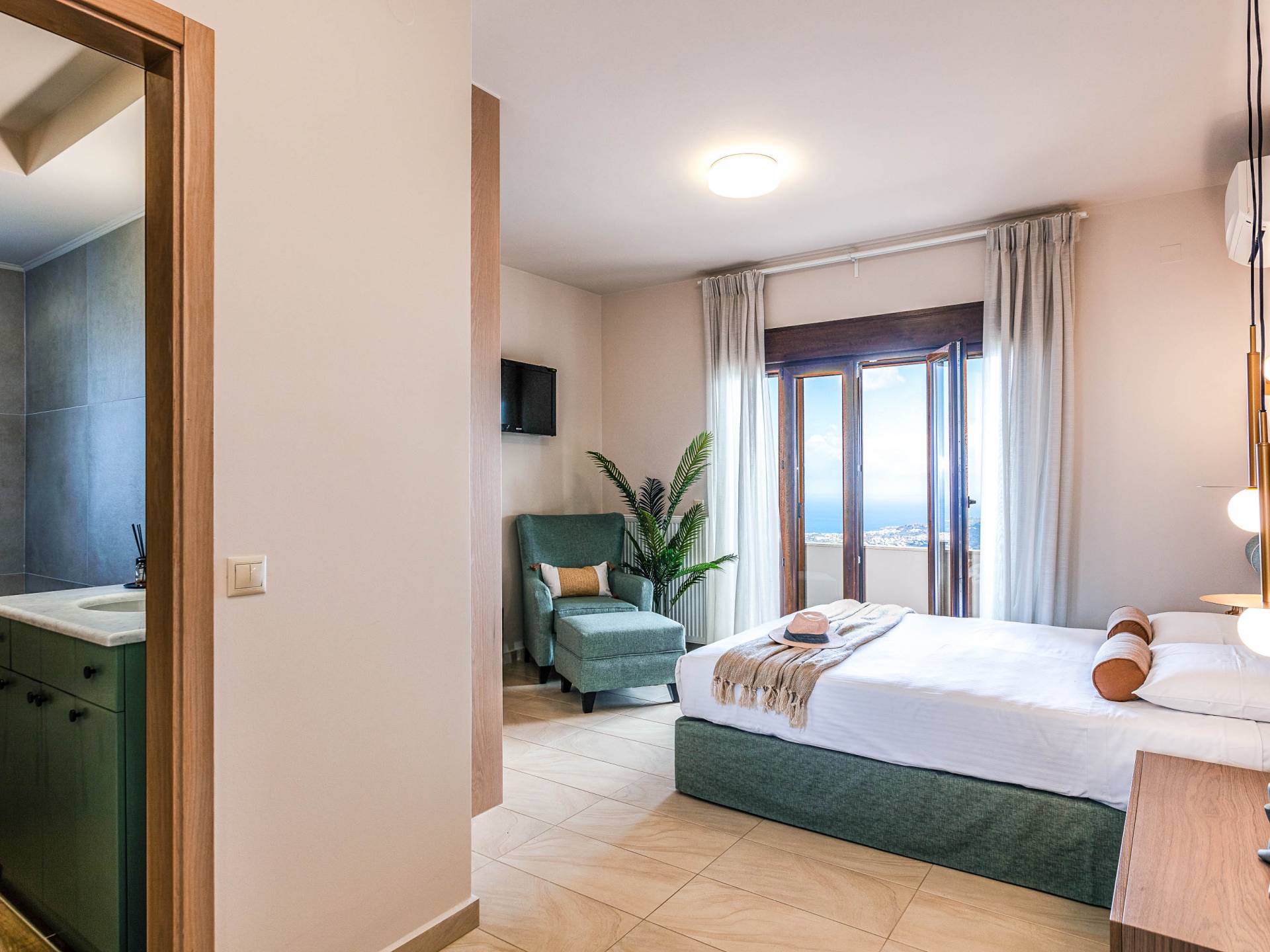 Entering Golden Hill Villa Chania on the ground floor there is a wide-open plan area that contains the living room with a fireplace, a 47” satellite HDTV, an indoor dining area, and a fully equipped kitchen of top quality fixtures and devices. There is also another sitting area with a lovely view spreading in front of it. The living room area opens to a veranda with a sitting area that leads you to the pool and the garden area. Further, an organized office room and a toilet are also found on the same floor.