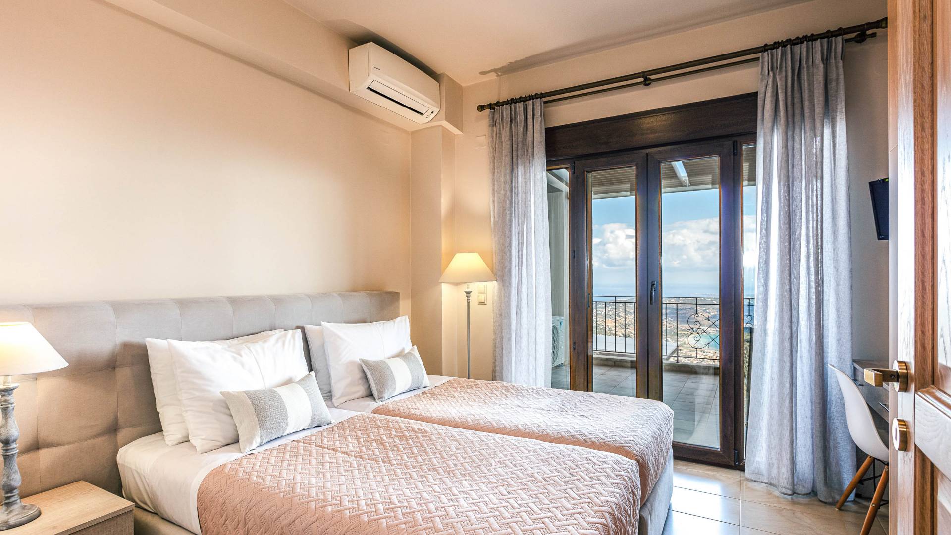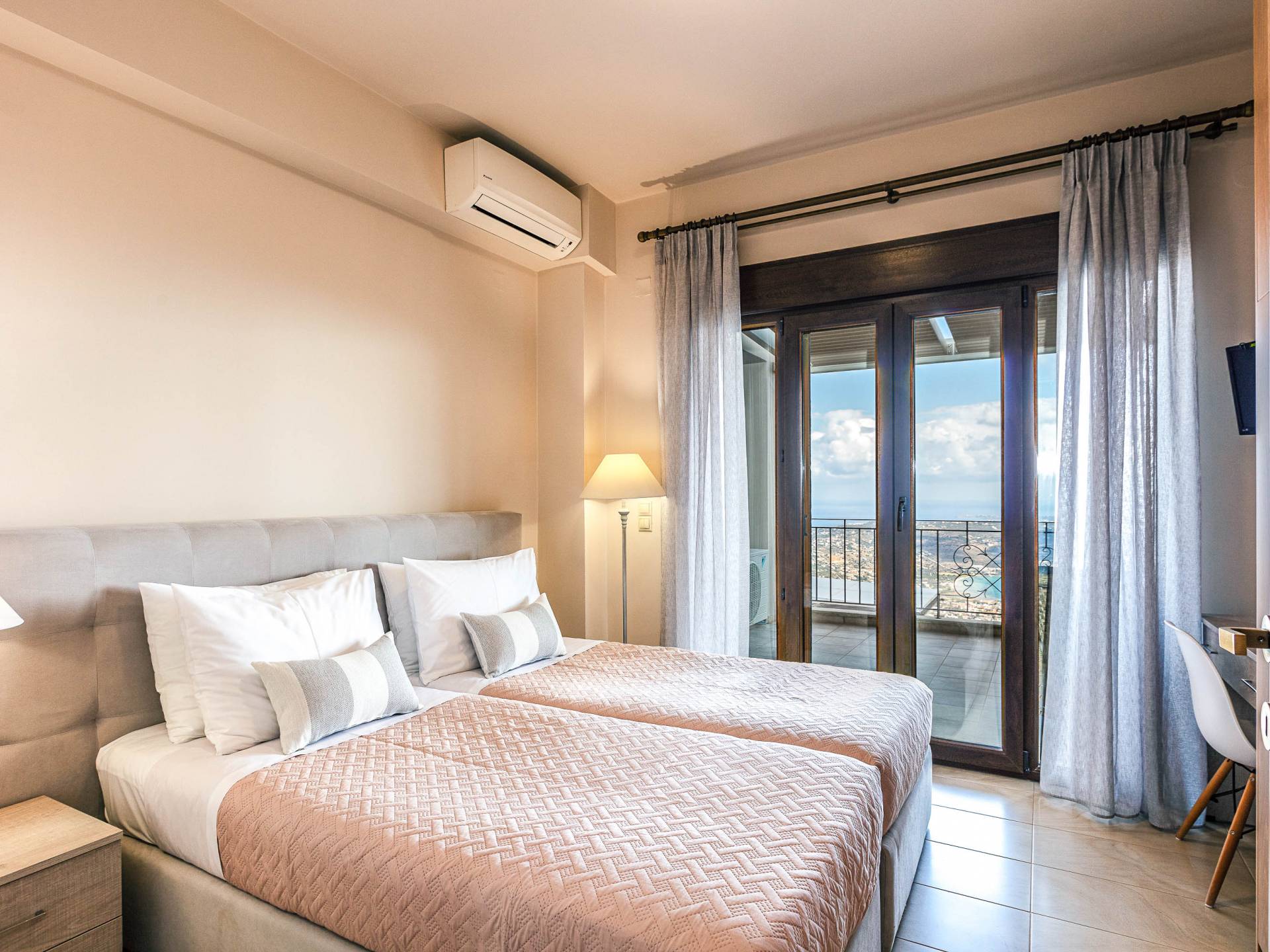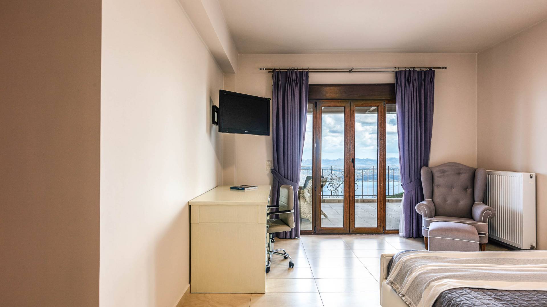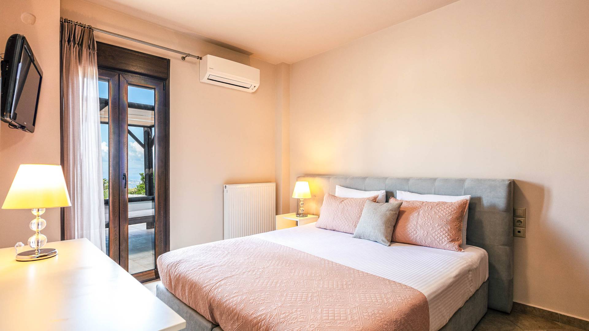 Entering Golden Hill Villa Chania on the ground floor there is a wide-open plan area that contains the living room with a fireplace, a 47” satellite HDTV, an indoor dining area, and a fully equipped kitchen of top quality fixtures and devices. There is also another sitting area with a lovely view spreading in front of it. The living room area opens to a veranda with a sitting area that leads you to the pool and the garden area. Further, an organized office room and a toilet are also found on the same floor.