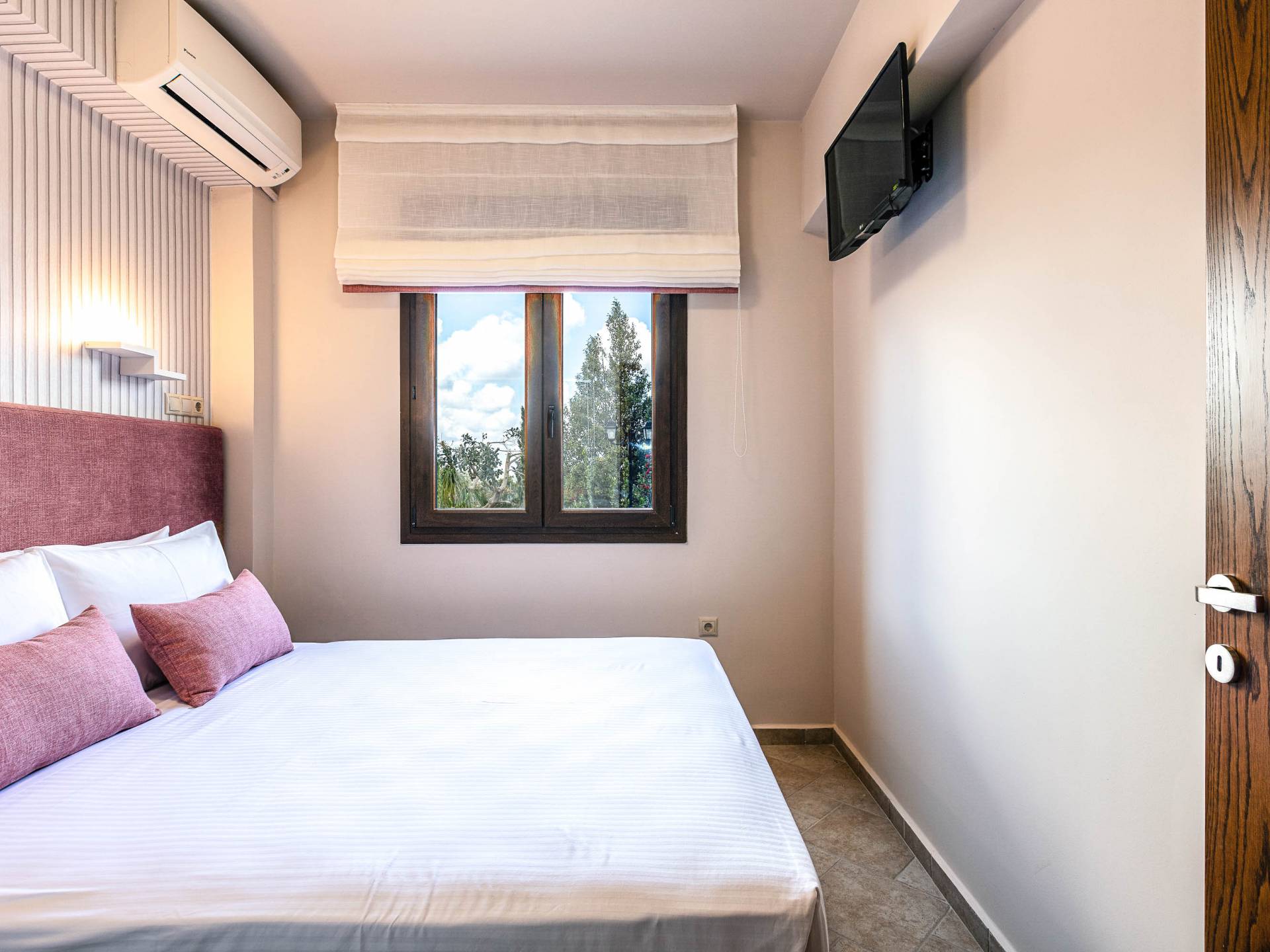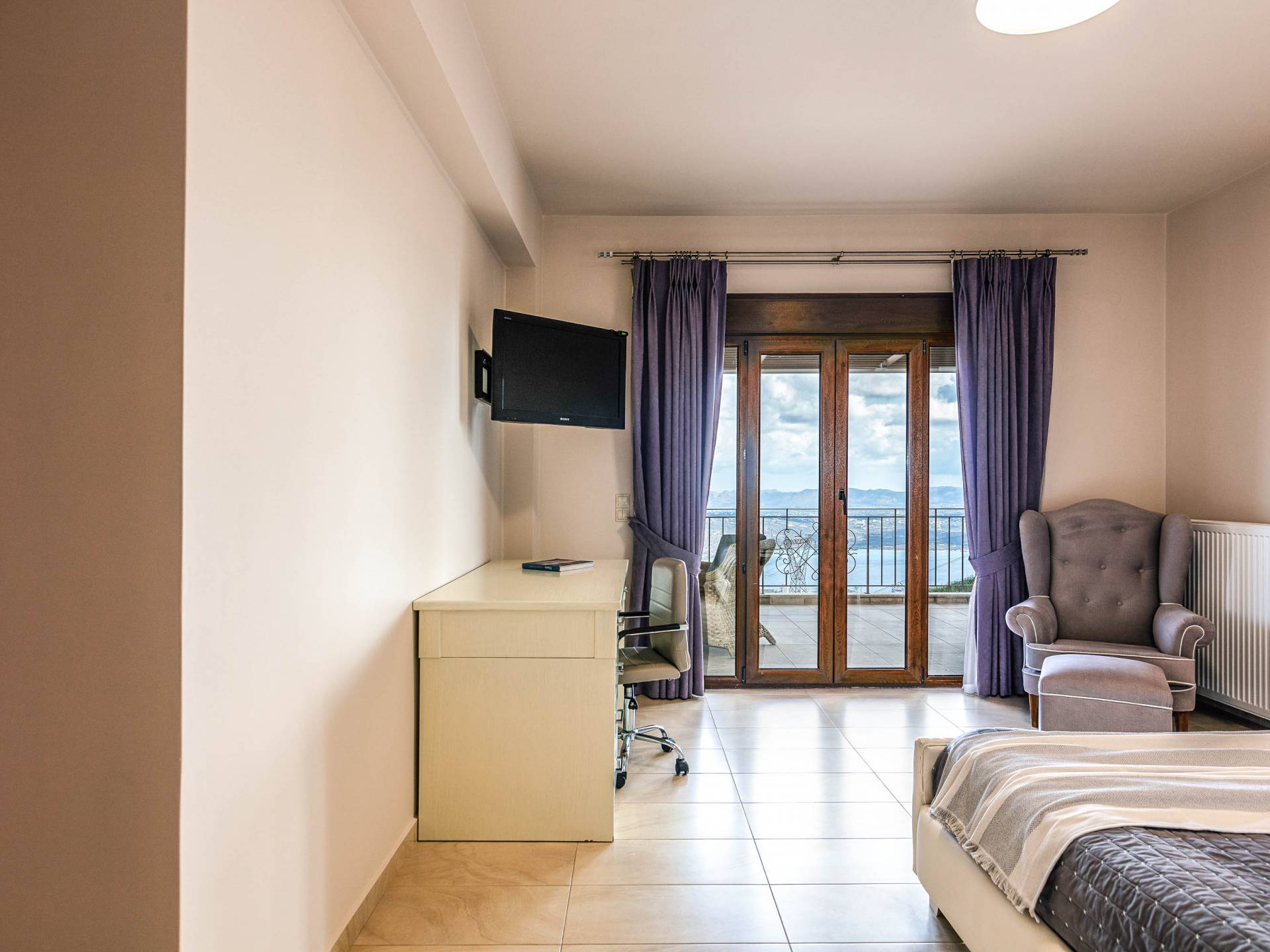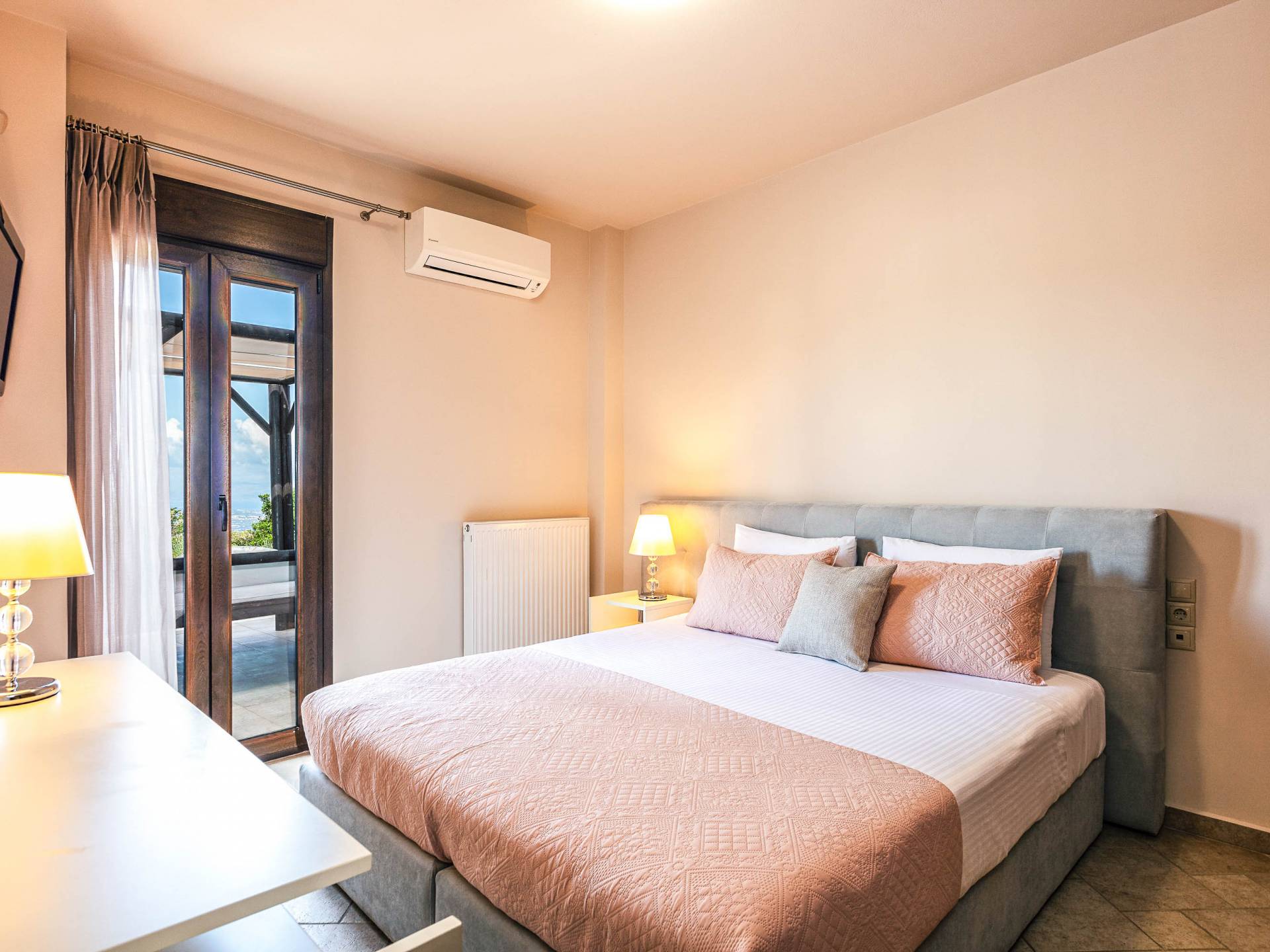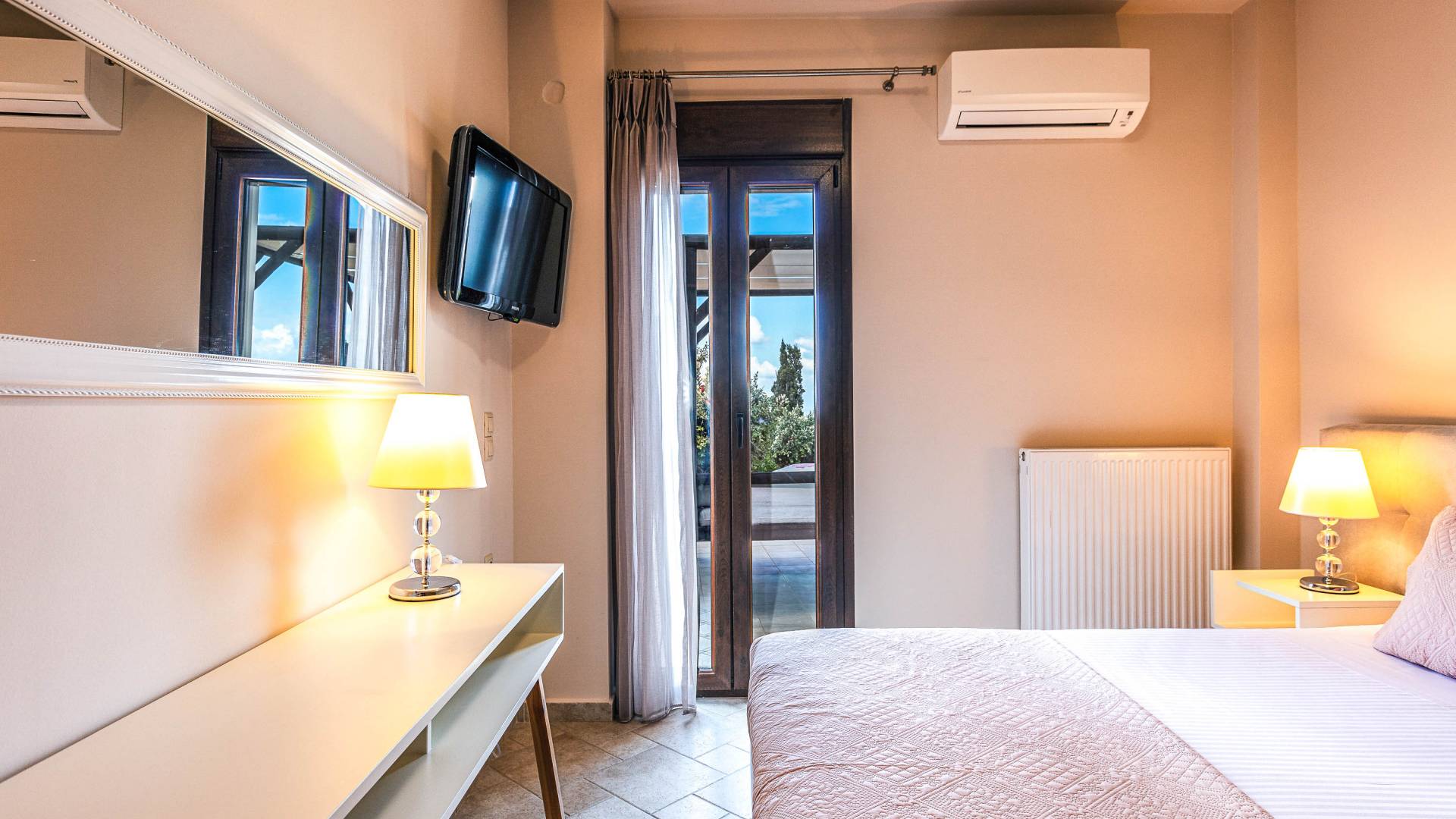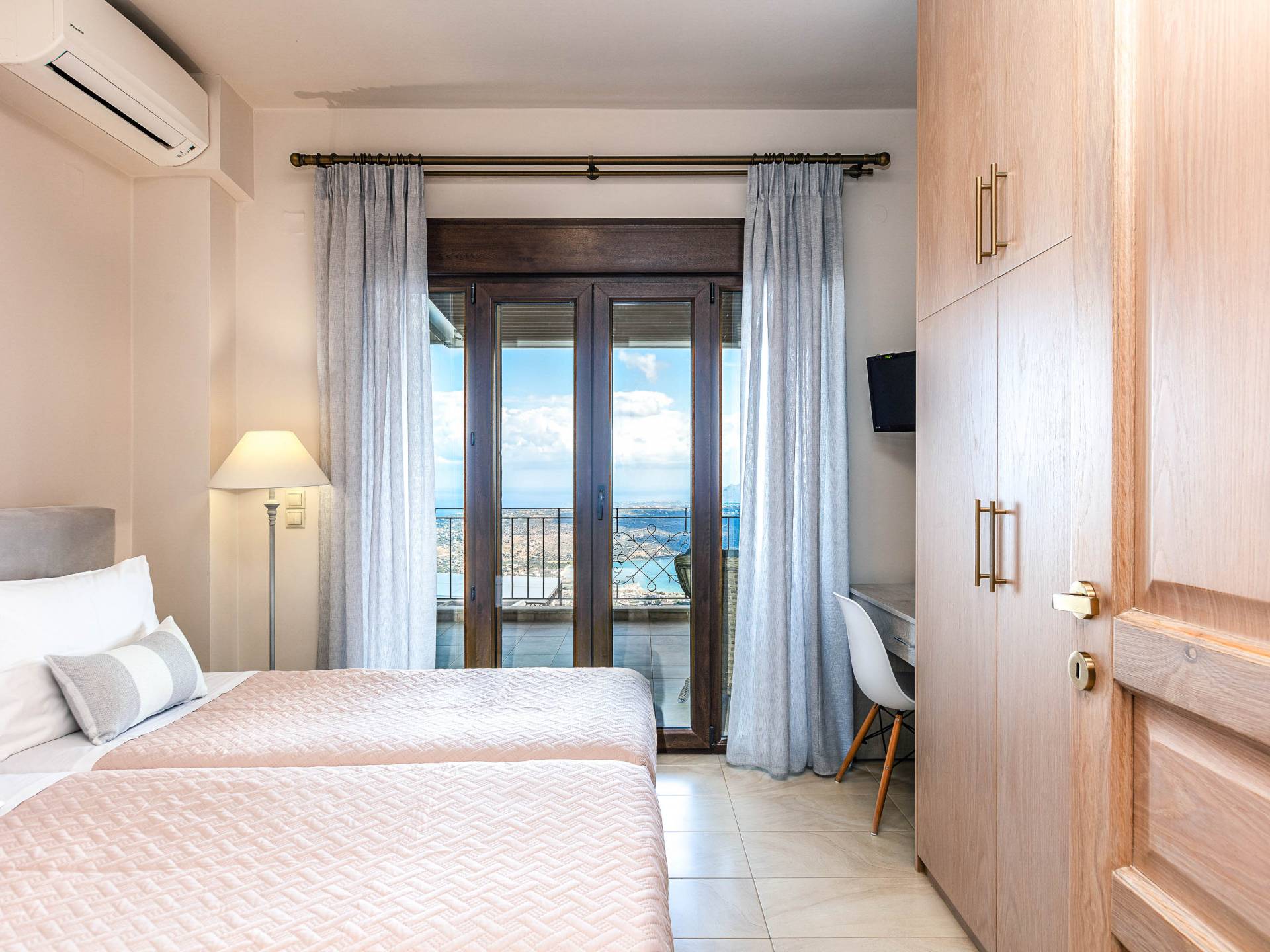 Entering Golden Hill Villa Chania on the ground floor there is a wide-open plan area that contains the living room with a fireplace, a 47” satellite HDTV, an indoor dining area, and a fully equipped kitchen of top quality fixtures and devices. There is also another sitting area with a lovely view spreading in front of it. The living room area opens to a veranda with a sitting area that leads you to the pool and the garden area. Further, an organized office room and a toilet are also found on the same floor.