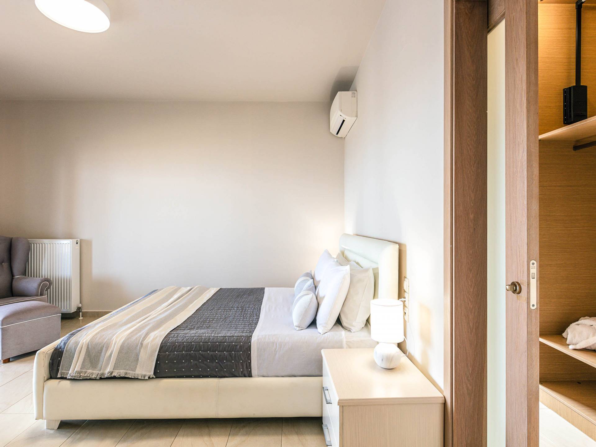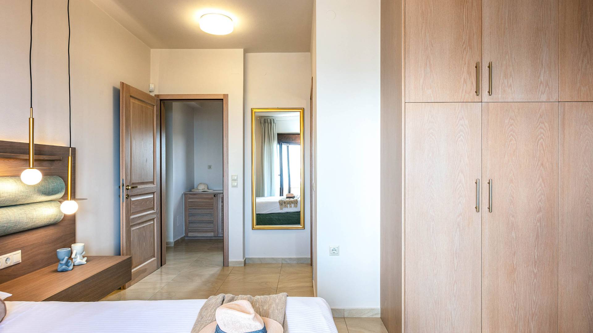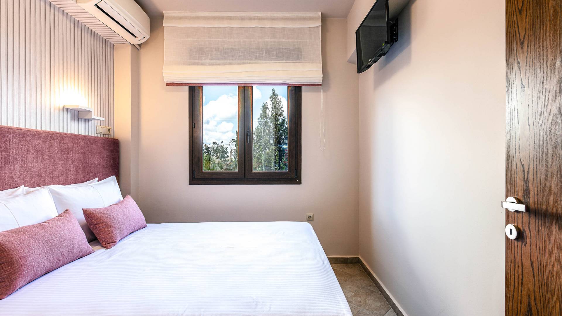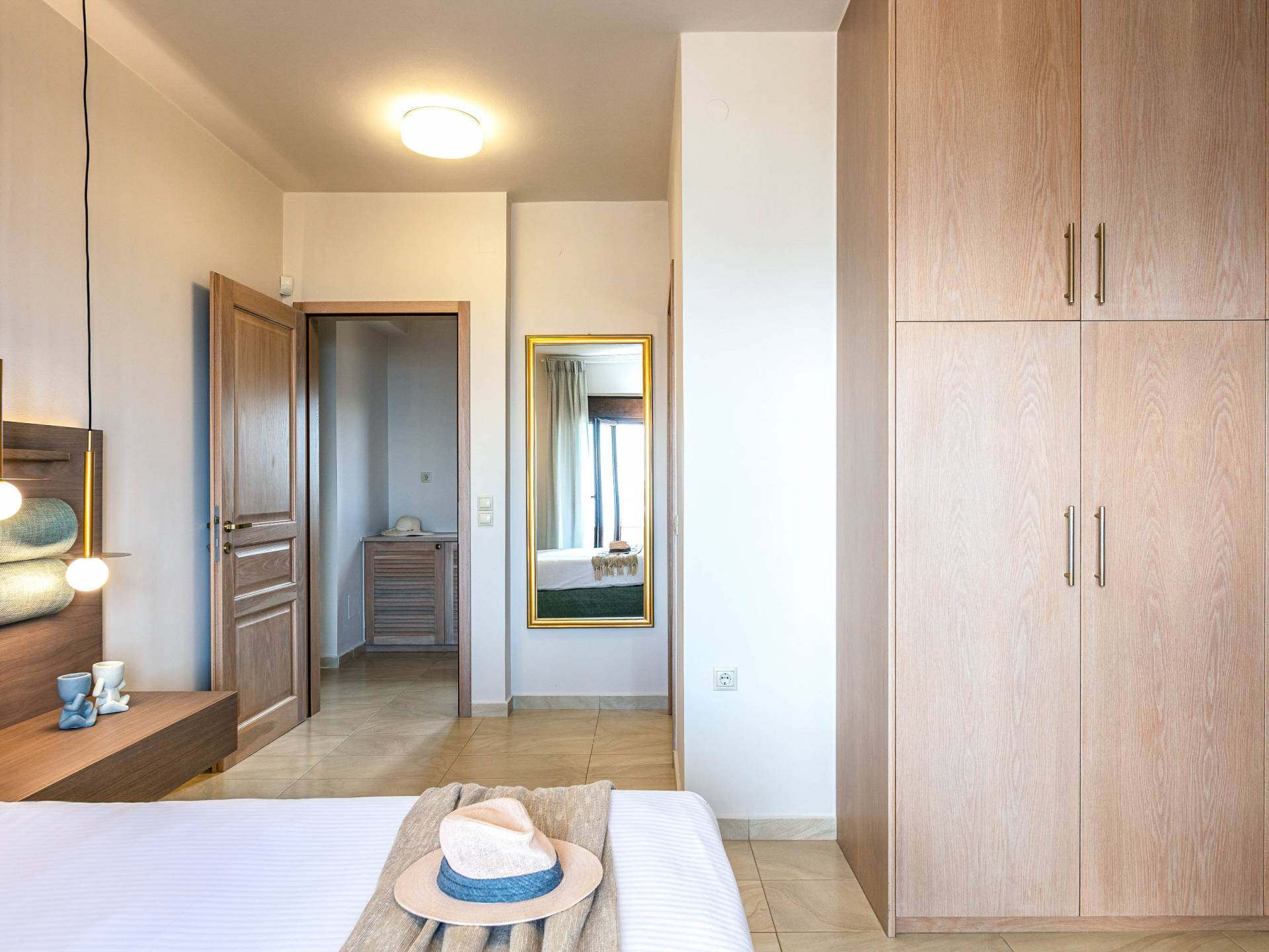 Entering Golden Hill Villa Chania on the ground floor there is a wide-open plan area that contains the living room with a fireplace, a 47” satellite HDTV, an indoor dining area, and a fully equipped kitchen of top quality fixtures and devices. There is also another sitting area with a lovely view spreading in front of it. The living room area opens to a veranda with a sitting area that leads you to the pool and the garden area. Further, an organized office room and a toilet are also found on the same floor.