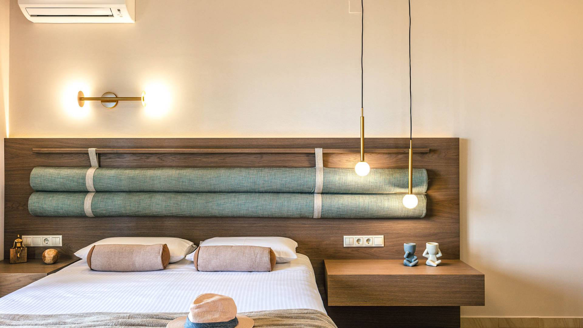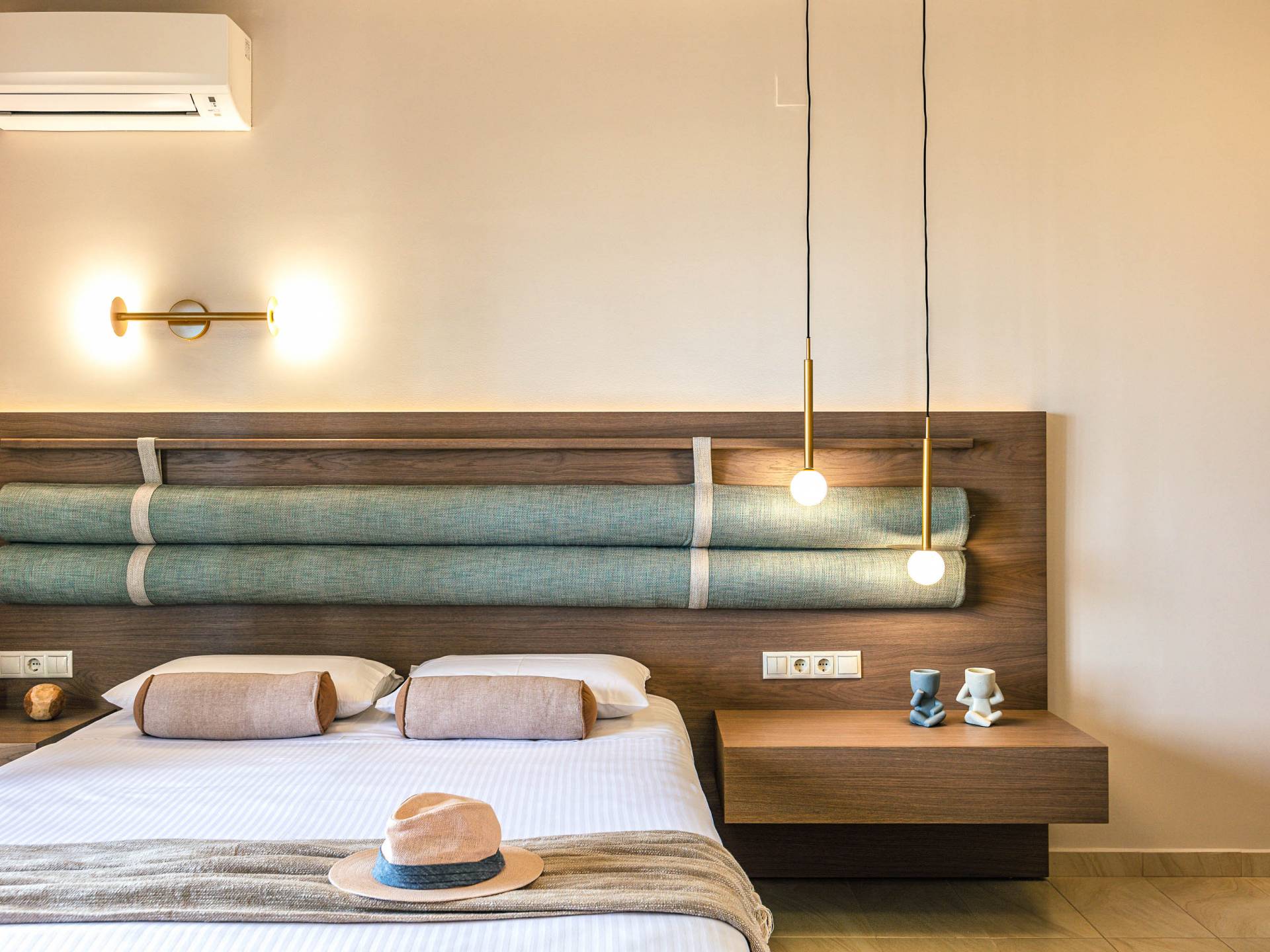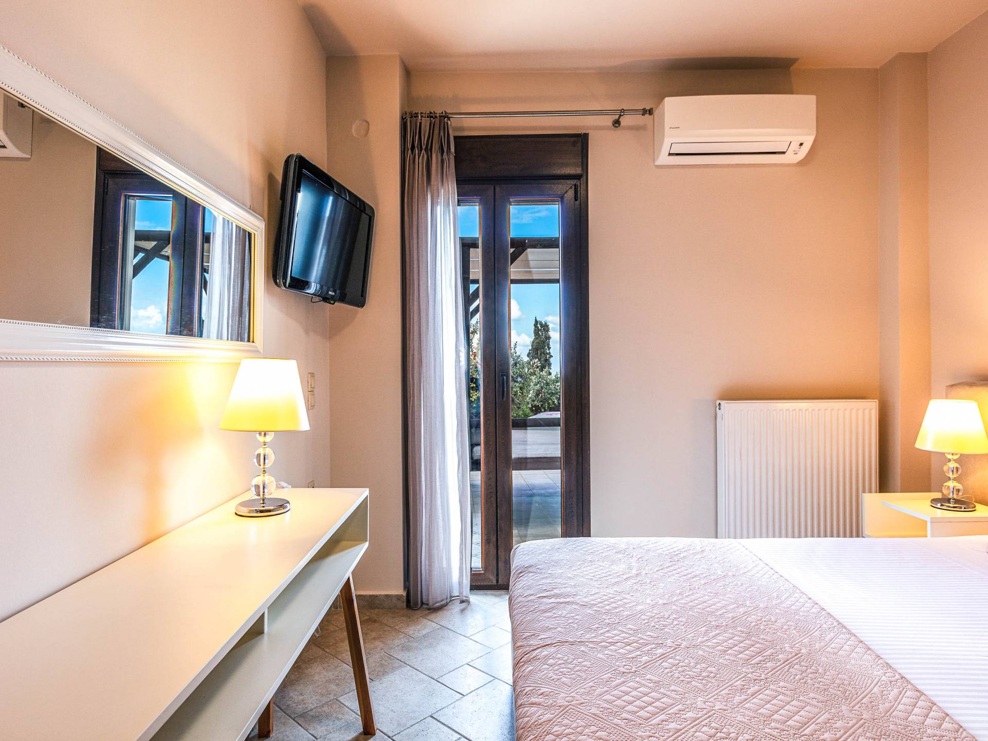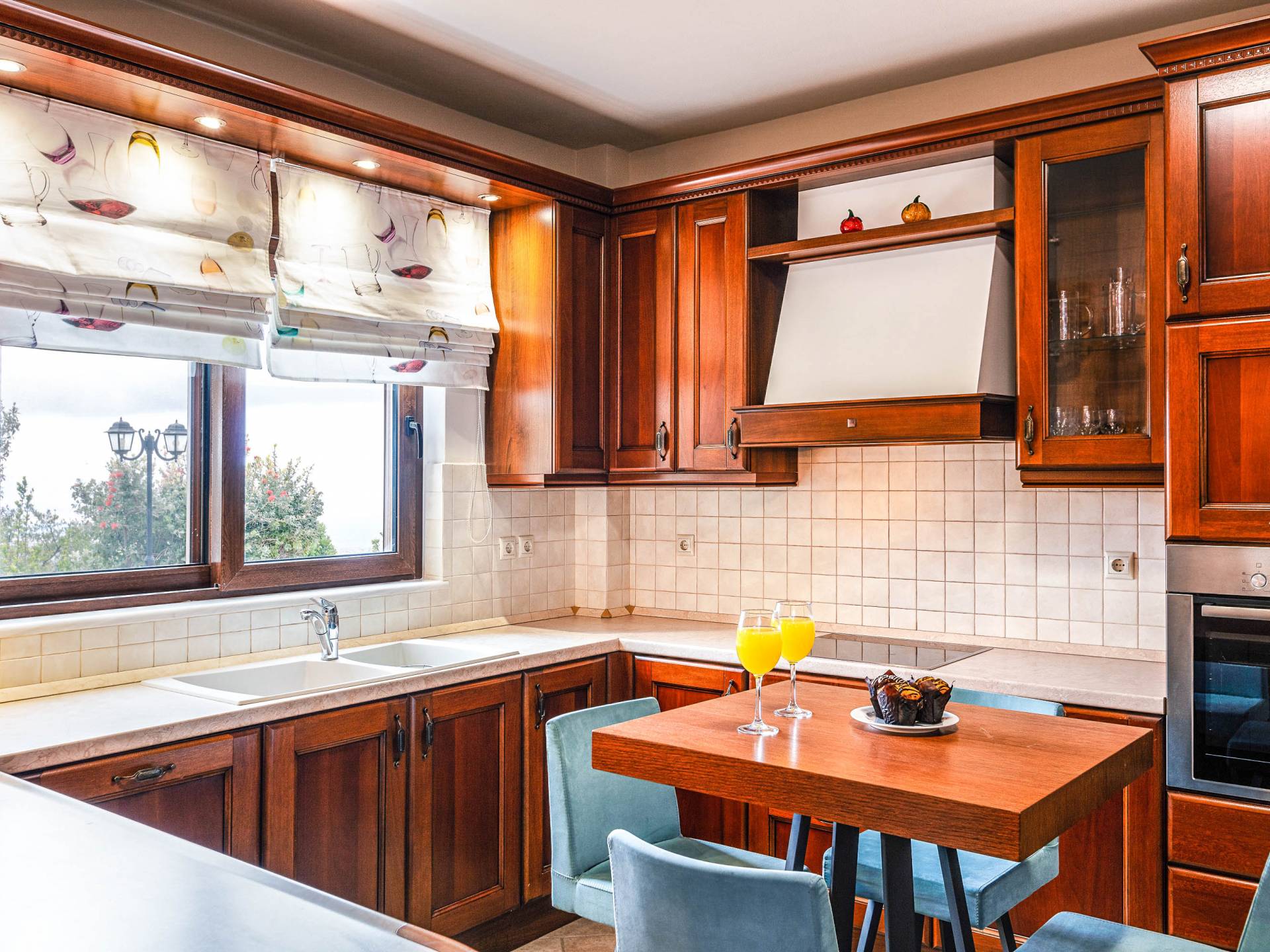 Entering Golden Hill Villa Chania on the ground floor there is a wide-open plan area that contains the living room with a fireplace, a 47” satellite HDTV, an indoor dining area, and a fully equipped kitchen of top quality fixtures and devices. There is also another sitting area with a lovely view spreading in front of it. The living room area opens to a veranda with a sitting area that leads you to the pool and the garden area. Further, an organized office room and a toilet are also found on the same floor.