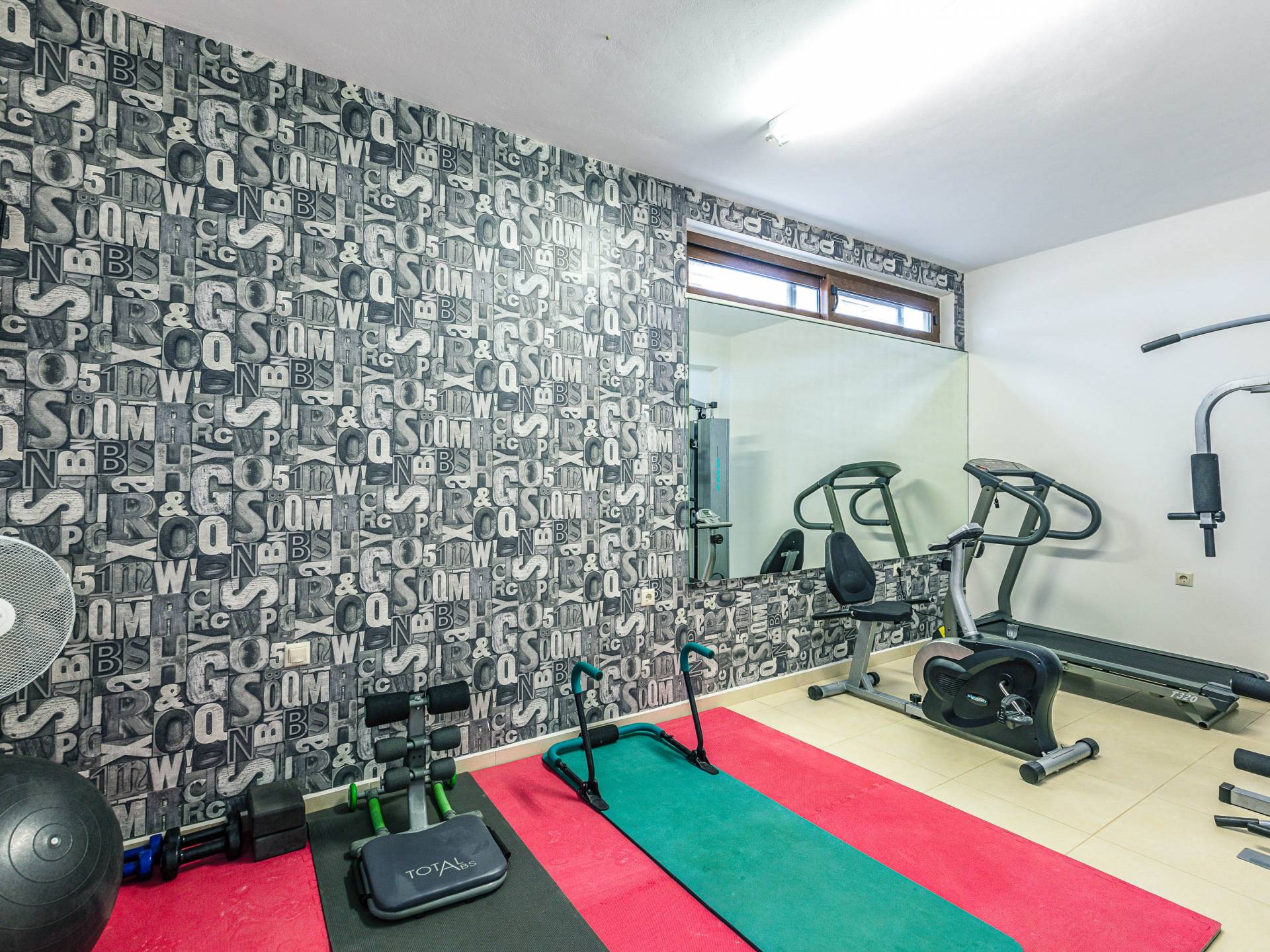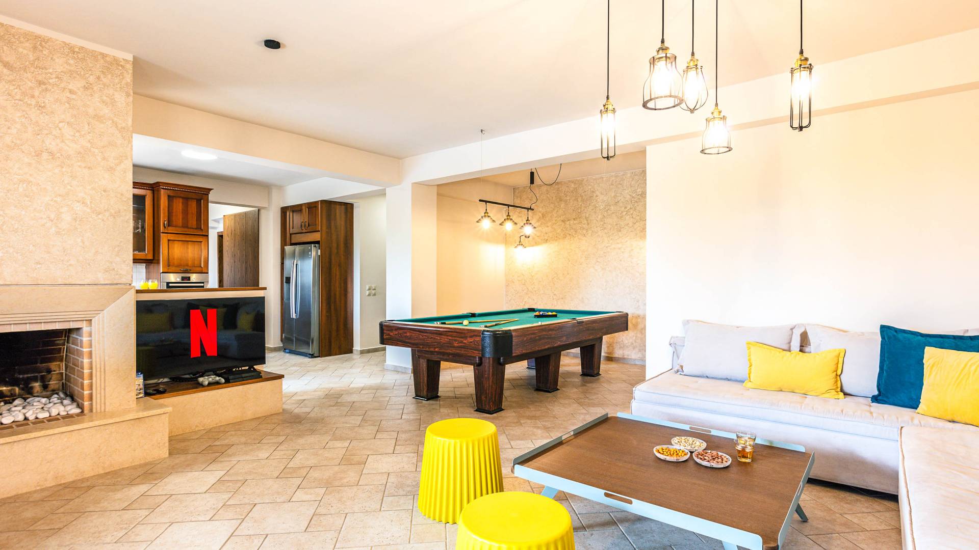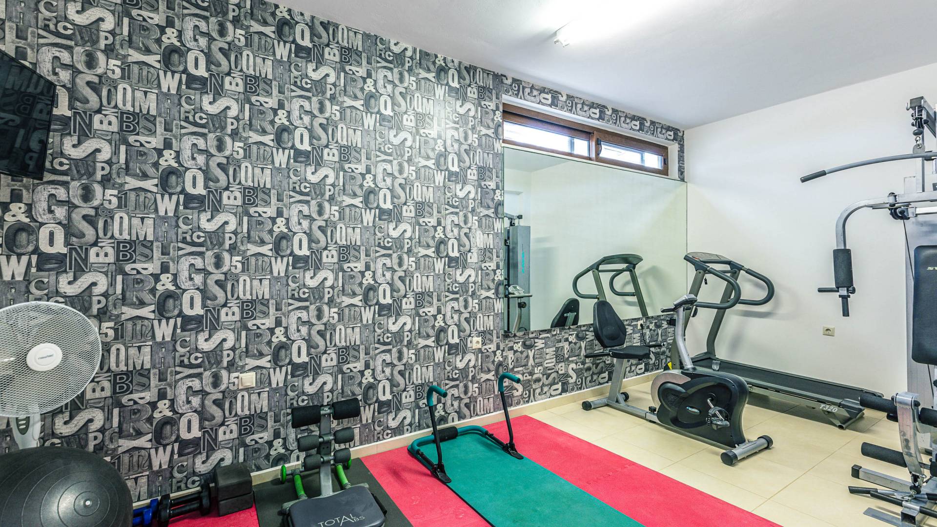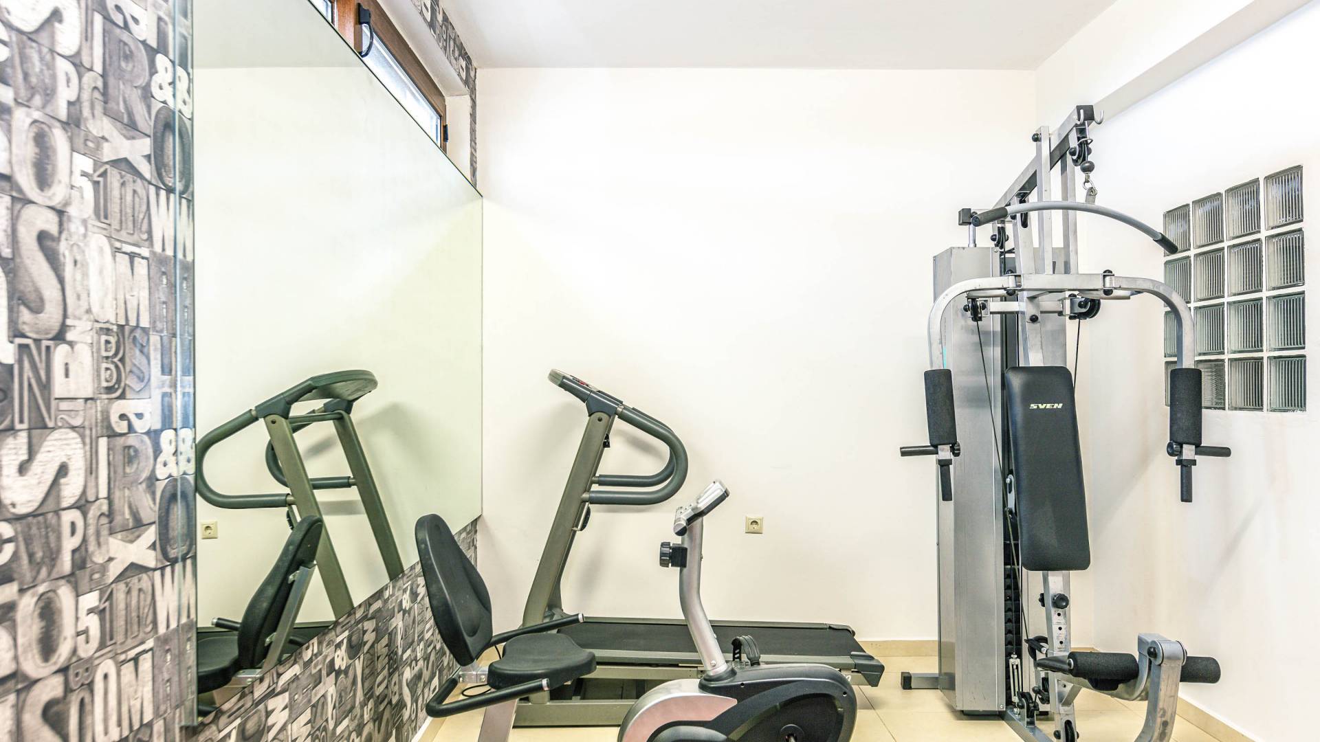 A staircase from the living room area on the ground floor leads you down to the lower floor. On this floor, there is a gym, an open plan area consisting of the playroom area, and the secondary kitchen. Our gym has a wide collection of fitness equipment such as a treadmill, a stationary bicycle, abs equipment, a fitness multifunctional apparatus, and exercise balls. The comfortable and cozy playroom area includes a big sofa, 50” HDTV, Playstation4 with games, board games, toys for young children, and a billiard. There is also a ping pong table on the veranda out of the playroom. Additionally, there are two bedrooms on the same floor, one with a double bed and the other one with two single beds which also can be united to form a double bed. A bathroom with a shower is also found on this floor.