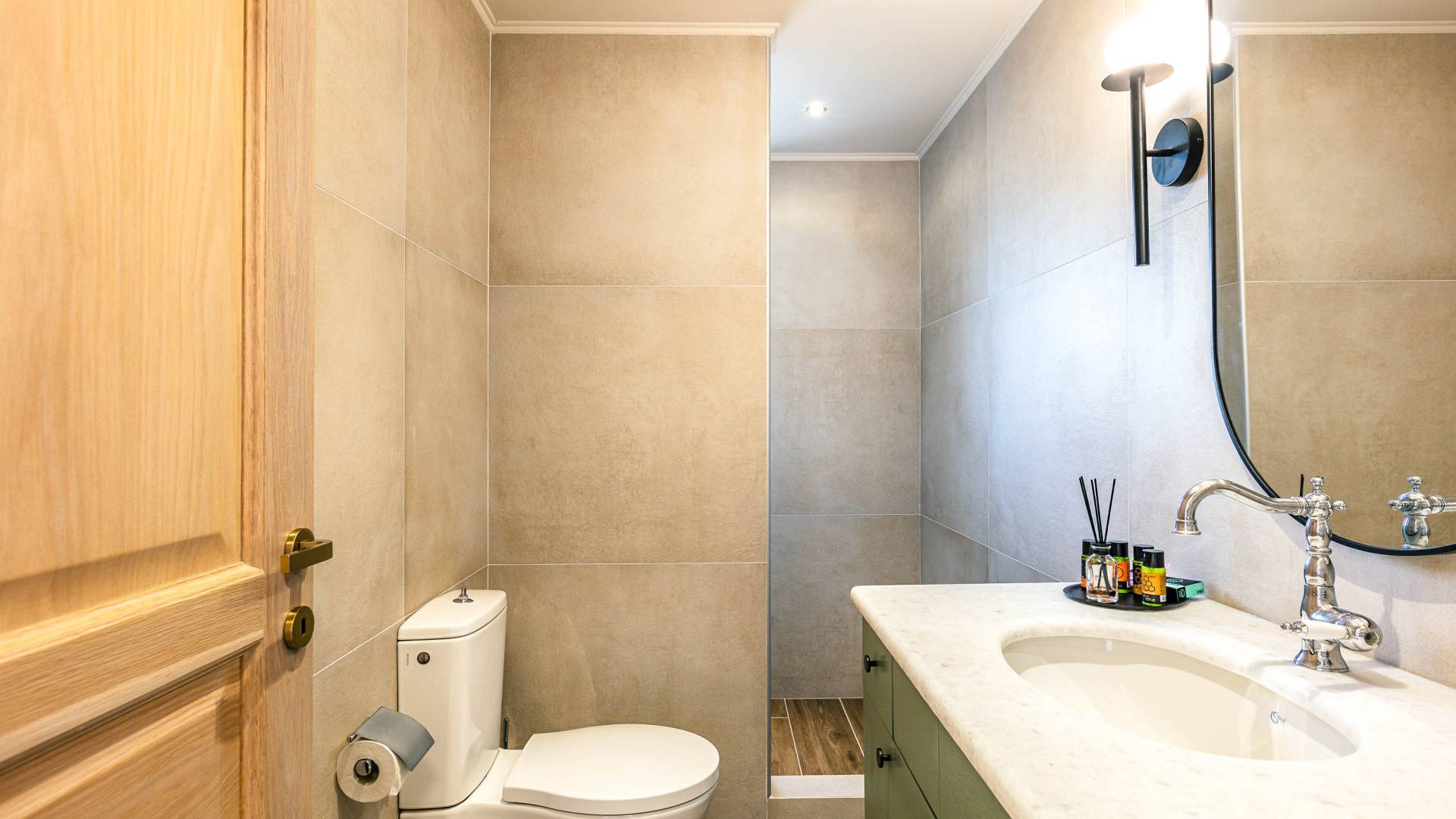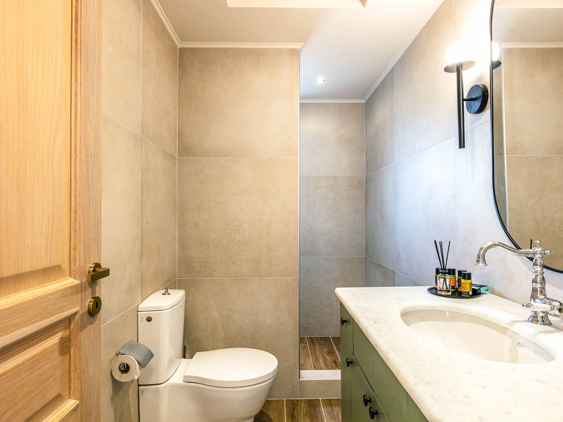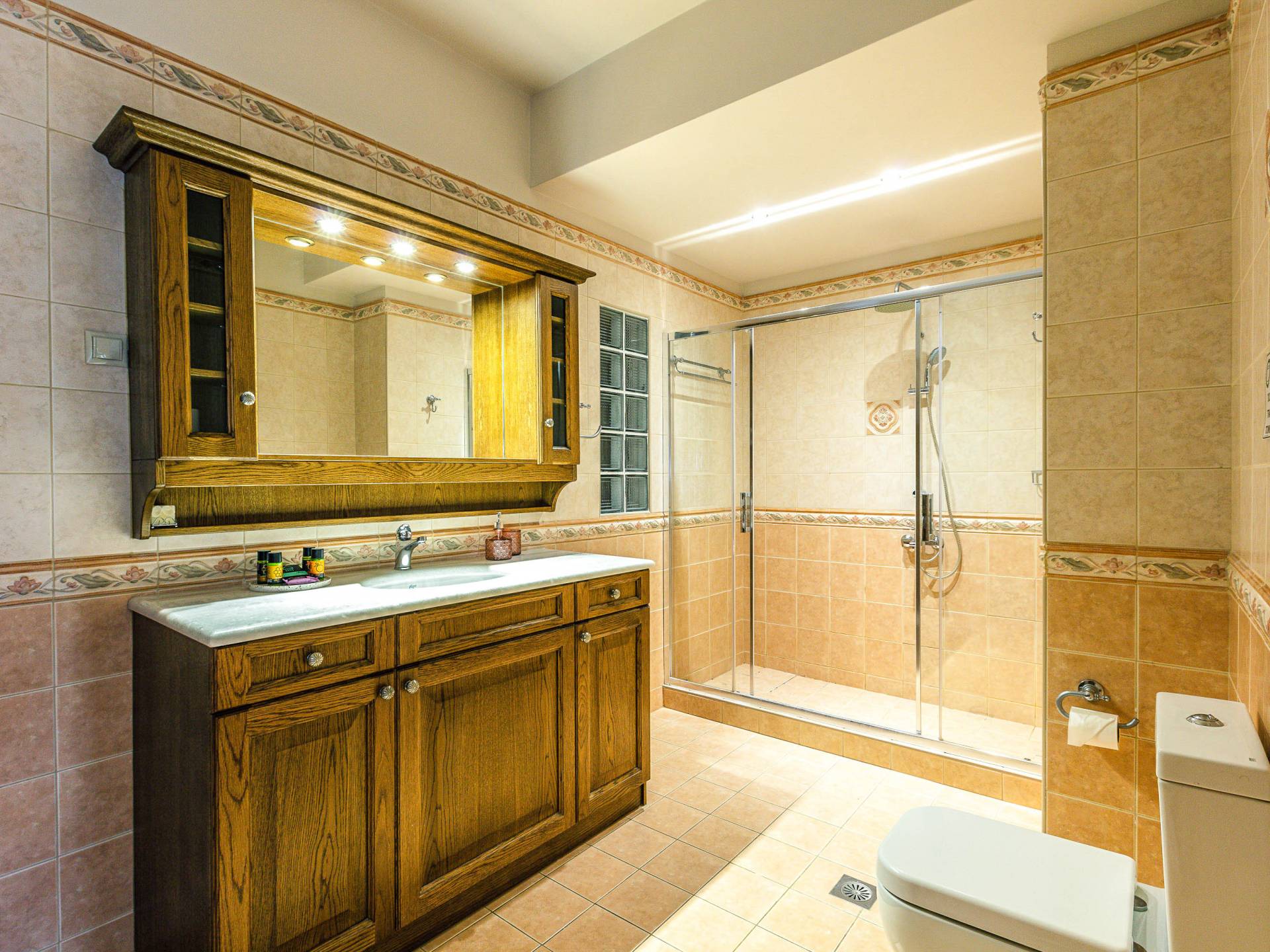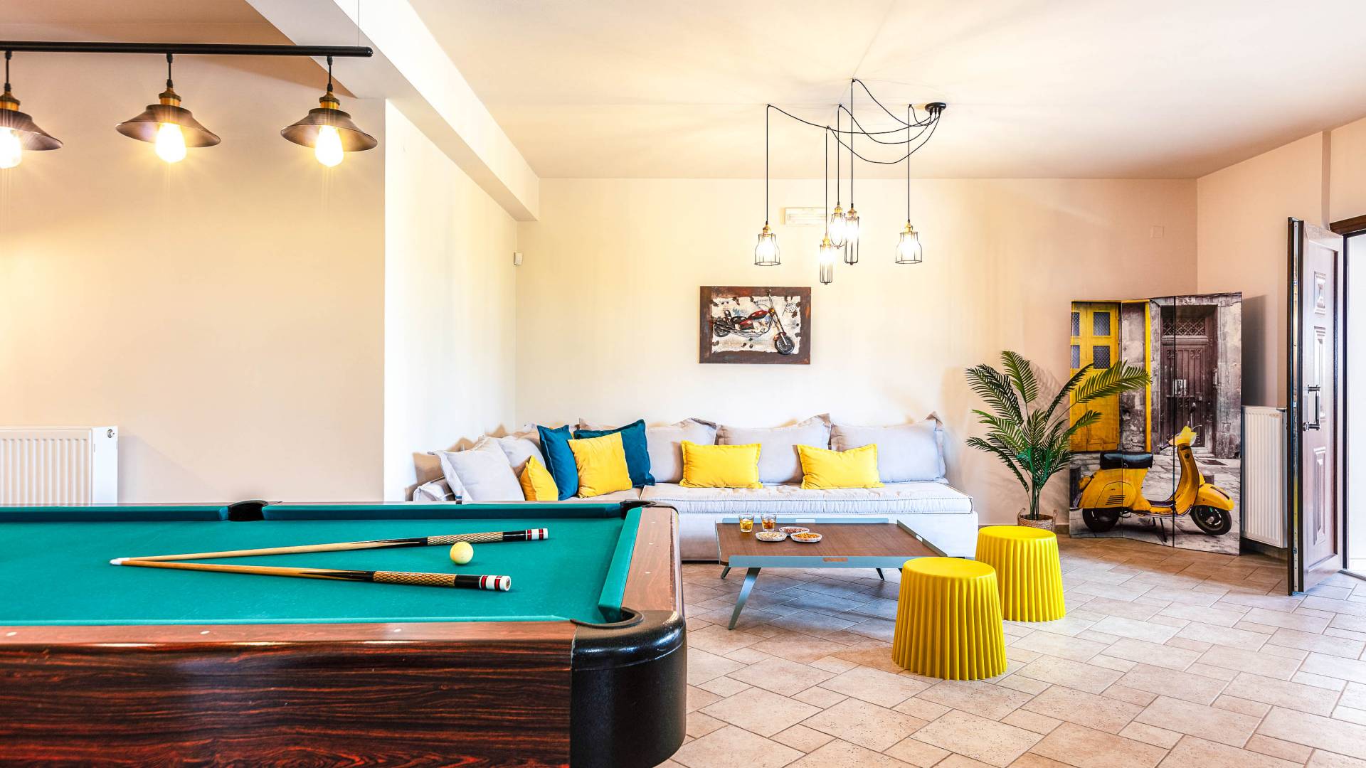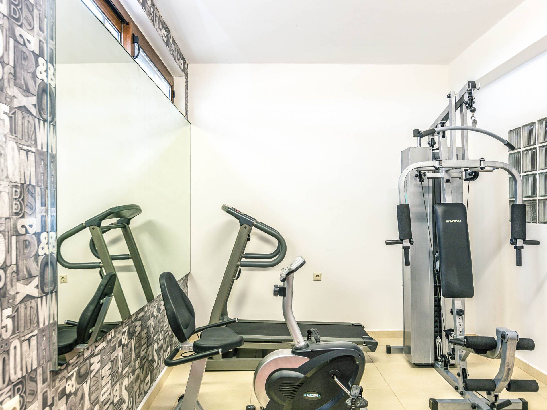 A staircase from the living room area on the ground floor leads you down to the lower floor. On this floor, there is a gym, an open plan area consisting of the playroom area, and the secondary kitchen. Our gym has a wide collection of fitness equipment such as a treadmill, a stationary bicycle, abs equipment, a fitness multifunctional apparatus, and exercise balls. The comfortable and cozy playroom area includes a big sofa, 50” HDTV, Playstation4 with games, board games, toys for young children, and a billiard. There is also a ping pong table on the veranda out of the playroom. Additionally, there are two bedrooms on the same floor, one with a double bed and the other one with two single beds which also can be united to form a double bed. A bathroom with a shower is also found on this floor.