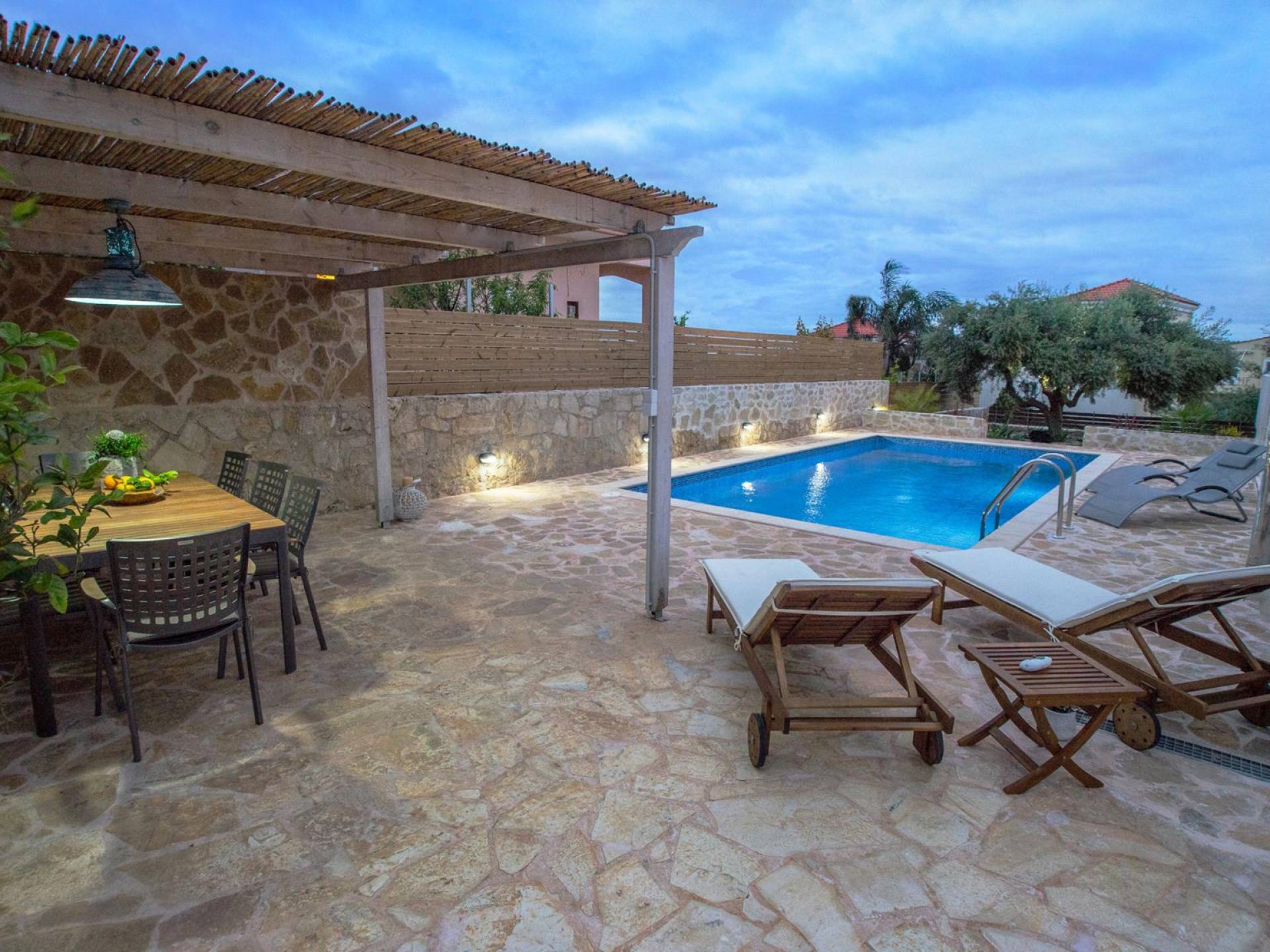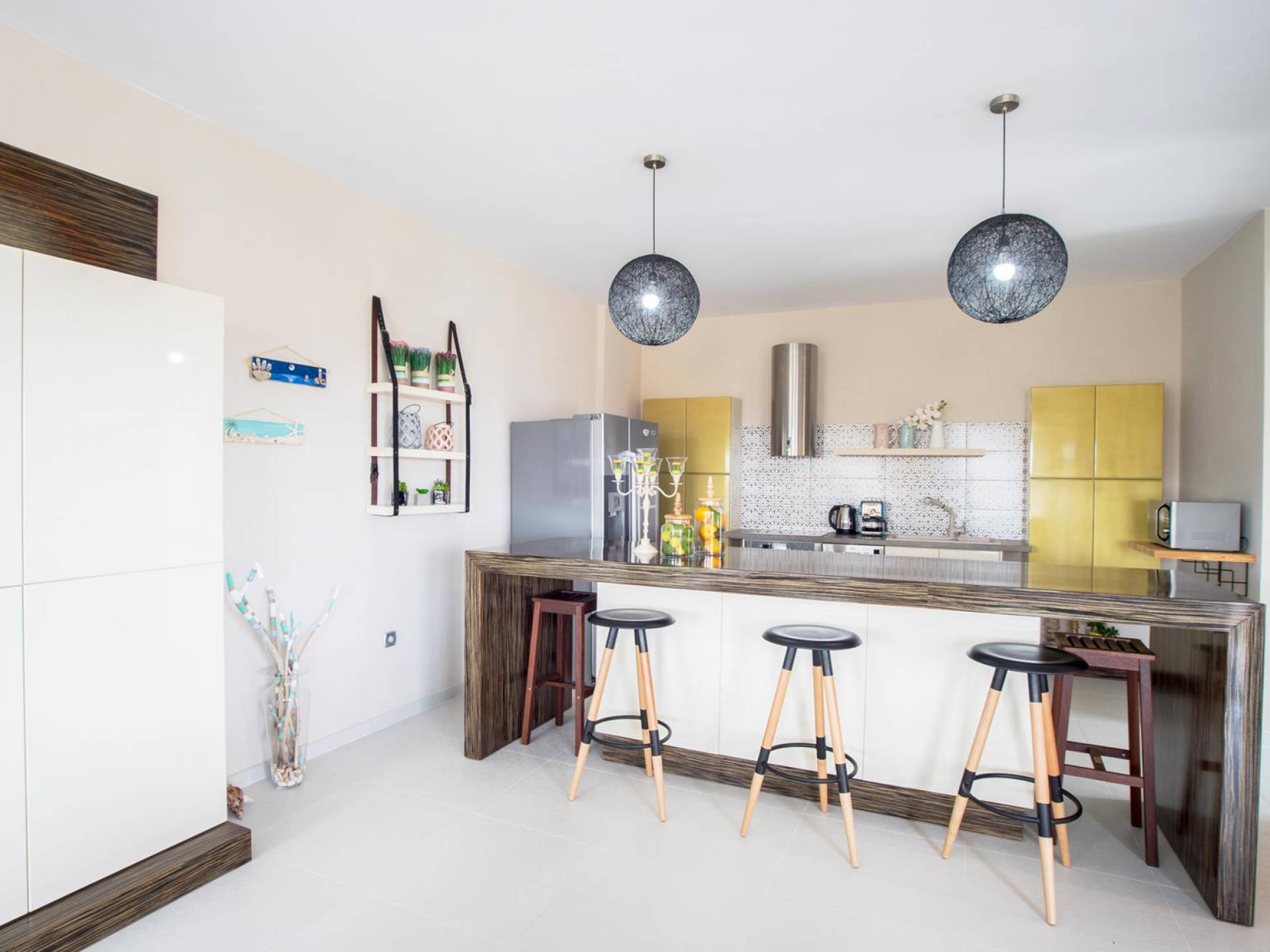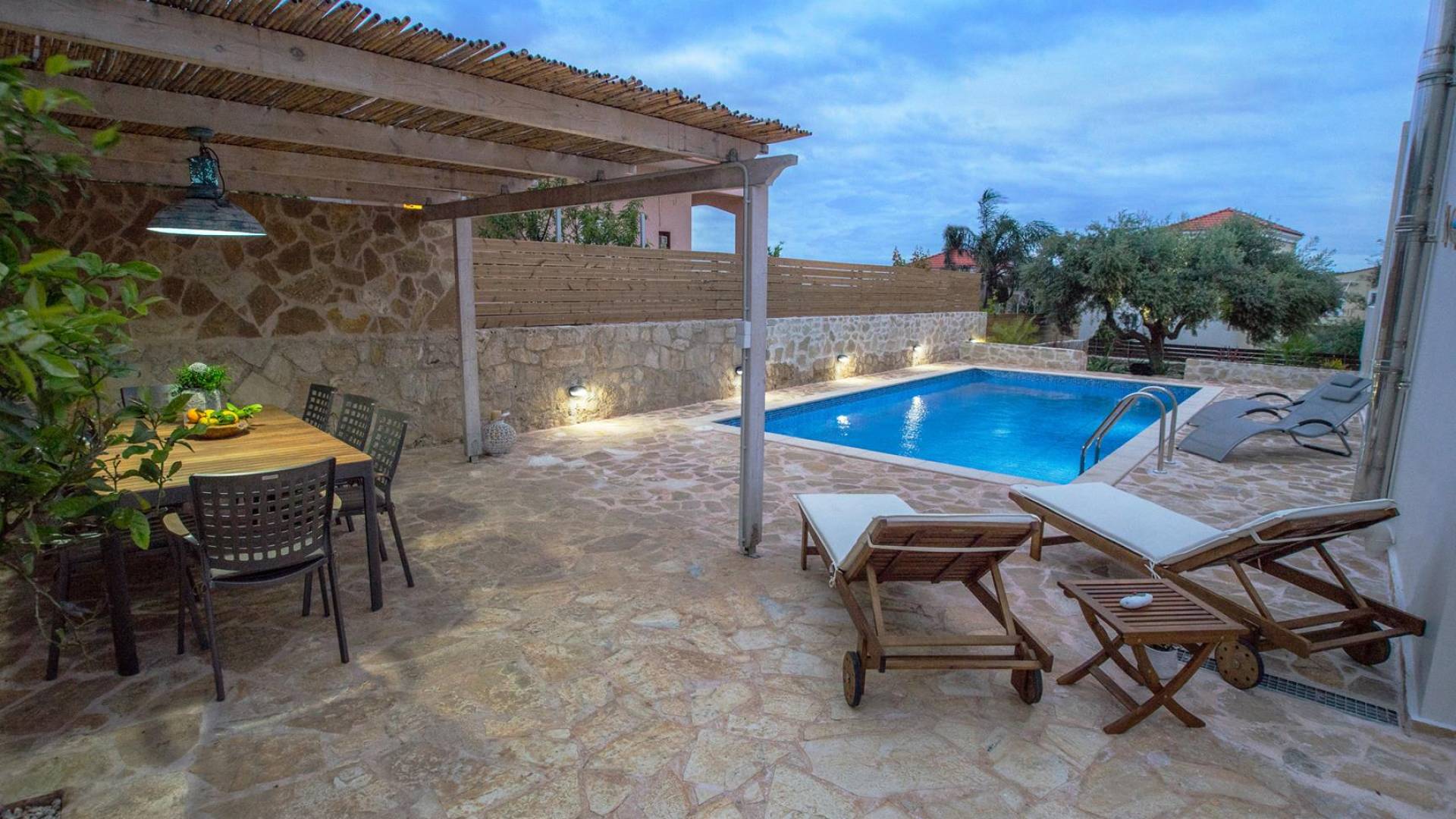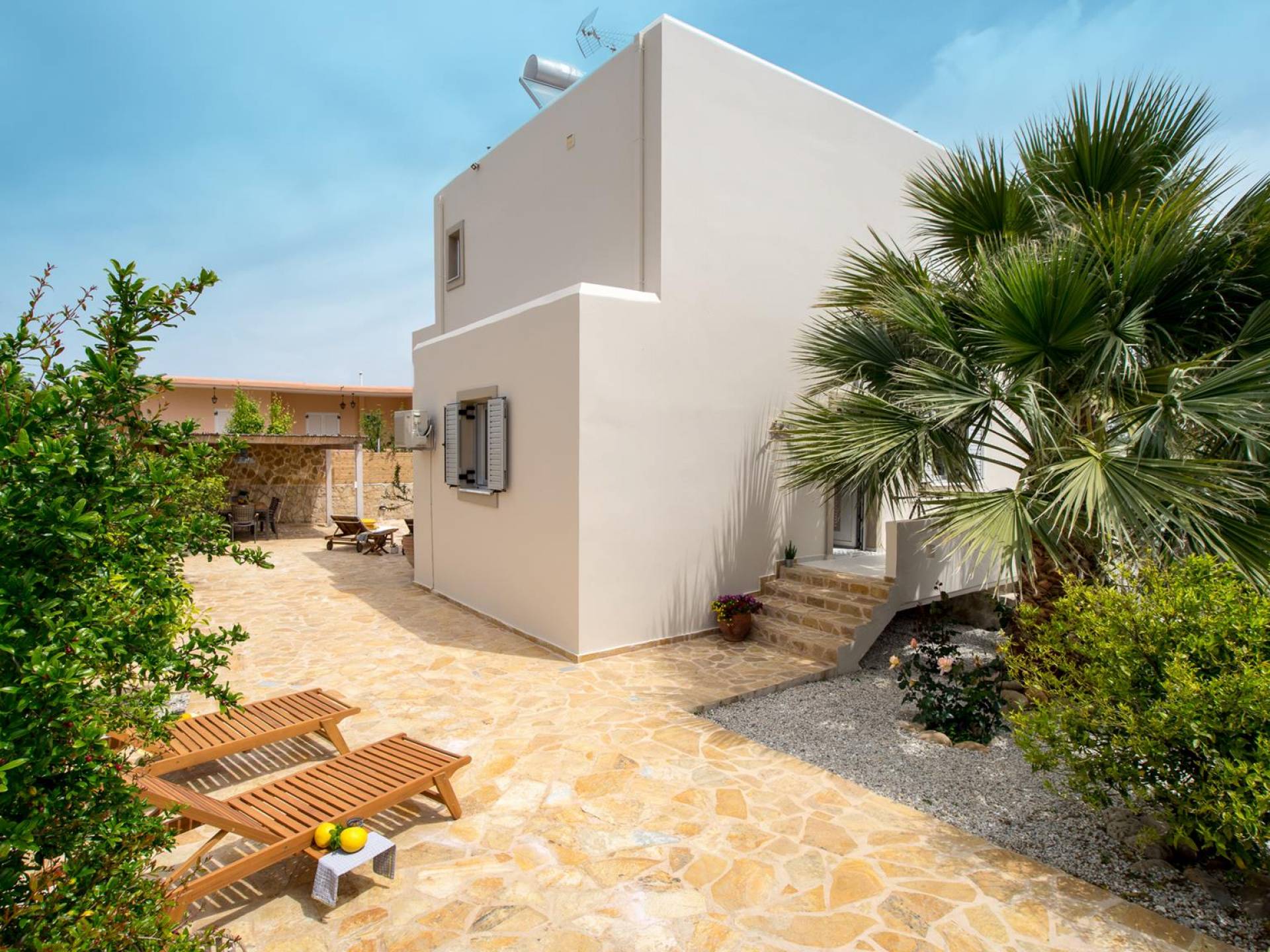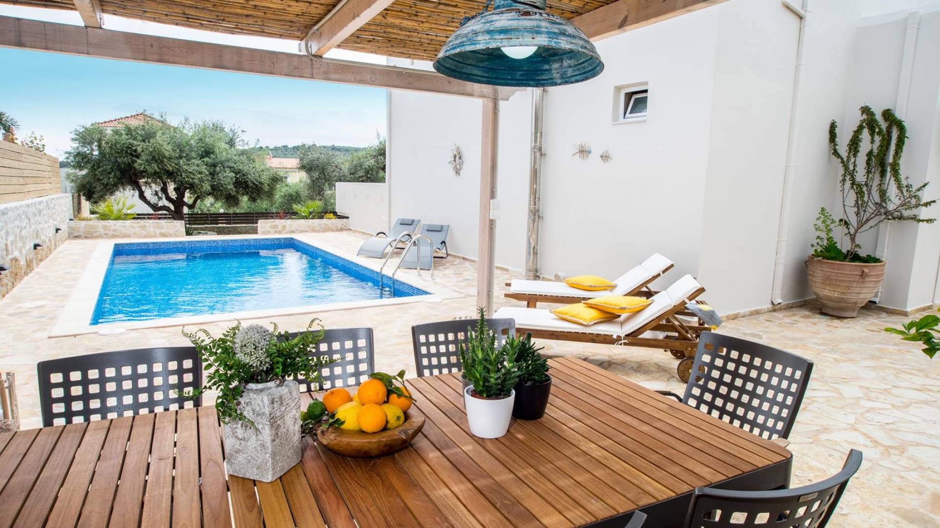 Image Villa Chania cosists of 3 bedrooms and 3 bathrooms, dinind room, kitchen and living room. 2 of the bedrooms have large double beds and the 3rd bedroom has 2 comfortable single beds. The modern design and the combination of colours will fascinate you. The kitchen is fully equipped and the large living room has direct access to the pool area that is ideal for relaxing. Outside, there is also a large dining table and a garden that you will love.