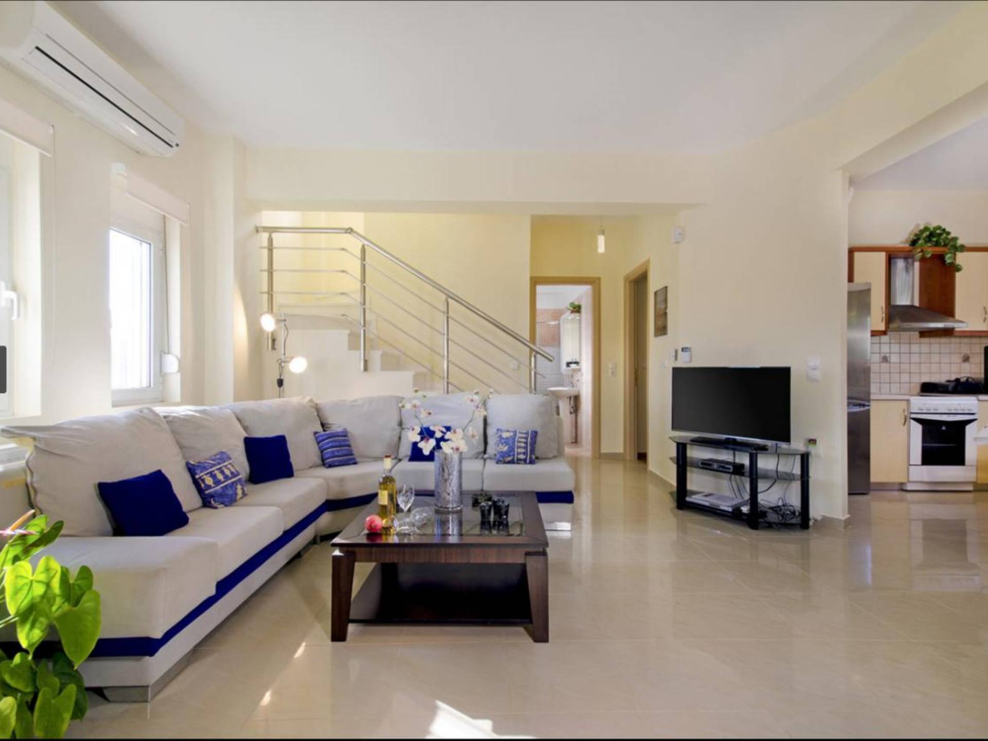 There's a supermarket just 6 minuteson foot.There's a refrigerator on the upper floor as well.The kitchen will be fully equipped with kitchenware,dishwasher, sandwich toaster,citrus juicer,refrigerator, toasts, milk, tea, honey, Cretan organic products, olive oil, Cretan drinks, and more products!