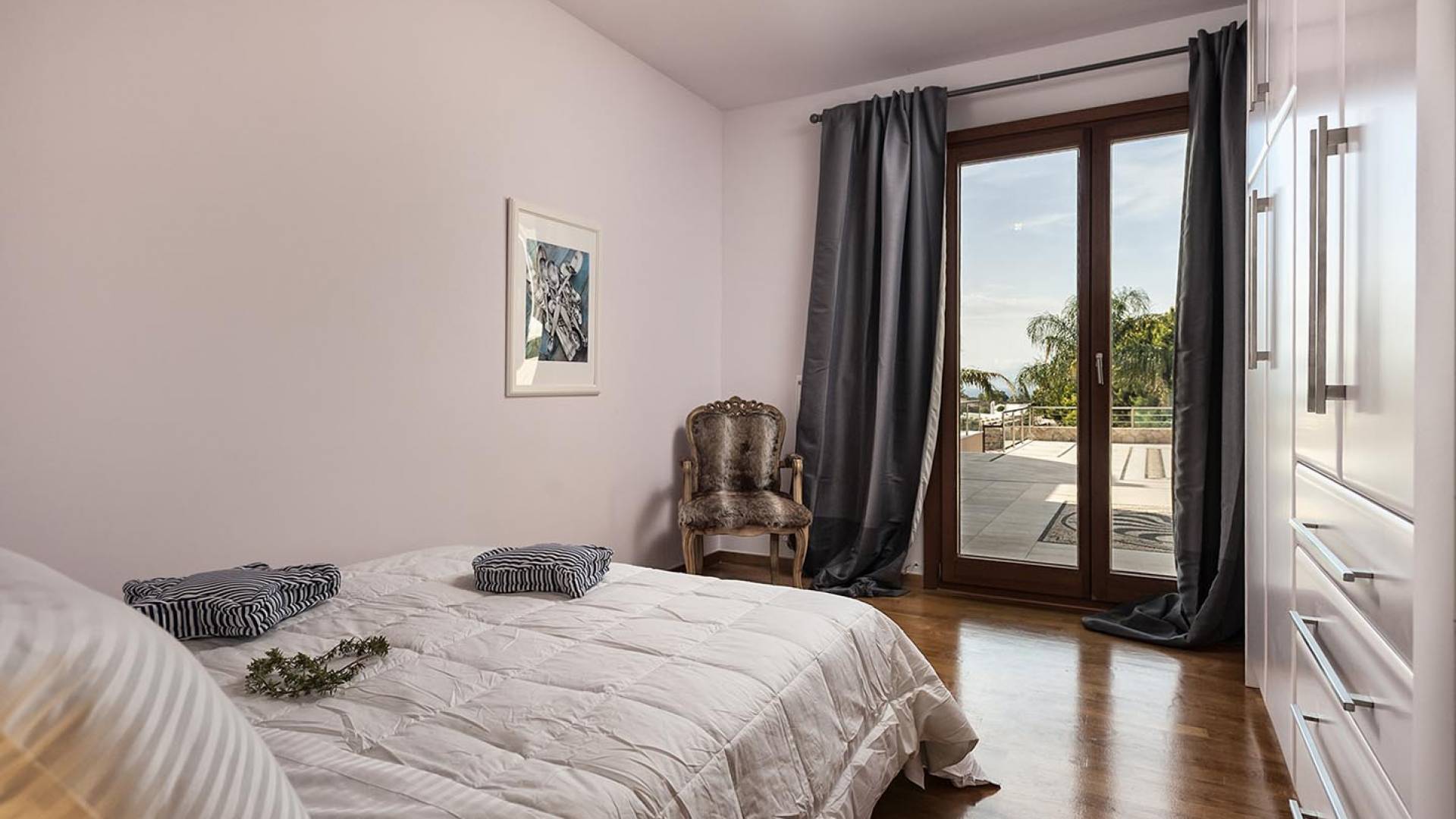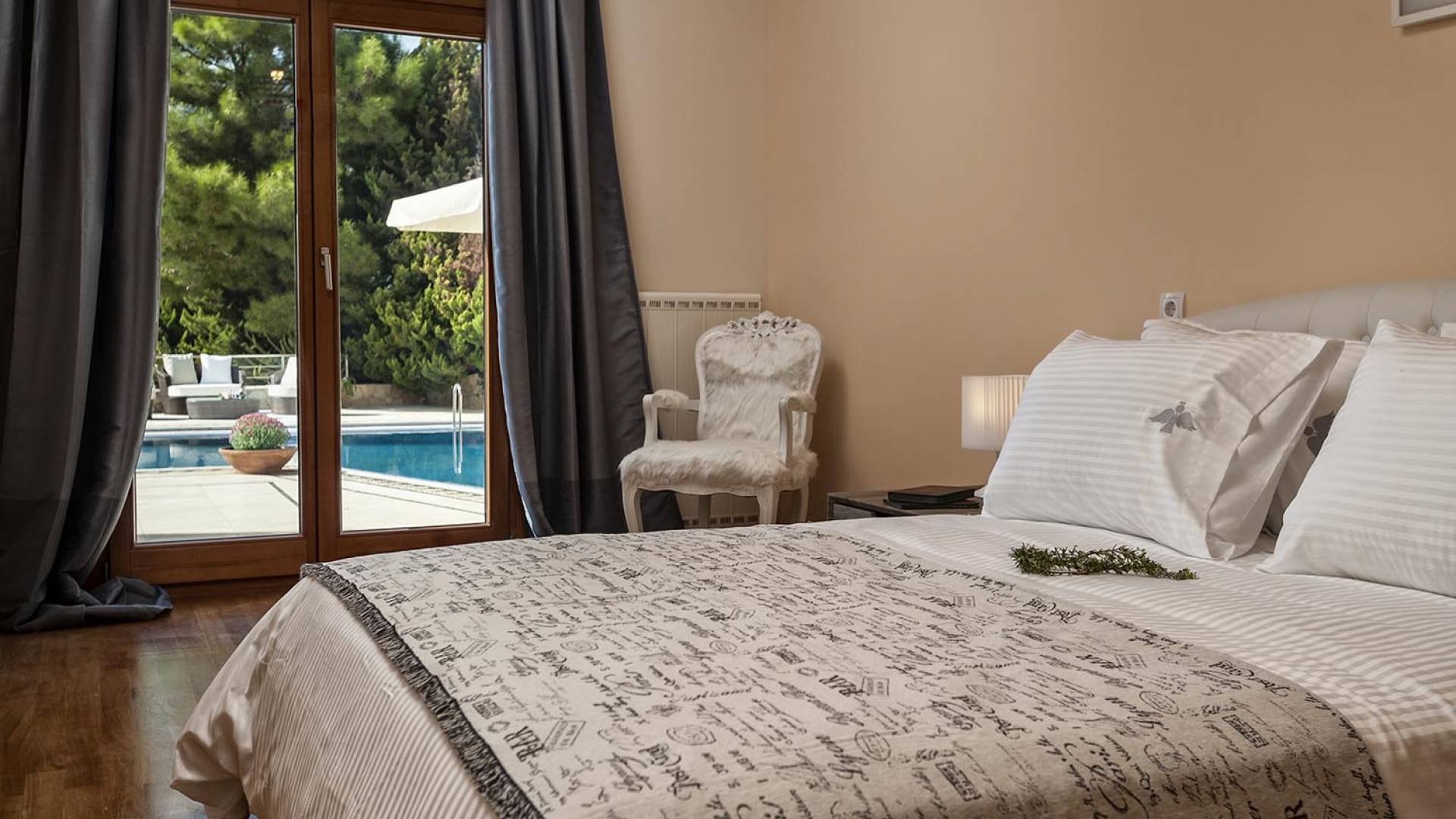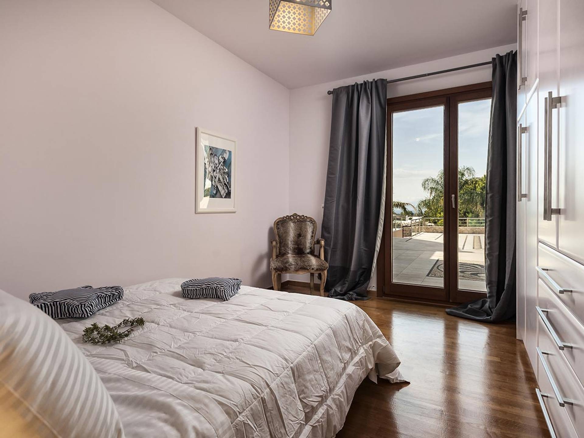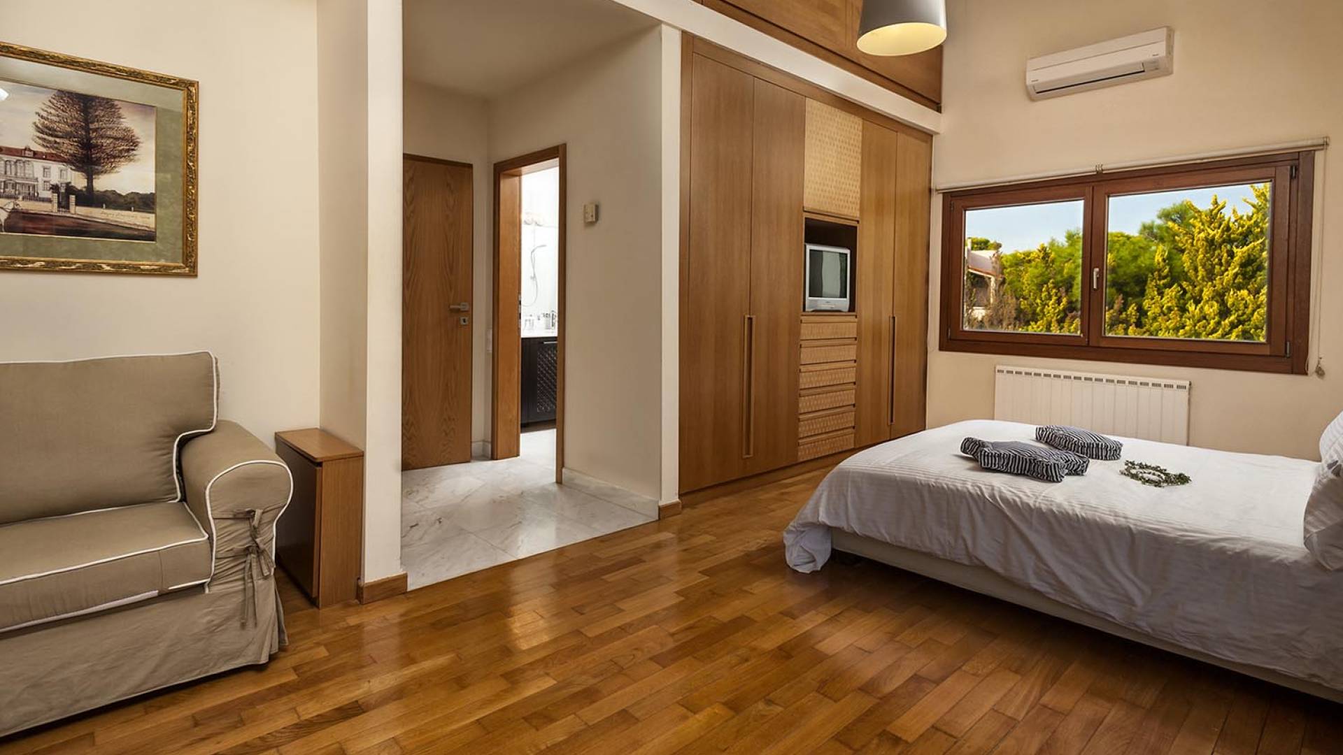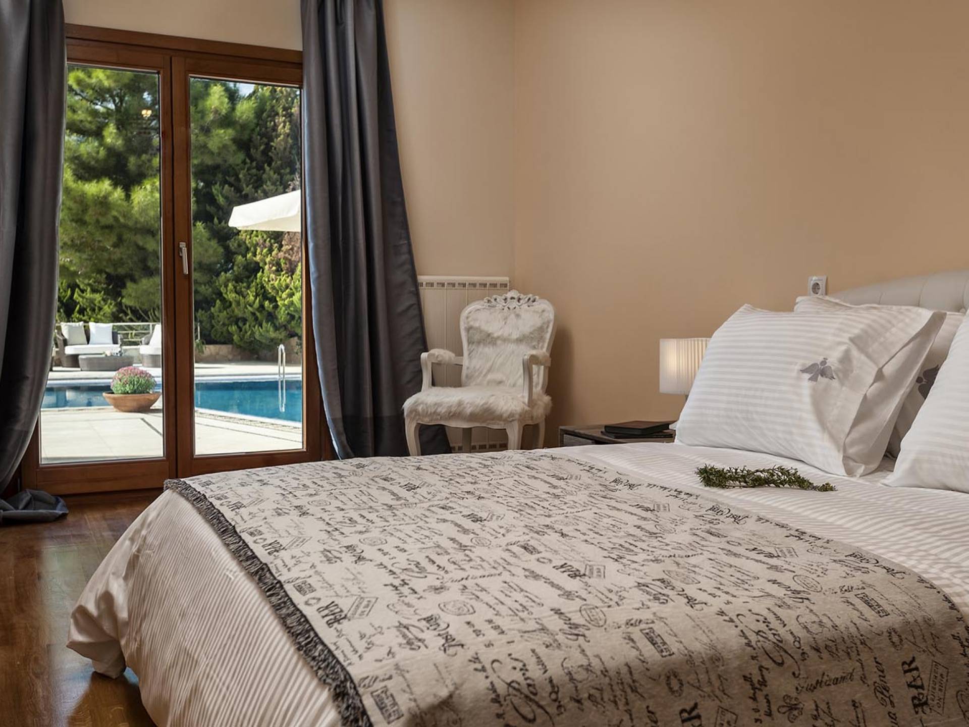 On these two levels, the accommodation areas are established: six elegant bedrooms, four luxury bathrooms, and two comfortable sitting rooms. All the guest rooms have direct access either to the pool or to the garden with the BBQ. More specifically, on these levels, the villa contains Two 25m² bedrooms with a double bed, nightstands, luggage table, couch, fitted closets, wooden floors, heating, and A/C. One offers a garden view and the other a pool view. Each of these rooms has a personal en-suite marble 5m² bathroom, with a bathtub, high-end sanitary appliances, and accessories.