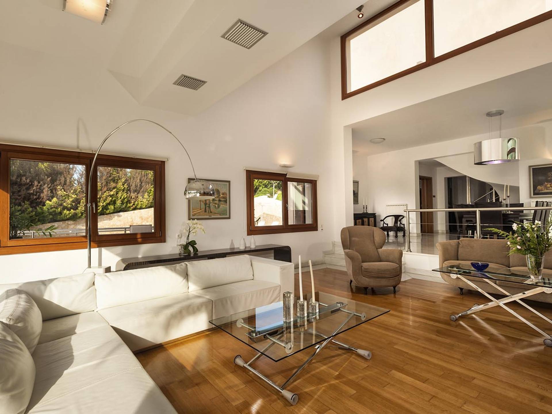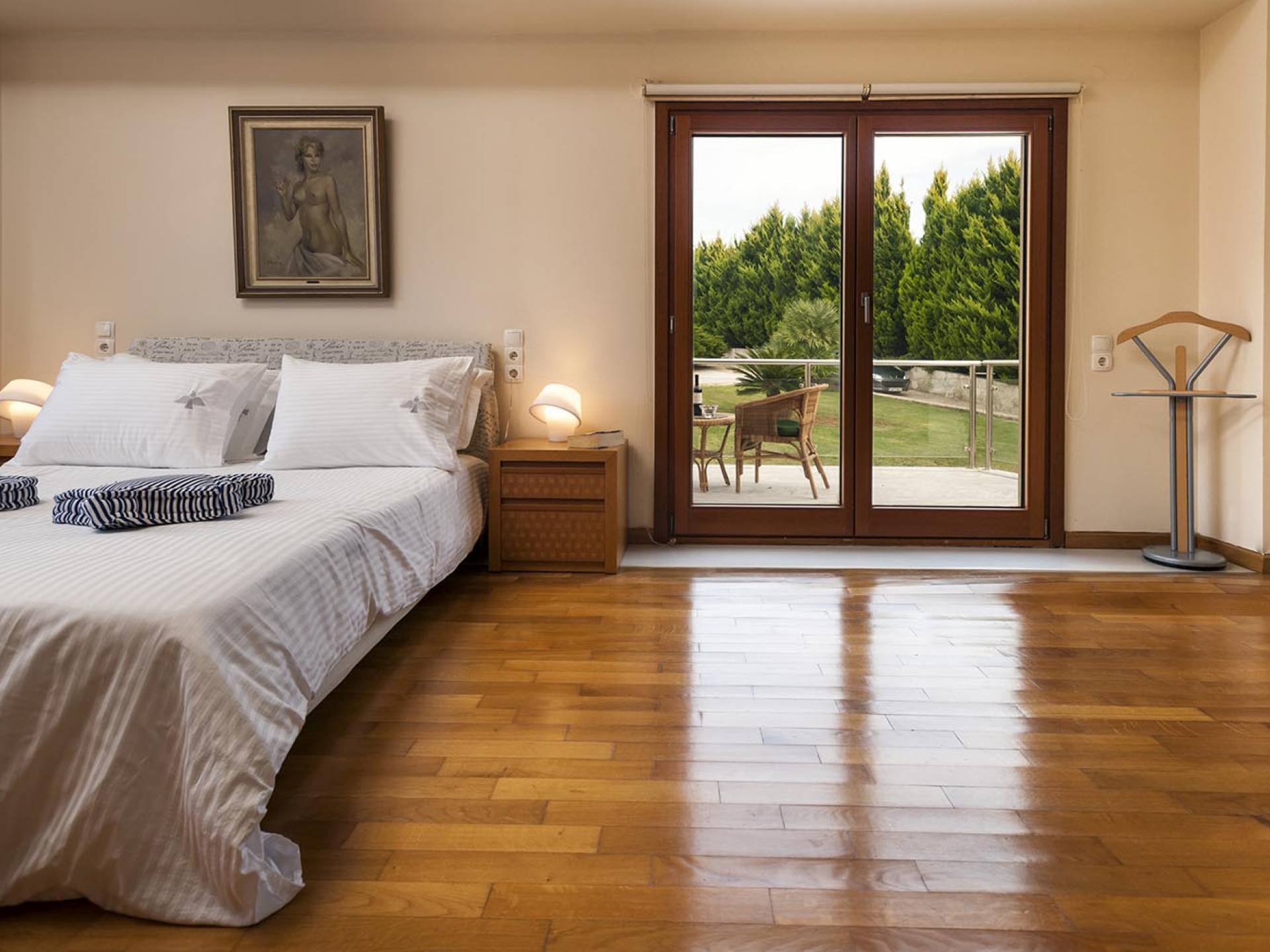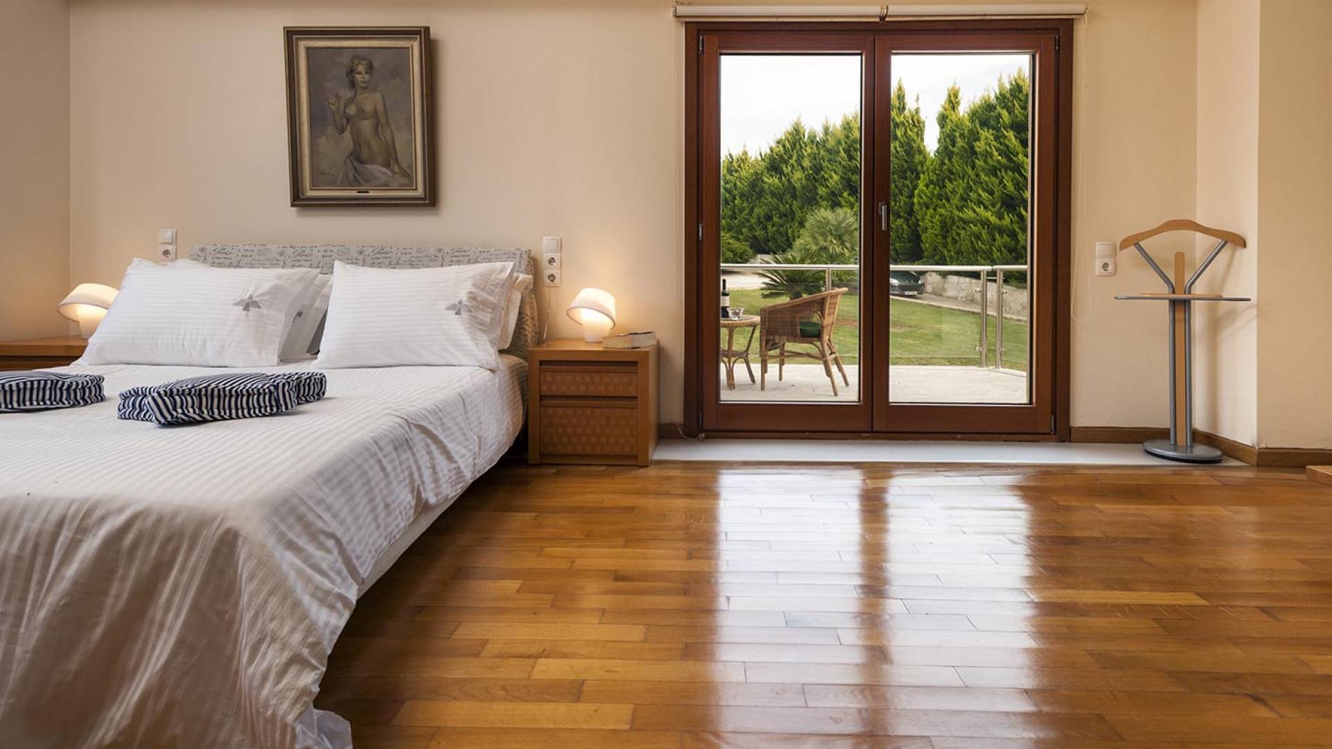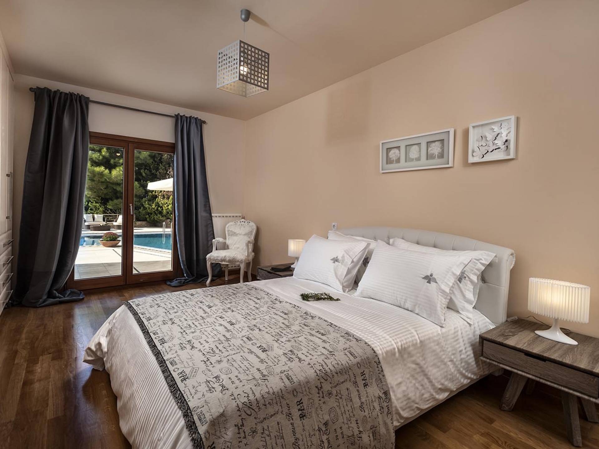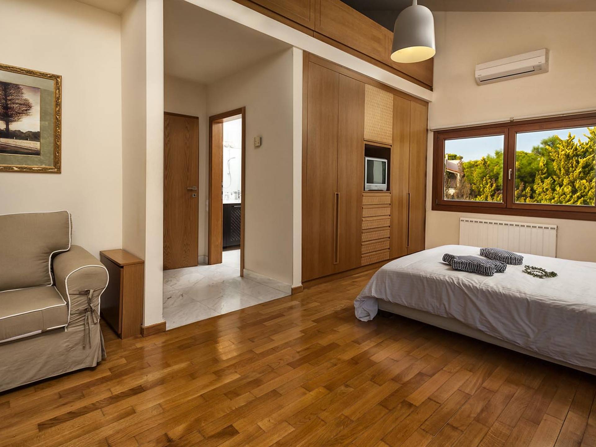 On these two levels, the accommodation areas are established: six elegant bedrooms, four luxury bathrooms, and two comfortable sitting rooms. All the guest rooms have direct access either to the pool or to the garden with the BBQ. More specifically, on these levels, the villa contains Two 25m² bedrooms with a double bed, nightstands, luggage table, couch, fitted closets, wooden floors, heating, and A/C. One offers a garden view and the other a pool view. Each of these rooms has a personal en-suite marble 5m² bathroom, with a bathtub, high-end sanitary appliances, and accessories.