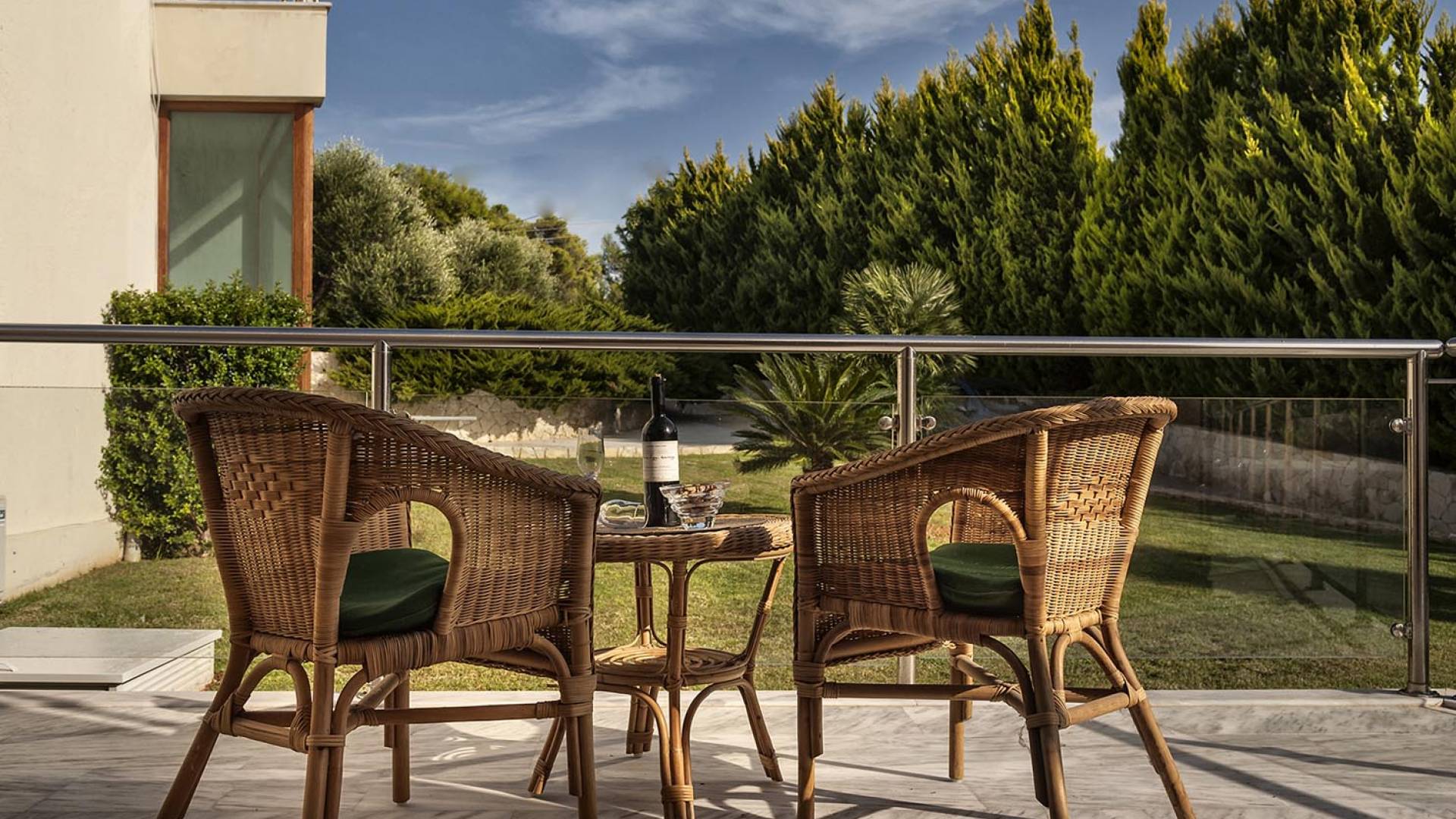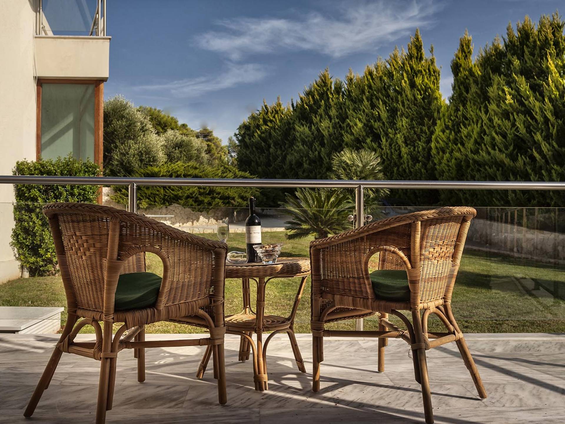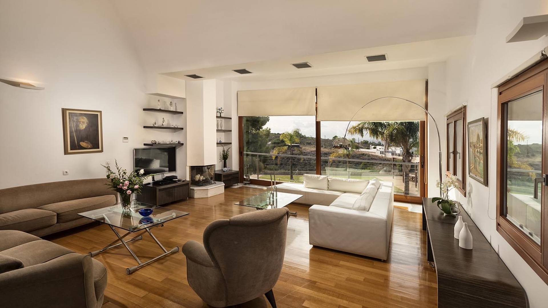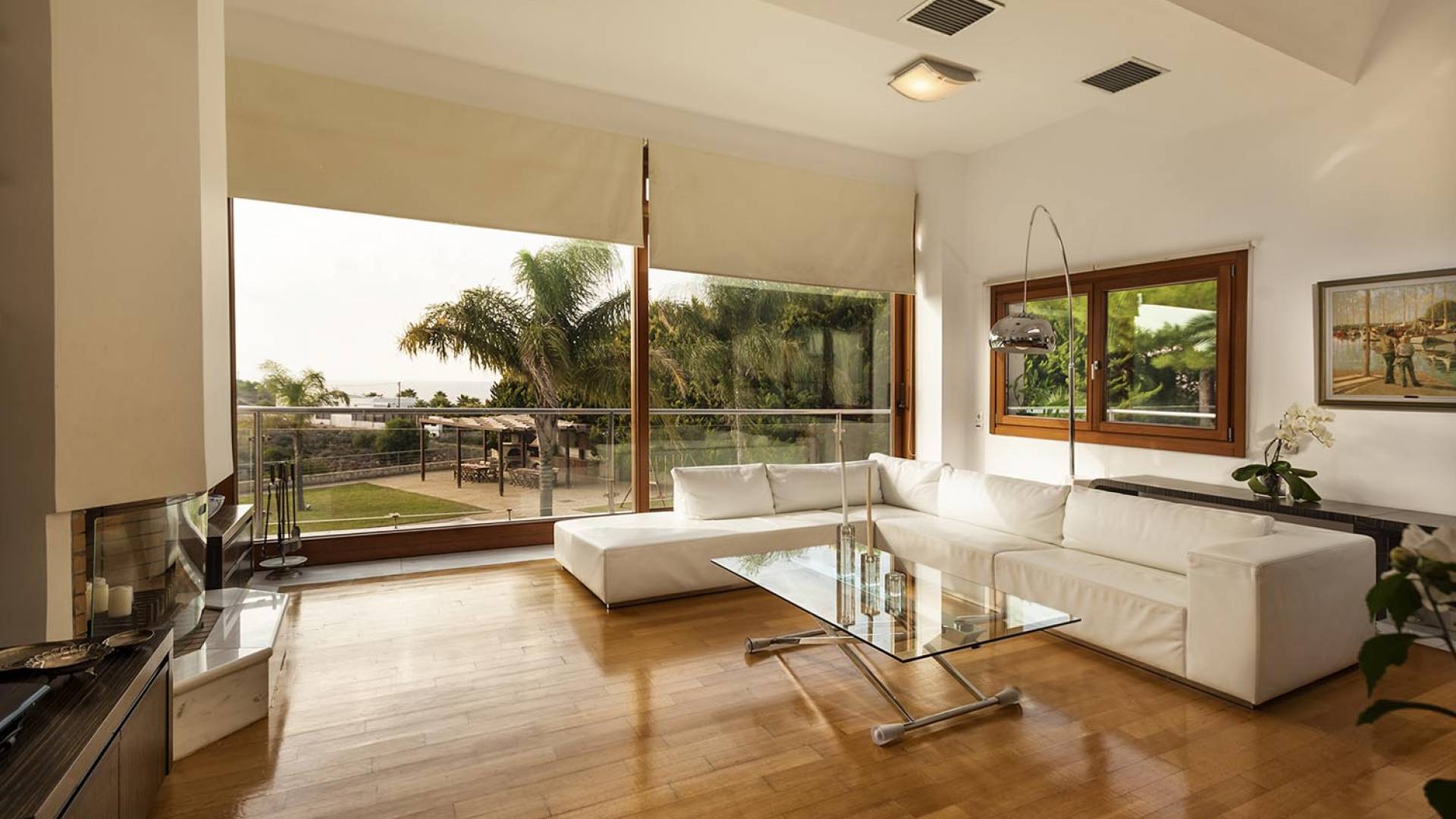 This is actually the center of the villa. The grand living area of 50m² in the exterior of the house welcomes you, through its large window panels, to wide verandas with a stunning view of the entire estate up to the Kalatha’ s bay. Designed with wooden floors, underfloor heating, and centrally air-conditioned, equipped with three couches, sitting up to 12 people, an LCD TV 50”, this living room will become your favorite point of gather with your family and friends. Of course, you cannot ignore the stylish modern fireplace.