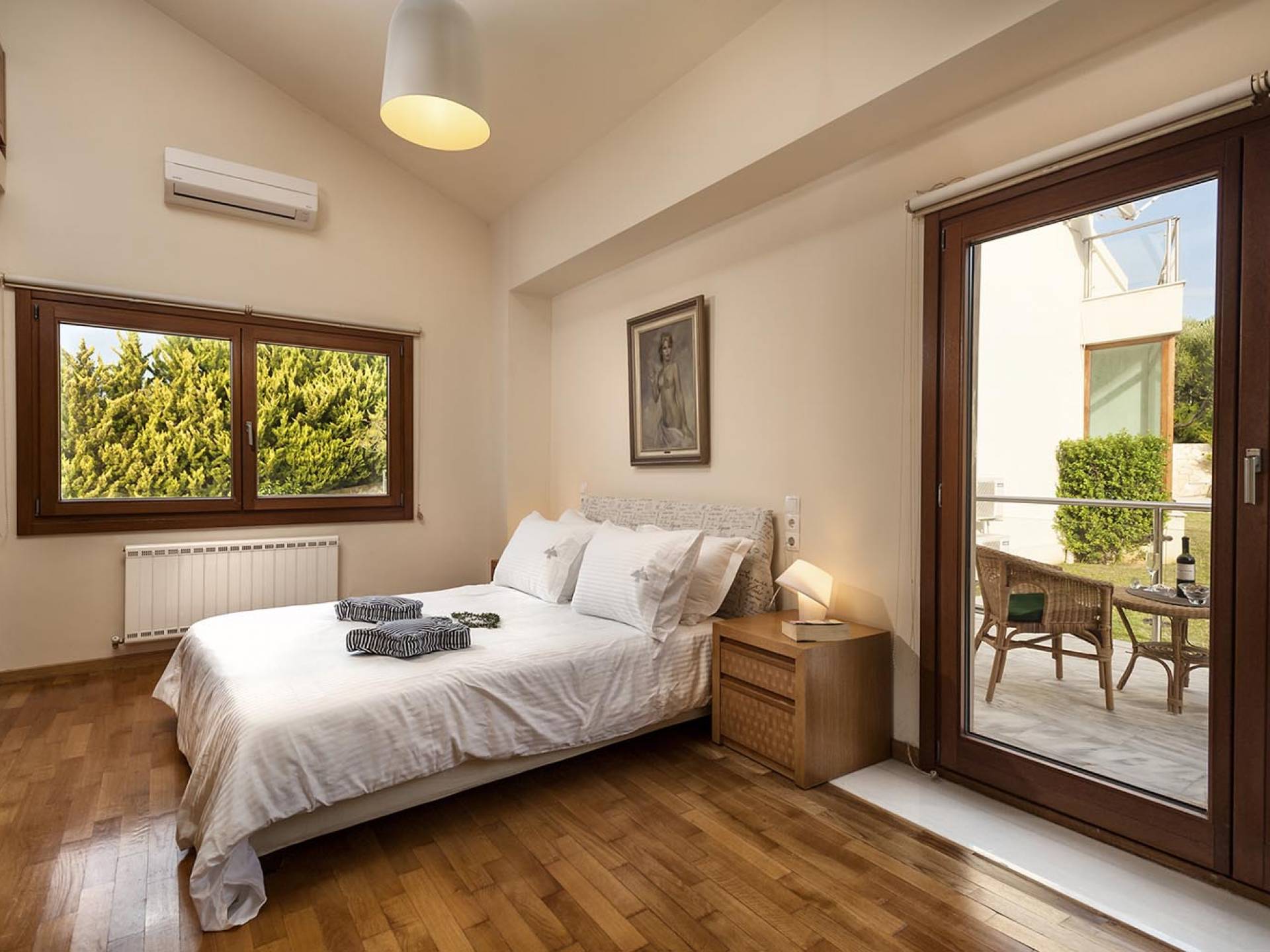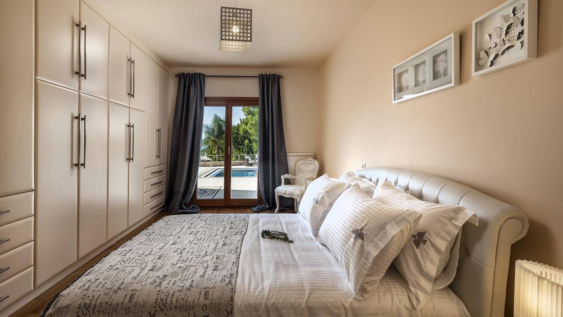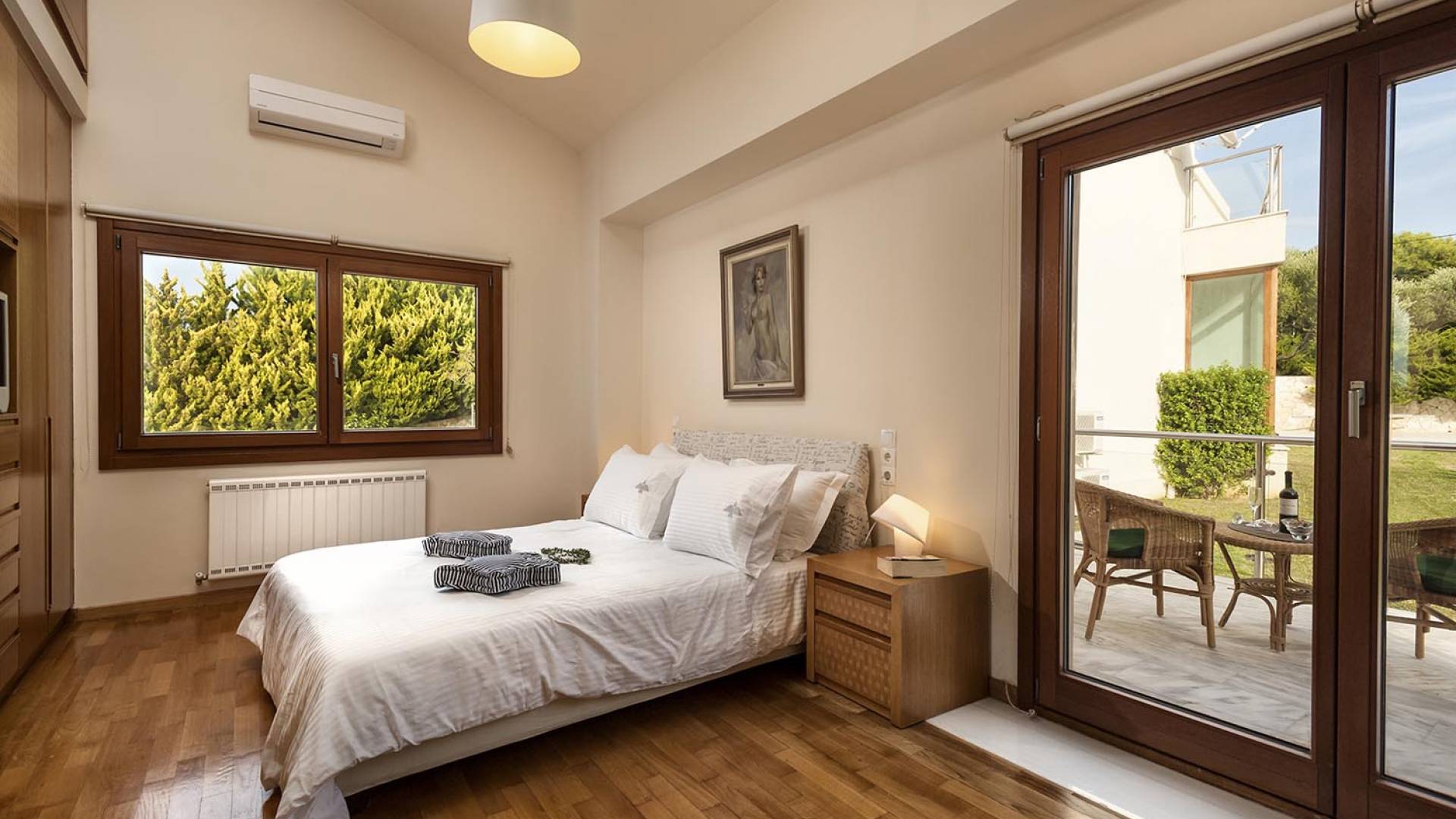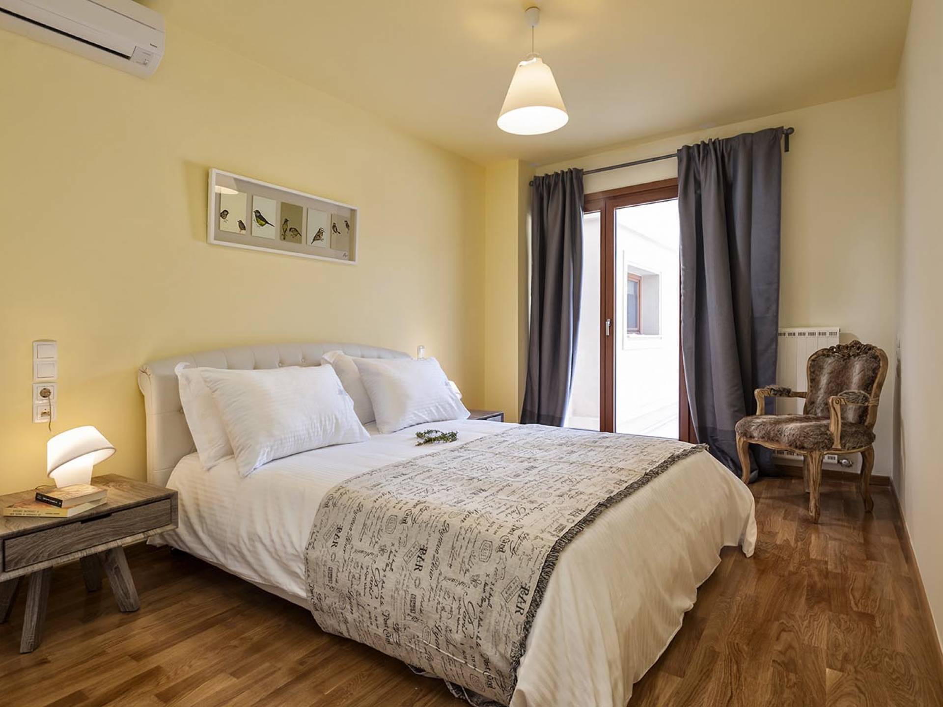 This is actually the center of the villa. The grand living area of 50m² in the exterior of the house welcomes you, through its large window panels, to wide verandas with a stunning view of the entire estate up to the Kalatha’ s bay. Designed with wooden floors, underfloor heating, and centrally air-conditioned, equipped with three couches, sitting up to 12 people, an LCD TV 50”, this living room will become your favorite point of gather with your family and friends. Of course, you cannot ignore the stylish modern fireplace.