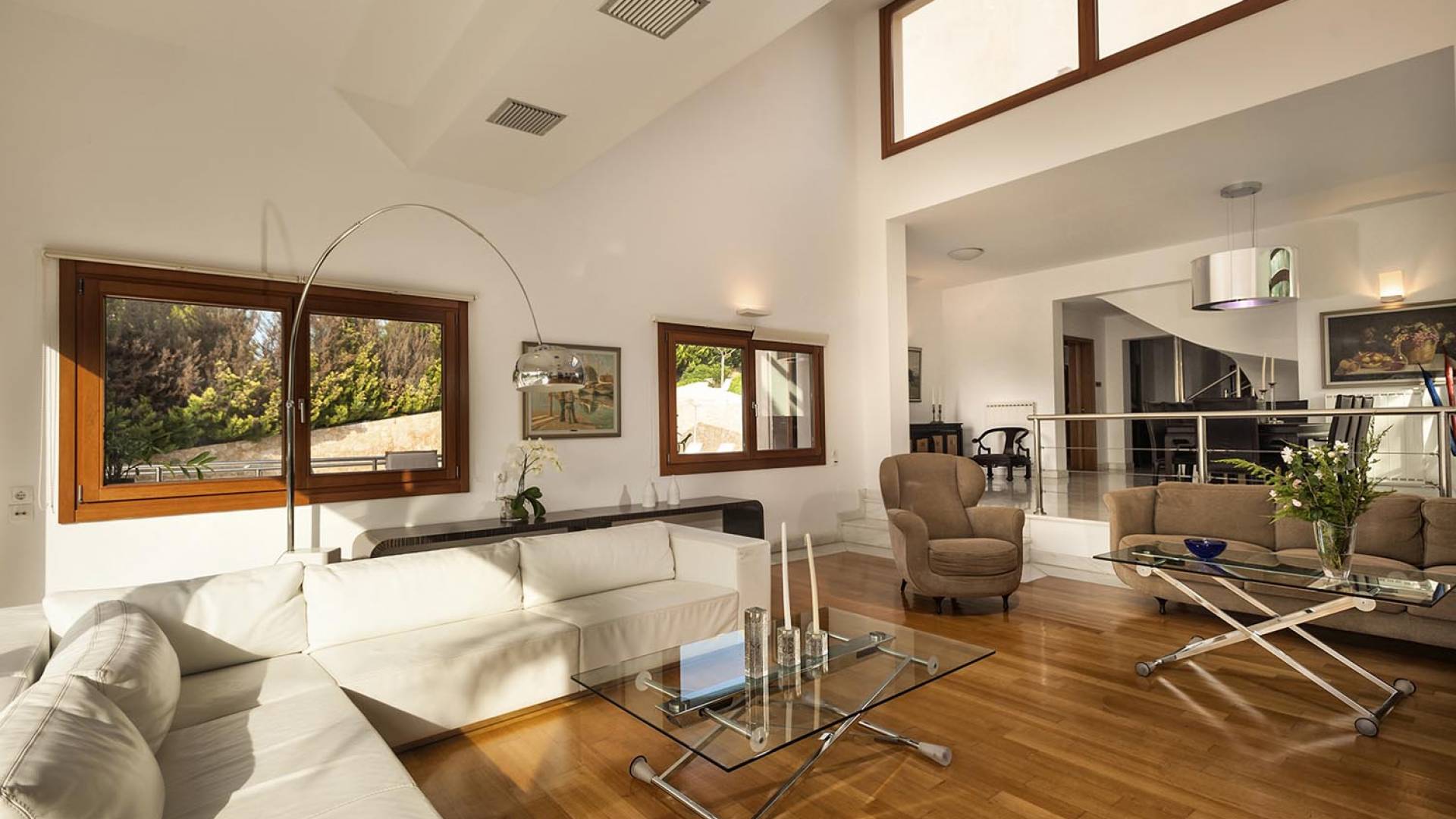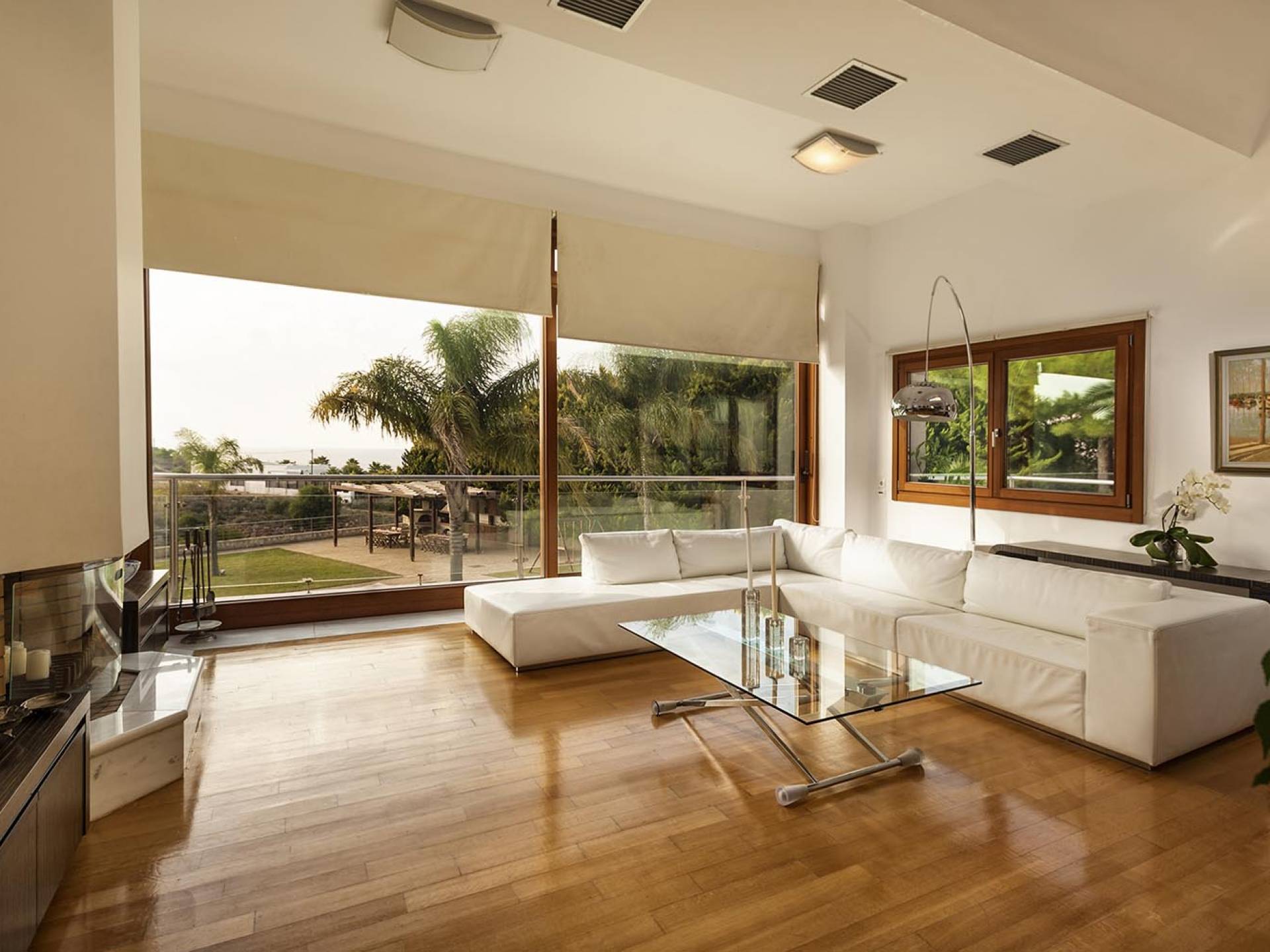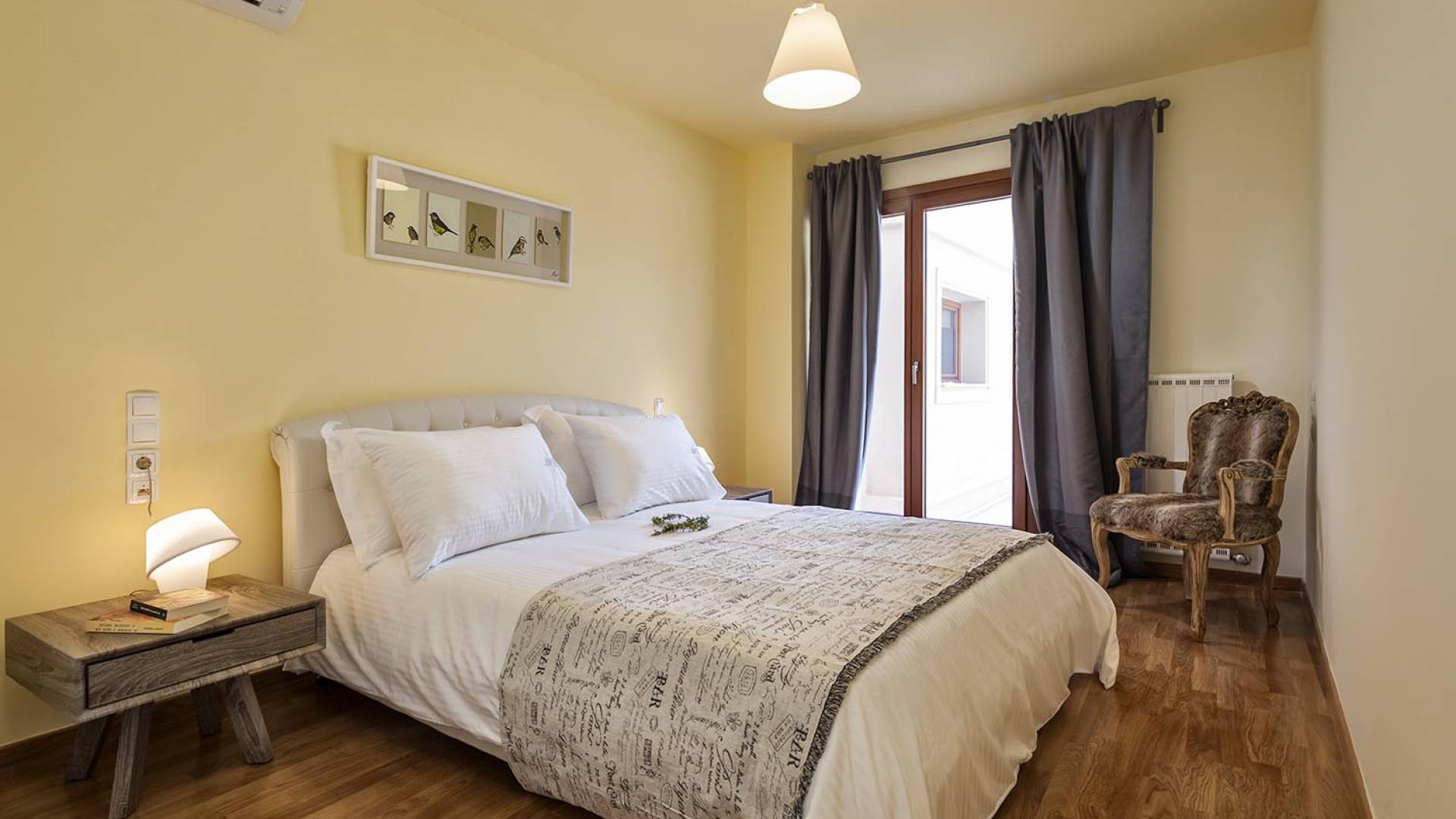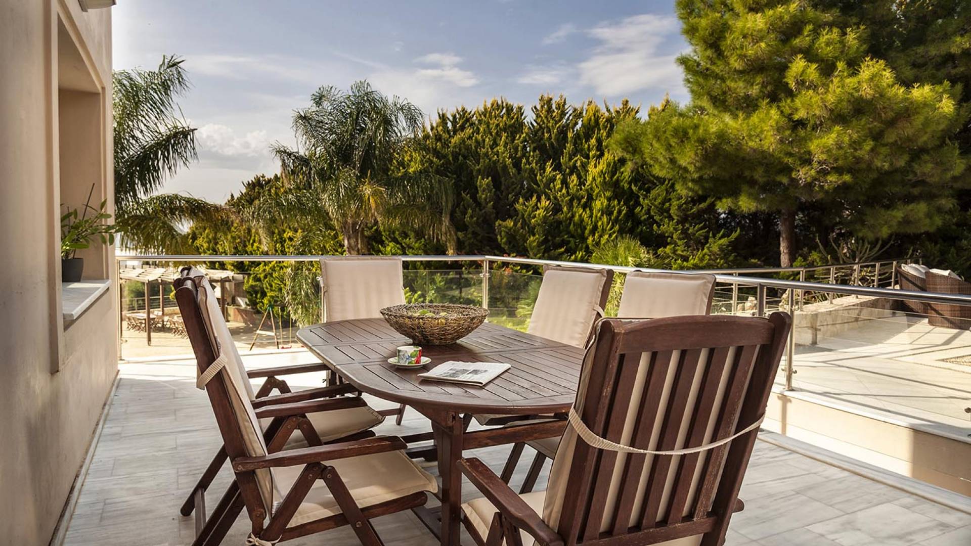 This is actually the center of the villa. The grand living area of 50m² in the exterior of the house welcomes you, through its large window panels, to wide verandas with a stunning view of the entire estate up to the Kalatha’ s bay. Designed with wooden floors, underfloor heating, and centrally air-conditioned, equipped with three couches, sitting up to 12 people, an LCD TV 50”, this living room will become your favorite point of gather with your family and friends. Of course, you cannot ignore the stylish modern fireplace.