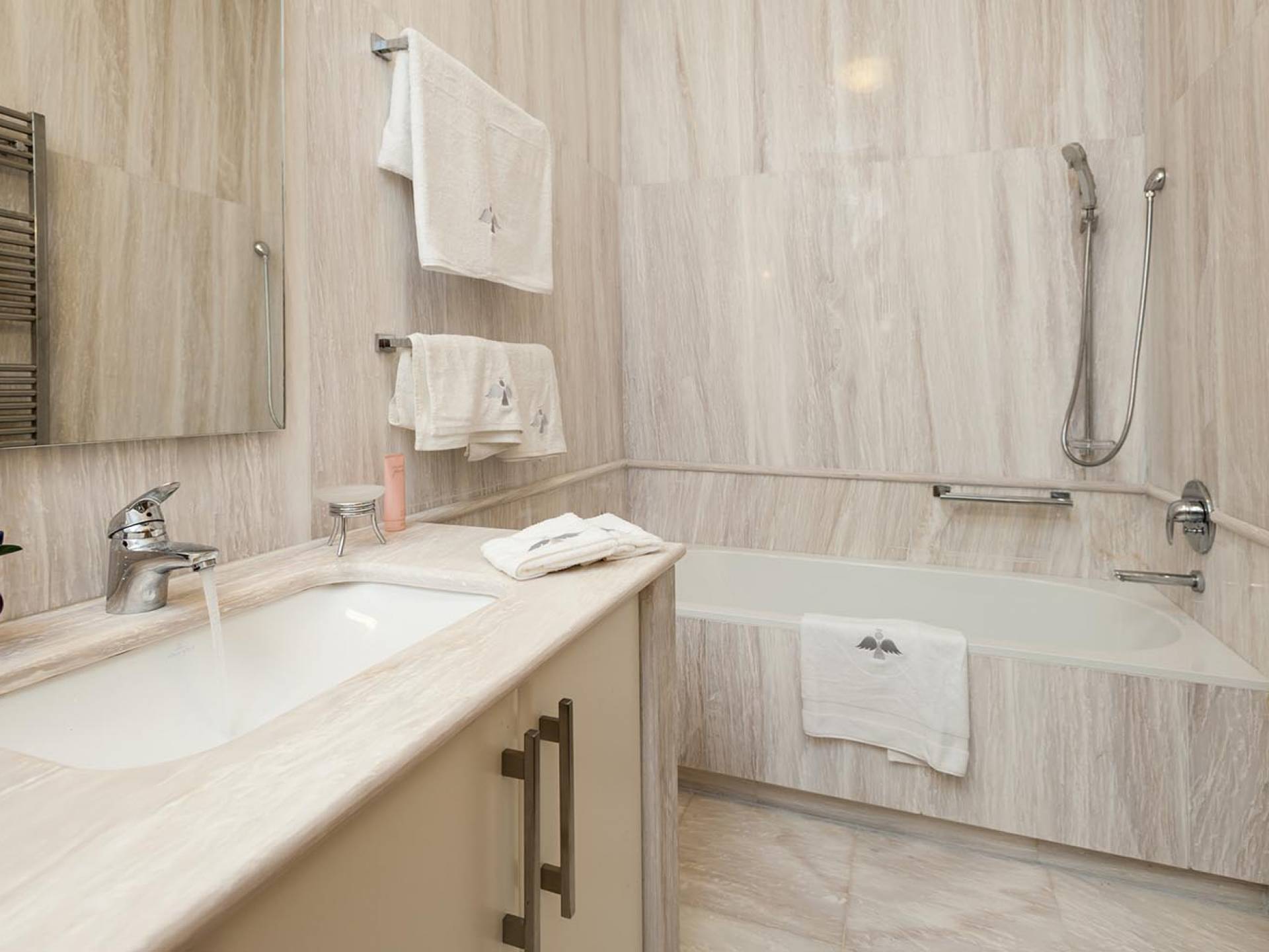 Two 30m² bedrooms with twin beds, nightstands, luggage tables, wooden floors, heating, and A/C. One gives you a garden view and the other a pool view. Two 18m² bedrooms with semi-double beds, nightstands, luggage tables, wooden floors, heating, and A/C. One has a garden view and the other a pool view. The other bedrooms are accommodated by two shared 4m² marble bathrooms, with showers, quality sanitary appliances, and accessories. These levels finally include two comfortable 25m² sitting rooms, furnished with 2 double sofas each, a 32’’ TV, bookcase and an architectural course anglaise.