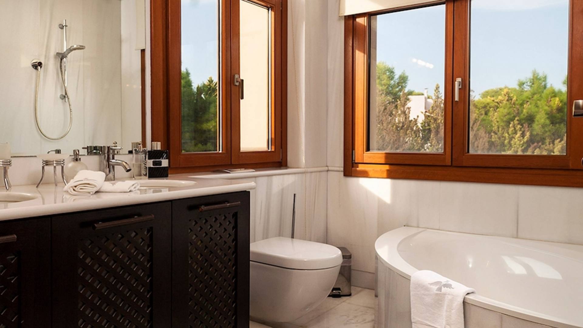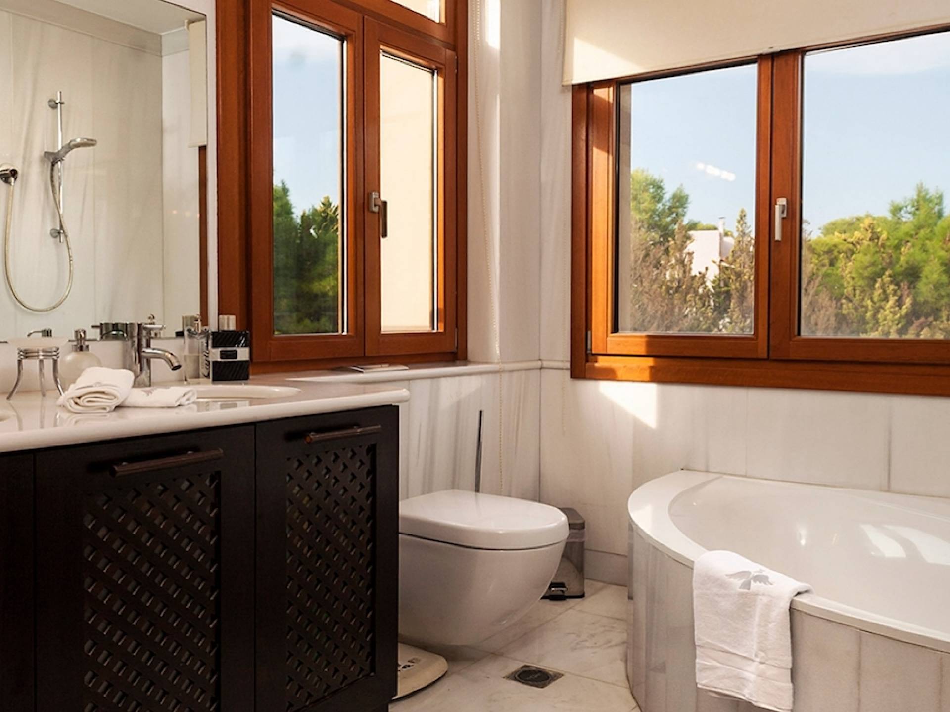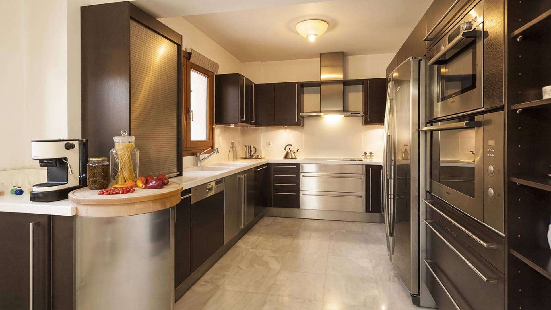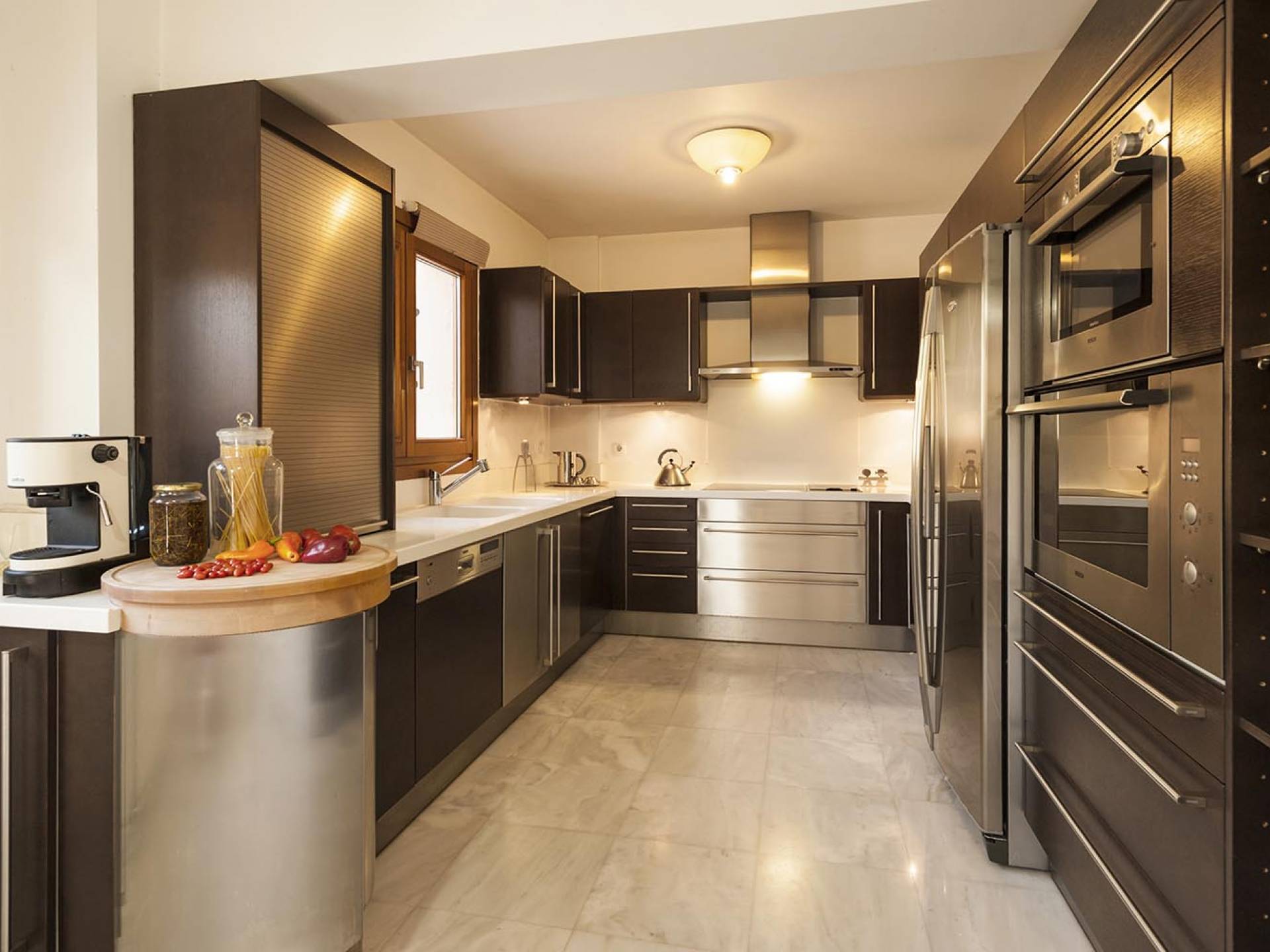 The central dining table can host up to 8 guests in a space of 30m², overlooking the living area. Luxury here is obvious in every detail. The solid wood table, the leather chairs, the designer’s suspending light, and the original remarkable paintings are some of the features and unique items that decorate the dining room. Miracle Villa Chania has a 45m² kitchen, is contemporary and fully equipped, and all the appliances are stainless of famous brands. It also offers an up to 6 people dining space, perfect for your family meals. On this level, the villa also contains a marble guest bathroom of 4m², equipped with contemporary sanitary devices and accessories.