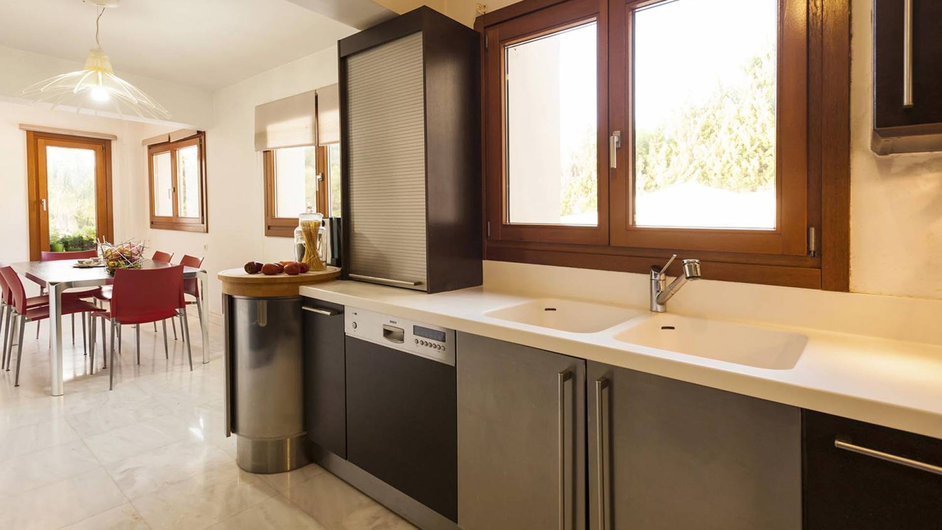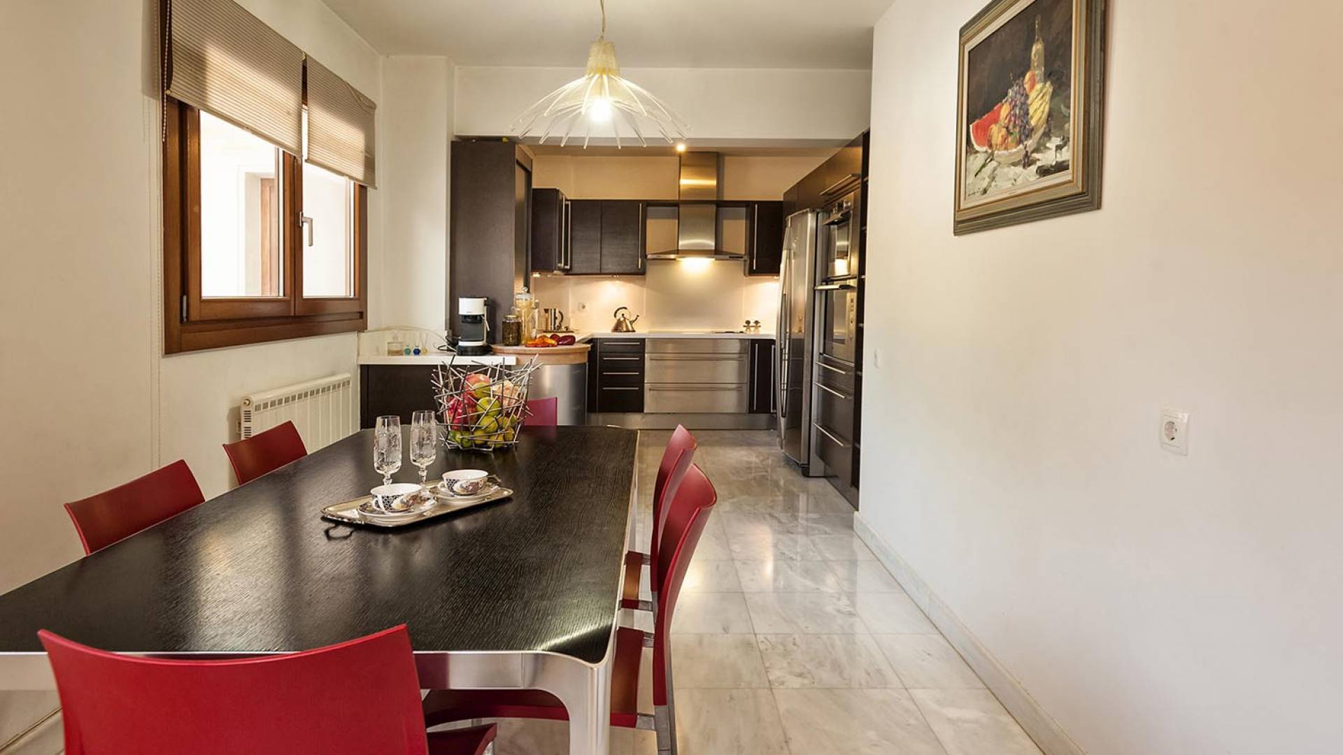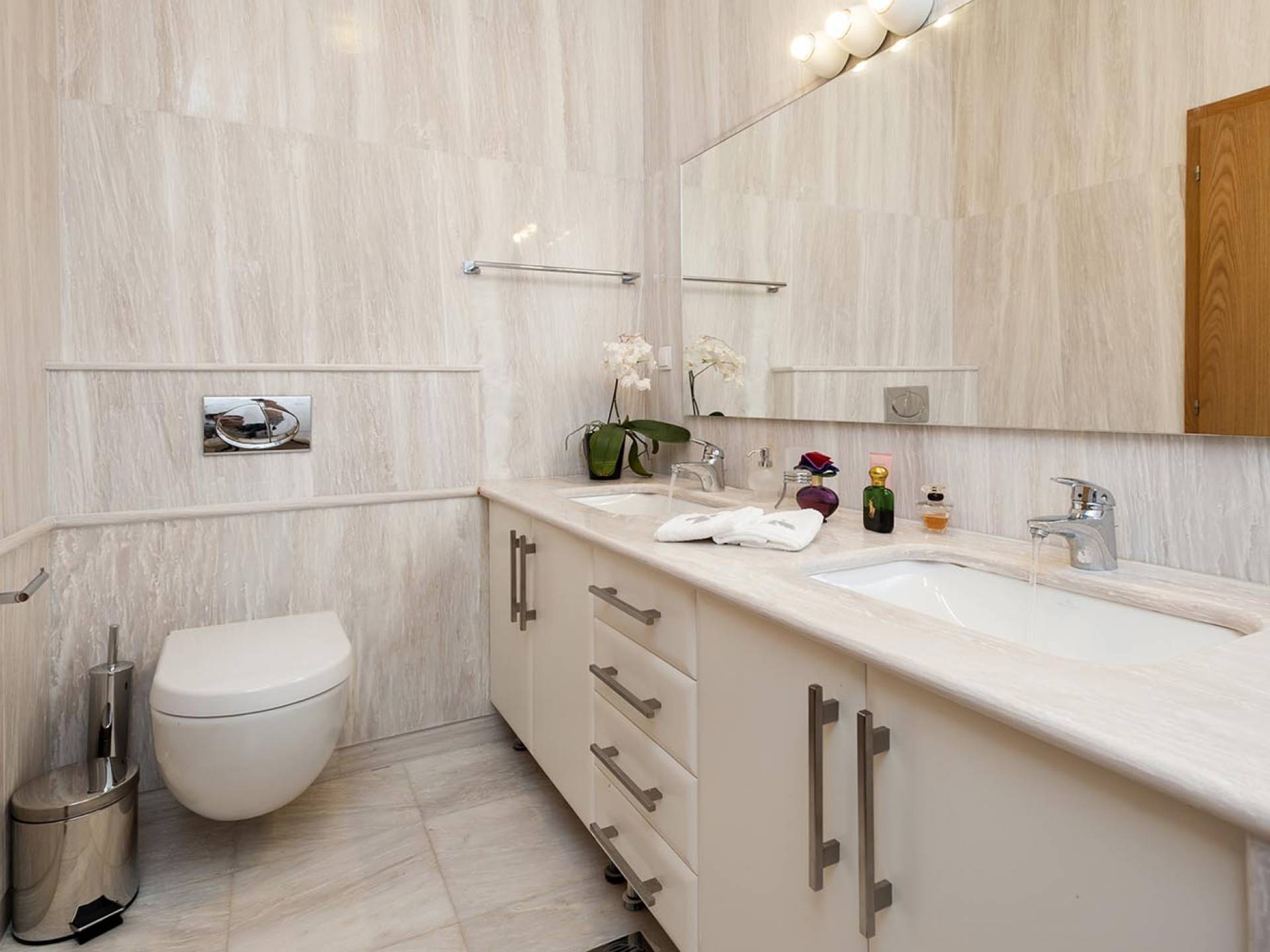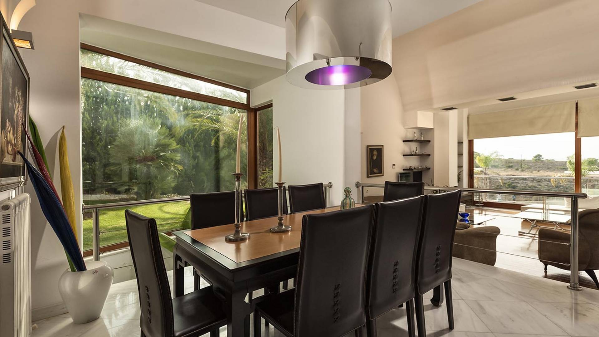 The central dining table can host up to 8 guests in a space of 30m², overlooking the living area. Luxury here is obvious in every detail. The solid wood table, the leather chairs, the designer’s suspending light, and the original remarkable paintings are some of the features and unique items that decorate the dining room. Miracle Villa Chania has a 45m² kitchen, is contemporary and fully equipped, and all the appliances are stainless of famous brands. It also offers an up to 6 people dining space, perfect for your family meals. On this level, the villa also contains a marble guest bathroom of 4m², equipped with contemporary sanitary devices and accessories.