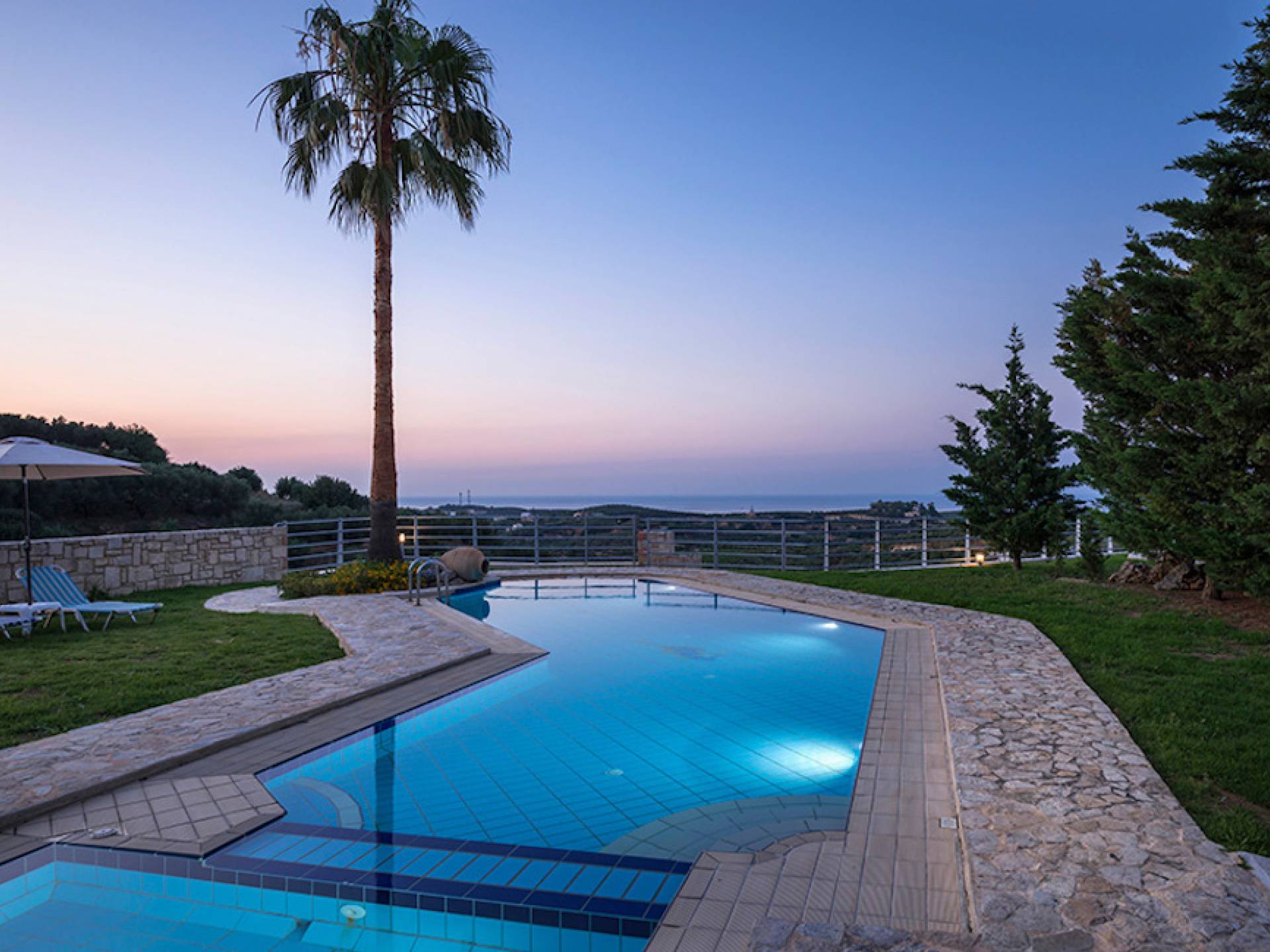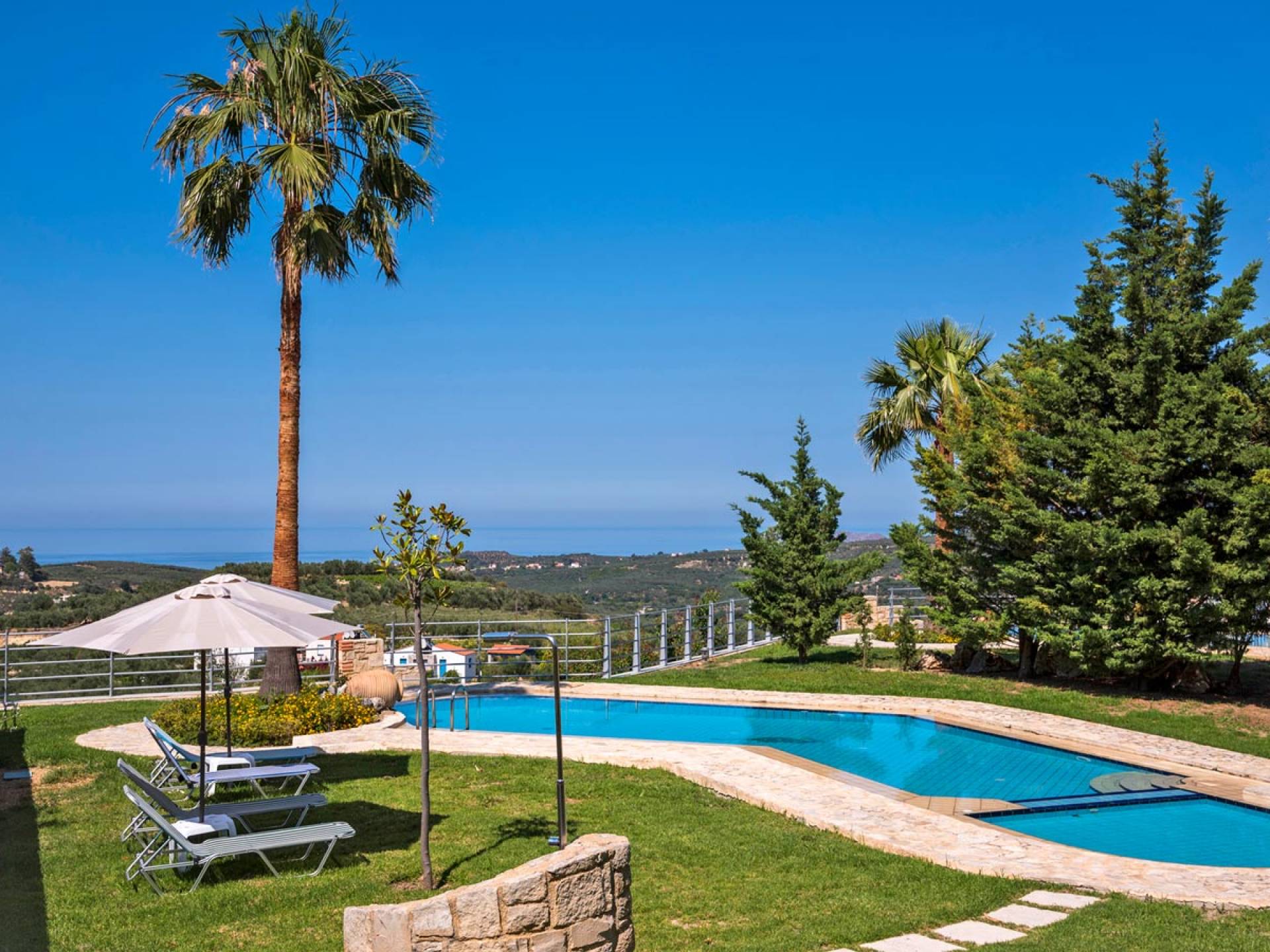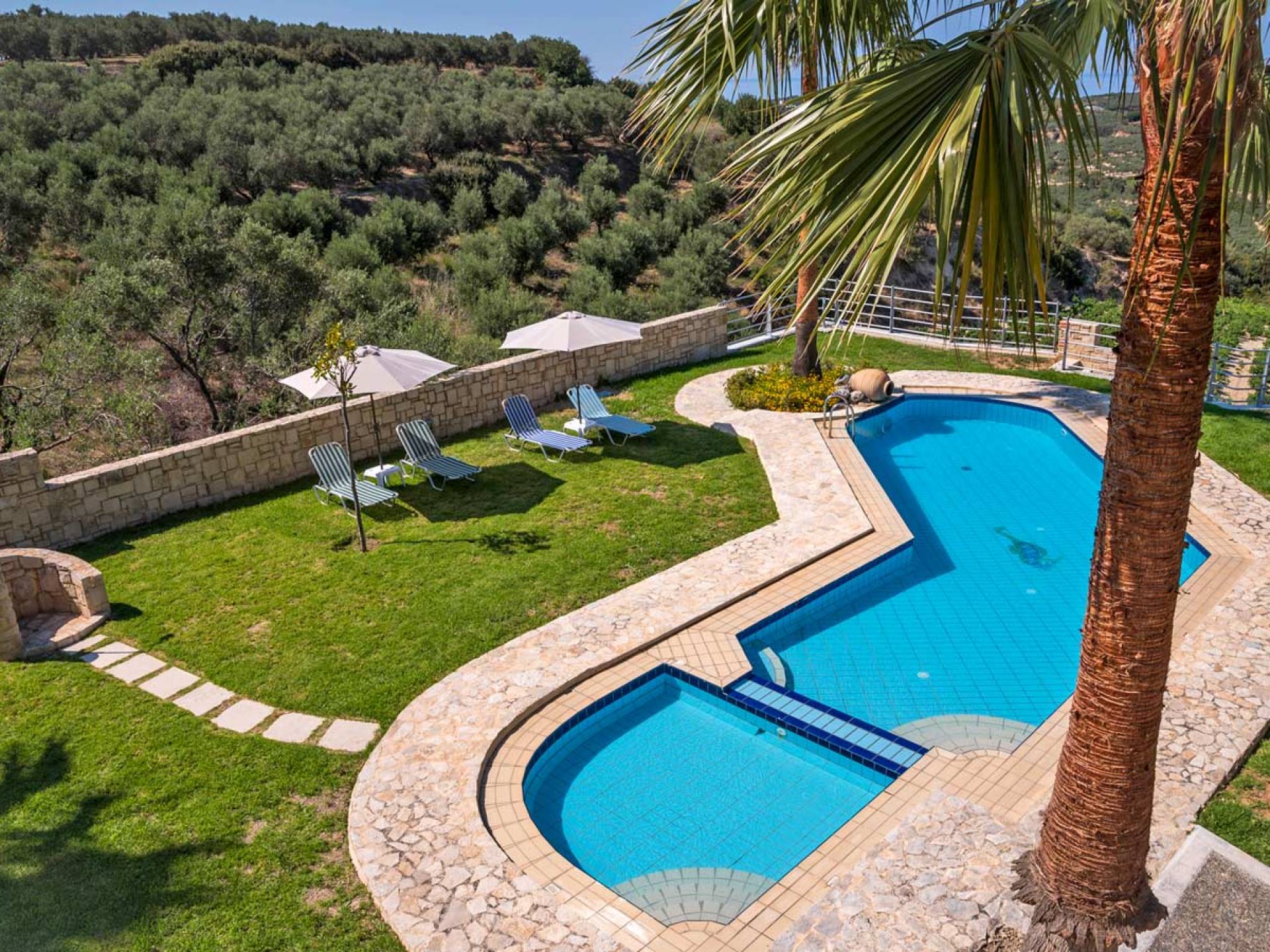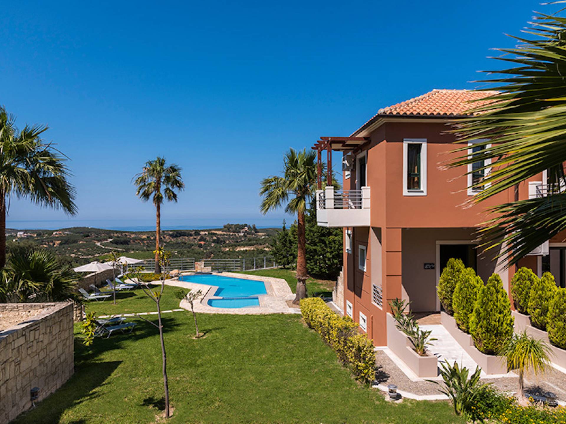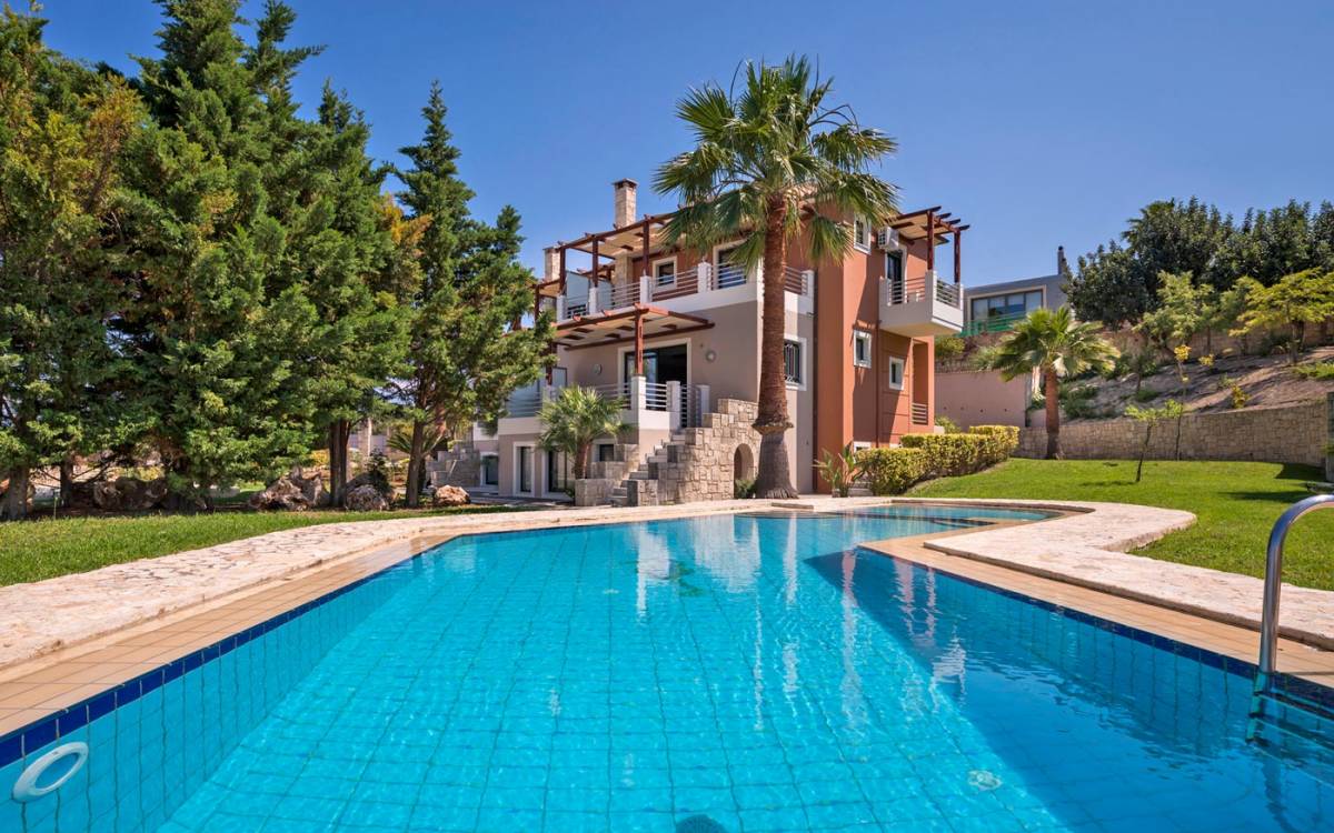 Secluded villa with garden, pool, 3 bedrooms, 2 bathrooms, sleeps up to 7. Myrtia Villa Chania, is a luxurious maisonette of 110 m² built amongst huge lavish gardens offering great sea view and services in absolute privacy.