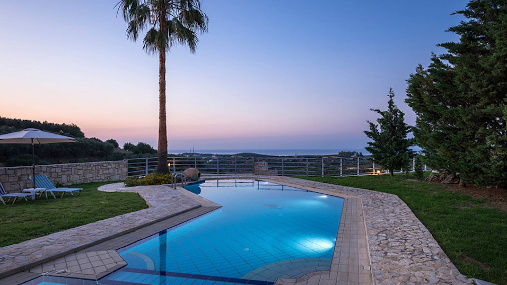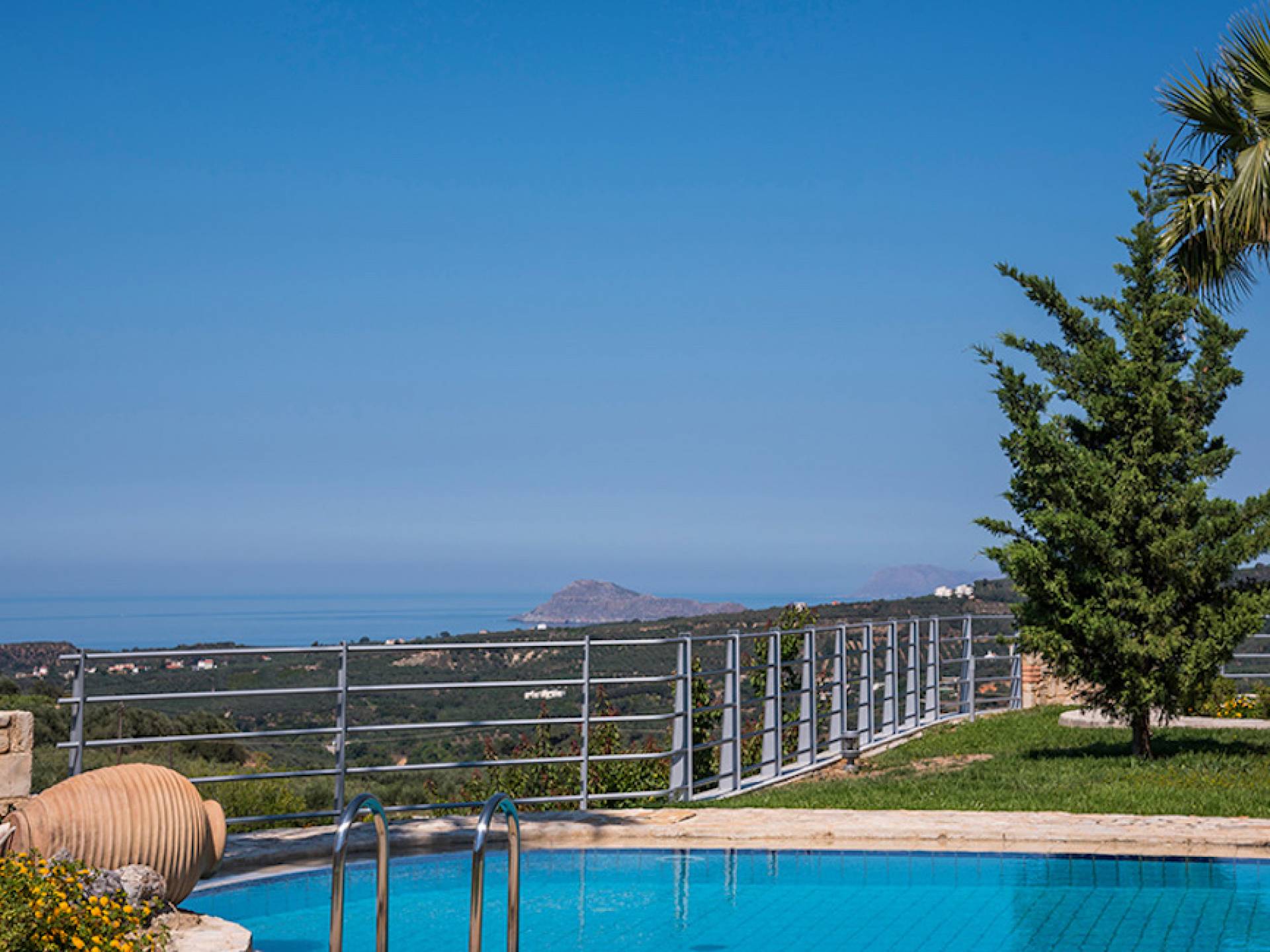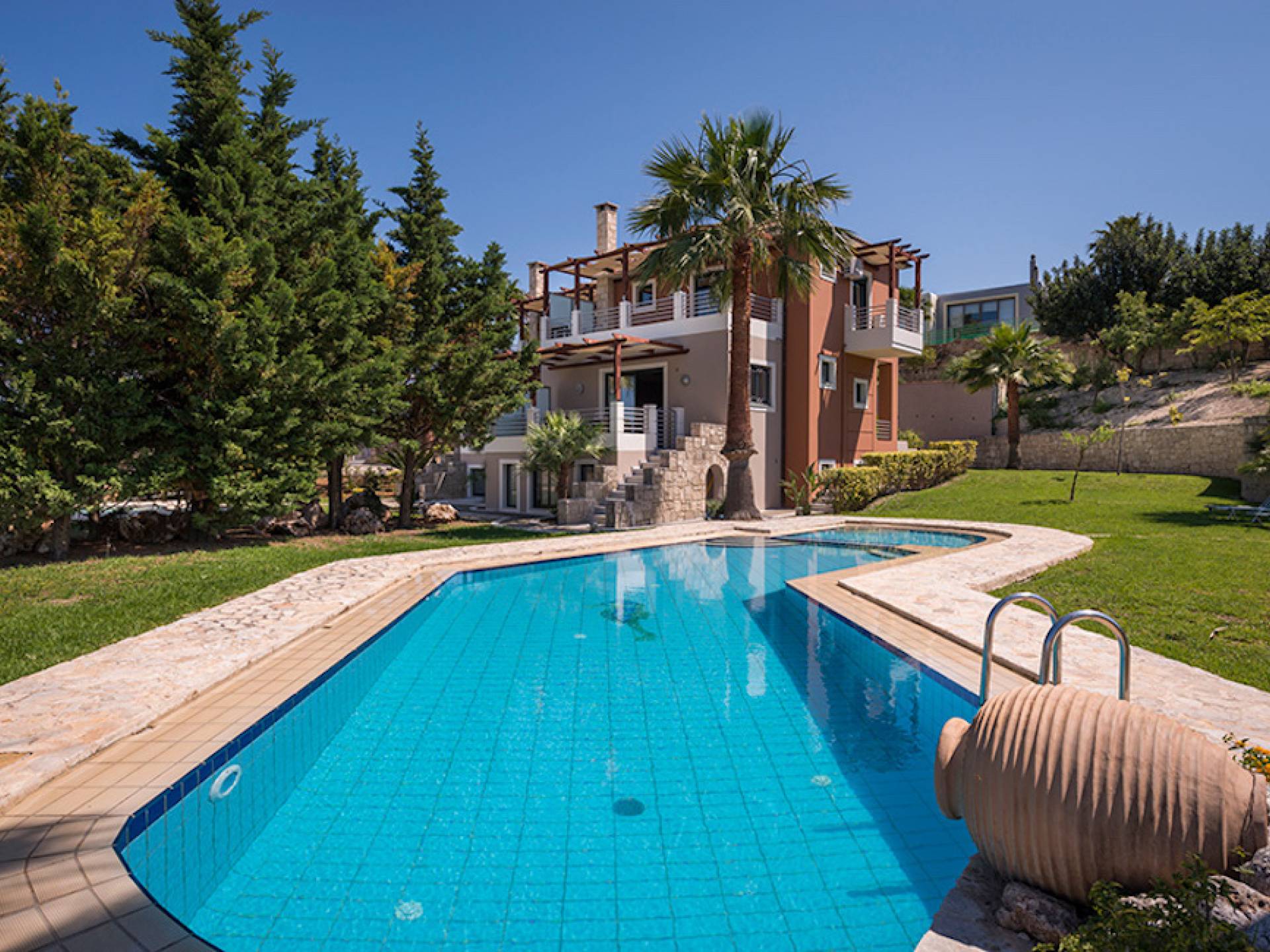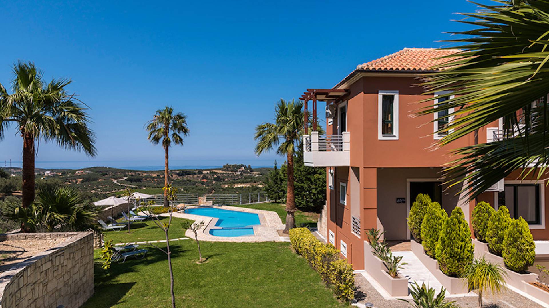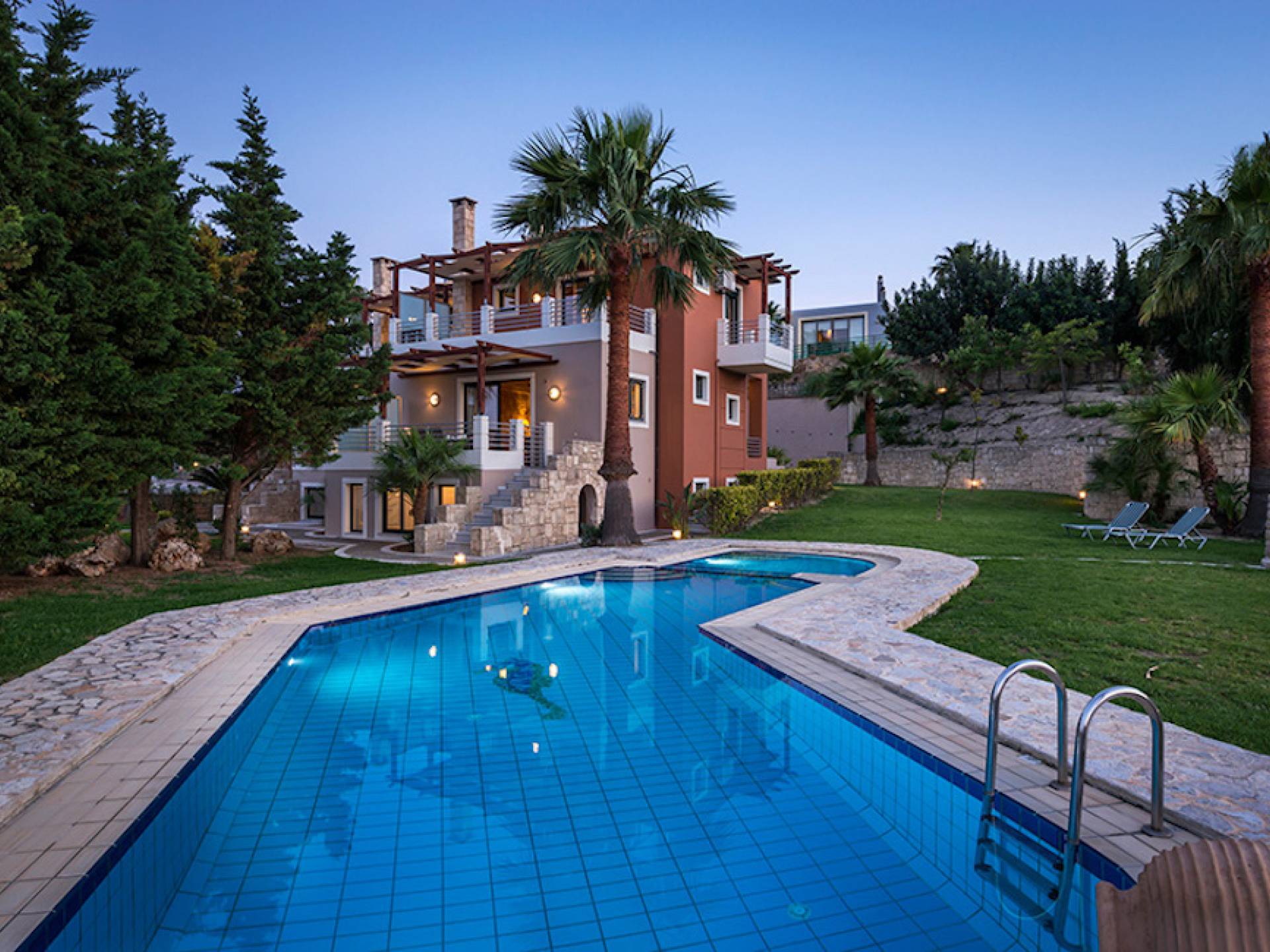 Secluded villa with garden, pool, 3 bedrooms, 2 bathrooms, sleeps up to 7. Myrtia Villa Chania, is a luxurious maisonette of 110 m² built amongst huge lavish gardens offering great sea view and services in absolute privacy.