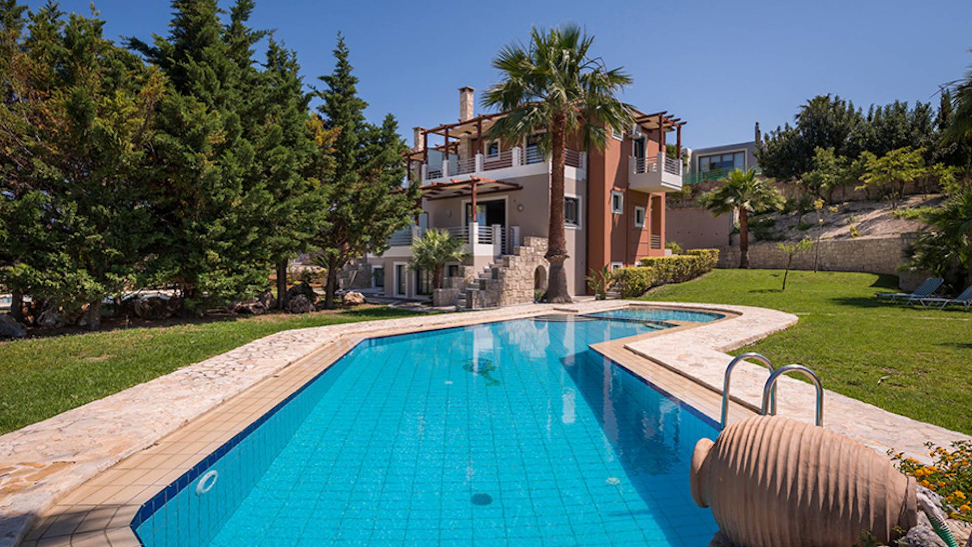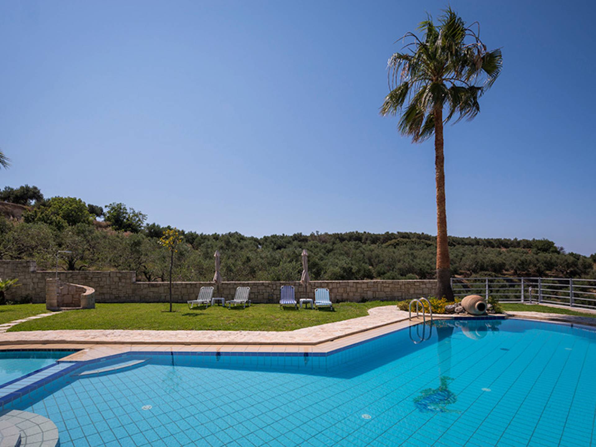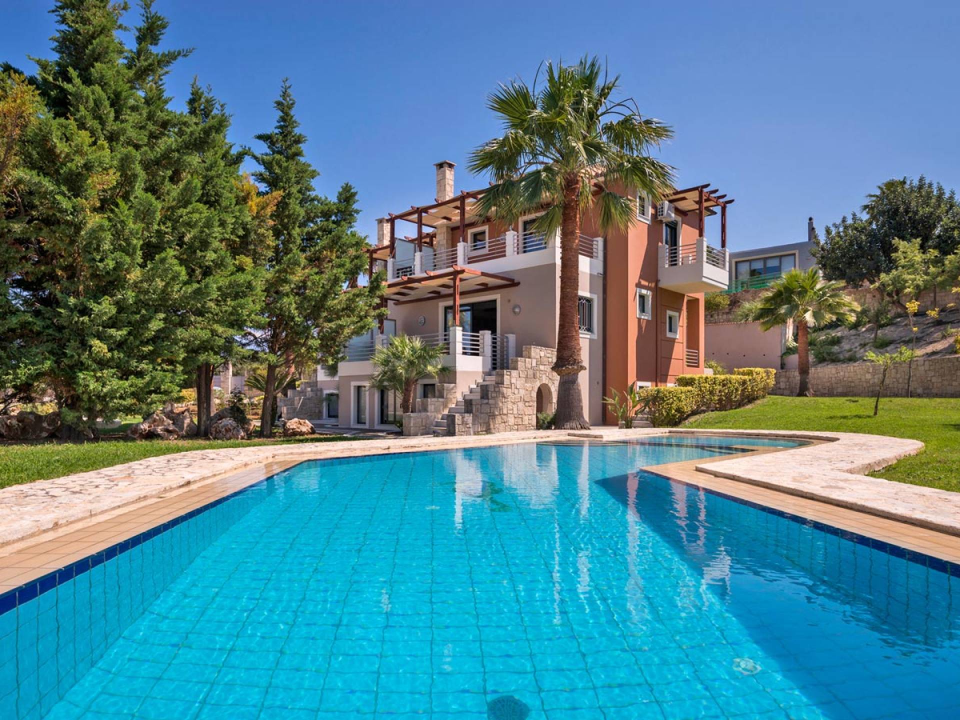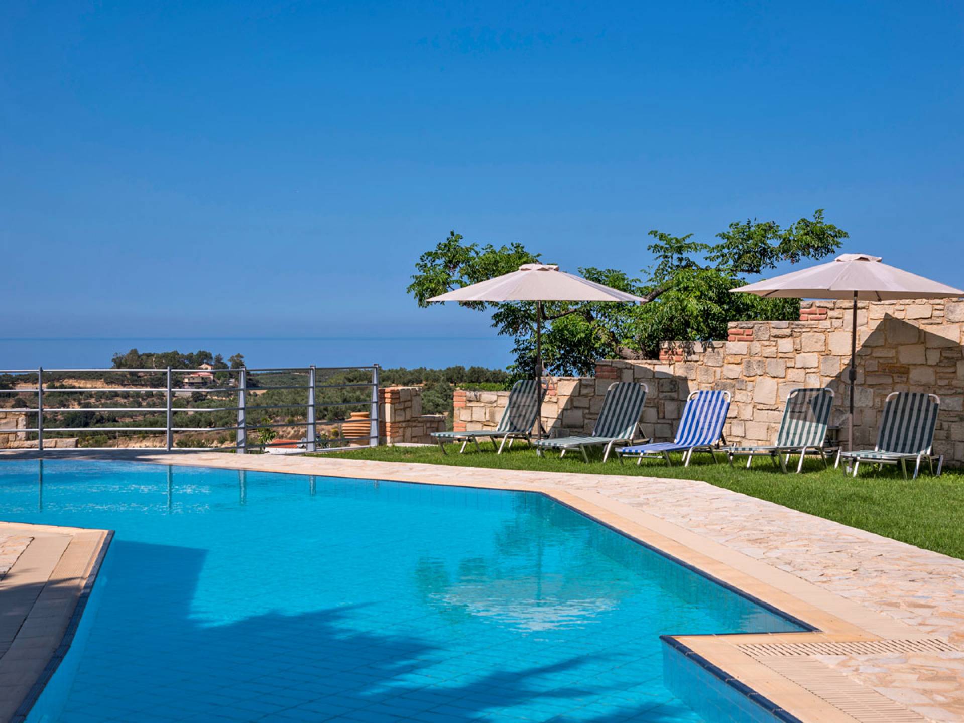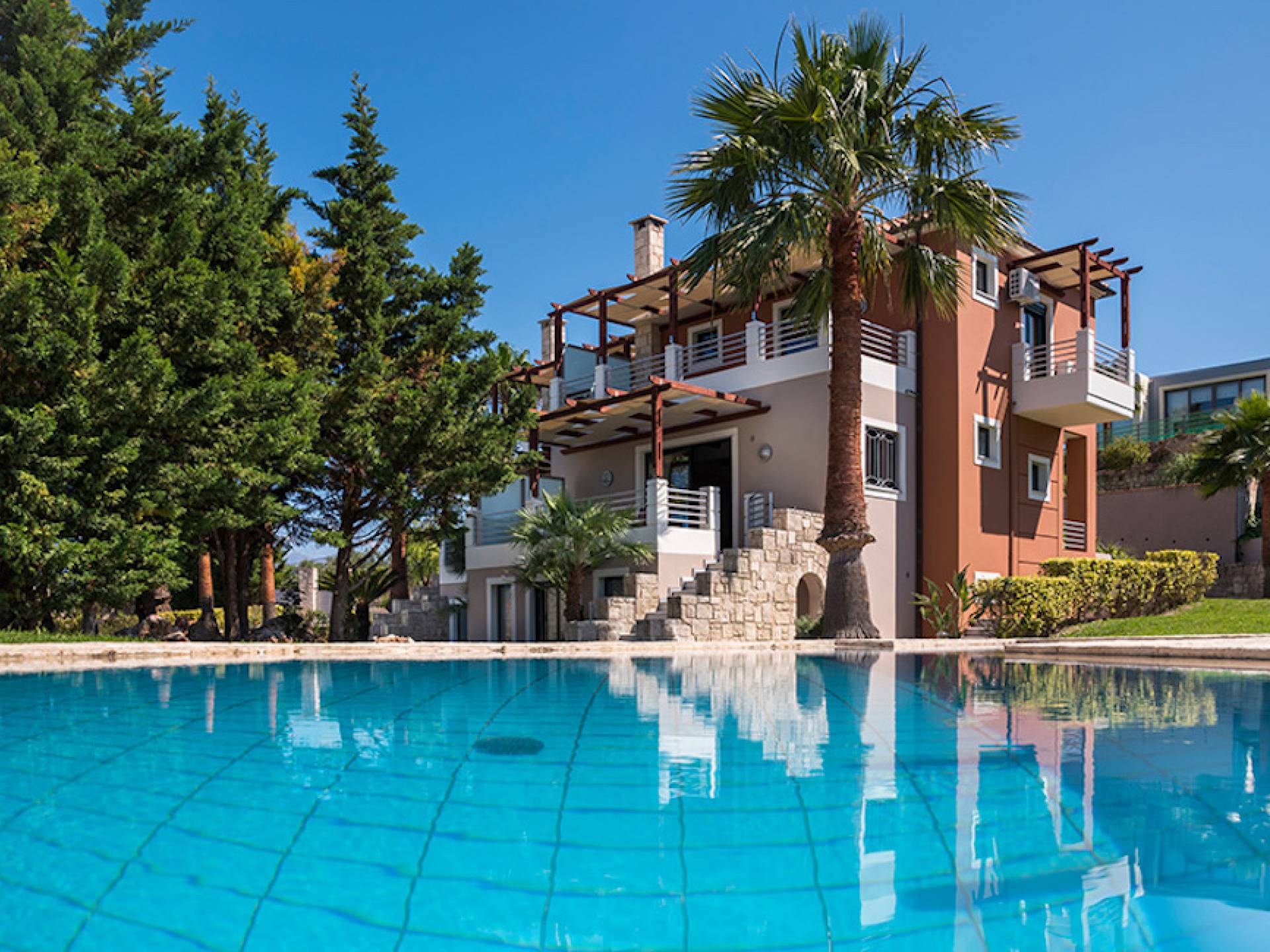 Secluded villa with garden, pool, 3 bedrooms, 2 bathrooms, sleeps up to 7. Myrtia Villa Chania, is a luxurious maisonette of 110 m² built amongst huge lavish gardens offering great sea view and services in absolute privacy.