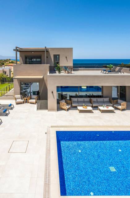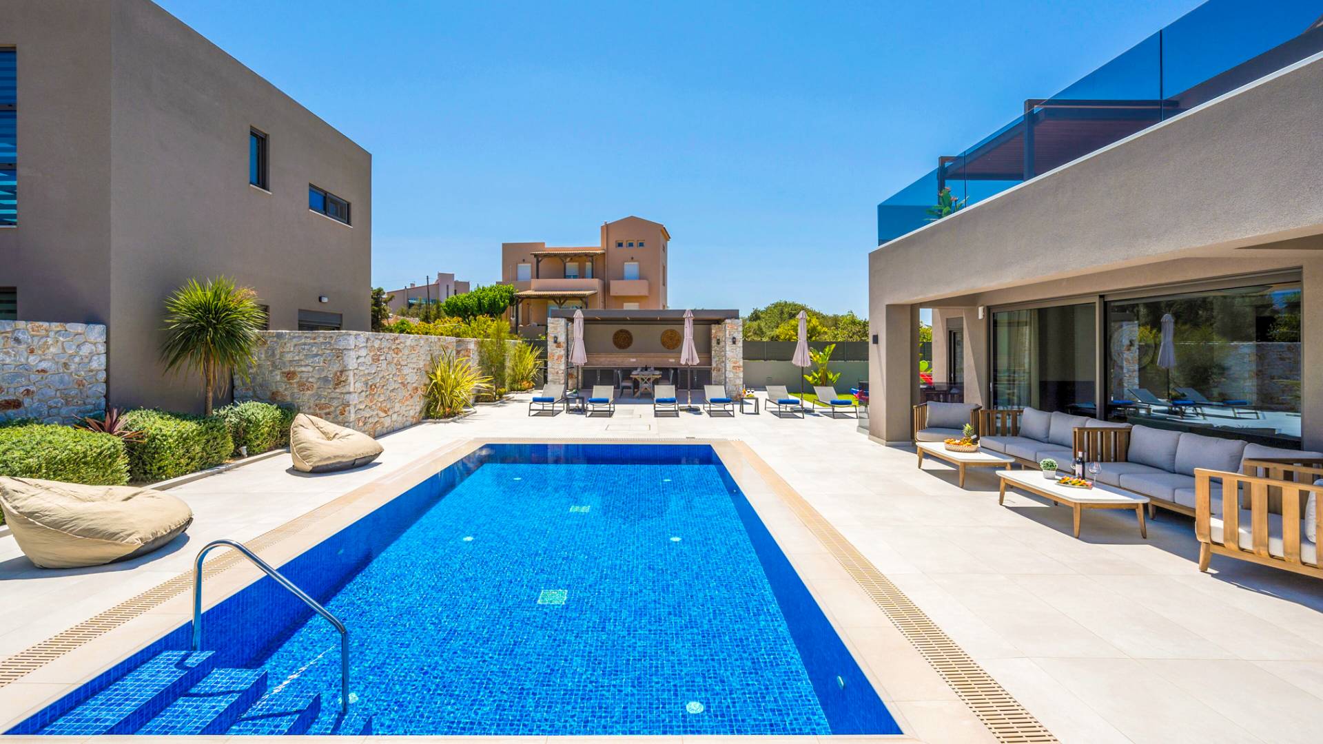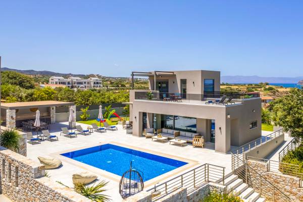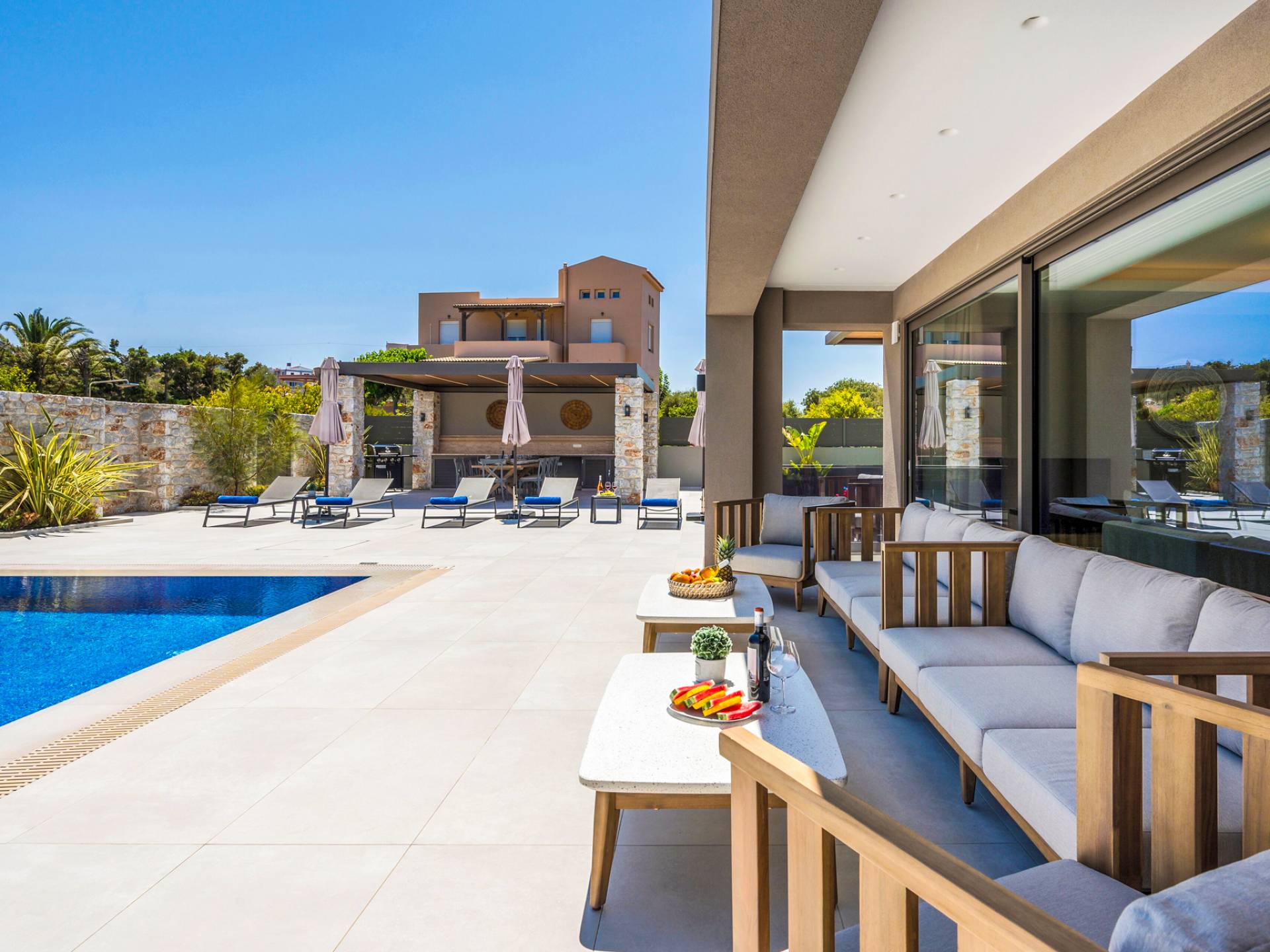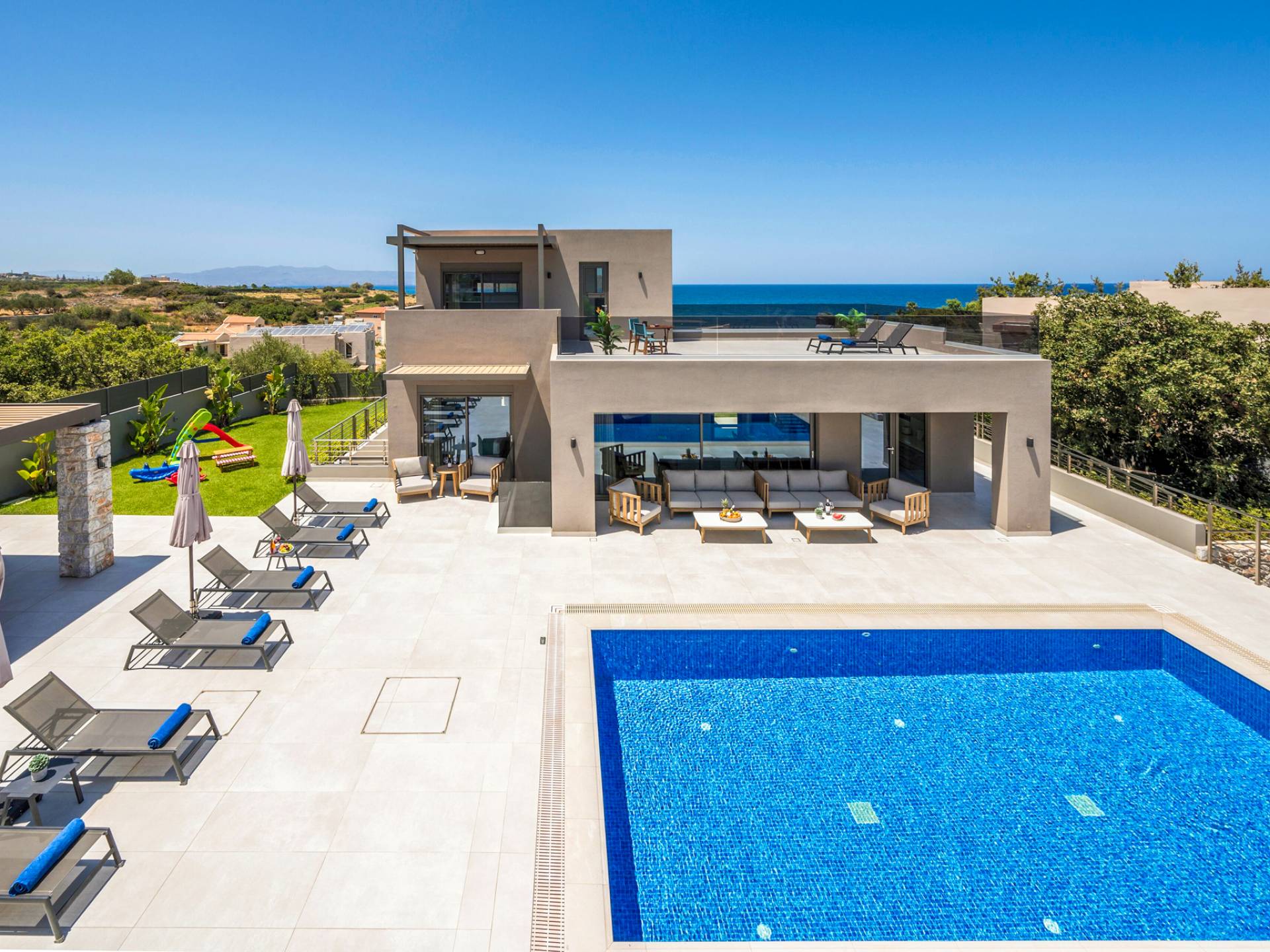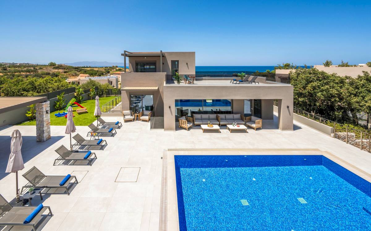 Neos Retreat 2 Chania Crete - Luxury villa with heated pool, jacuzzi, sauna, gym & 5 bedrooms. Just 300m from the beach and minutes from Chania Old Town. Perfect for families & groups.