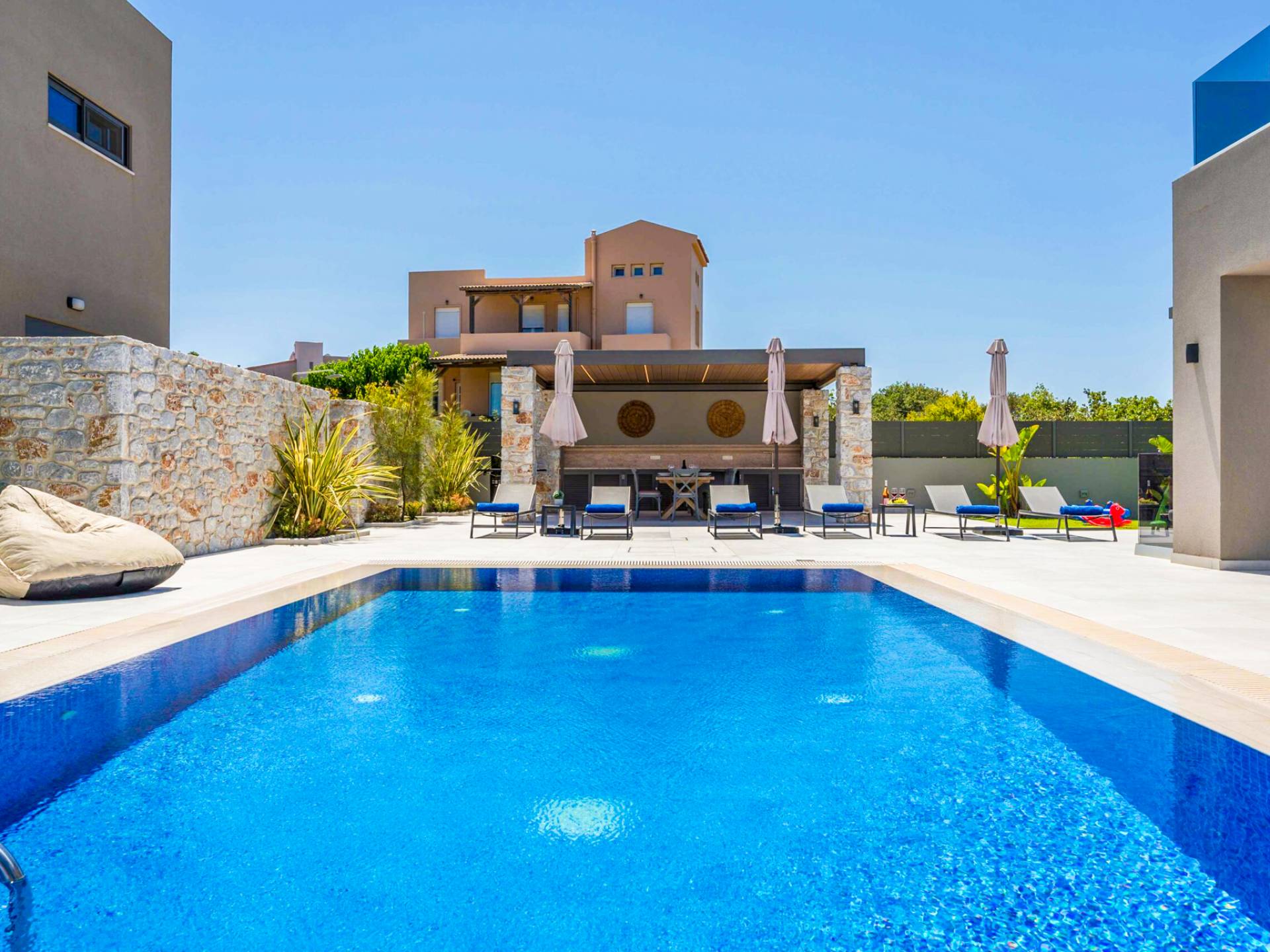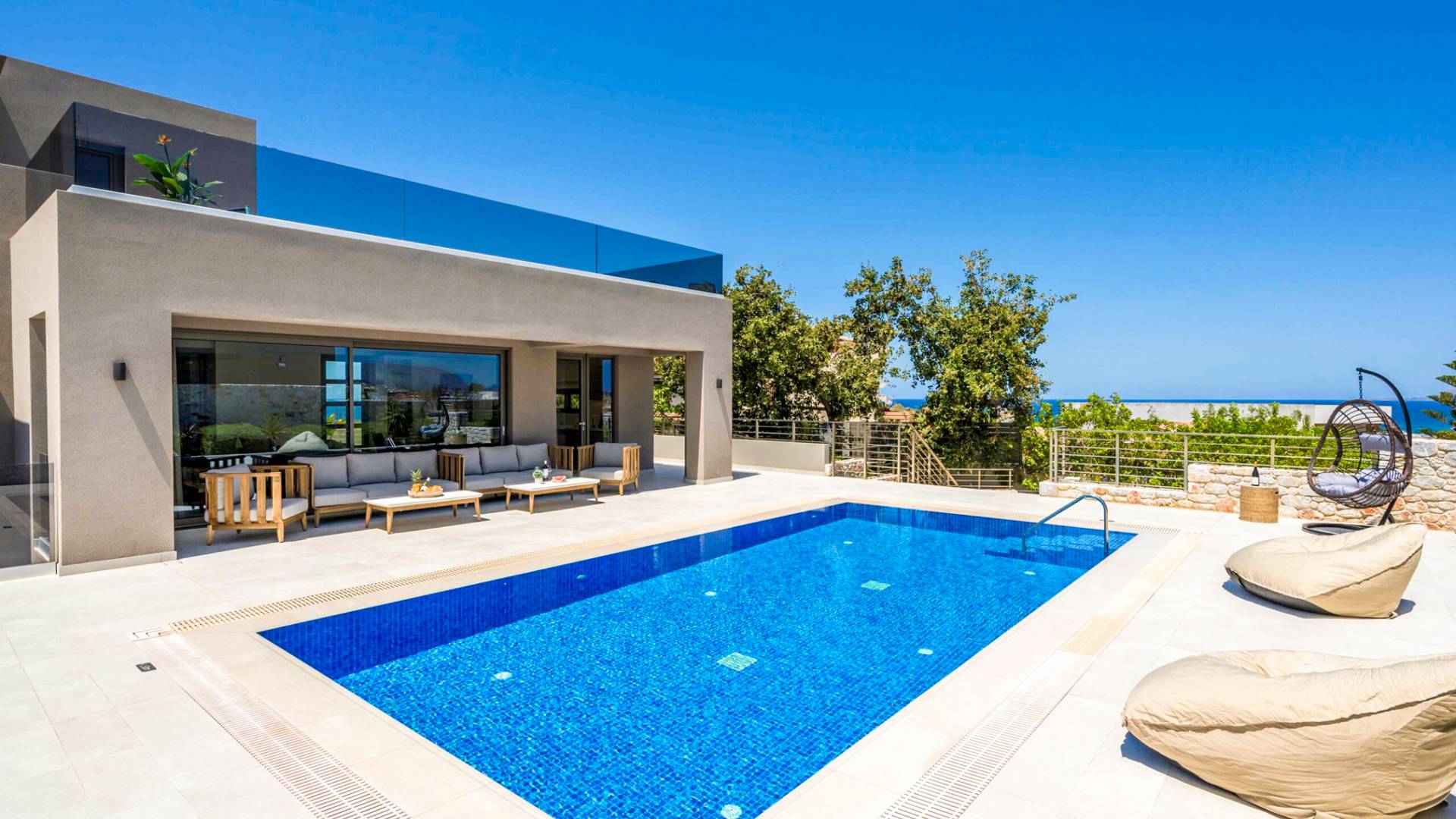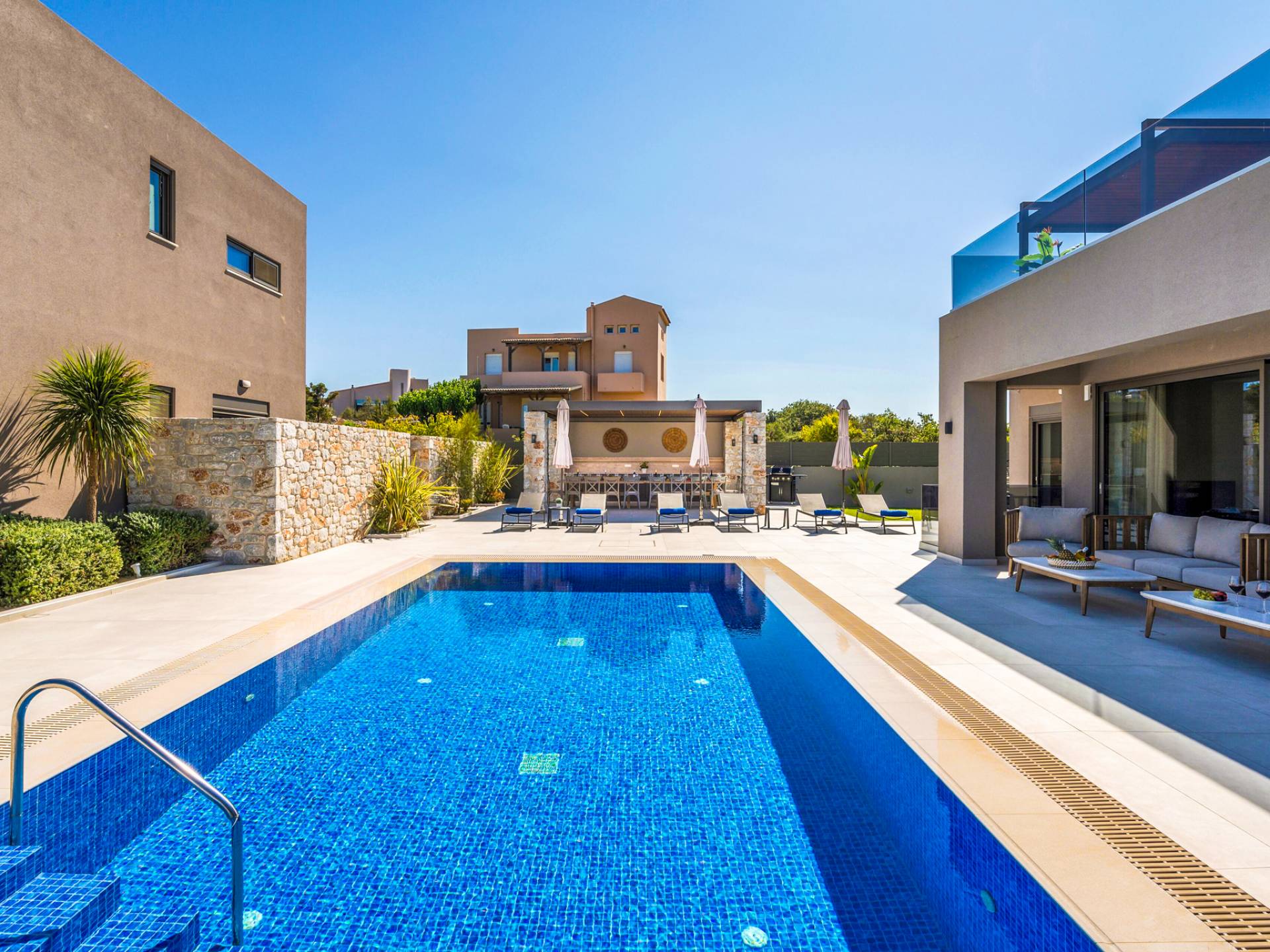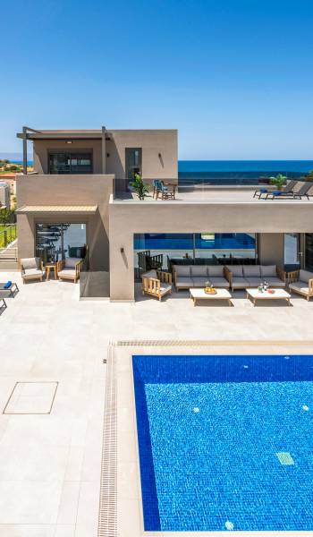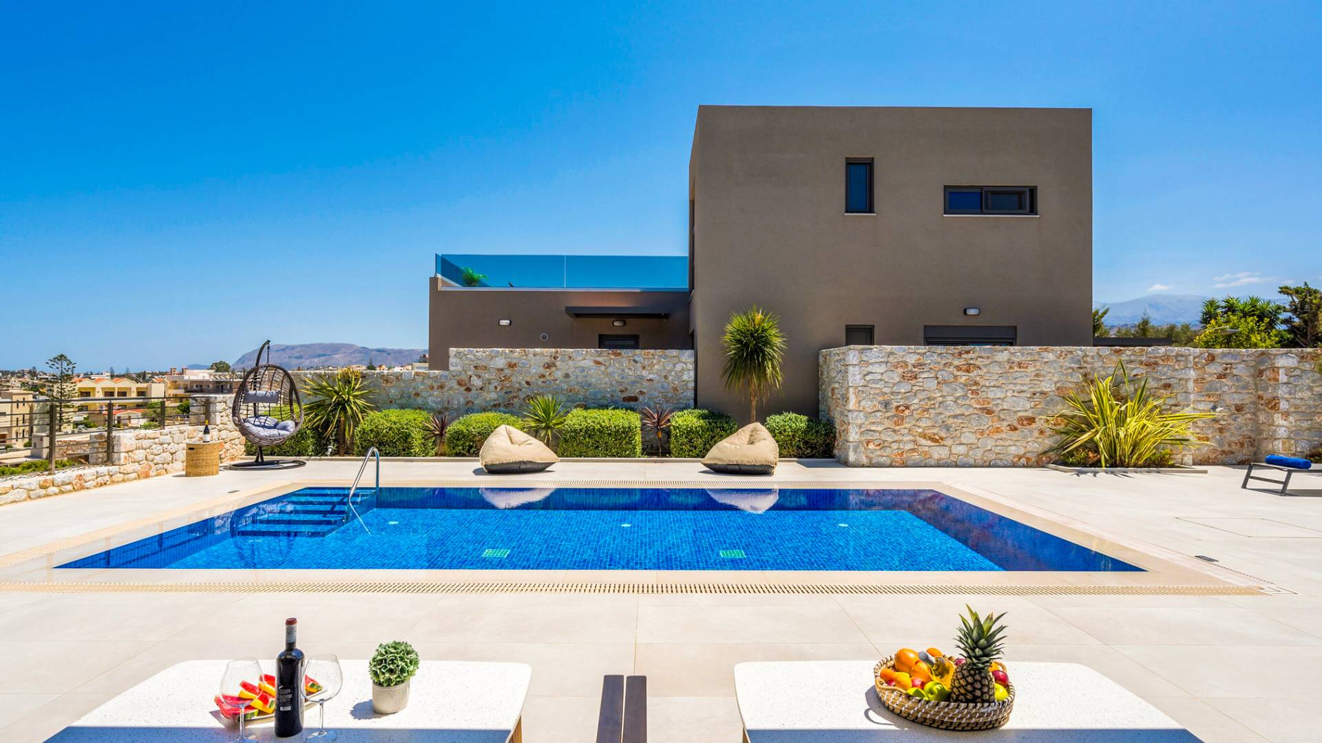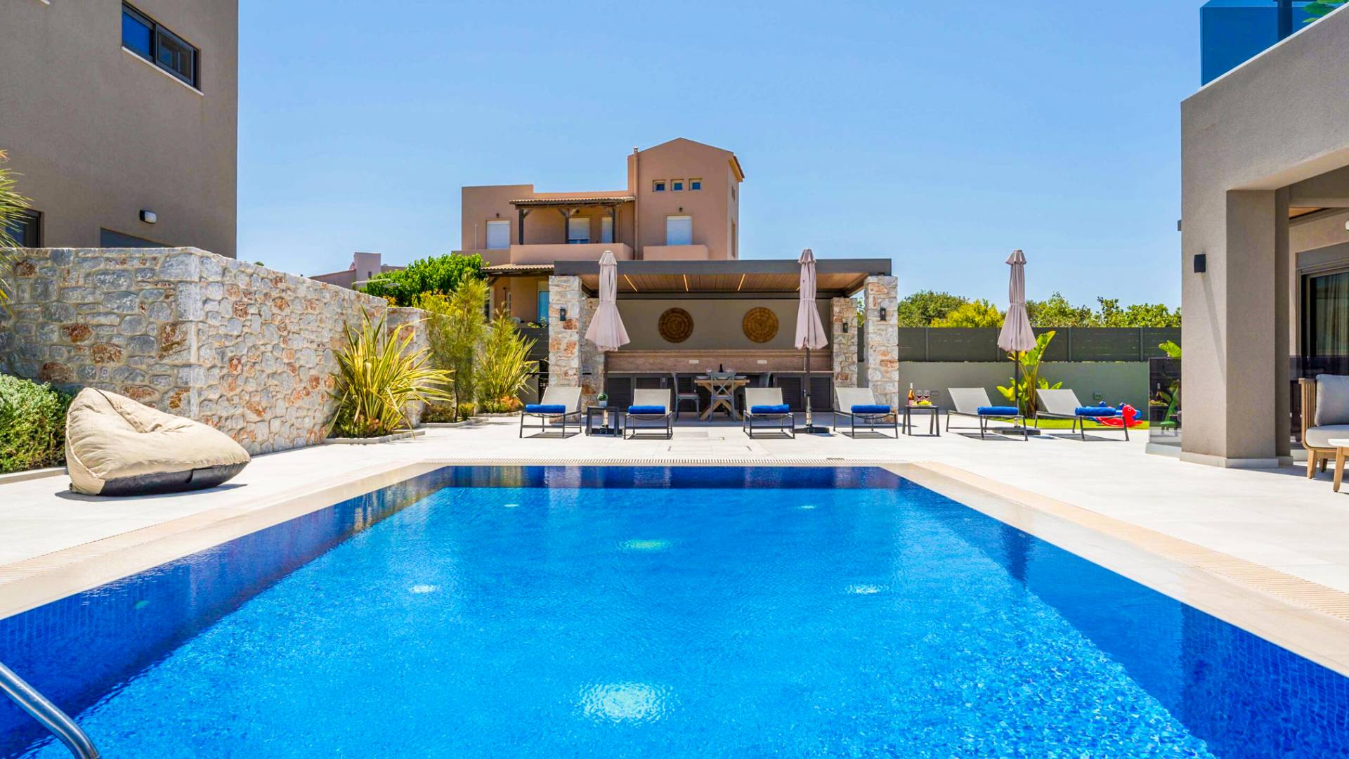 Neos Retreat 2 Chania Crete - Luxury villa with heated pool, jacuzzi, sauna, gym & 5 bedrooms. Just 300m from the beach and minutes from Chania Old Town. Perfect for families & groups.