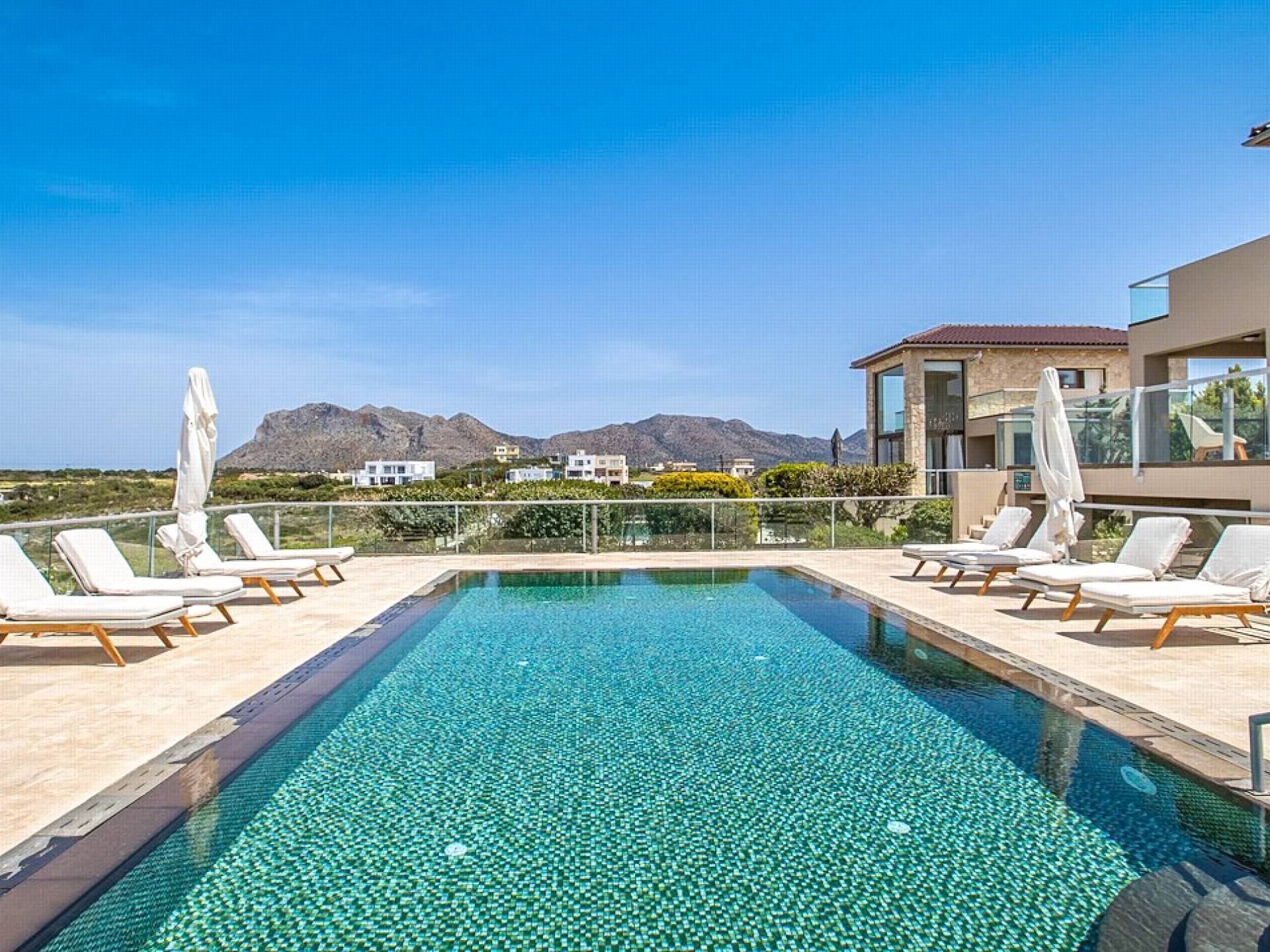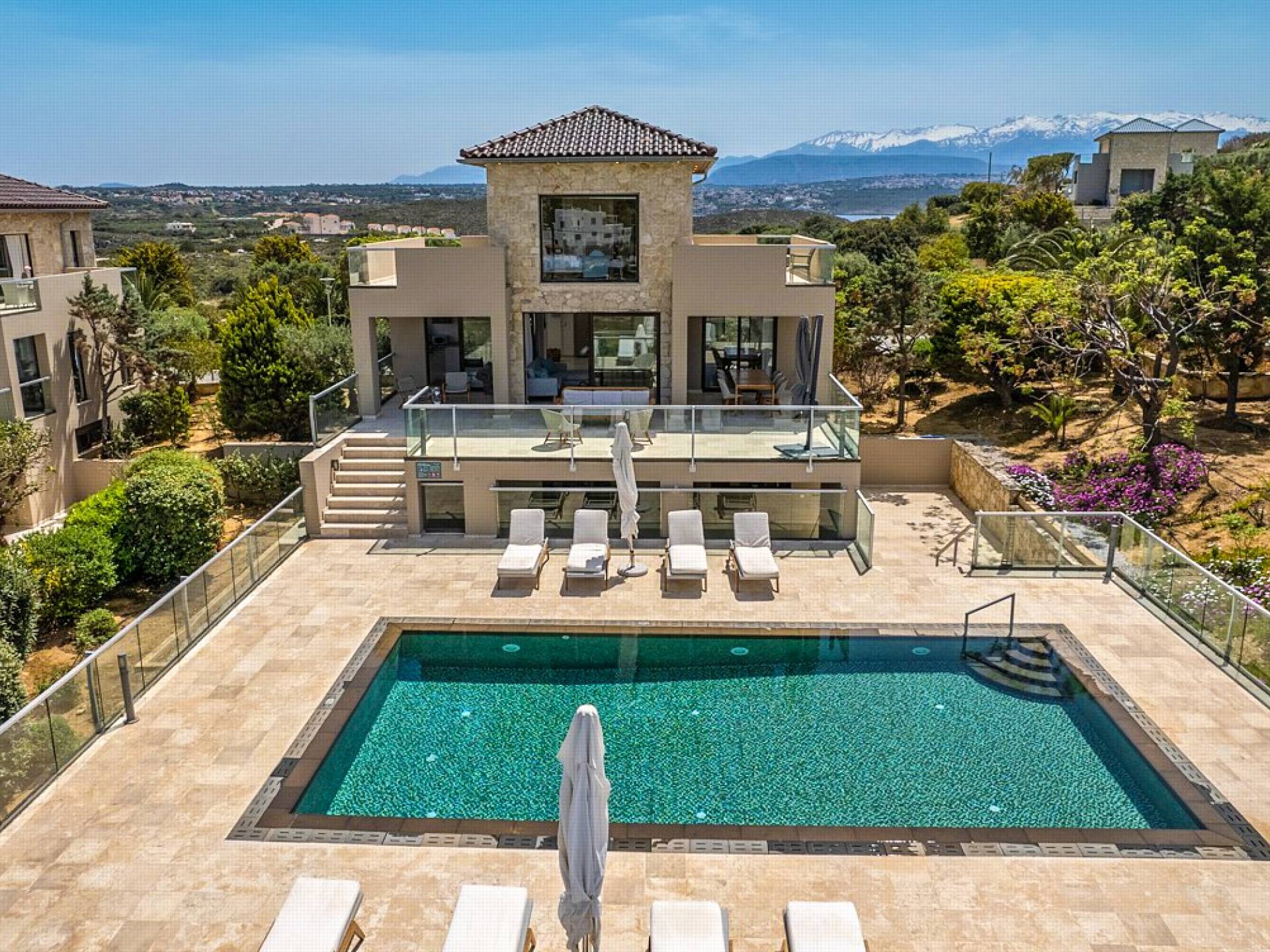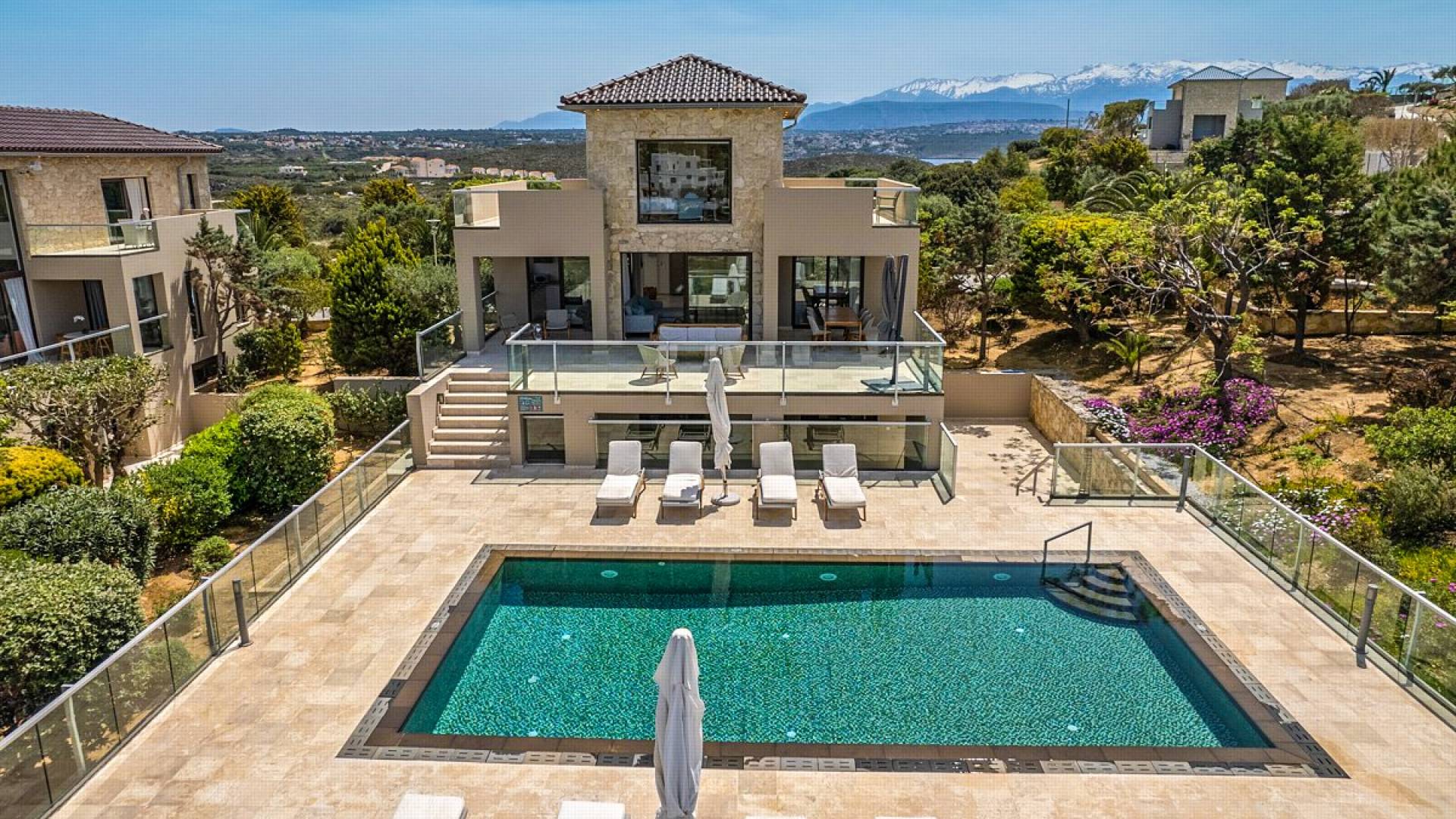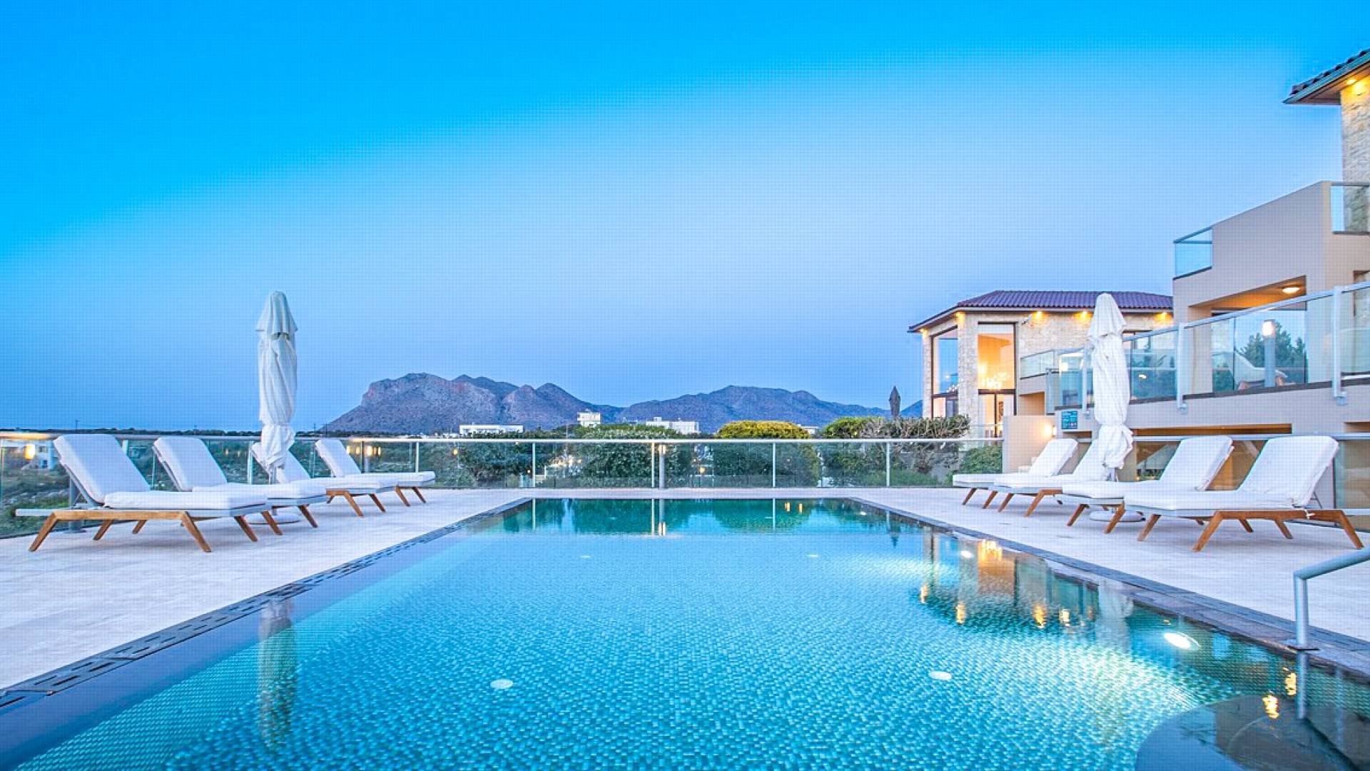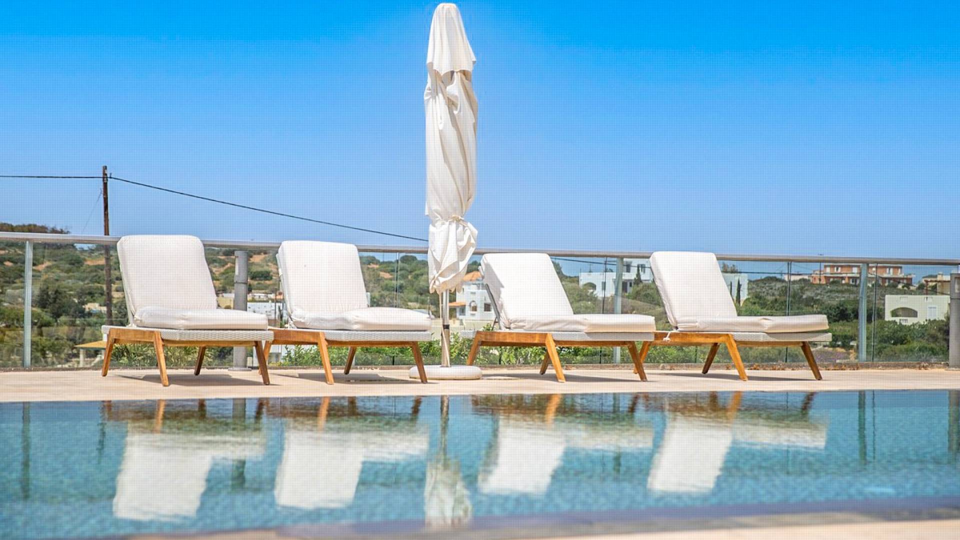 This luxury designer luxury villa is positioned next to the sea, located near the popular and wonderful city of Chania on the island of Crete. Neptune Villa has 4 bedrooms, a private swimming pool, and a fully landscaped garden offering plenty of privacy and relaxation areas. You will find comfortable sunbeds, sun shades, tables, and chairs in the pool area, all completing a perfect frame for dining with family and friends. There is a tennis court on the grounds which is shared by all villas.