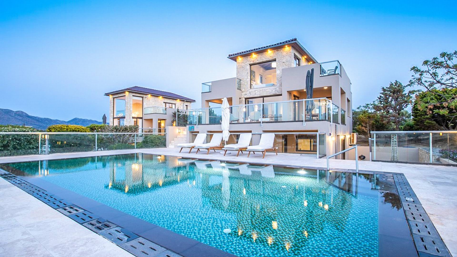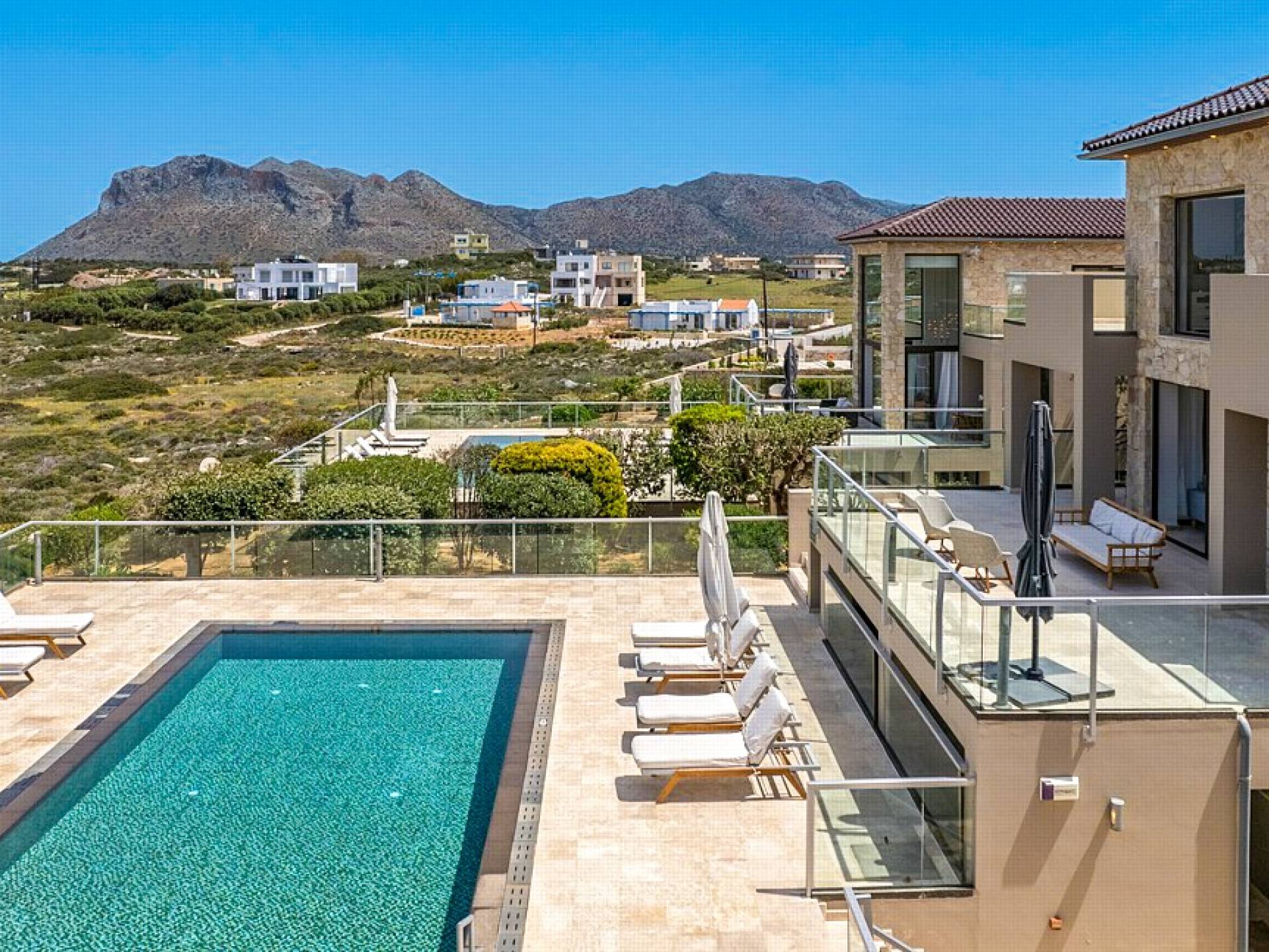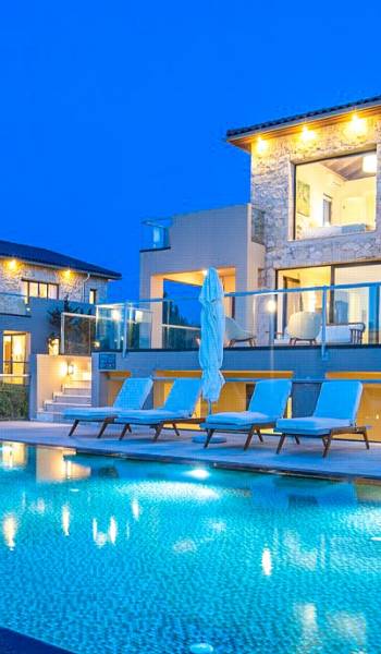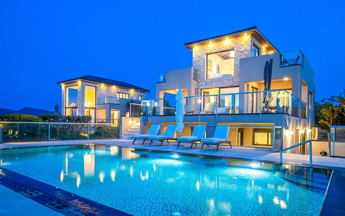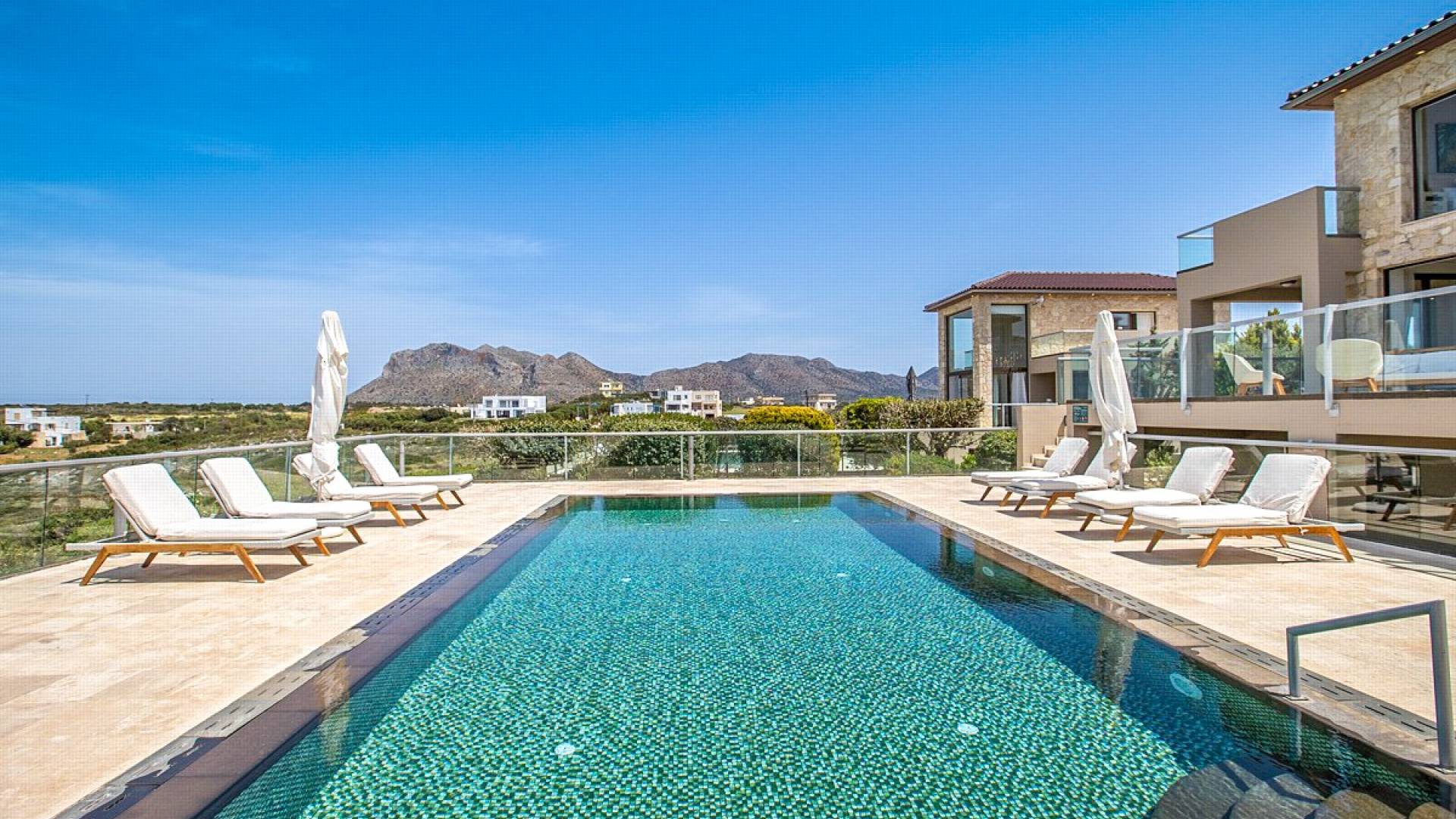 This luxury designer luxury villa is positioned next to the sea, located near the popular and wonderful city of Chania on the island of Crete. Neptune Villa has 4 bedrooms, a private swimming pool, and a fully landscaped garden offering plenty of privacy and relaxation areas. You will find comfortable sunbeds, sun shades, tables, and chairs in the pool area, all completing a perfect frame for dining with family and friends. There is a tennis court on the grounds which is shared by all villas.