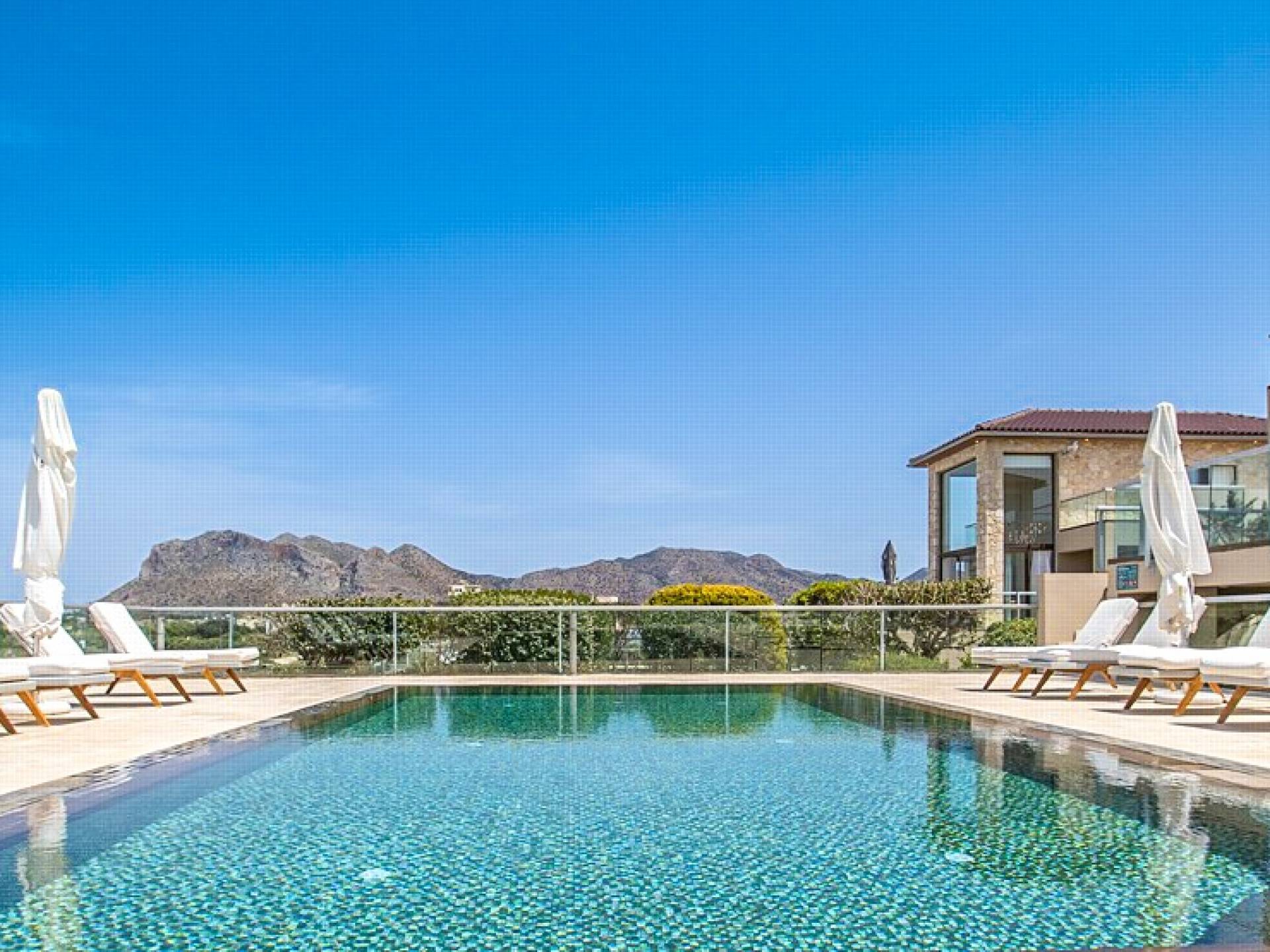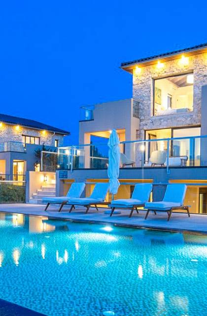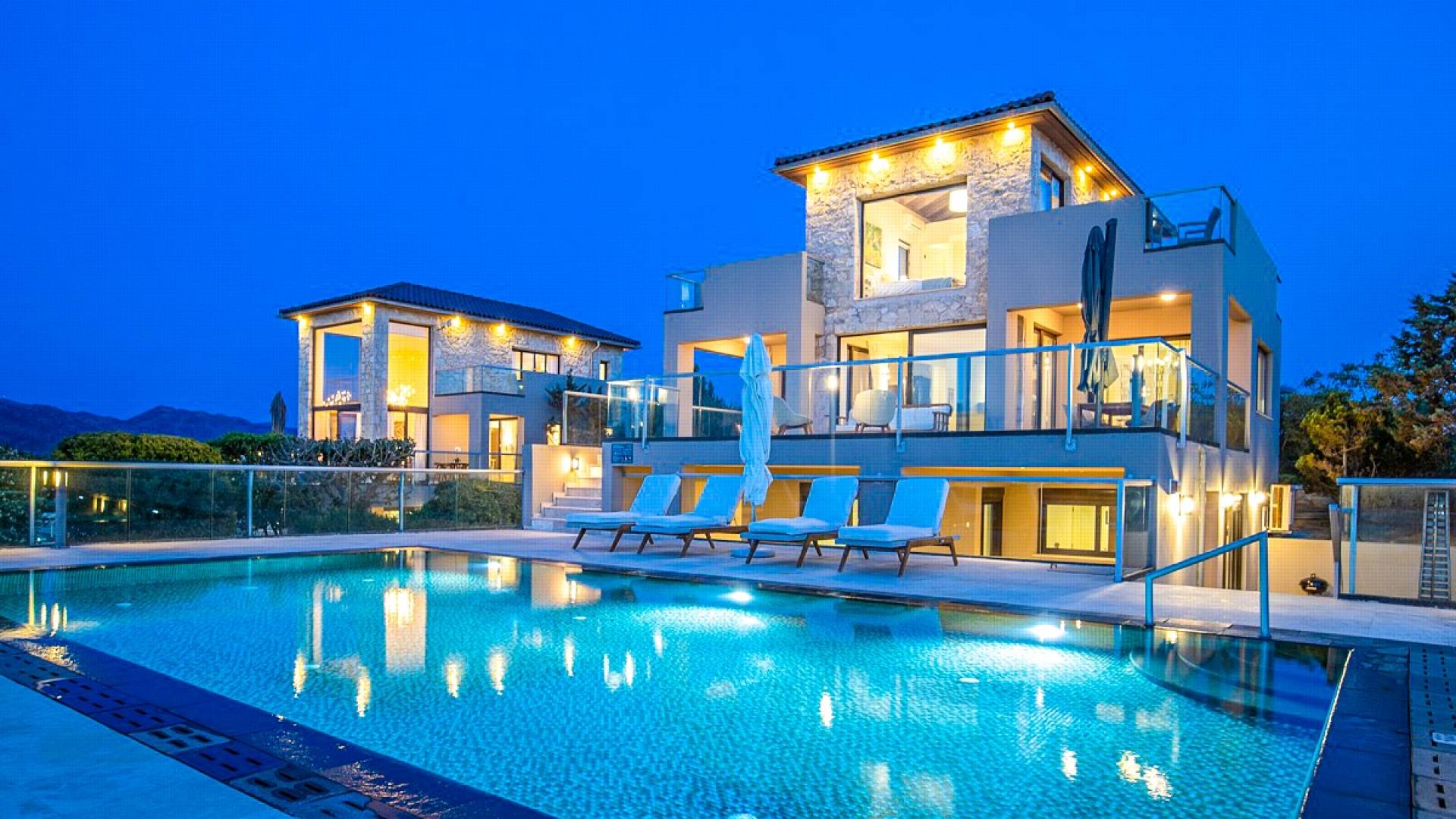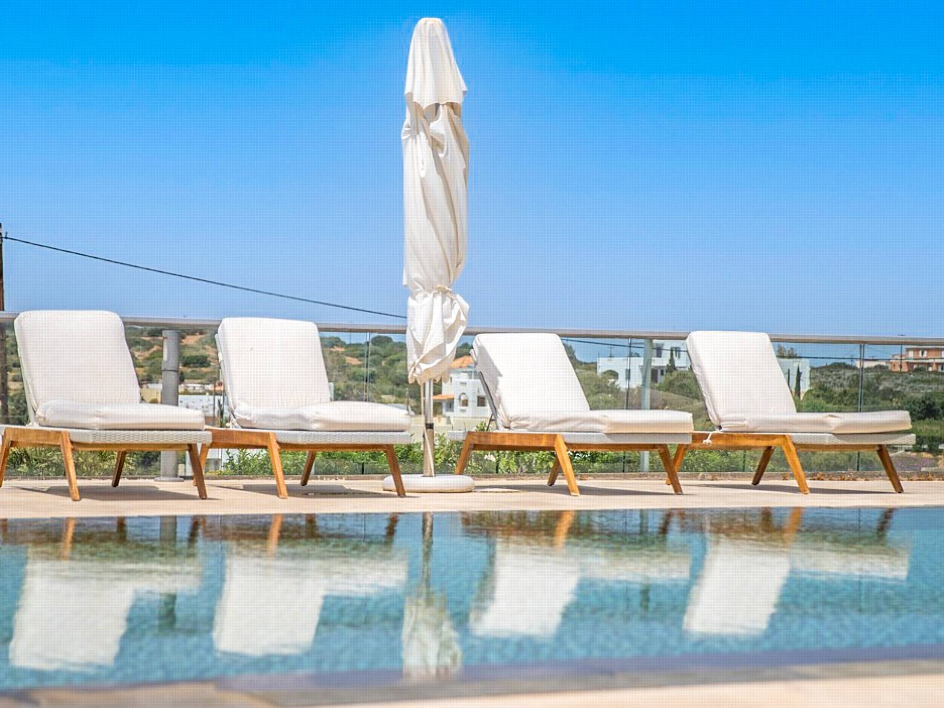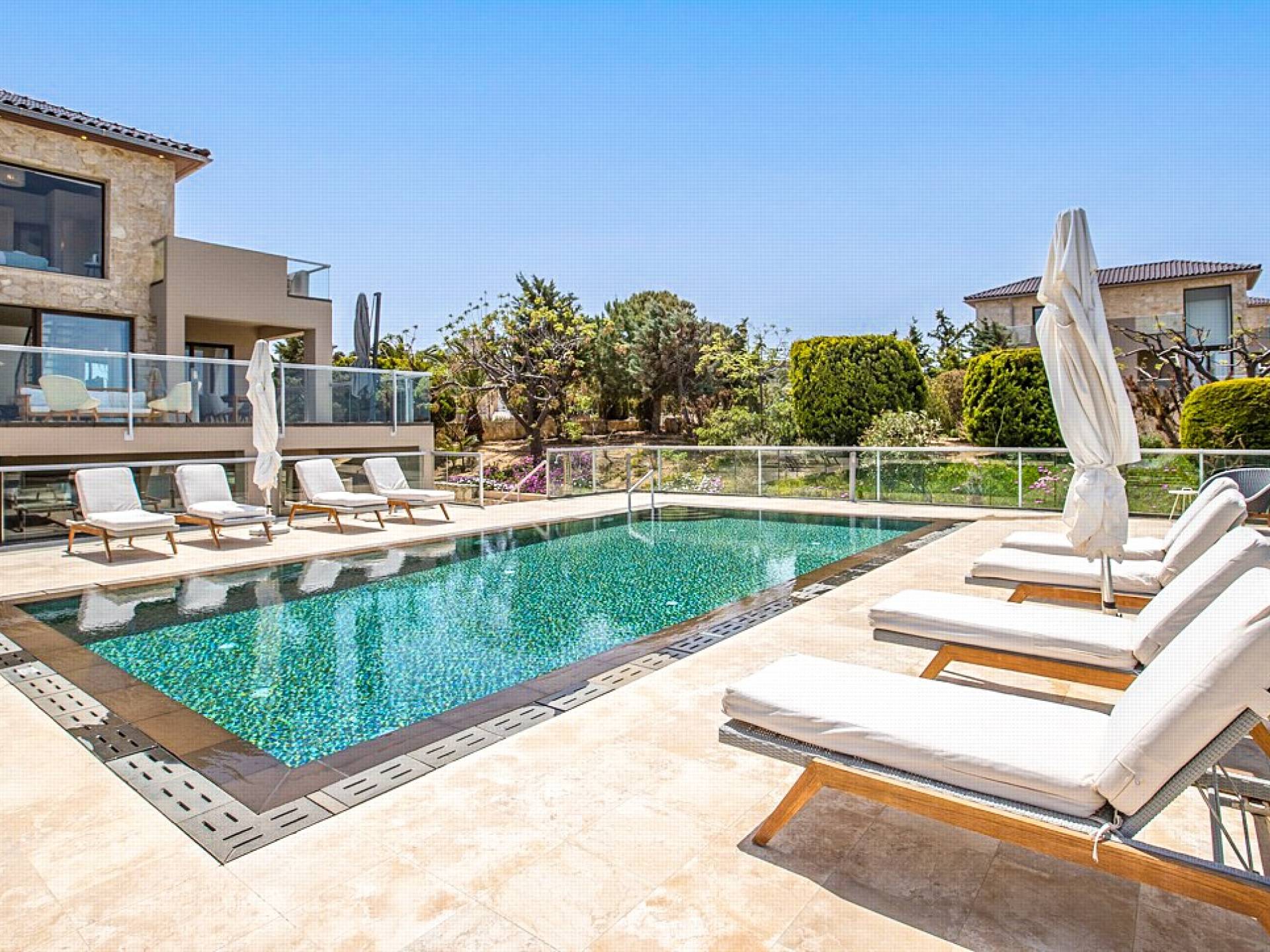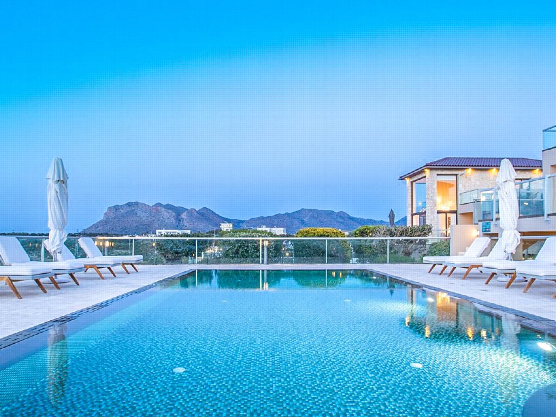 This luxury designer luxury villa is positioned next to the sea, located near the popular and wonderful city of Chania on the island of Crete. Neptune Villa has 4 bedrooms, a private swimming pool, and a fully landscaped garden offering plenty of privacy and relaxation areas. You will find comfortable sunbeds, sun shades, tables, and chairs in the pool area, all completing a perfect frame for dining with family and friends. There is a tennis court on the grounds which is shared by all villas.