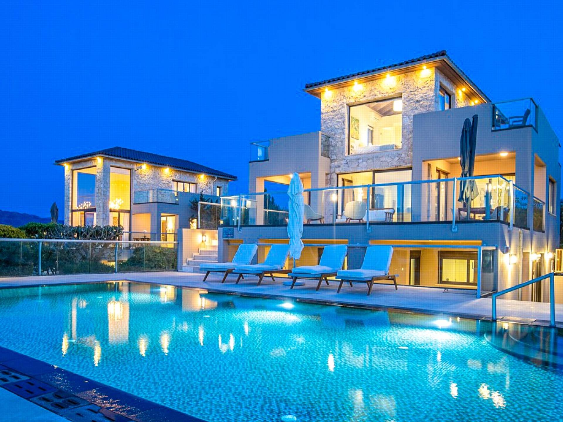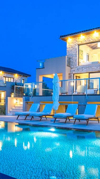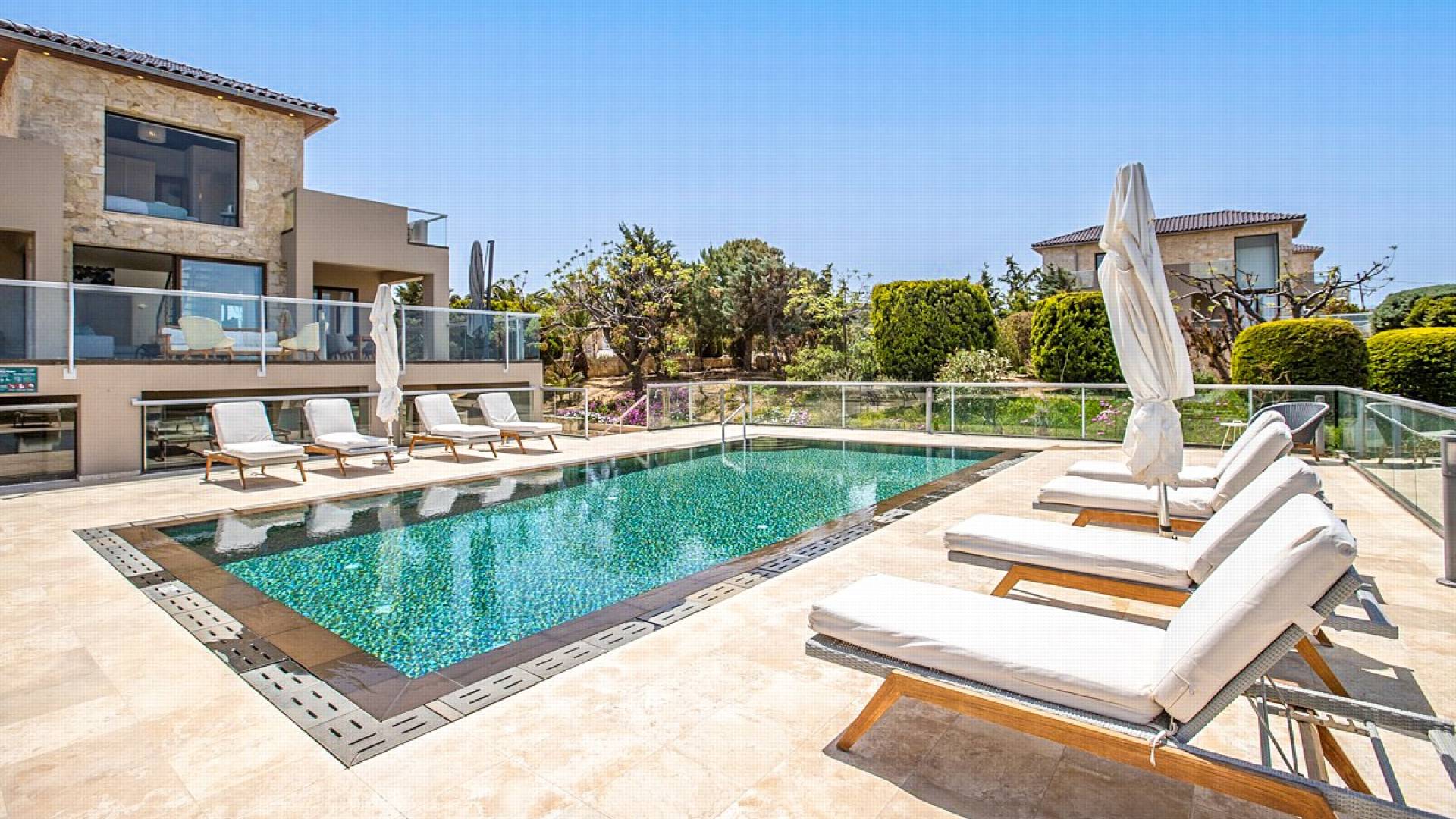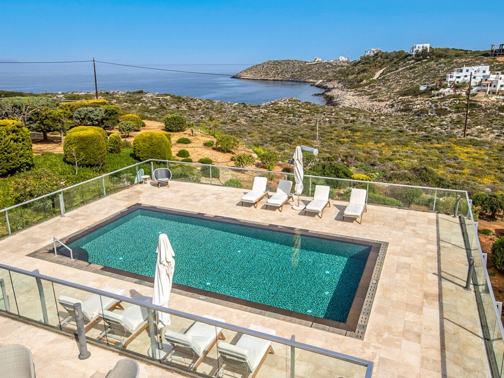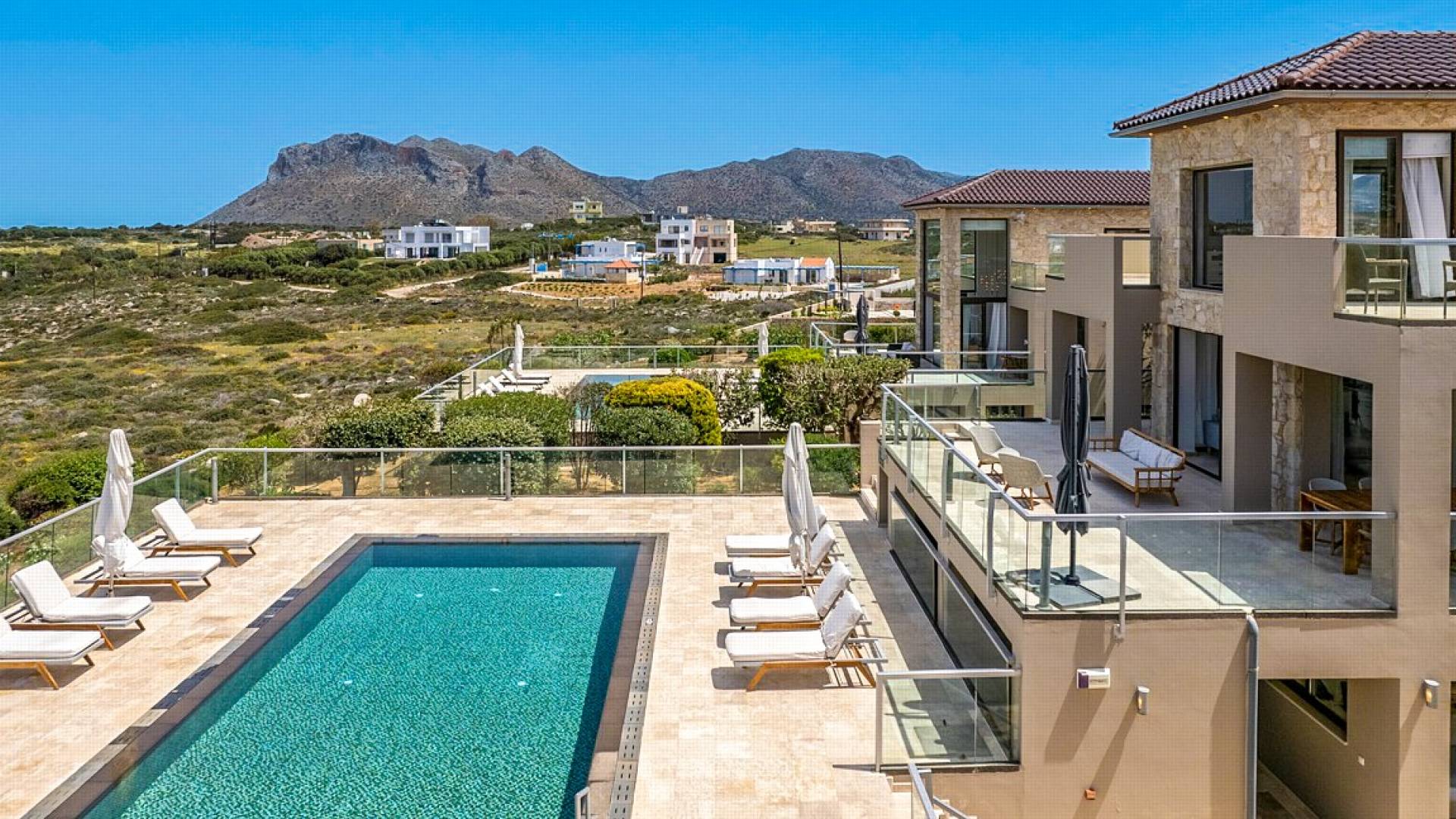 This luxury designer luxury villa is positioned next to the sea, located near the popular and wonderful city of Chania on the island of Crete. Neptune Villa has 4 bedrooms, a private swimming pool, and a fully landscaped garden offering plenty of privacy and relaxation areas. You will find comfortable sunbeds, sun shades, tables, and chairs in the pool area, all completing a perfect frame for dining with family and friends. There is a tennis court on the grounds which is shared by all villas.