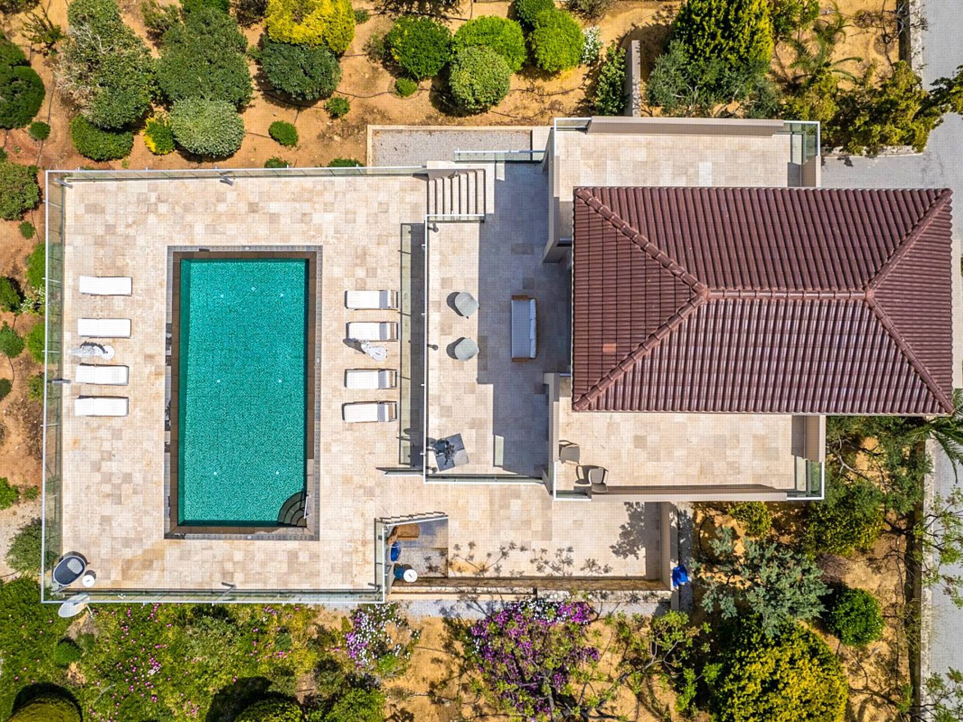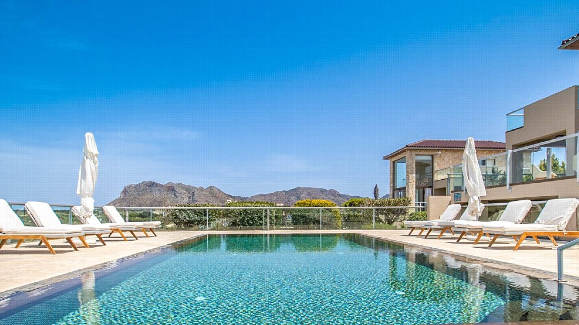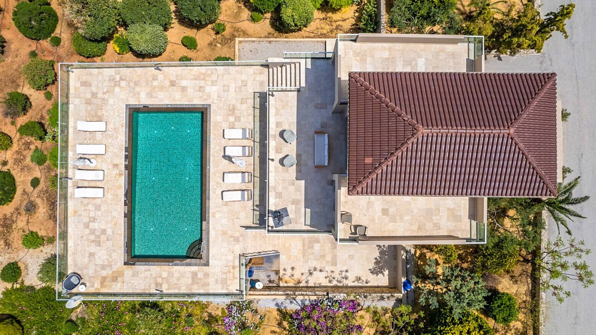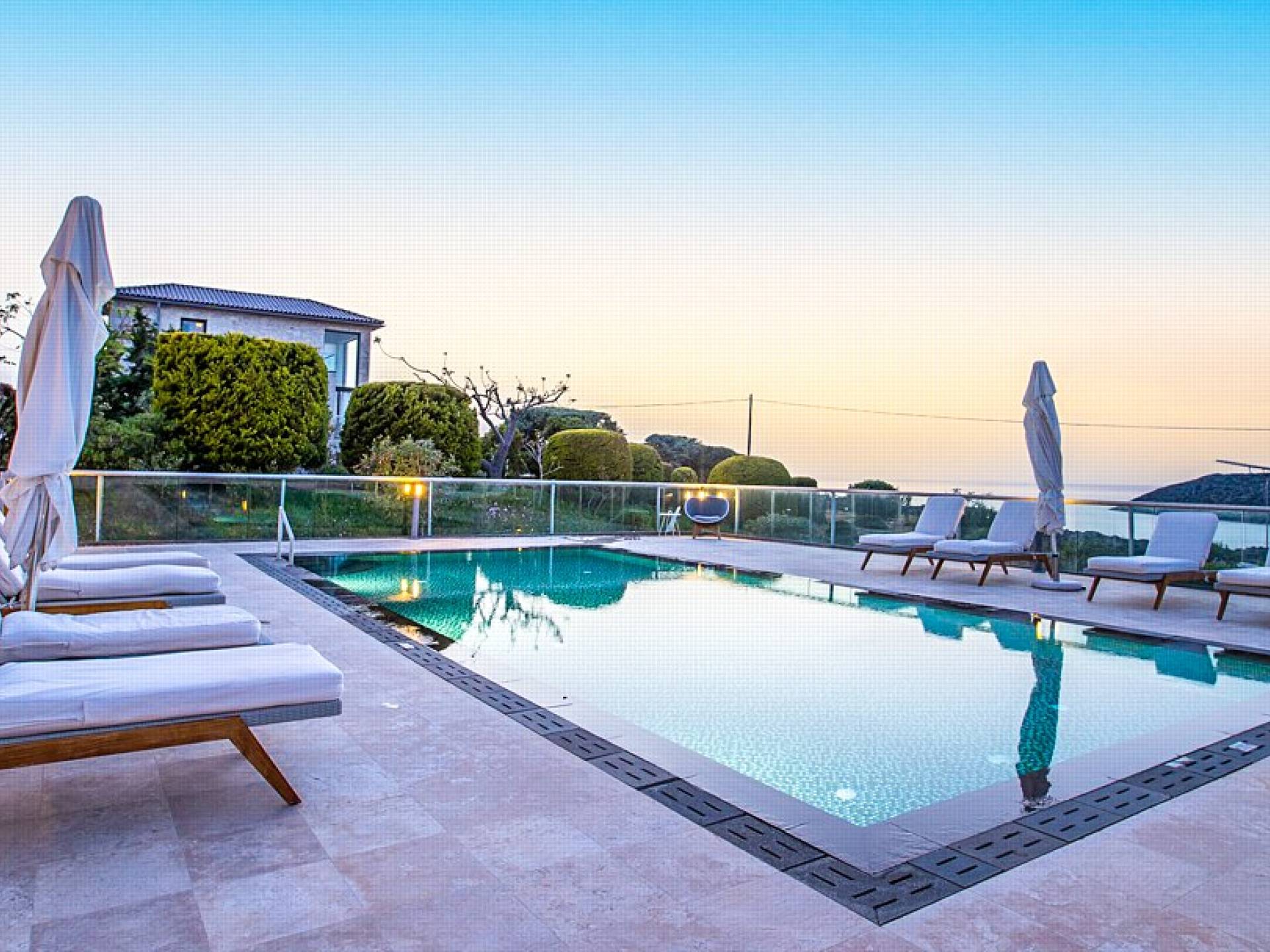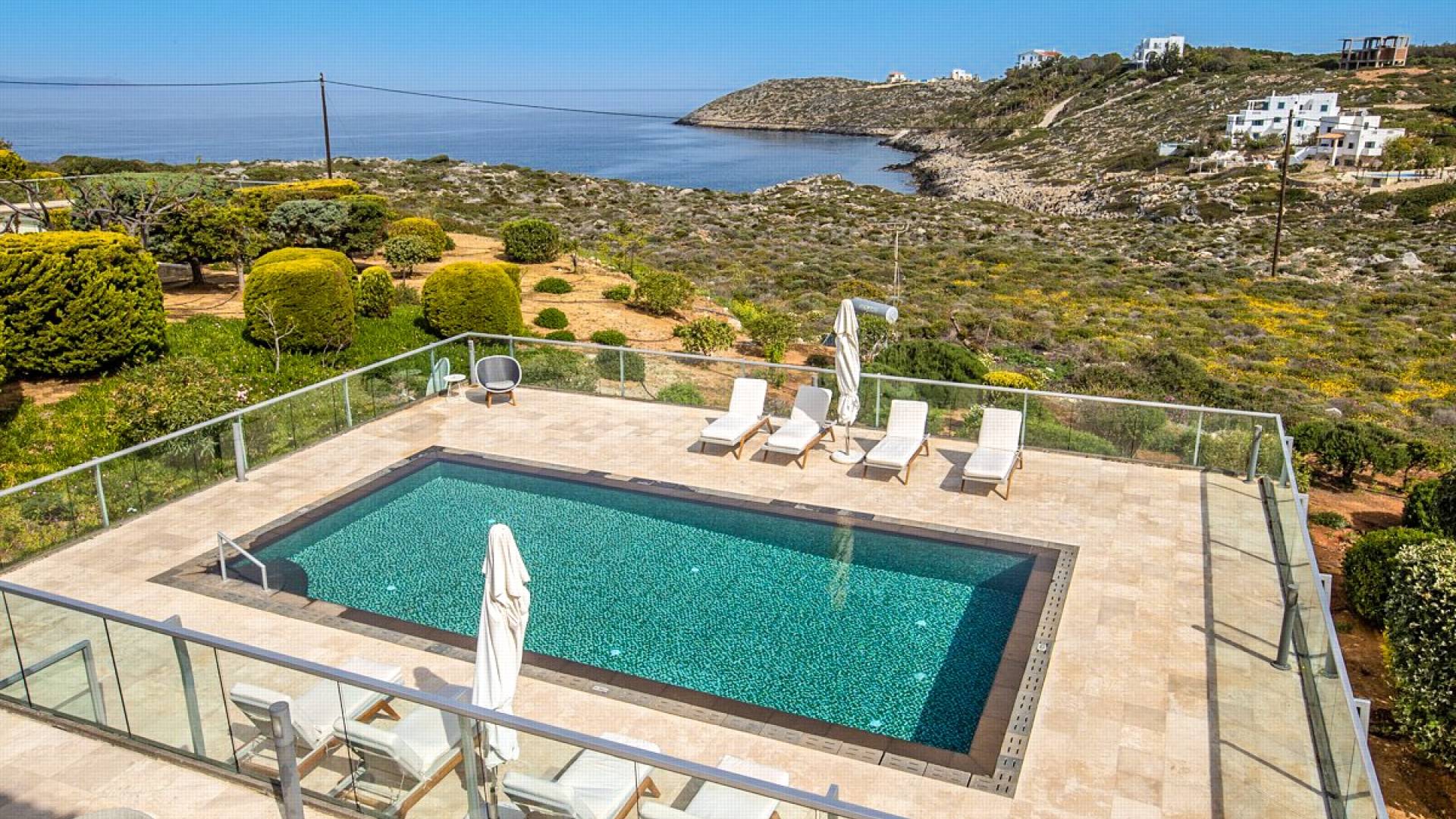 This luxury designer luxury villa is positioned next to the sea, located near the popular and wonderful city of Chania on the island of Crete. Neptune Villa has 4 bedrooms, a private swimming pool, and a fully landscaped garden offering plenty of privacy and relaxation areas. You will find comfortable sunbeds, sun shades, tables, and chairs in the pool area, all completing a perfect frame for dining with family and friends. There is a tennis court on the grounds which is shared by all villas.