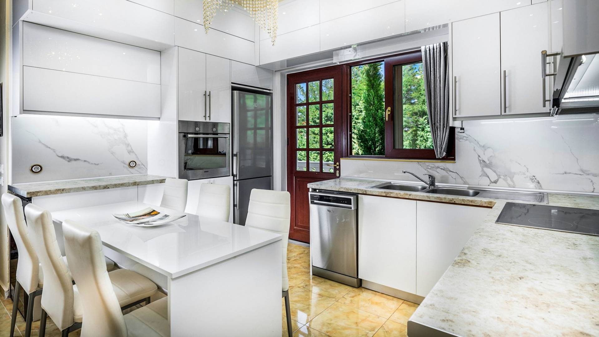 Getting in the Pantis Palace Chania, the 3 big lounges with the ancient greek columns and the golden decorations, the carved fireplace, the access to the big veranda with the white ‘’Dionisos’’ marbles and the three gold plated chandeliers Swarovski will absolutely impress you. Because every gold thing in the villa is not painted but real gold leaf 24 K. or gold plate, in conjunction with shiny floors, the hidden lighting, the colors, the gypsum carvings, and the paintings, transfer you the sense of luxurious construction and even to the most romantic people, the sense of Ancient Greece. After choosing to sit in some of the armchairs or the cozy sofas that there are in the lounges and set the automatic airconditioning, you have access to the big Tv Smart led 55’ with the home cinema, the DVD, the satellite tv and the Hi-Fi system.